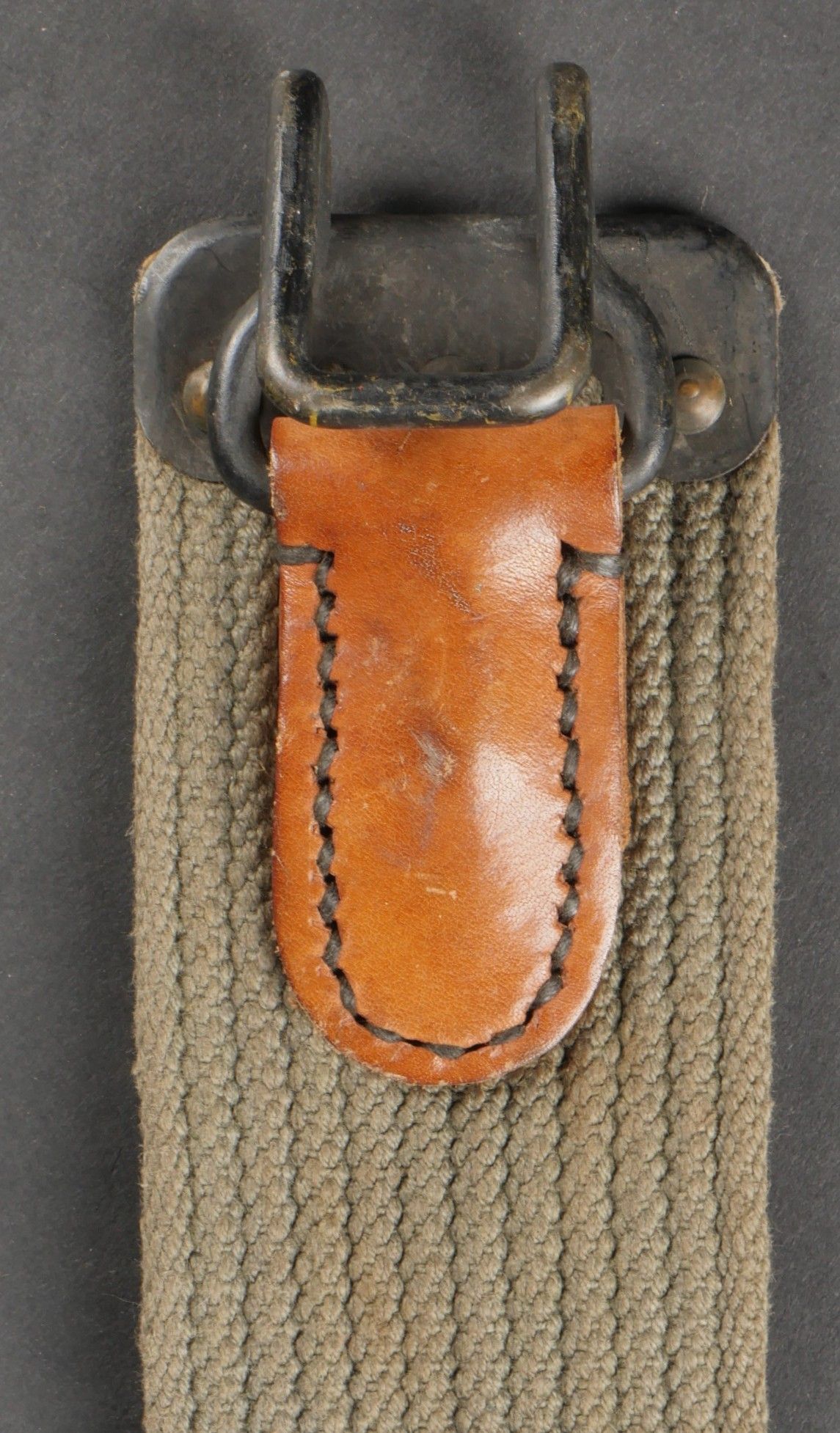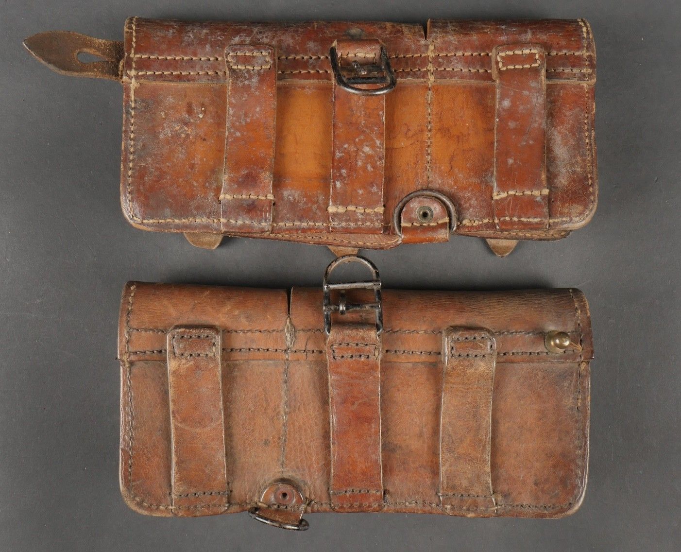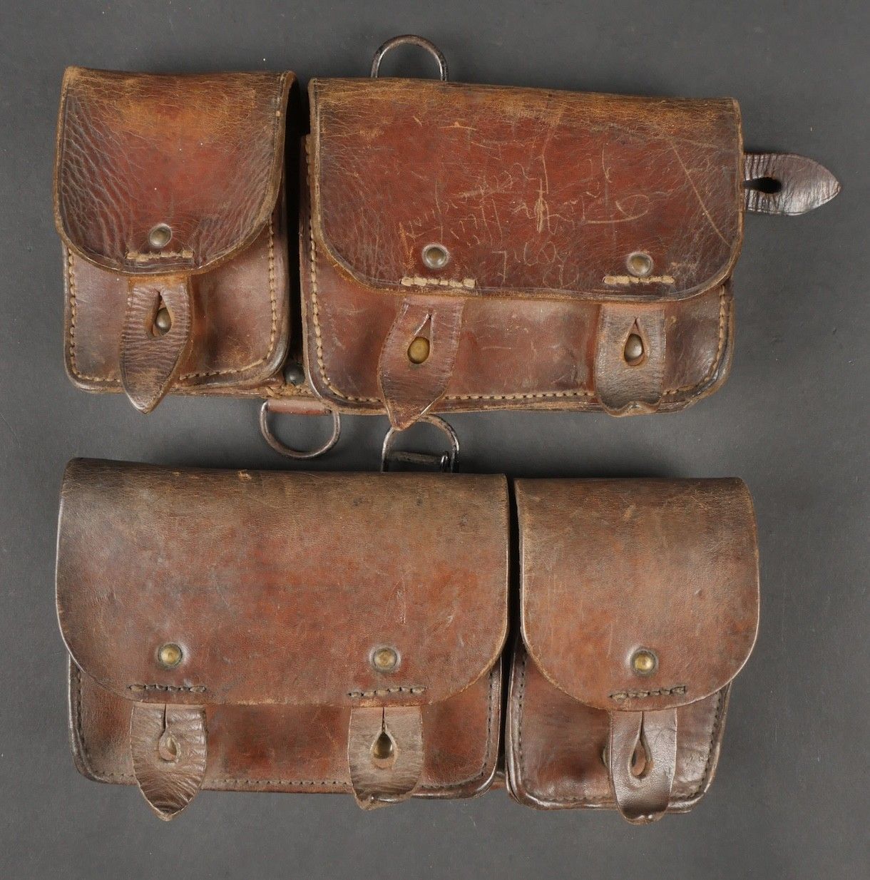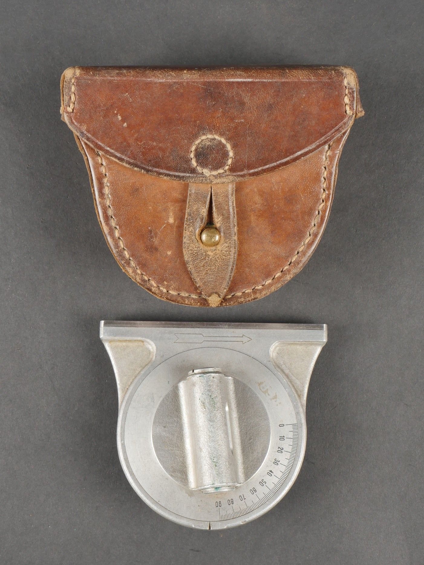 Lot of France 40 equipment. A pair of leather cartridge belts model 193537, right side illegibly marked, small original sewn holding tab, left side illegibly marked, complete with nipple. A 1903 belt dated 1930, one loop missing. A mortar base plate carrying system model 192731 81mm. A mortar level in its case. A 2429 case with oil cruet and two pin chasers. Lot of France 40 equipment A pair of leather cartridge pouches model 193537 right side with illegible marking small original retaining strap left side with illegible marking complete with stud. A 1903 belt dated 1930 with one loop missing. A base plate carrying system for 81 mm mortar model 192731 a mortar sight level in its case and a 2429 maintenance kit pouch with oil bottle and two pin punches.