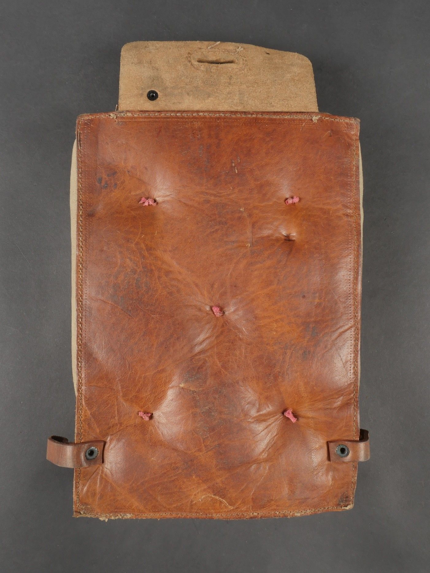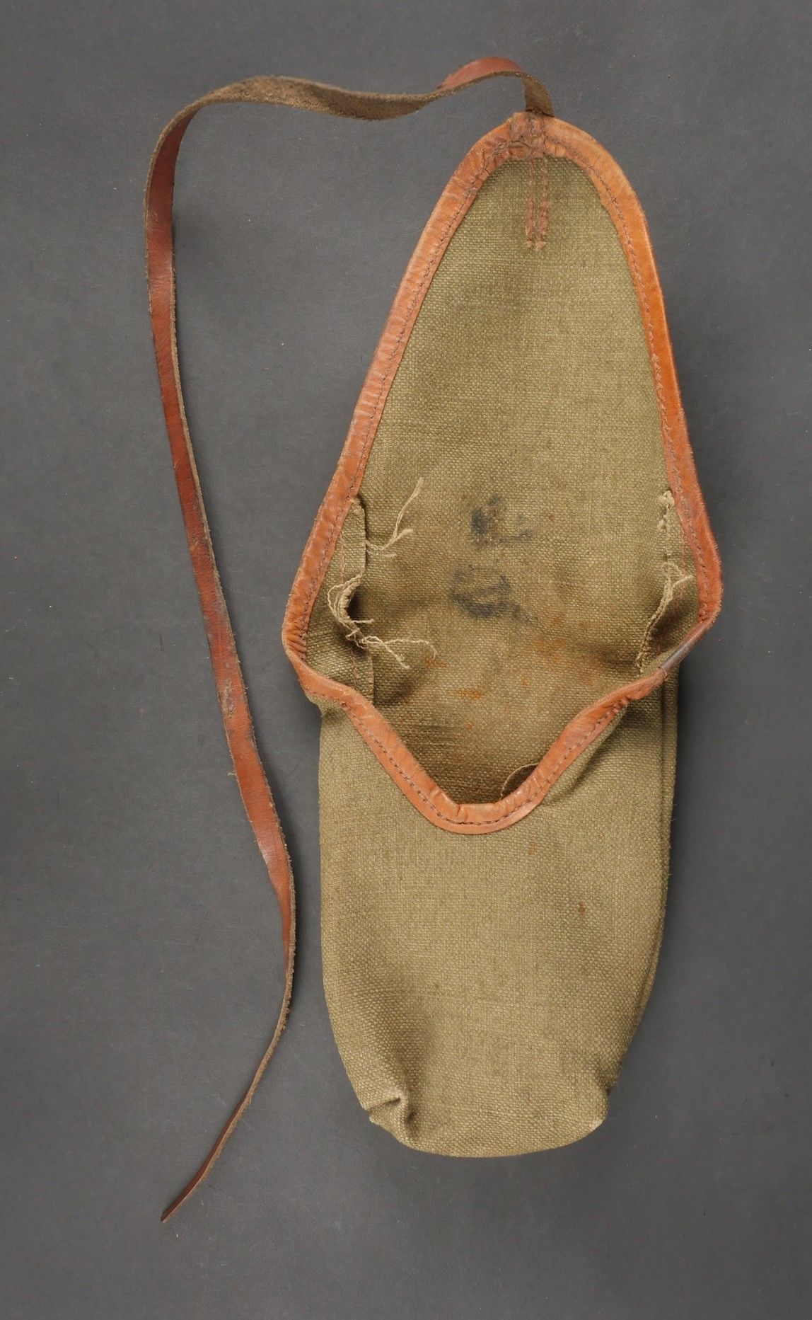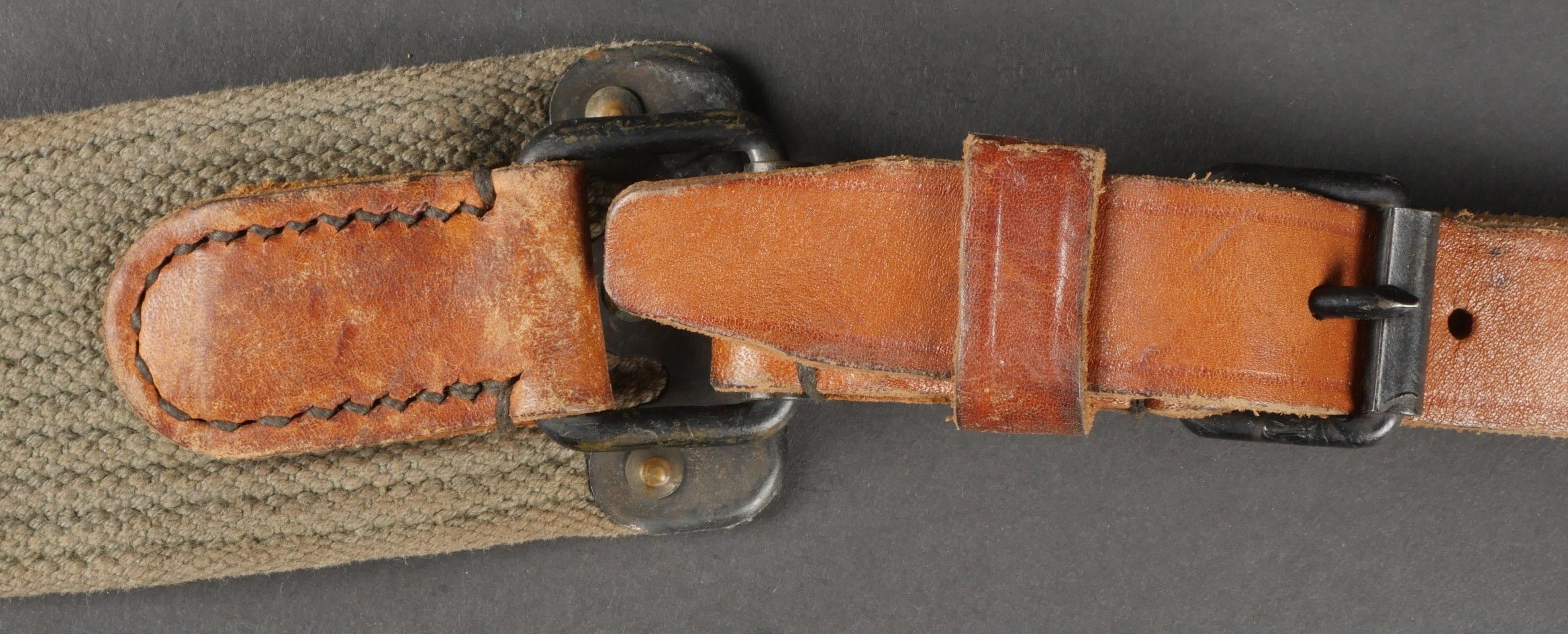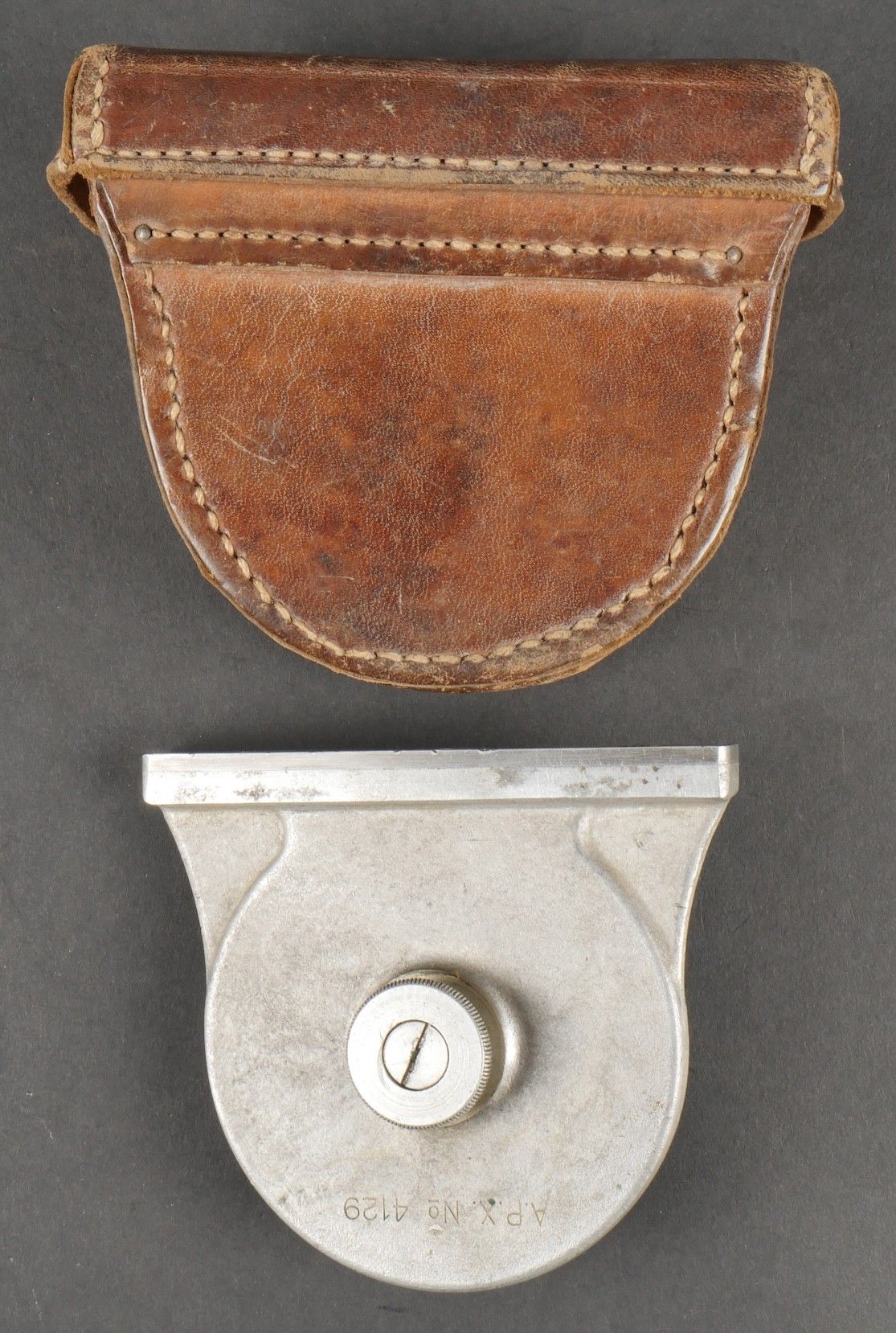 Lot of France 40 equipment. A pair of leather cartridge belts model 193537, right side illegibly marked, small original sewn holding tab, left side illegibly marked, complete with nipple. A 1903 belt dated 1930, one loop missing. A mortar base plate carrying system model 192731 81mm. A mortar level in its case. A 2429 case with oil cruet and two pin chasers. Lot of France 40 equipment A pair of leather cartridge pouches model 193537 right side with illegible marking small original retaining strap left side with illegible marking complete with stud. A 1903 belt dated 1930 with one loop missing. A base plate carrying system for 81 mm mortar model 192731 a mortar sight level in its case and a 2429 maintenance kit pouch with oil bottle and two pin punches.