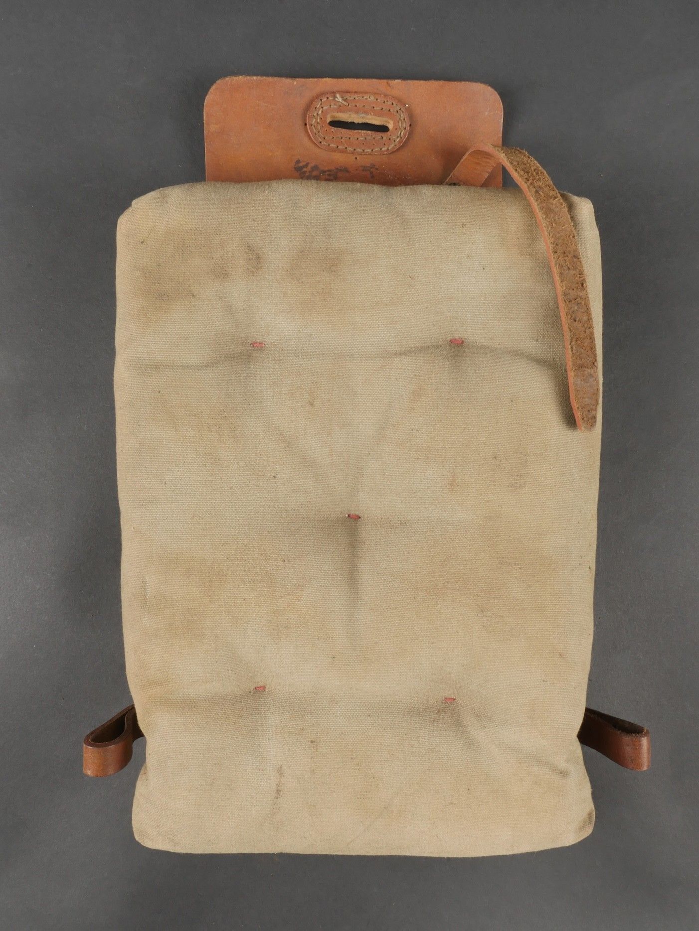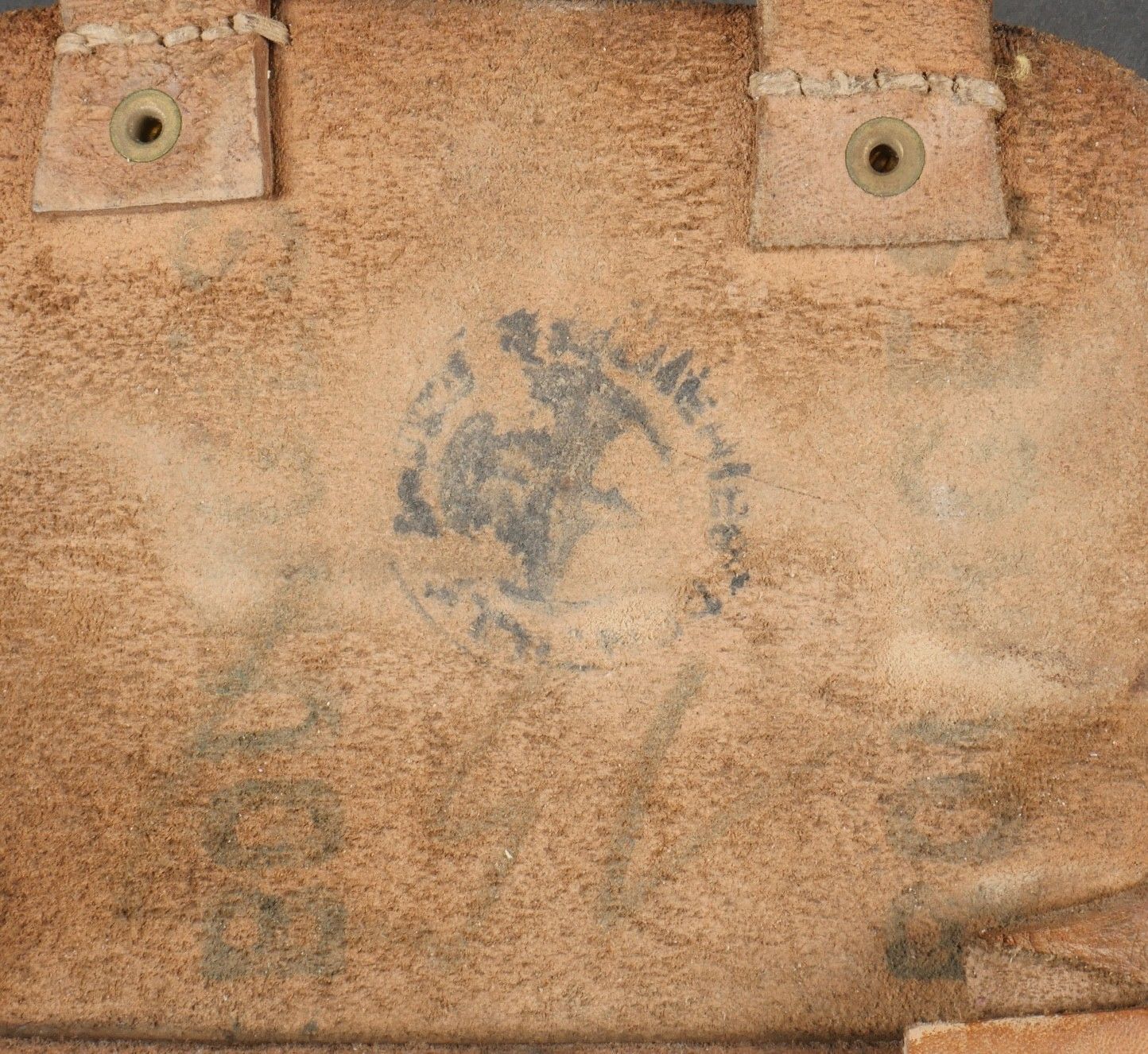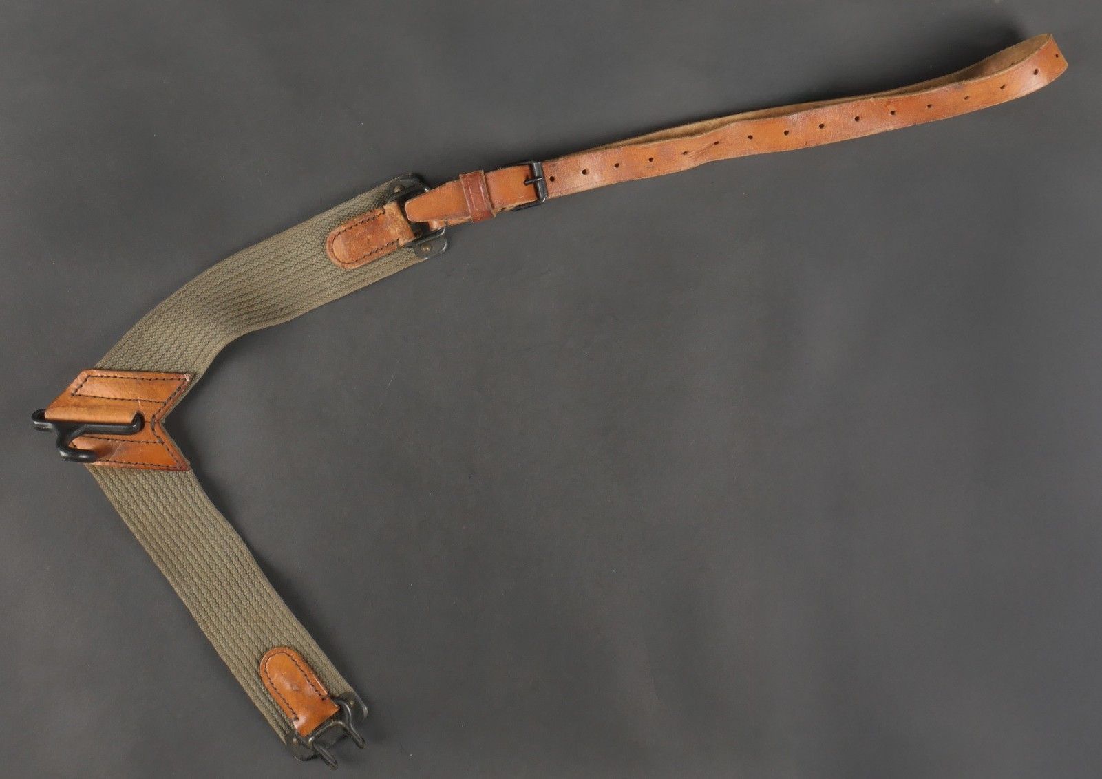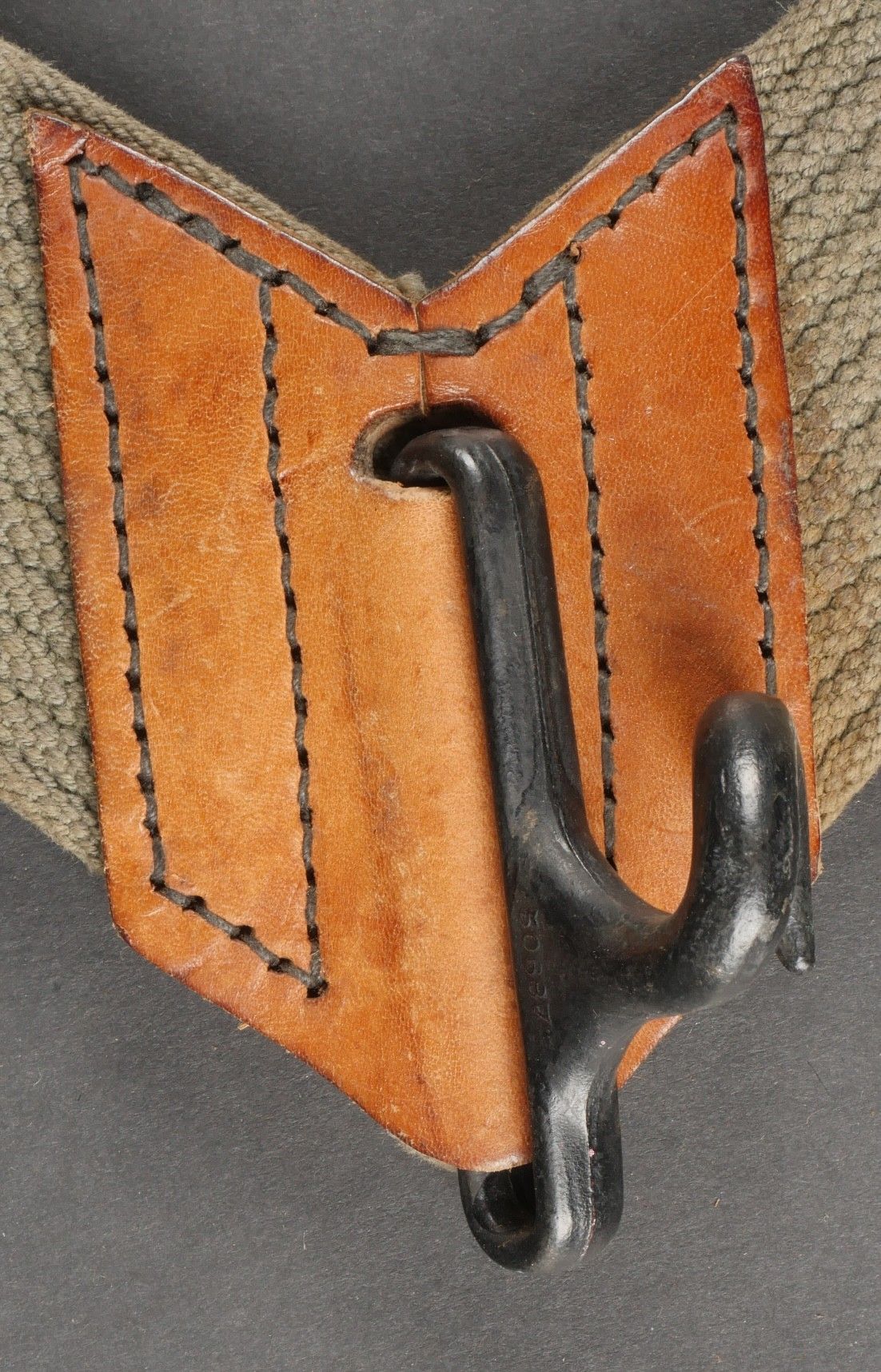 Lot of France 40 equipment. A pair of leather cartridge belts model 193537, right side illegibly marked, small original sewn holding tab, left side illegibly marked, complete with nipple. A 1903 belt dated 1930, one loop missing. A mortar base plate carrying system model 192731 81mm. A mortar level in its case. A 2429 case with oil cruet and two pin chasers. Lot of France 40 equipment A pair of leather cartridge pouches model 193537 right side with illegible marking small original retaining strap left side with illegible marking complete with stud. A 1903 belt dated 1930 with one loop missing. A base plate carrying system for 81 mm mortar model 192731 a mortar sight level in its case and a 2429 maintenance kit pouch with oil bottle and two pin punches.