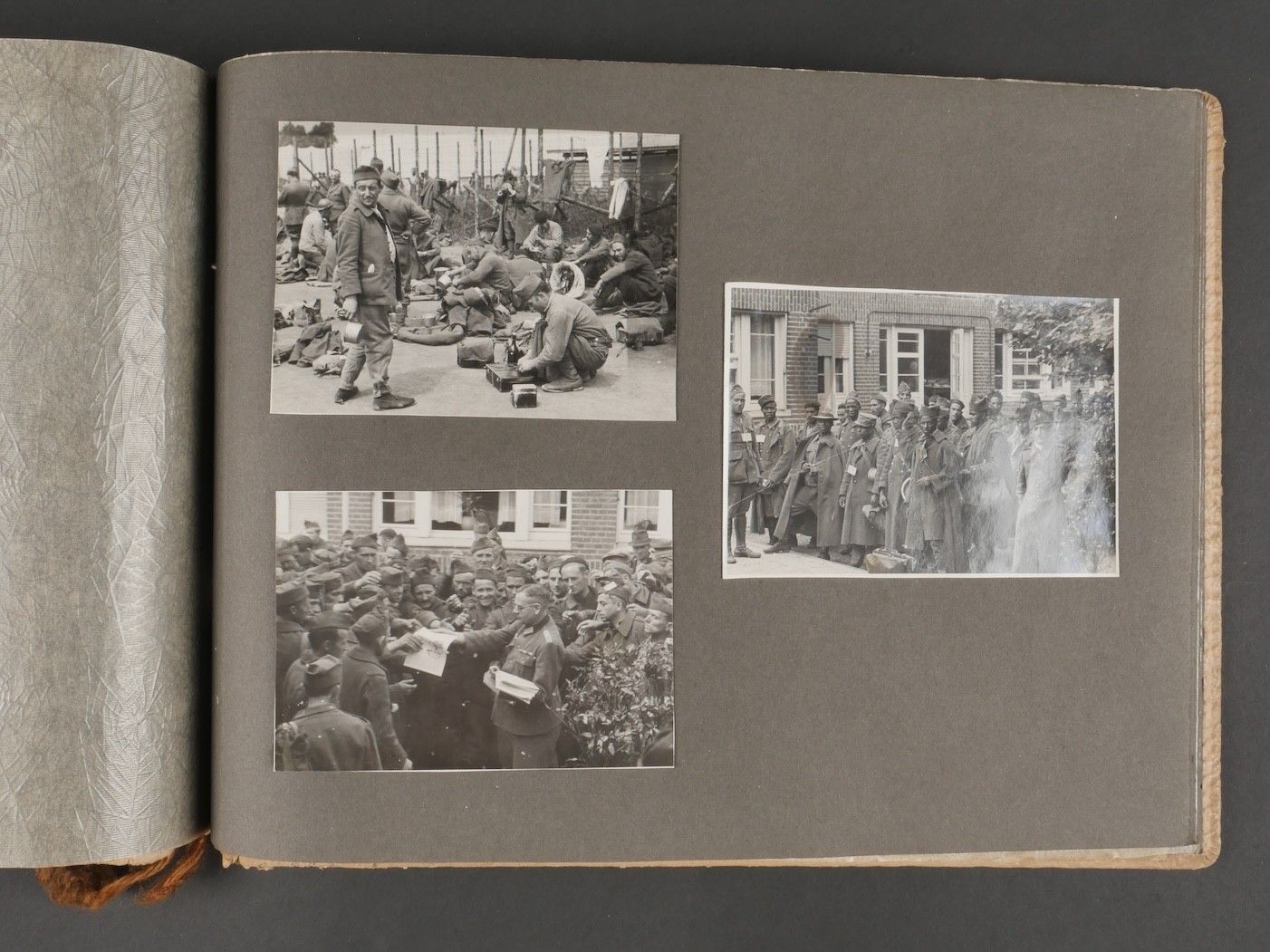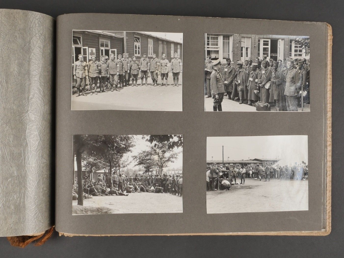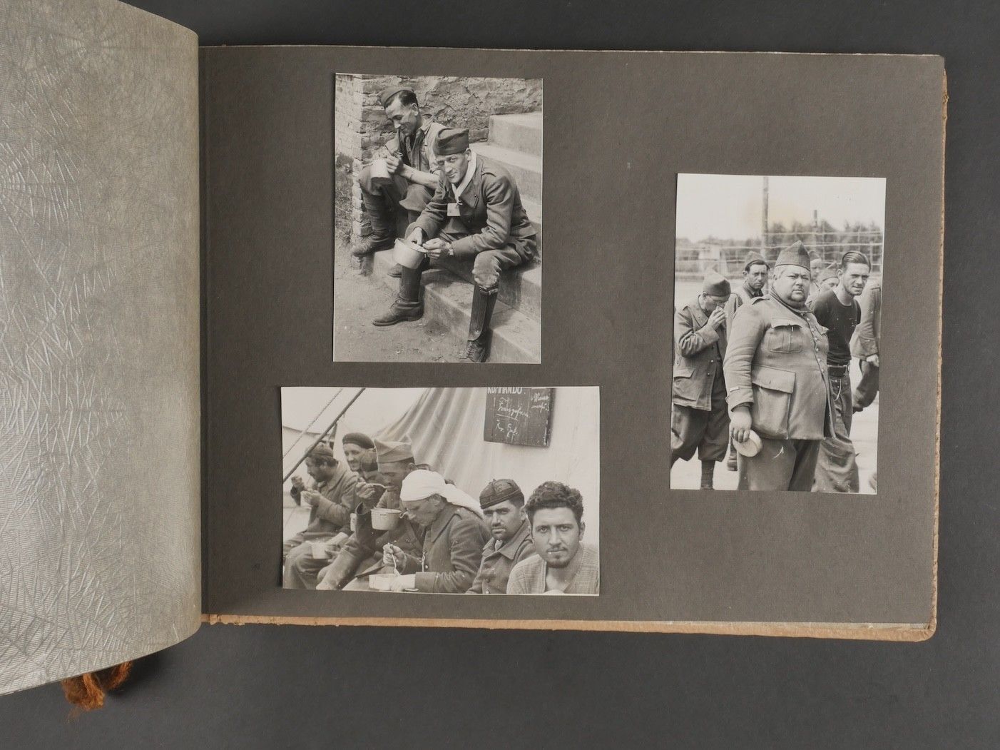Prisoner of war photo album. Beautiful album containing 68 original photos taken by a prisoner in Germany during his detention. It shows the first prisoners' barracks at the Goldsaal in Dortmund, and the life of a prisoner in the camp, with all its chores. We see French, Belgian and British soldiers, as well as Senegalese riflemen and various soldiers from the colonial troops. The photos are crisp and of high quality. POW photo album Fine album containing 68 original photographs taken by a prisoner in Germany during detention. Shows early prisoner barracks inside the Goldsaal in Dortmund daily camp life with work details French Belgian British and Senegalese soldiers and other colonial troops. Clear and wellpreserved photographs.