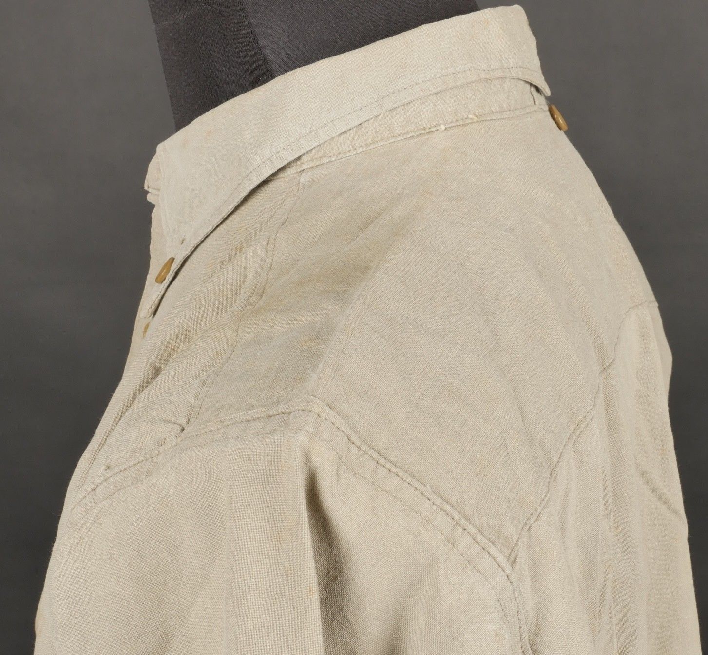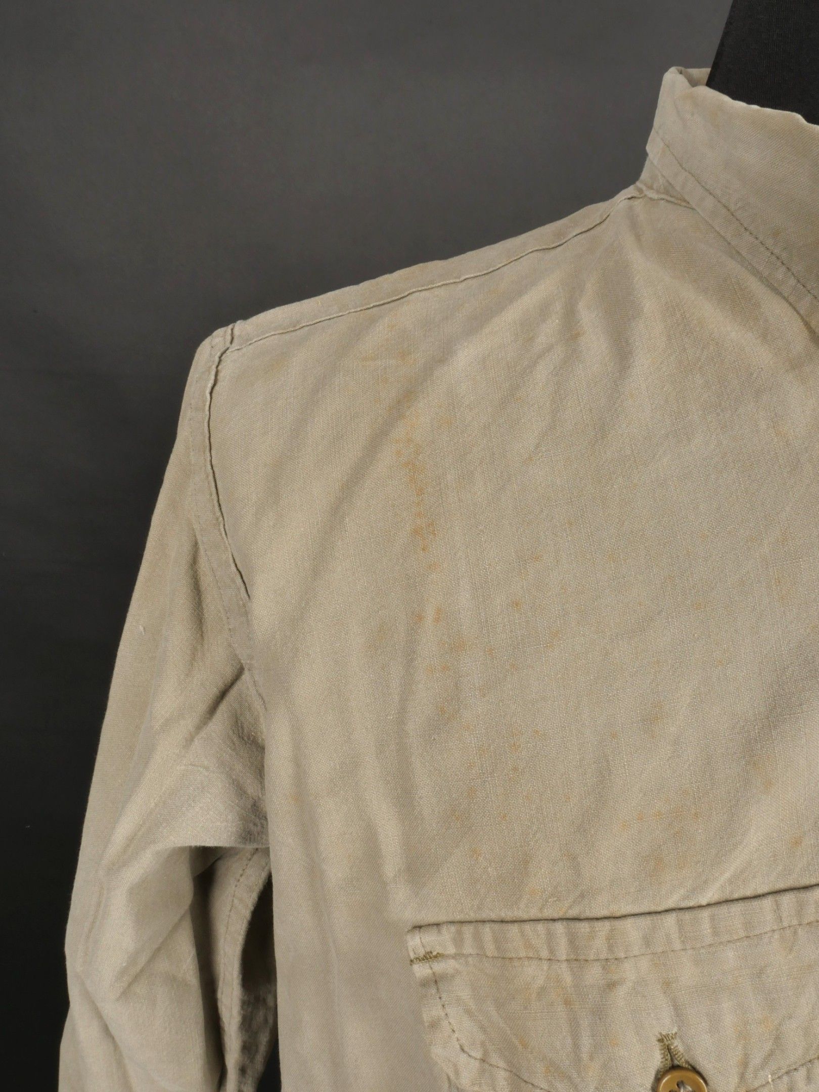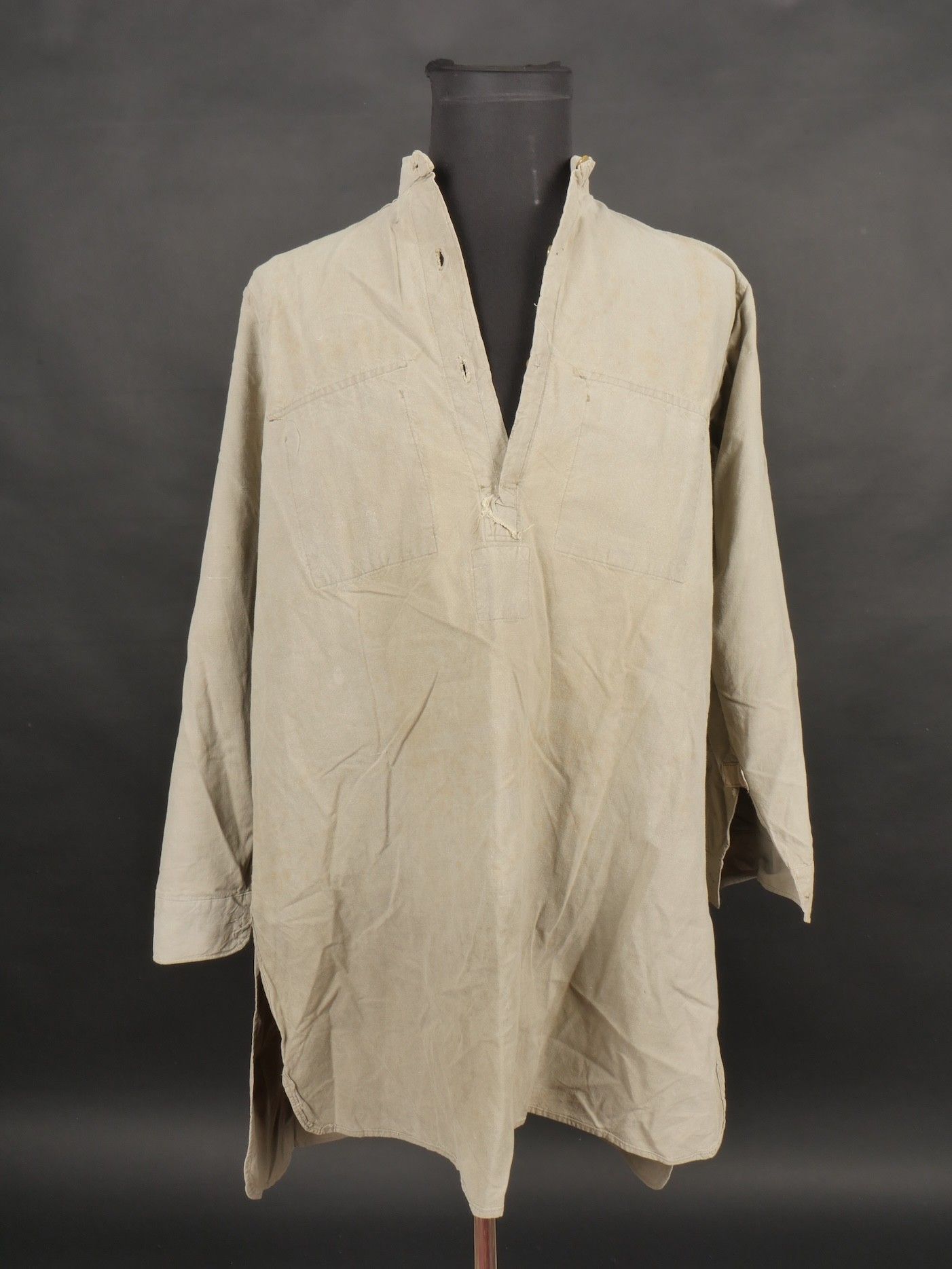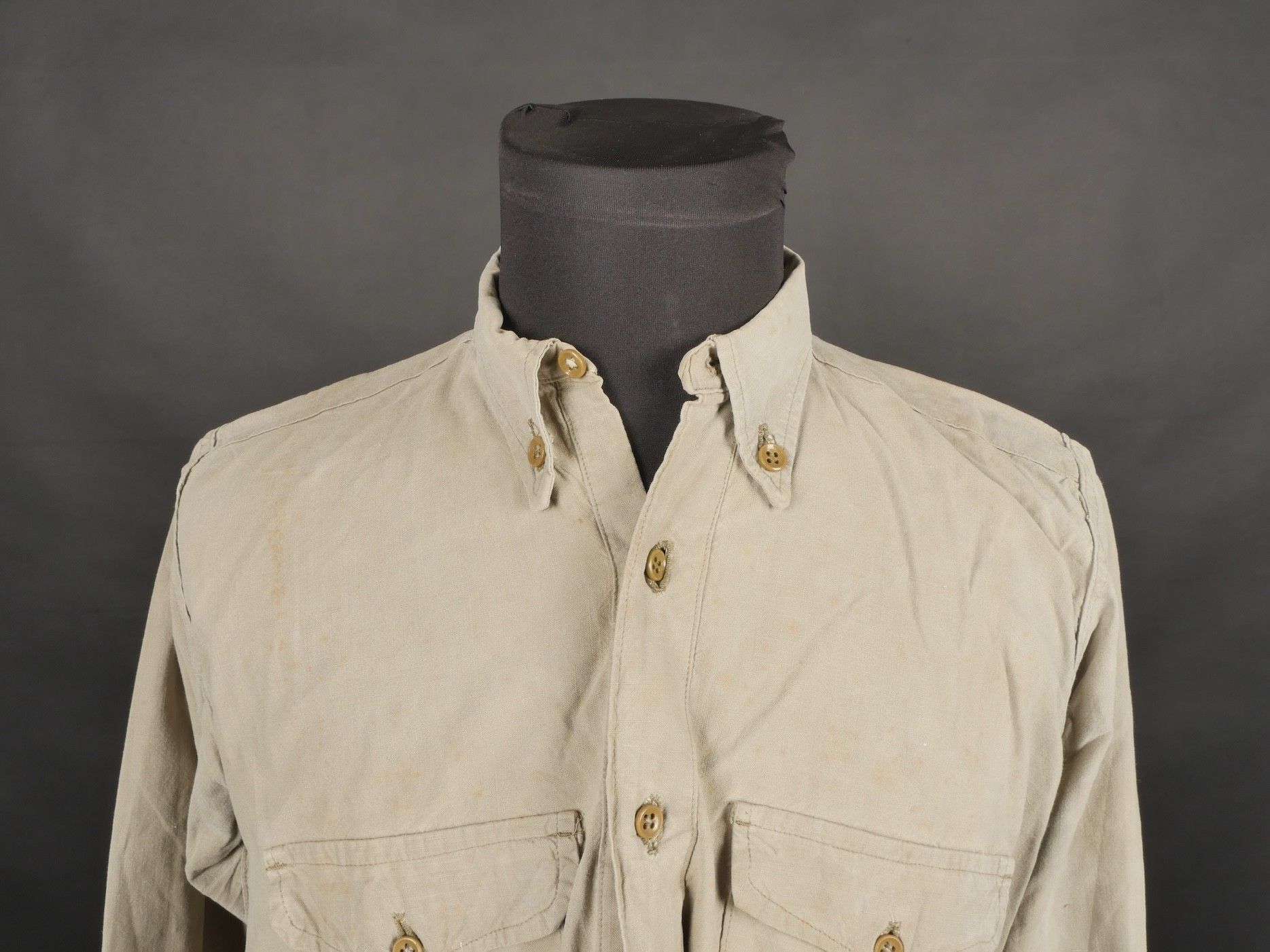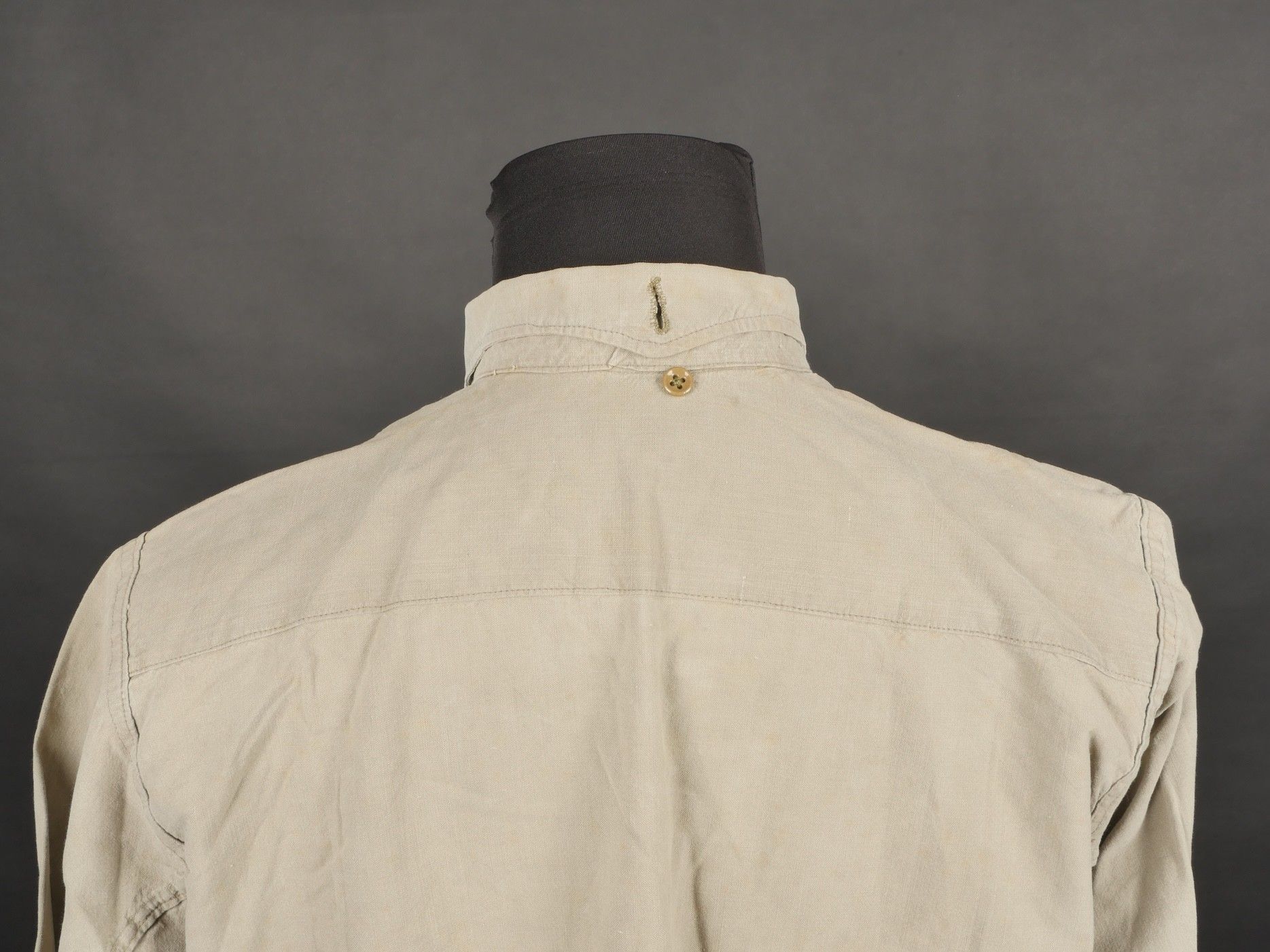 1935 shirt. Regulation model in khaki fabric fastened by three buttons, buttons on back of collar present. Original sewn square of cloth on chest, unit stamp on square. Good mannequin size, shirt darned on both sides on the lower part. Shirt 1935 Regulation model in khaki fabric closing with three buttons rear collar buttons present. Original stitched cloth patch on the chest with unit stamp. Good mannequin size shirt repaired on both lower sides.