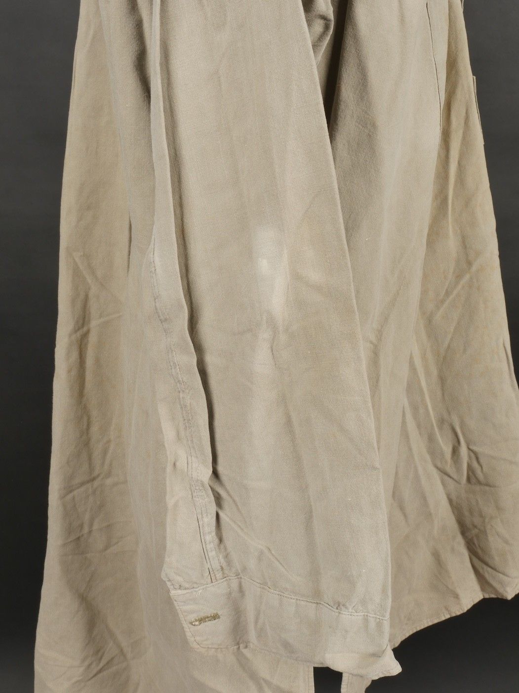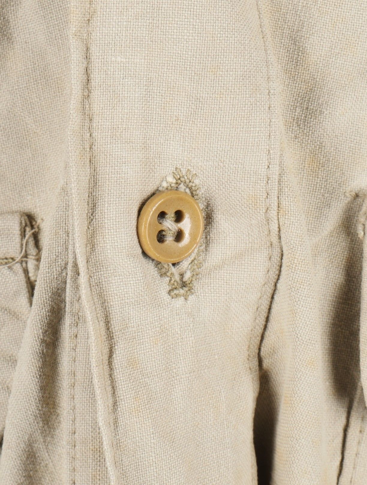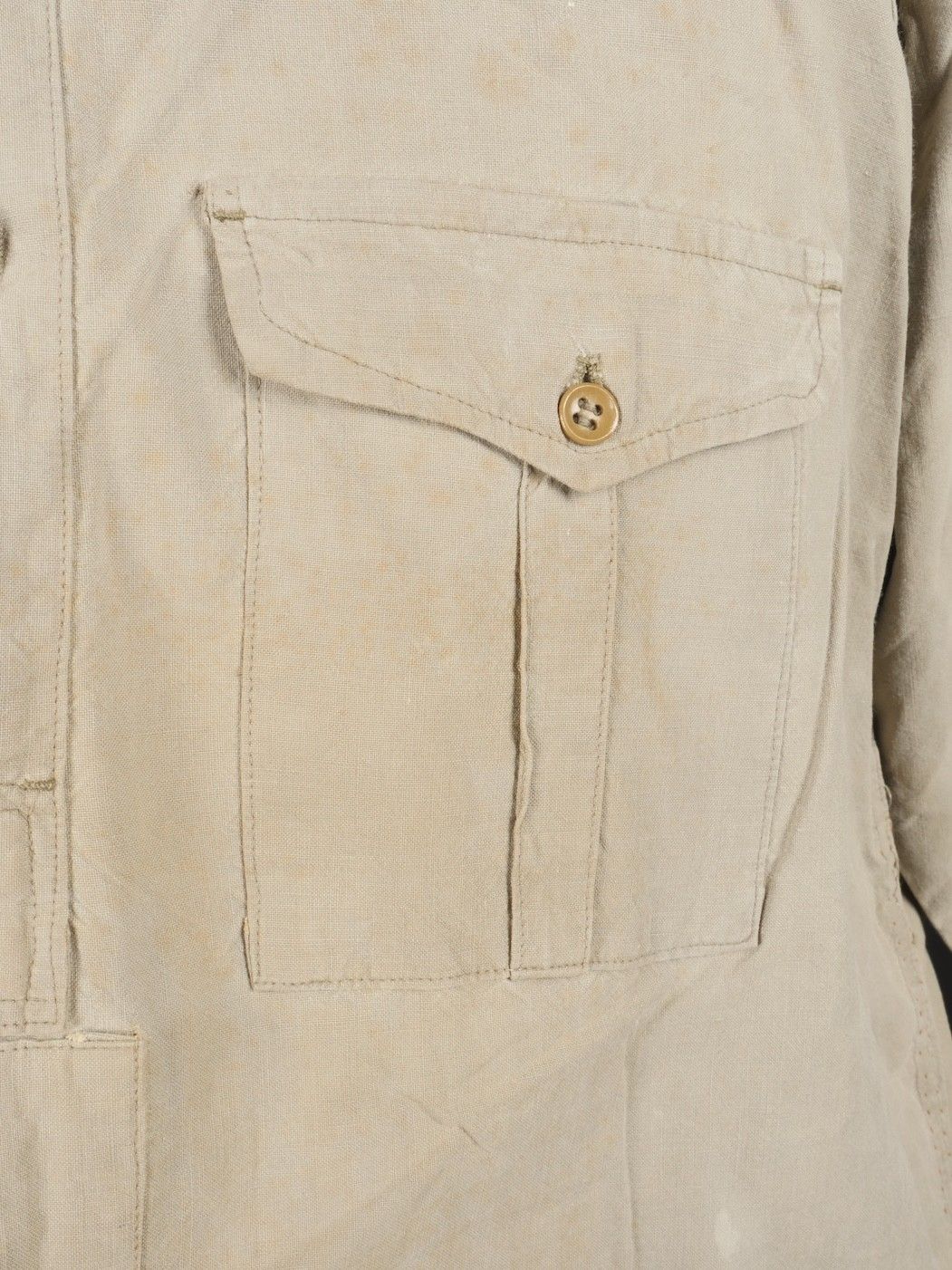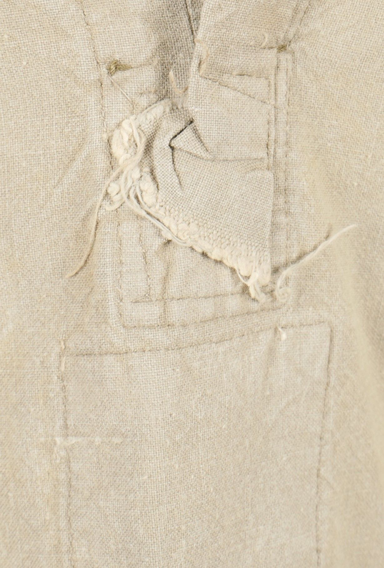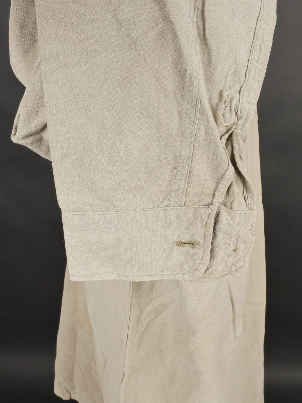 1935 shirt. Regulation model in khaki fabric fastened by three buttons, buttons on back of collar present. Original sewn square of cloth on chest, unit stamp on square. Good mannequin size, shirt darned on both sides on the lower part. Shirt 1935 Regulation model in khaki fabric closing with three buttons rear collar buttons present. Original stitched cloth patch on the chest with unit stamp. Good mannequin size shirt repaired on both lower sides.