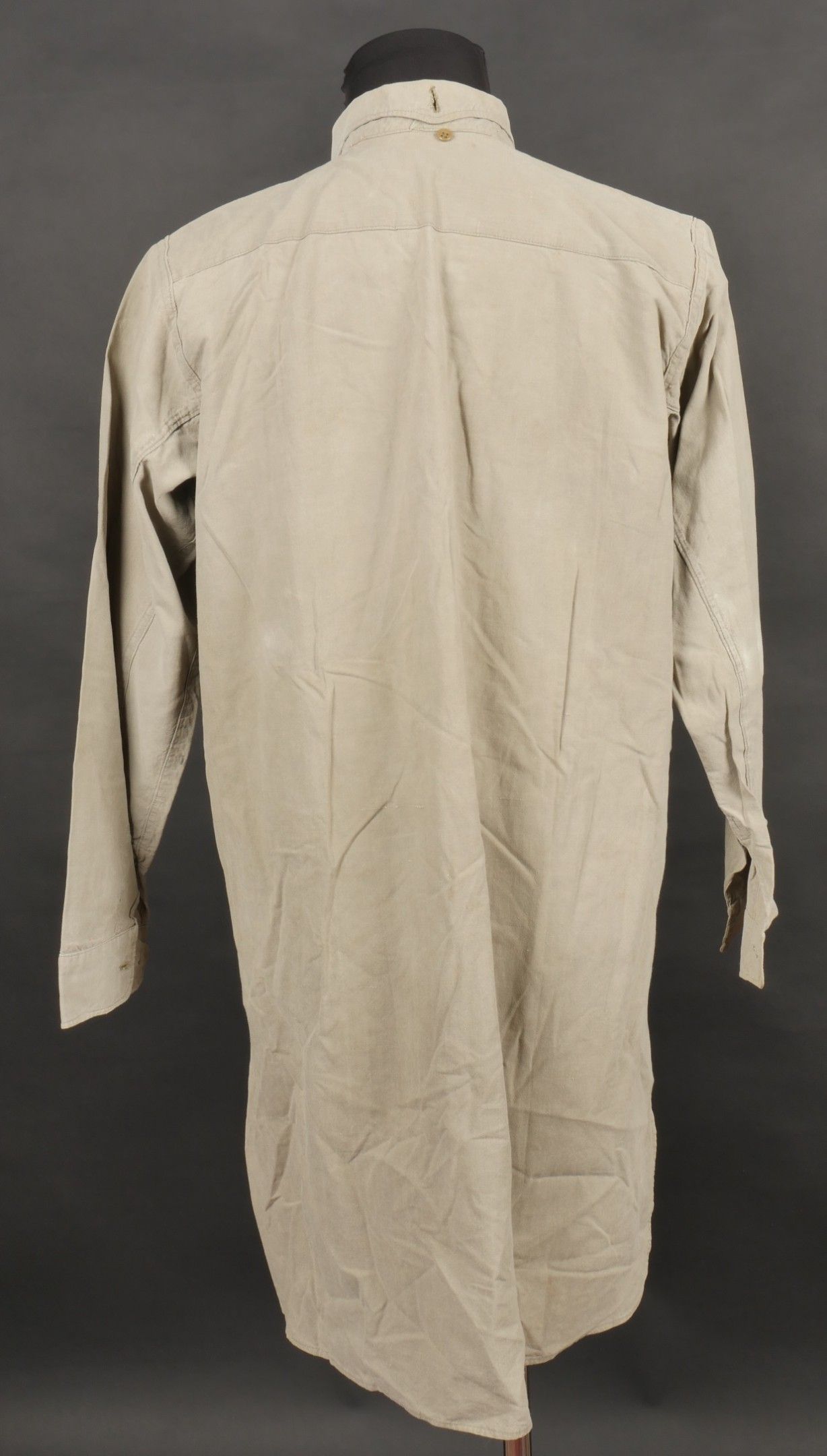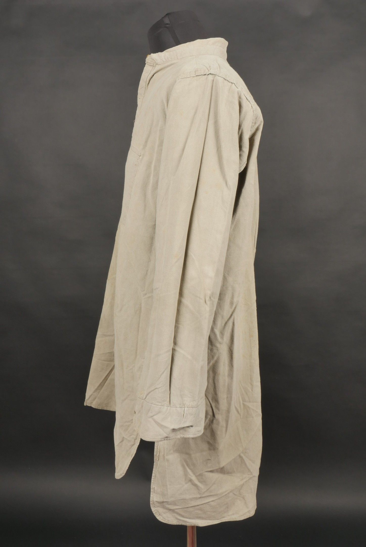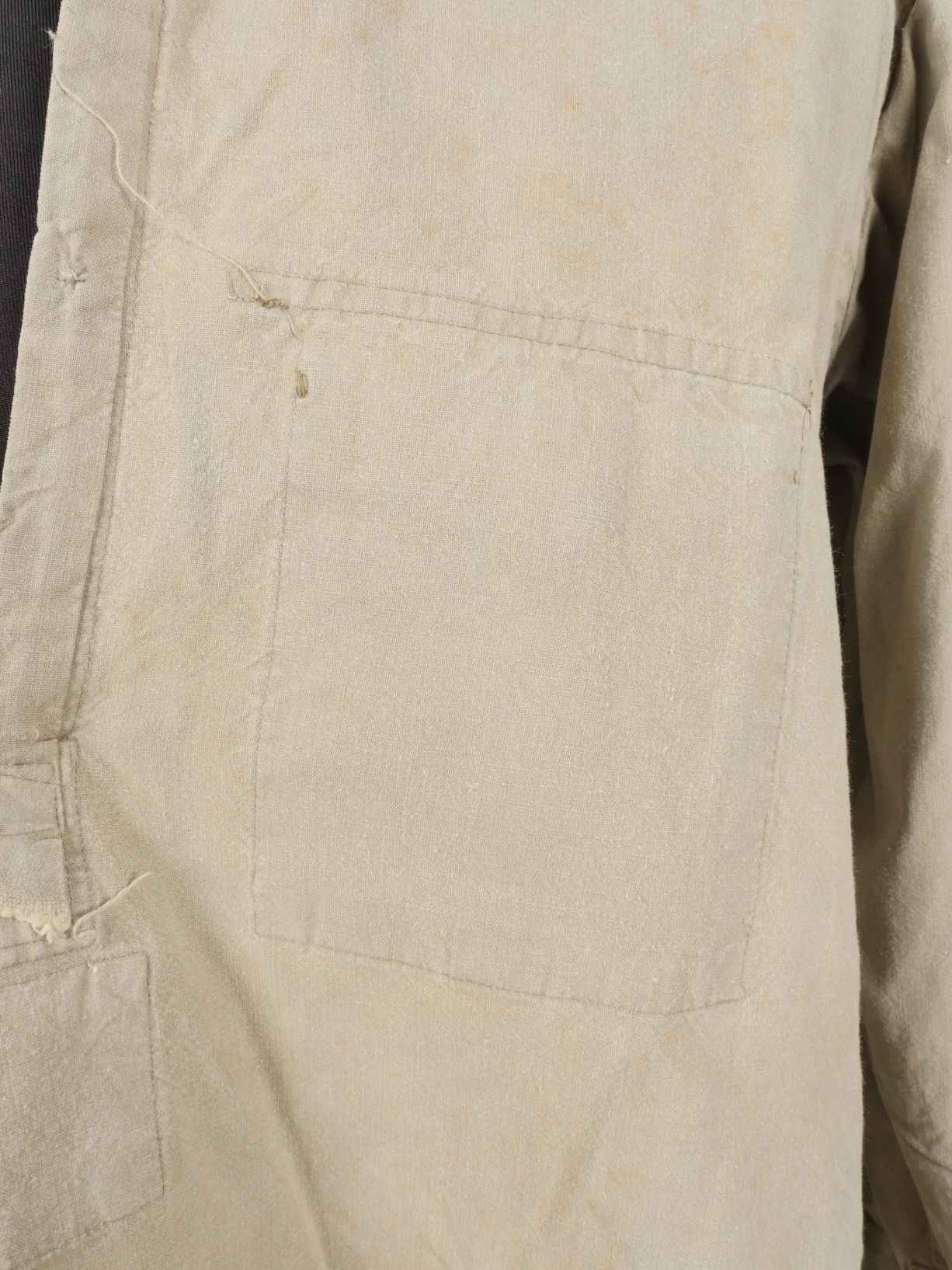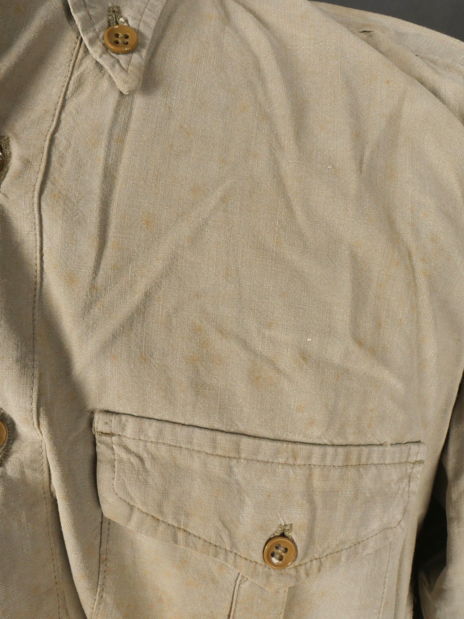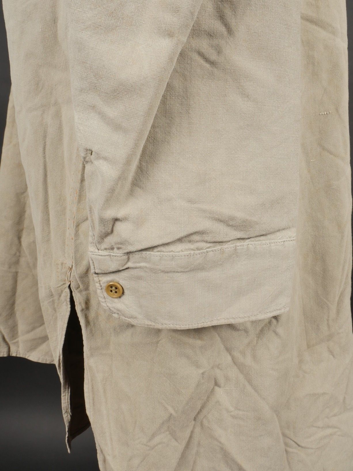 1935 shirt. Regulation model in khaki fabric fastened by three buttons, buttons on back of collar present. Original sewn square of cloth on chest, unit stamp on square. Good mannequin size, shirt darned on both sides on the lower part. Shirt 1935 Regulation model in khaki fabric closing with three buttons rear collar buttons present. Original stitched cloth patch on the chest with unit stamp. Good mannequin size shirt repaired on both lower sides.