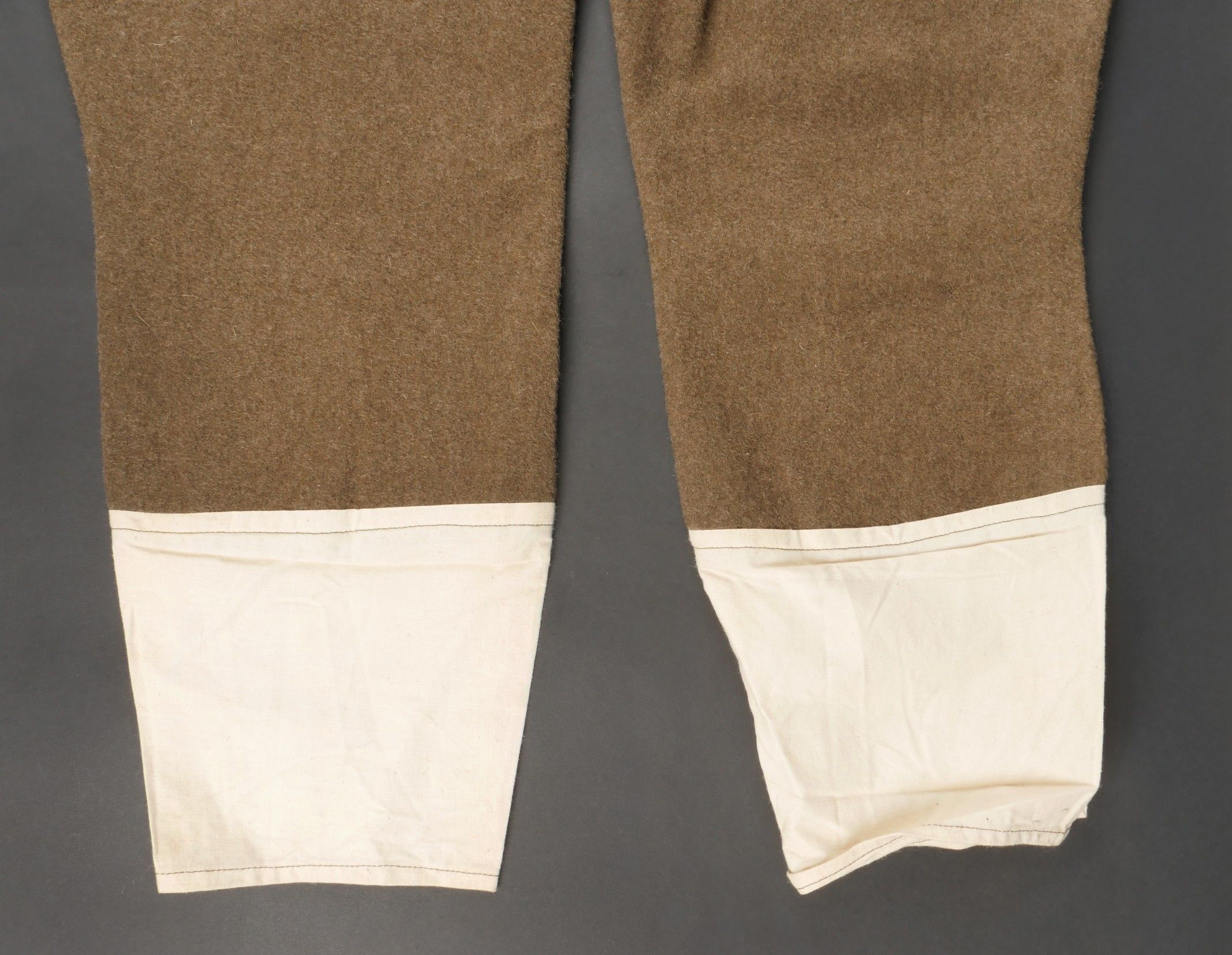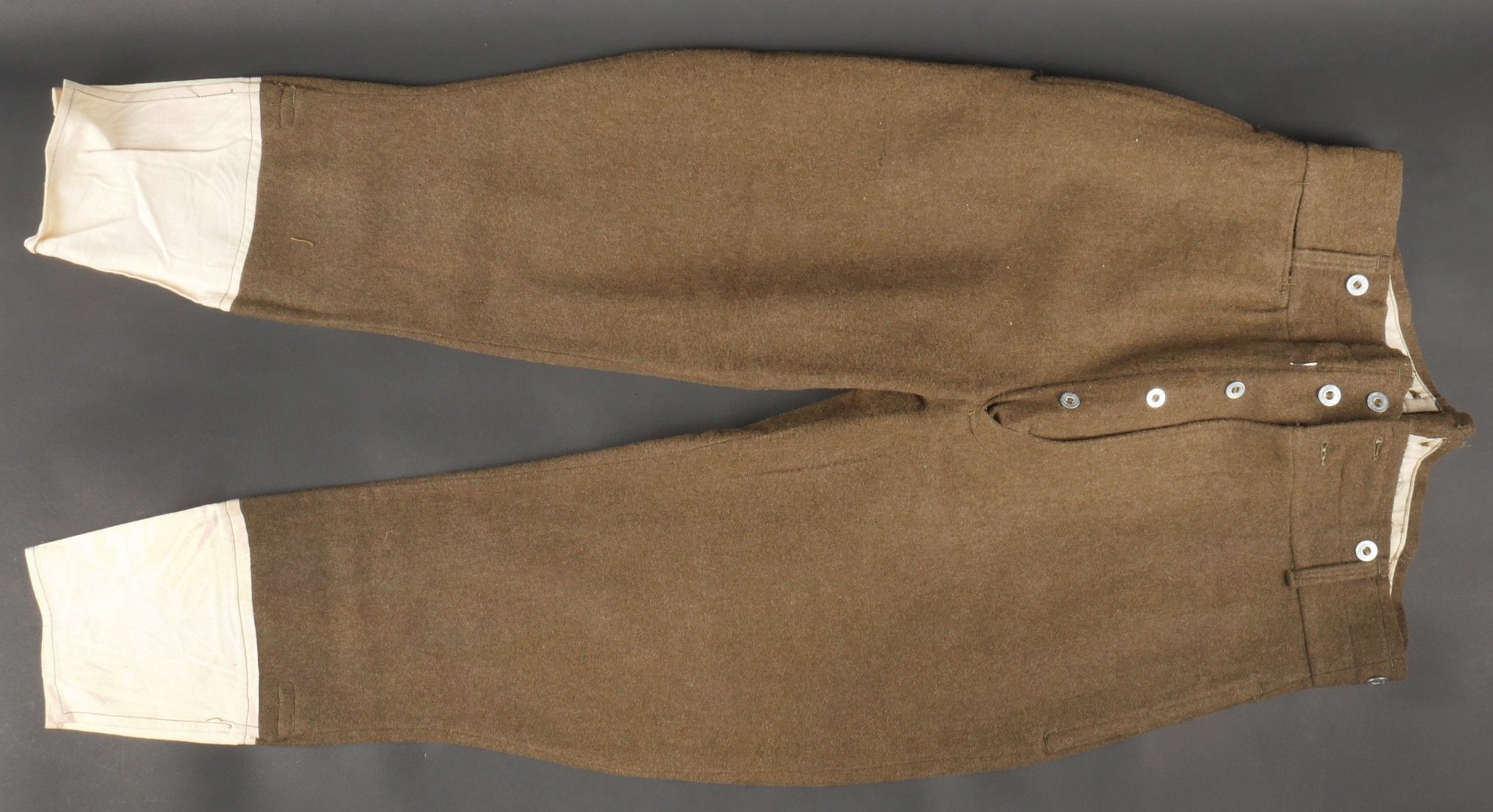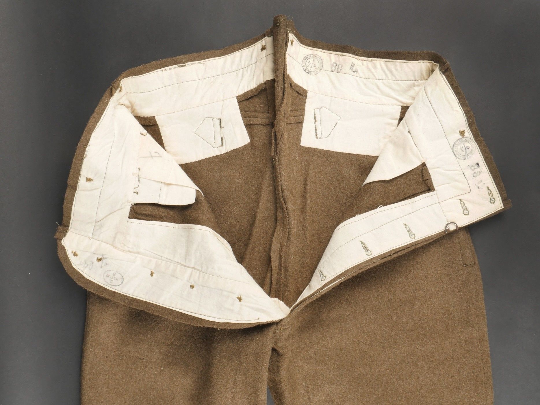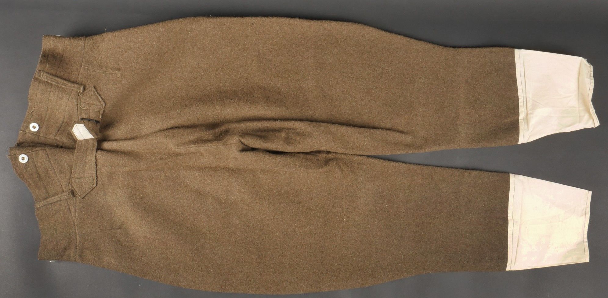 1922 breeches. Khaki cloth, unbleached cotton cuffs, five buttons closing the fly, unbleached cotton lining with size and maker markings and date 339. Like new, never worn, a few moth holes from storage. Breeches 1922 Khaki wool with unbleached cotton cuffs five buttons on the fly unbleached cotton lining marked with size manufacturer and date 339. Unworn condition with minor moth holes from storage.