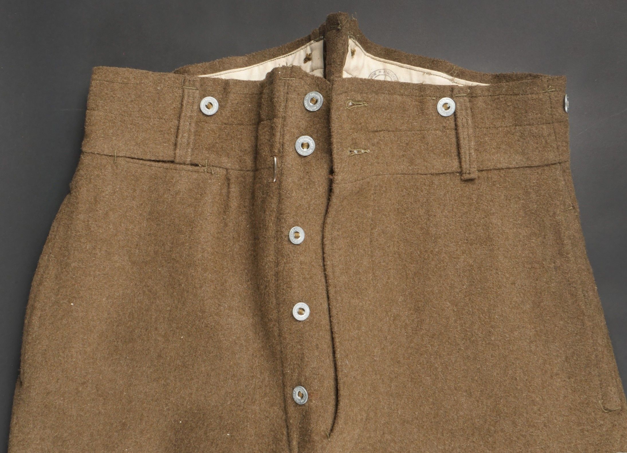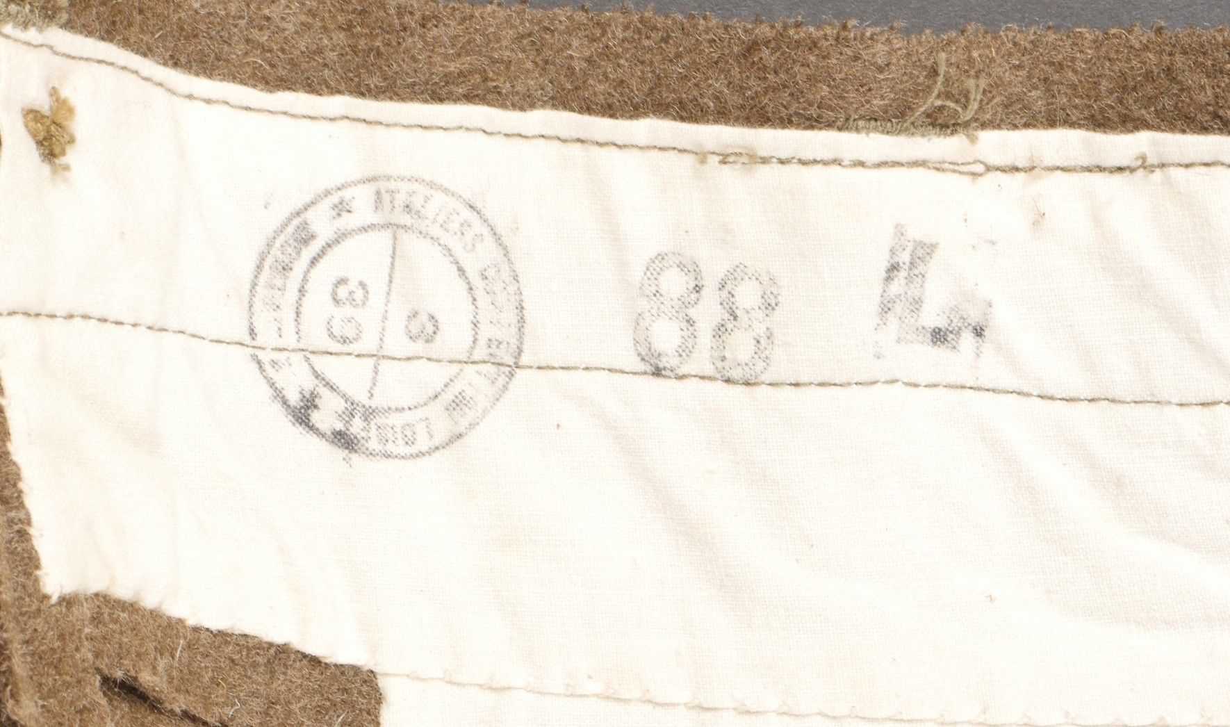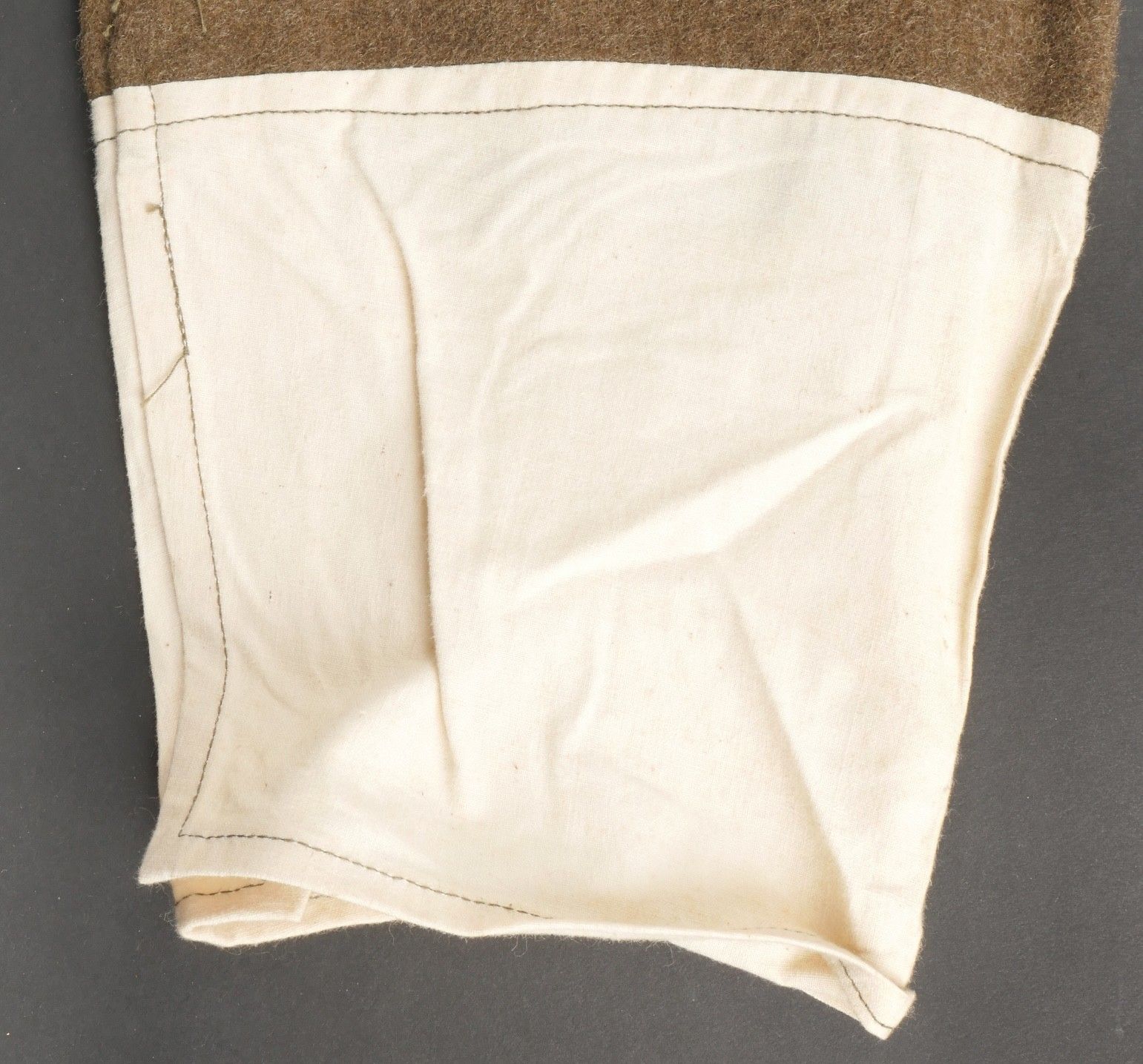 1922 breeches. Khaki cloth, unbleached cotton cuffs, five buttons closing the fly, unbleached cotton lining with size and maker markings and date 339. Like new, never worn, a few moth holes from storage. Breeches 1922 Khaki wool with unbleached cotton cuffs five buttons on the fly unbleached cotton lining marked with size manufacturer and date 339. Unworn condition with minor moth holes from storage.