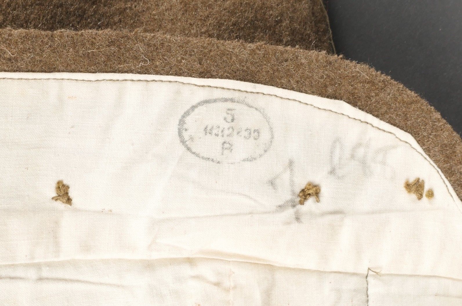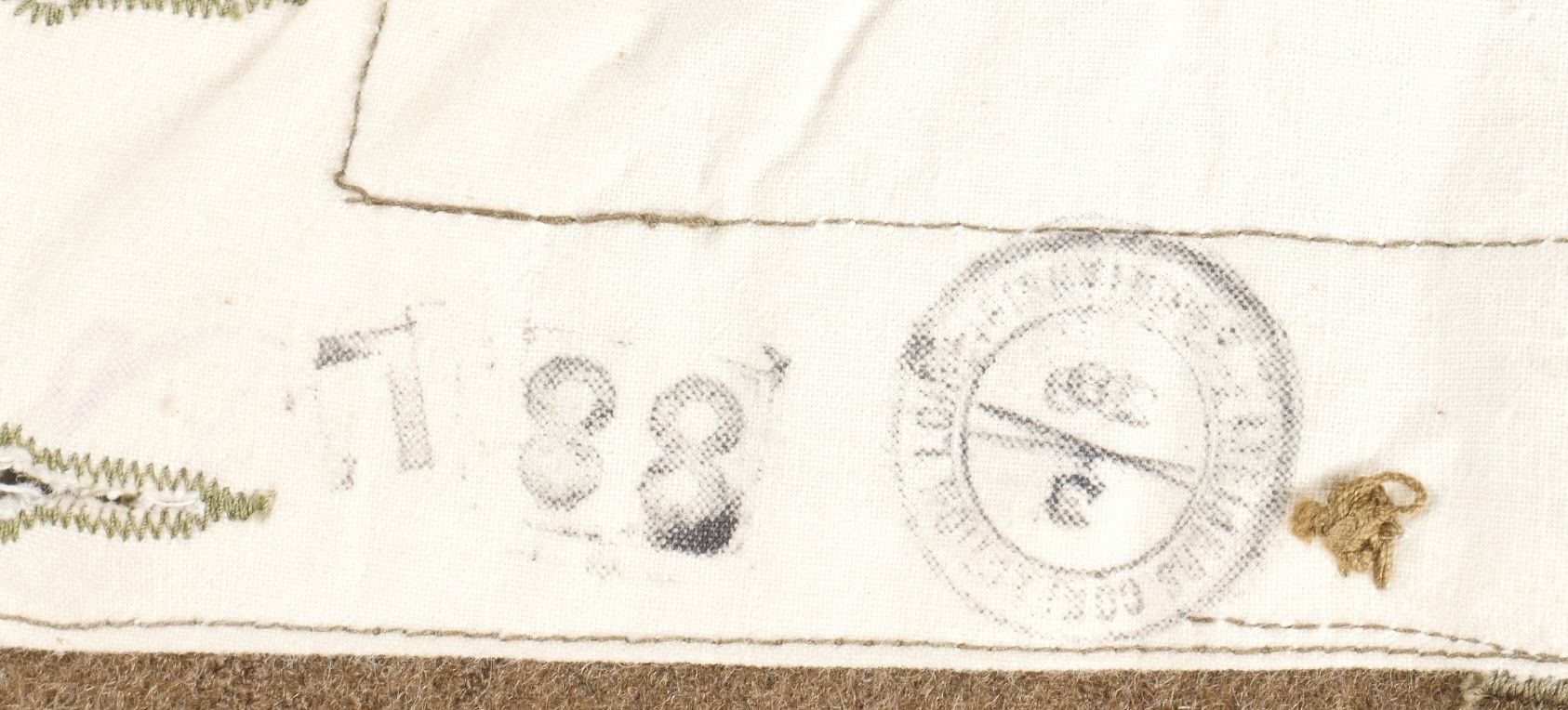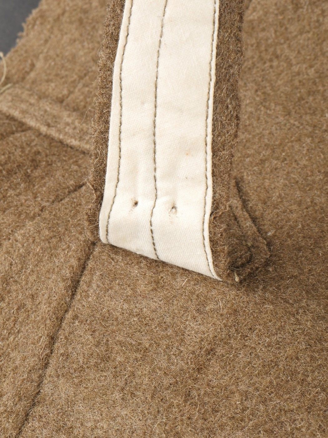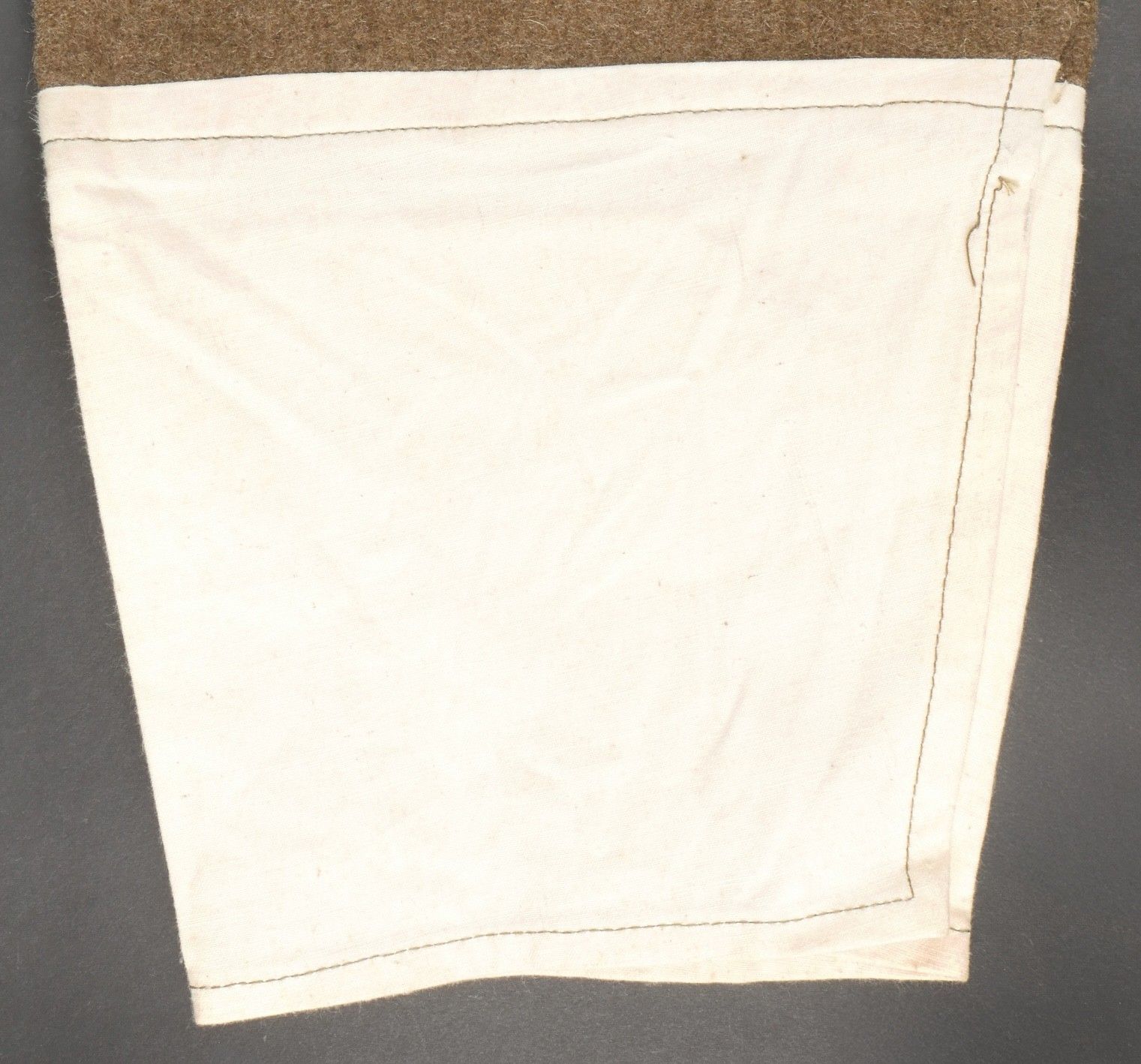 1922 breeches. Khaki cloth, unbleached cotton cuffs, five buttons closing the fly, unbleached cotton lining with size and maker markings and date 339. Like new, never worn, a few moth holes from storage. Breeches 1922 Khaki wool with unbleached cotton cuffs five buttons on the fly unbleached cotton lining marked with size manufacturer and date 339. Unworn condition with minor moth holes from storage.