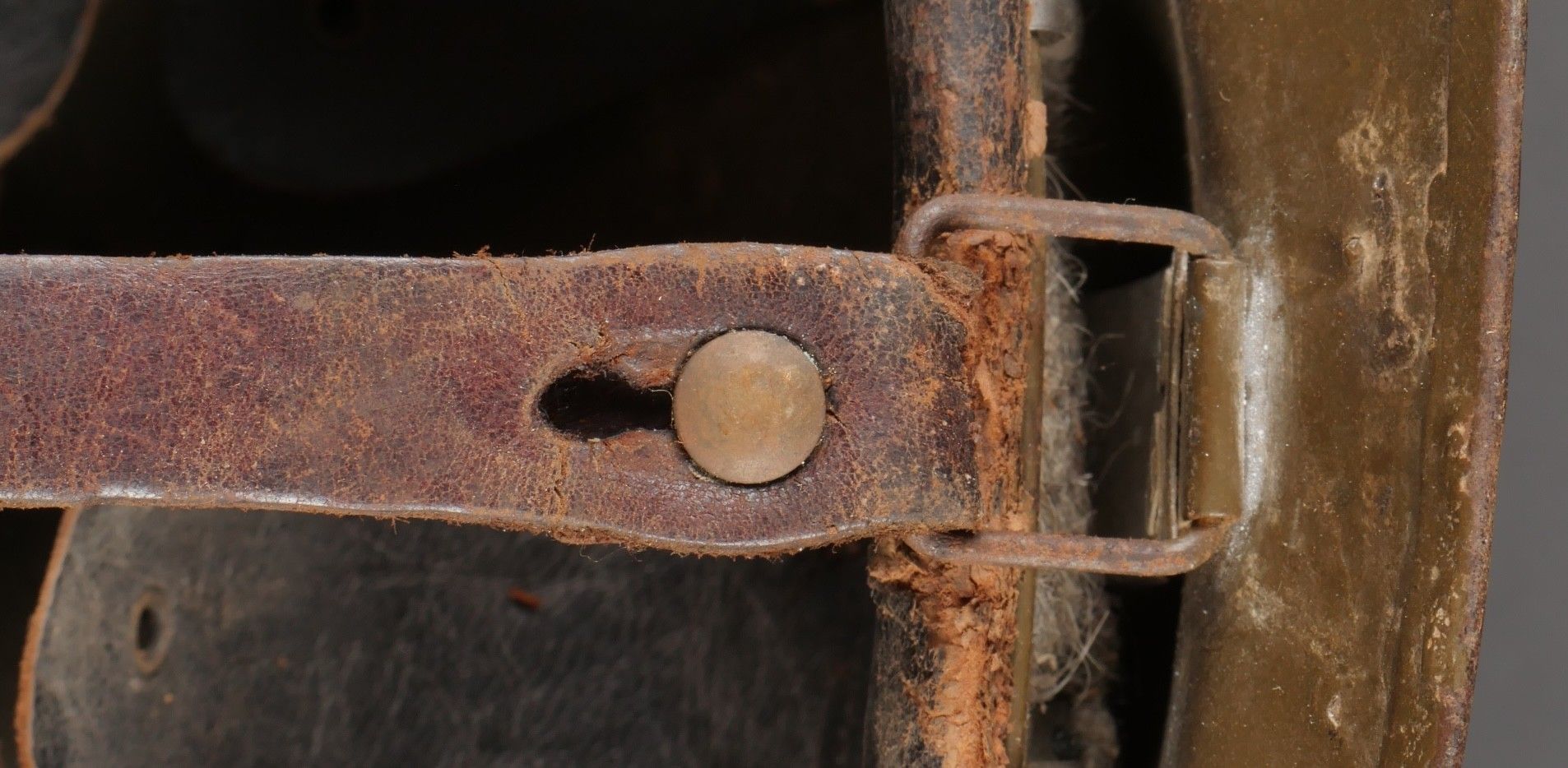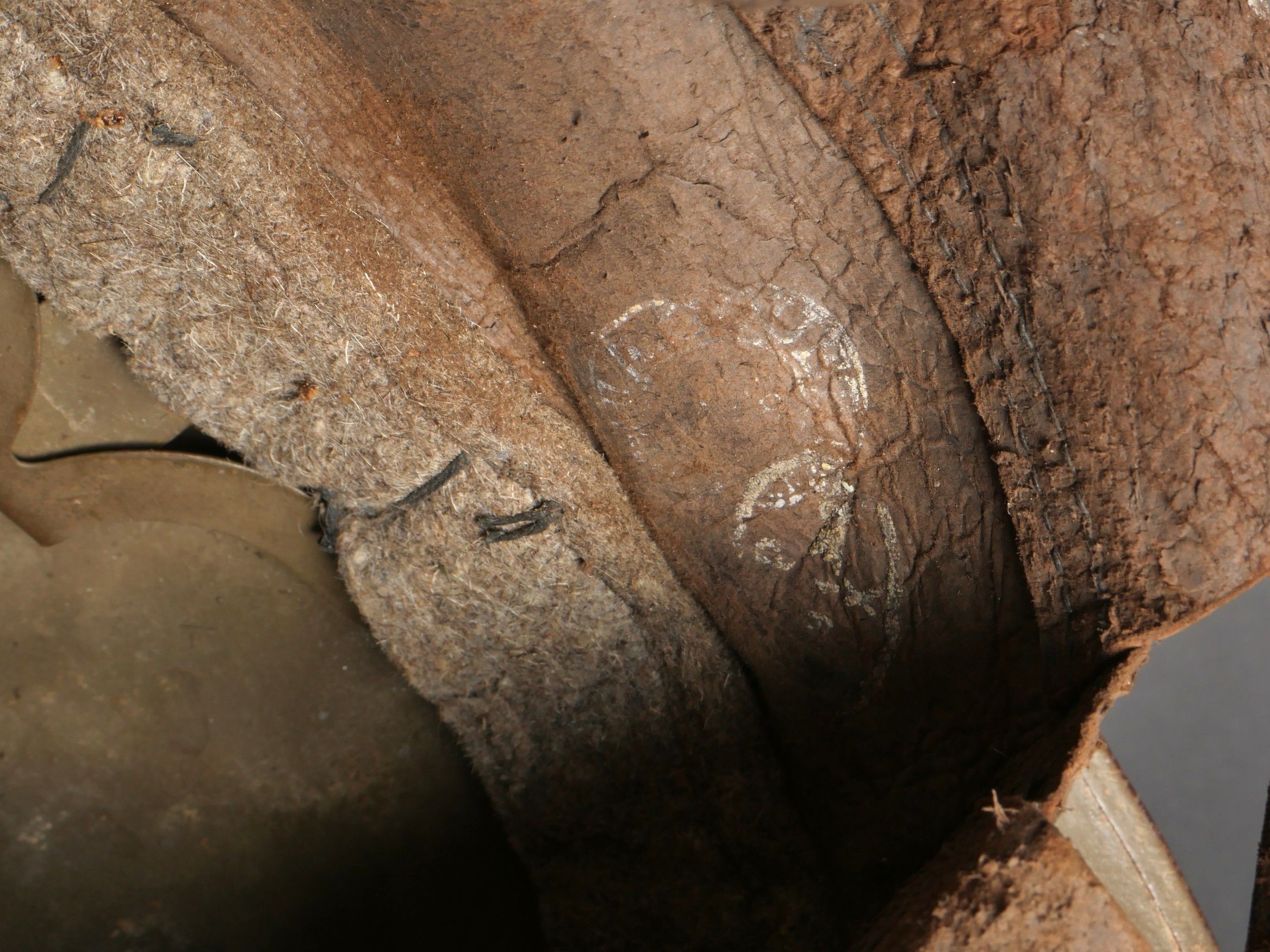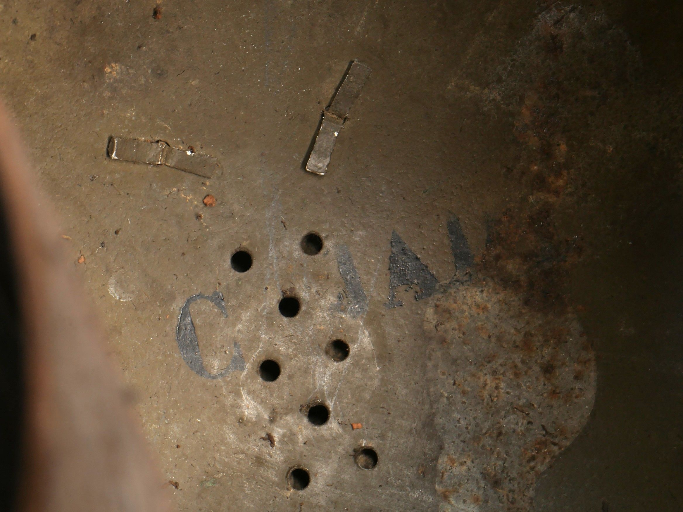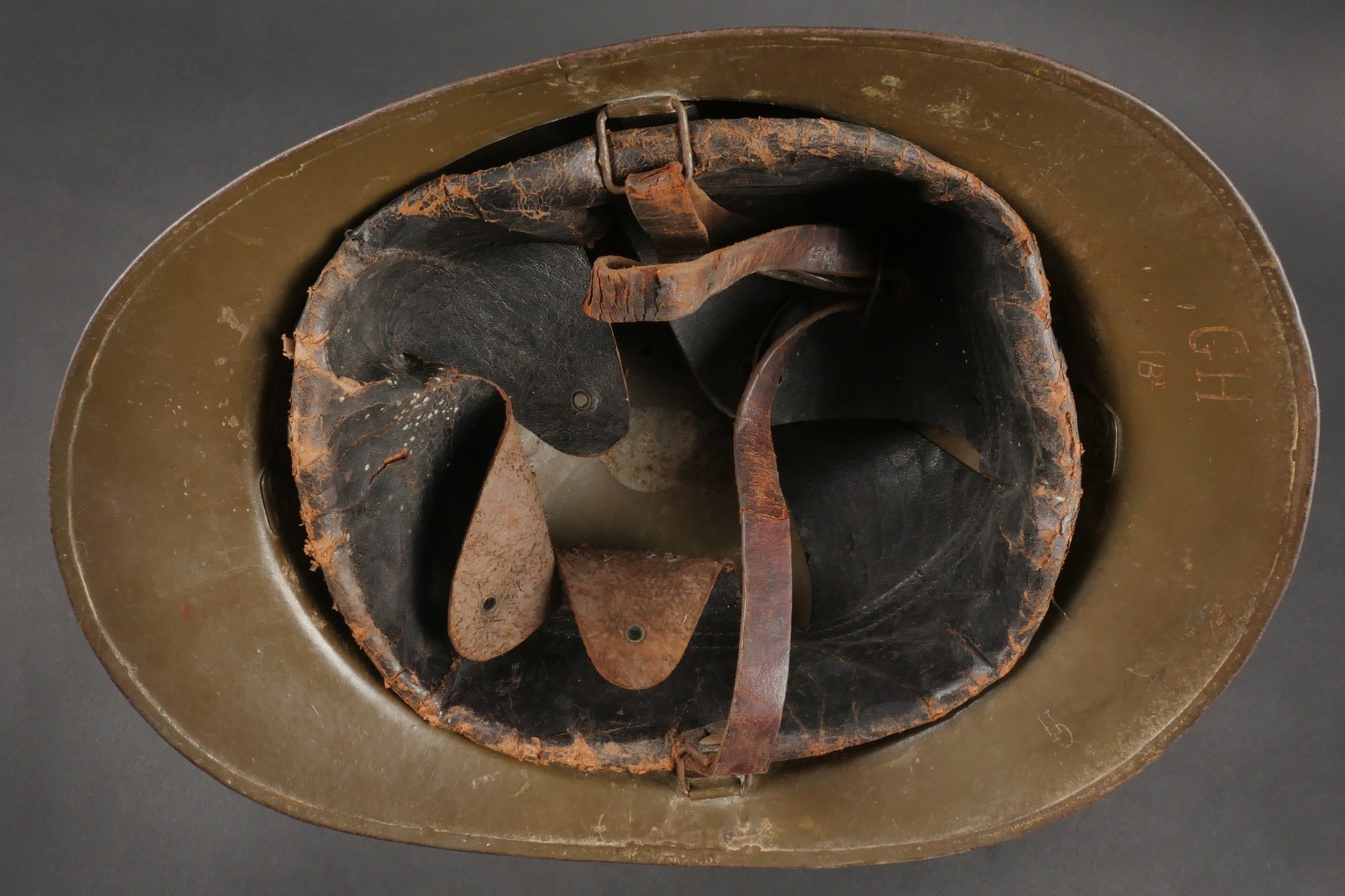 Adrian 1926 artillery helmet. Model 1926, 80% khaki paint, model 1915 artillery helmet. Aluminium crest with 50% of its paint. Leather cap with six wolf teeth and eight clasps, marked Japy in size C on the bottom of the bomb. Original chinstrap, the soldier has engraved his initials in the nape of the neck. Adrian helmet 1926 artillery Model 1926 with 80% khaki paint fitted with the 1915 artillery emblem. Aluminum comb retaining 50% of its paint. Leather liner with six tongue segments held by eight clips manufacturer Japy marked size C inside the shell. Original chinstrap soldier's initials engraved inside the neck guard.