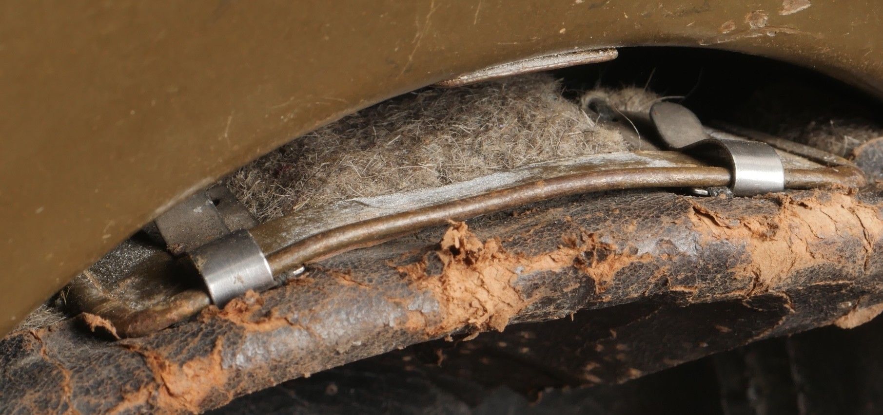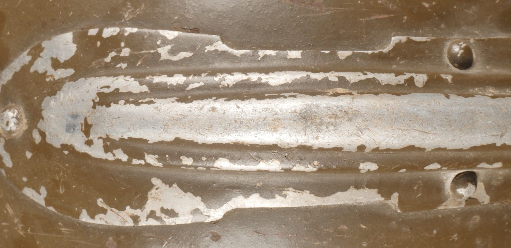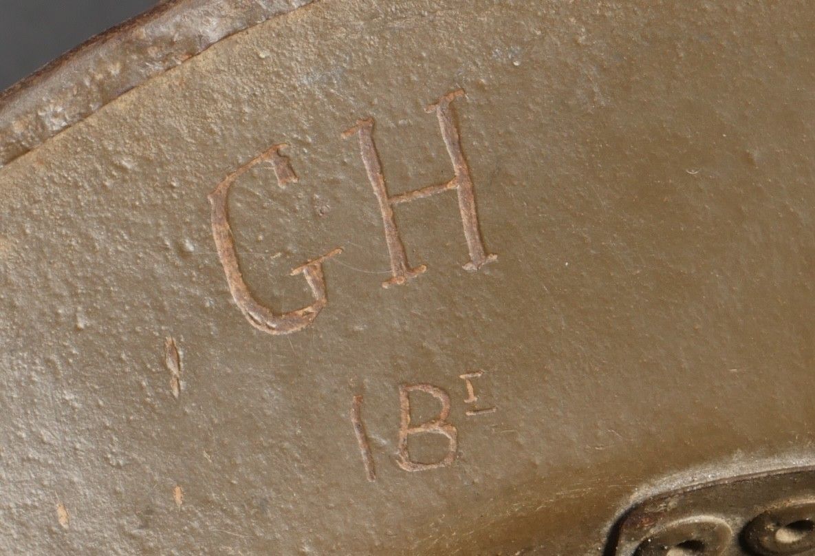 Adrian 1926 artillery helmet. Model 1926, 80% khaki paint, model 1915 artillery helmet. Aluminium crest with 50% of its paint. Leather cap with six wolf teeth and eight clasps, marked Japy in size C on the bottom of the bomb. Original chinstrap, the soldier has engraved his initials in the nape of the neck. Adrian helmet 1926 artillery Model 1926 with 80% khaki paint fitted with the 1915 artillery emblem. Aluminum comb retaining 50% of its paint. Leather liner with six tongue segments held by eight clips manufacturer Japy marked size C inside the shell. Original chinstrap soldier's initials engraved inside the neck guard.