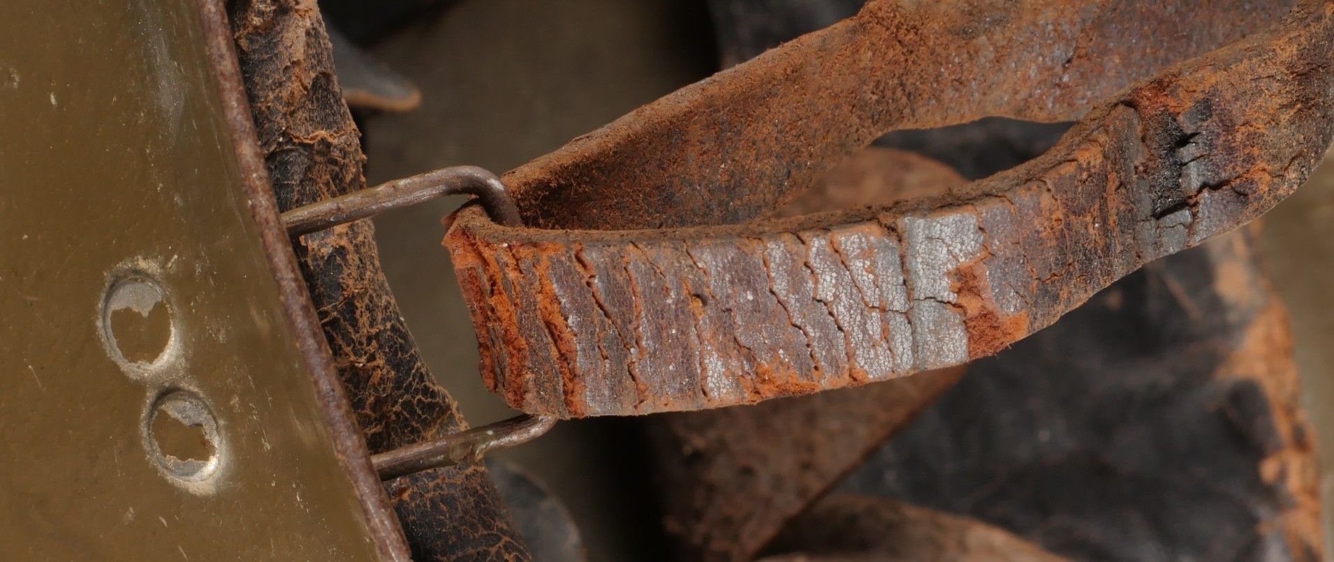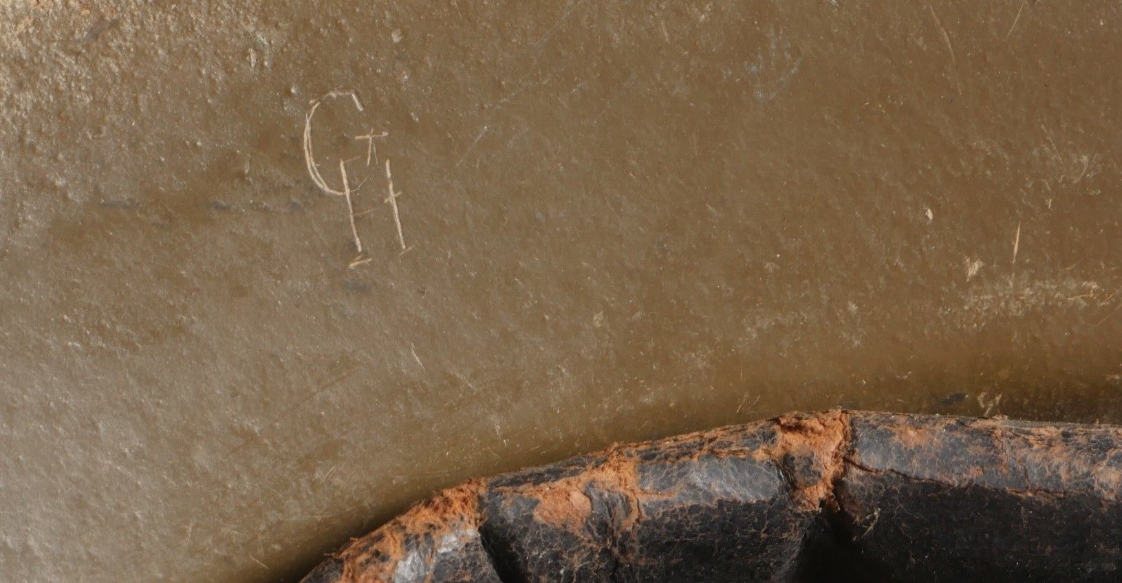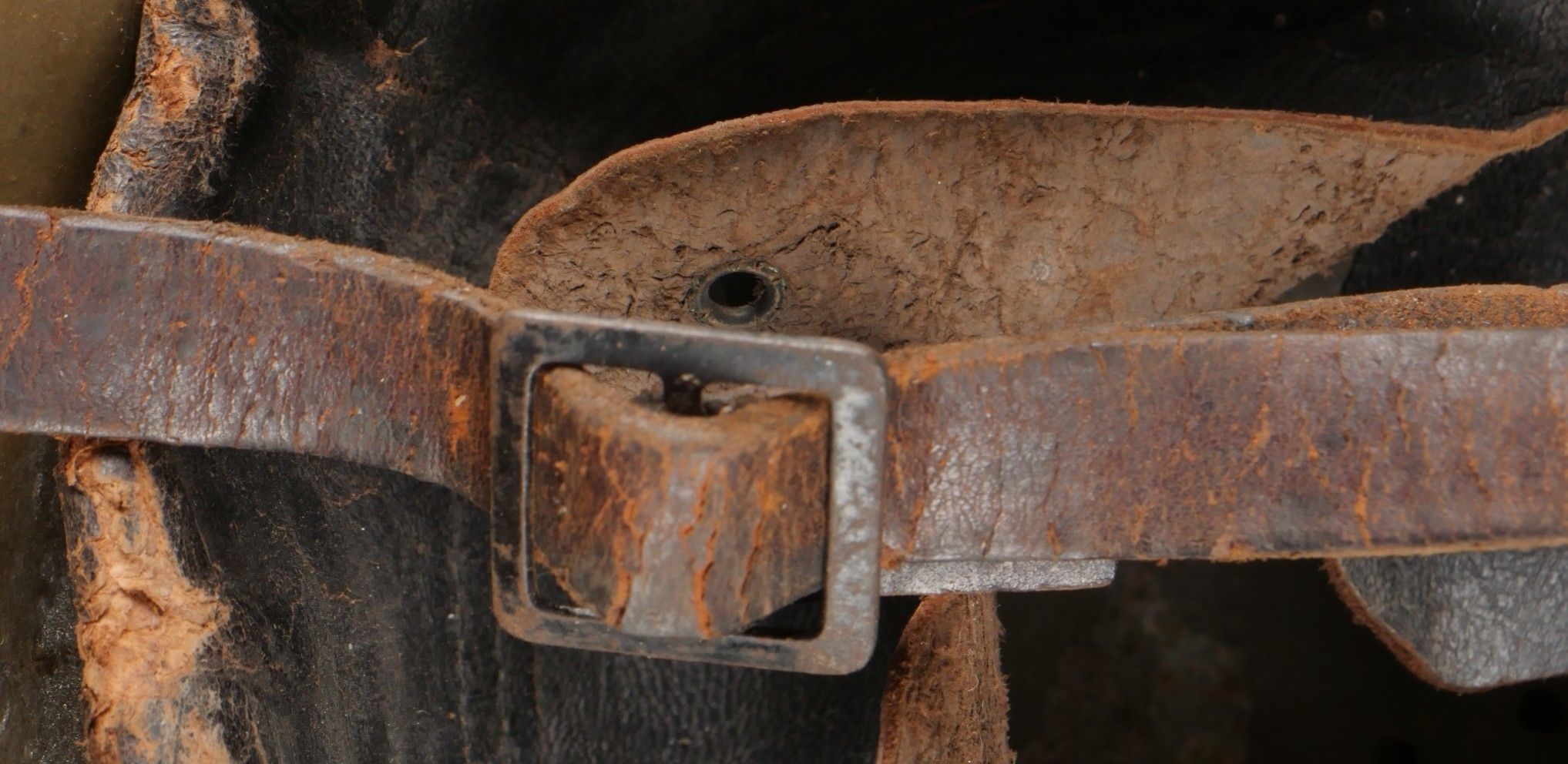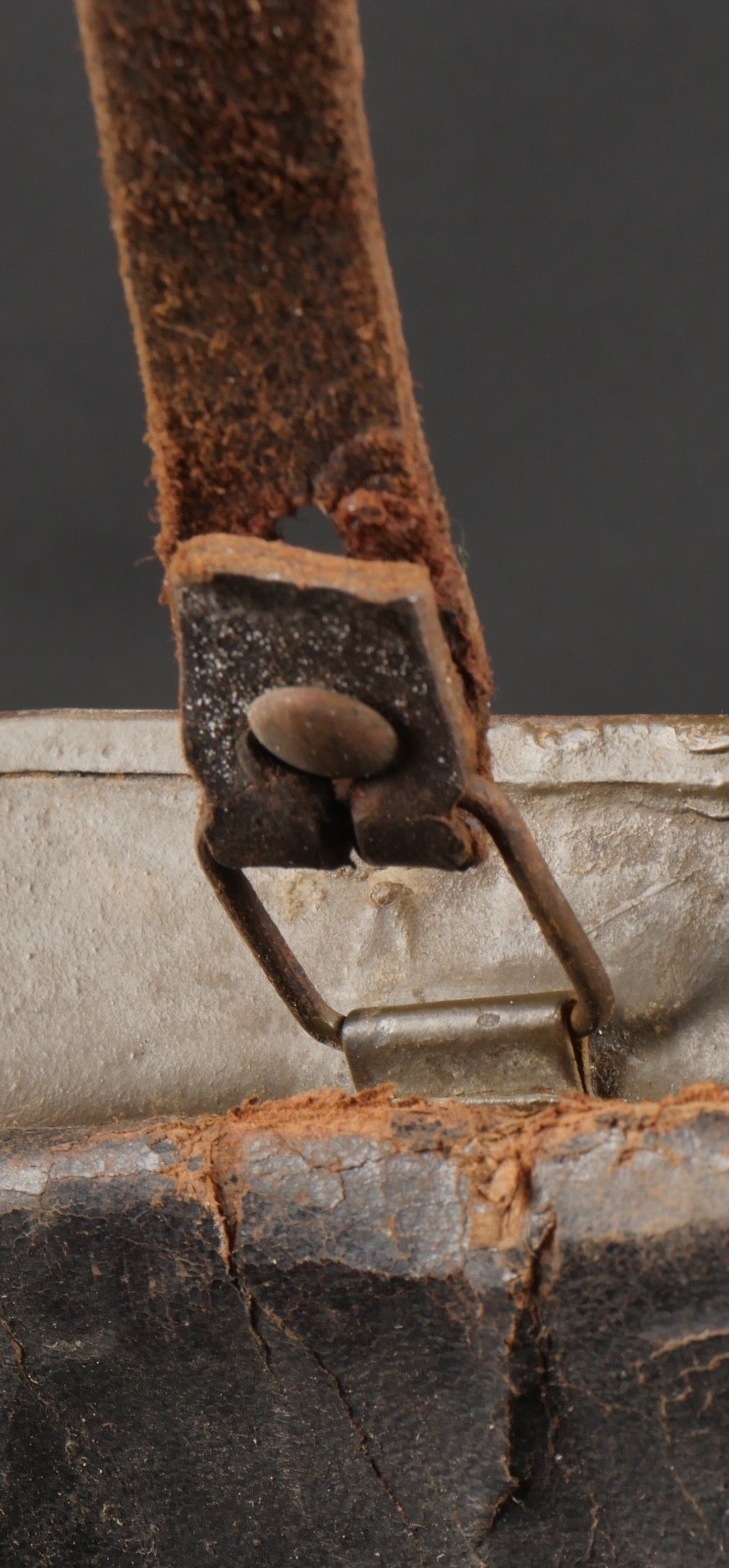 Adrian 1926 artillery helmet. Model 1926, 80% khaki paint, model 1915 artillery helmet. Aluminium crest with 50% of its paint. Leather cap with six wolf teeth and eight clasps, marked Japy in size C on the bottom of the bomb. Original chinstrap, the soldier has engraved his initials in the nape of the neck. Adrian helmet 1926 artillery Model 1926 with 80% khaki paint fitted with the 1915 artillery emblem. Aluminum comb retaining 50% of its paint. Leather liner with six tongue segments held by eight clips manufacturer Japy marked size C inside the shell. Original chinstrap soldier's initials engraved inside the neck guard.
