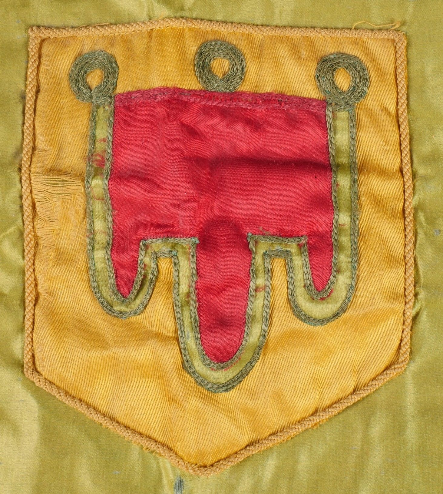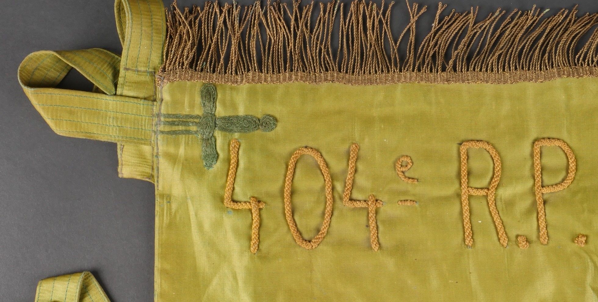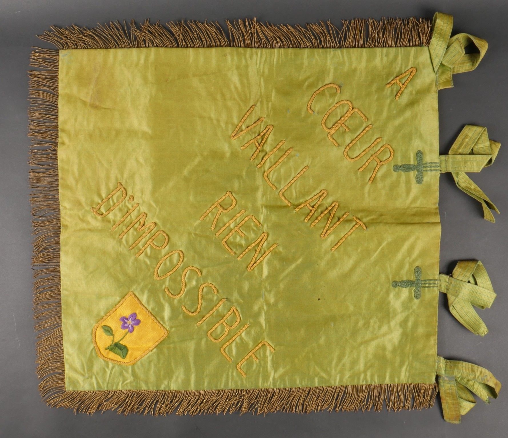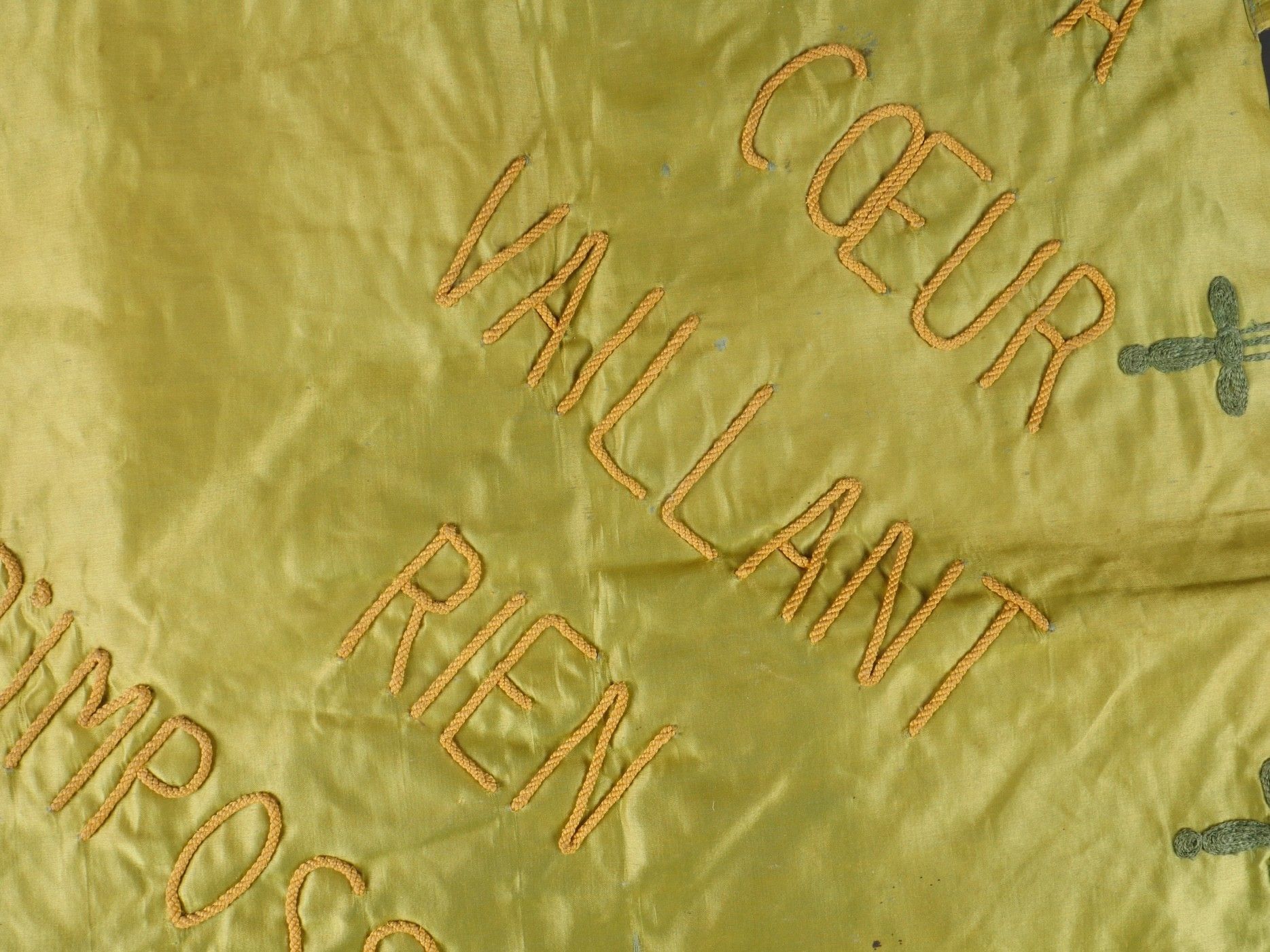 404th RP pennant. Two-sided pennant of the 9th company of the 404th pioneer regiment, made of green silk and bearing the arms of Auvergne in the centre. The back is embroidered with yellow cotton thread A cœur vaillant rien d'impossible. The pennant is fringed on three sides, with four bows made from the same fabric as the pennant to be fixed to a flagstaff. Dimensions excluding fringe 55x49cm. Pennant 404th RP Doublesided pennant of the 9th Company 404th Pioneer Regiment made of green silk with the arms of Auvergne embroidered in the centre. On the reverse the motto A cœur vaillant rien d'impossible embroidered in yellow cotton thread. Pennant fringed on three sides with four ties of matching fabric for mounting. Dimensions without fringe 55x49 cm.