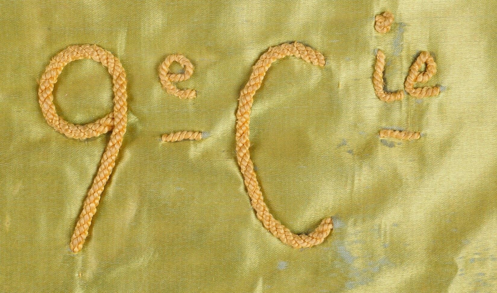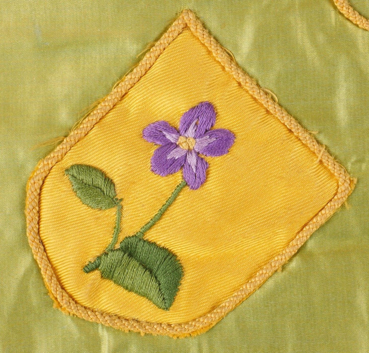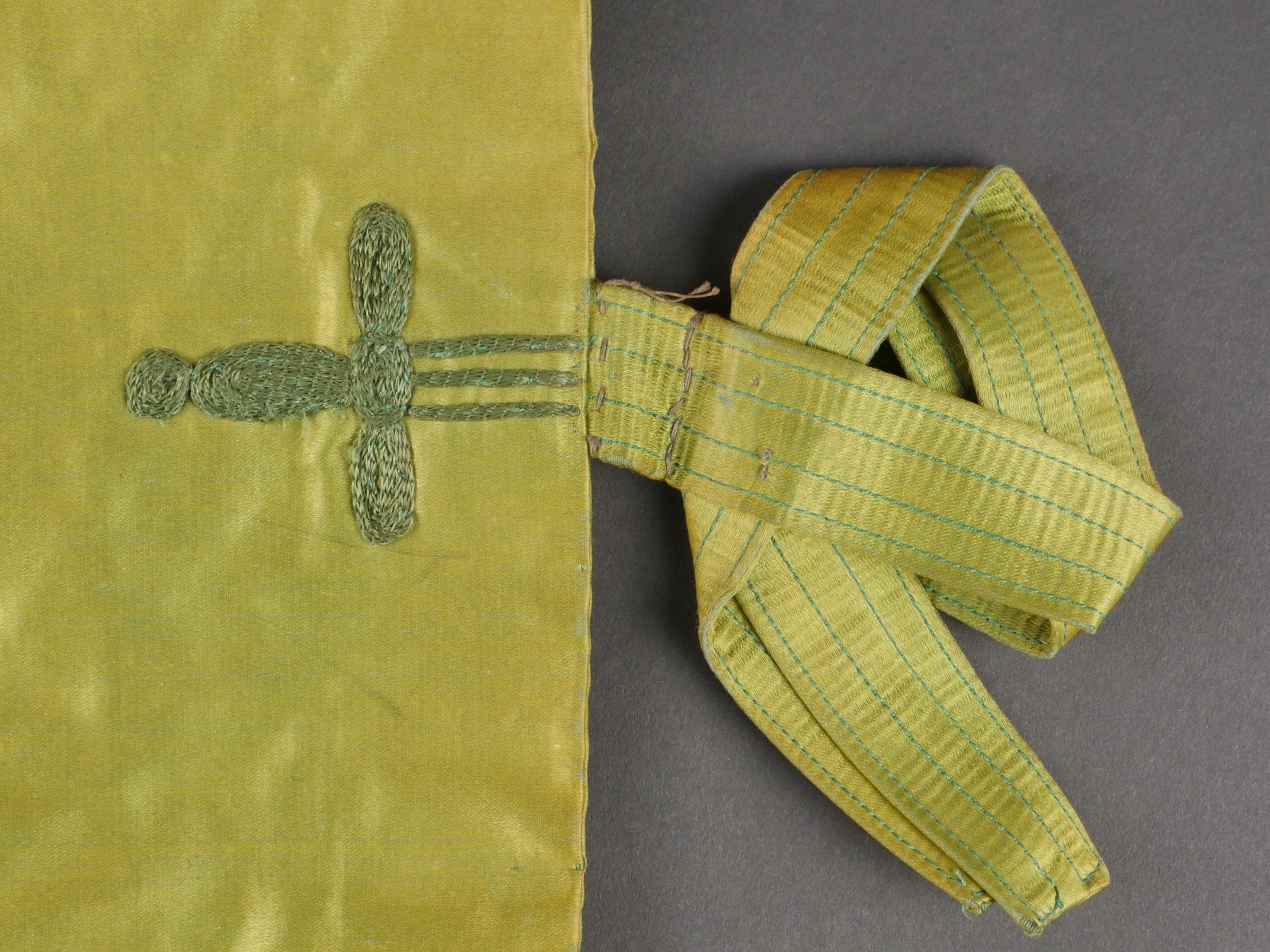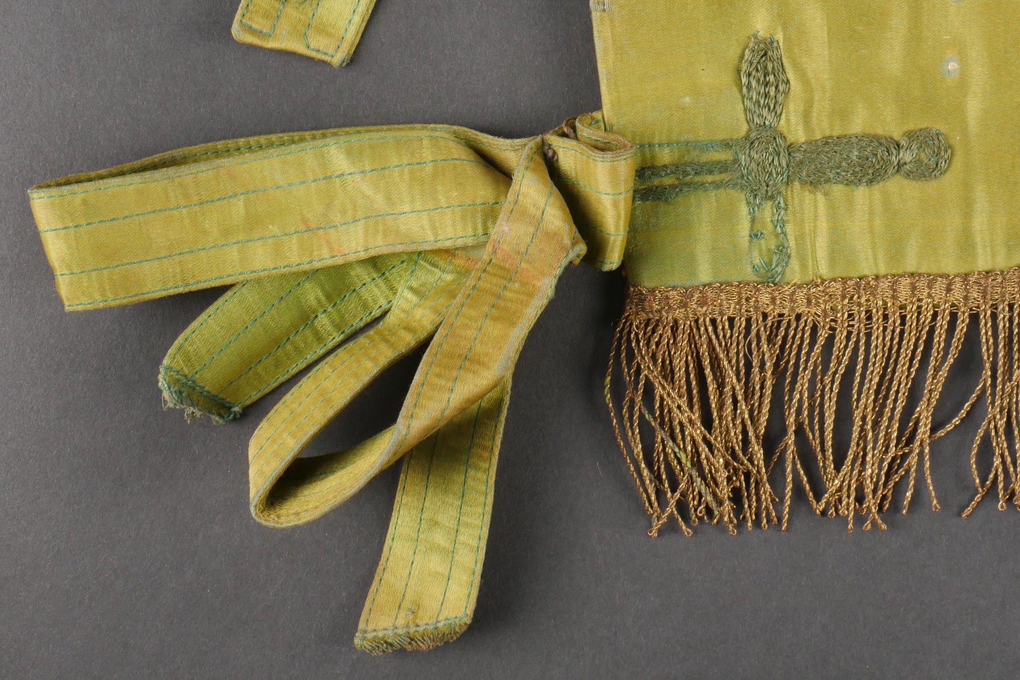 404th RP pennant. Two-sided pennant of the 9th company of the 404th pioneer regiment, made of green silk and bearing the arms of Auvergne in the centre. The back is embroidered with yellow cotton thread A cœur vaillant rien d'impossible. The pennant is fringed on three sides, with four bows made from the same fabric as the pennant to be fixed to a flagstaff. Dimensions excluding fringe 55x49cm. Pennant 404th RP Doublesided pennant of the 9th Company 404th Pioneer Regiment made of green silk with the arms of Auvergne embroidered in the centre. On the reverse the motto A cœur vaillant rien d'impossible embroidered in yellow cotton thread. Pennant fringed on three sides with four ties of matching fabric for mounting. Dimensions without fringe 55x49 cm.