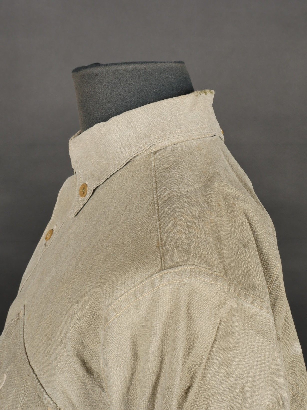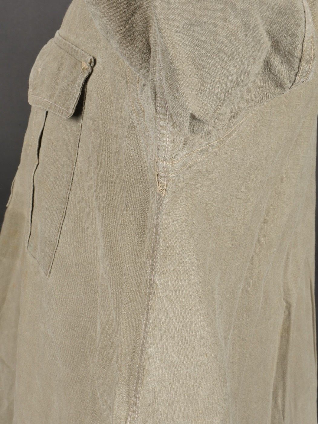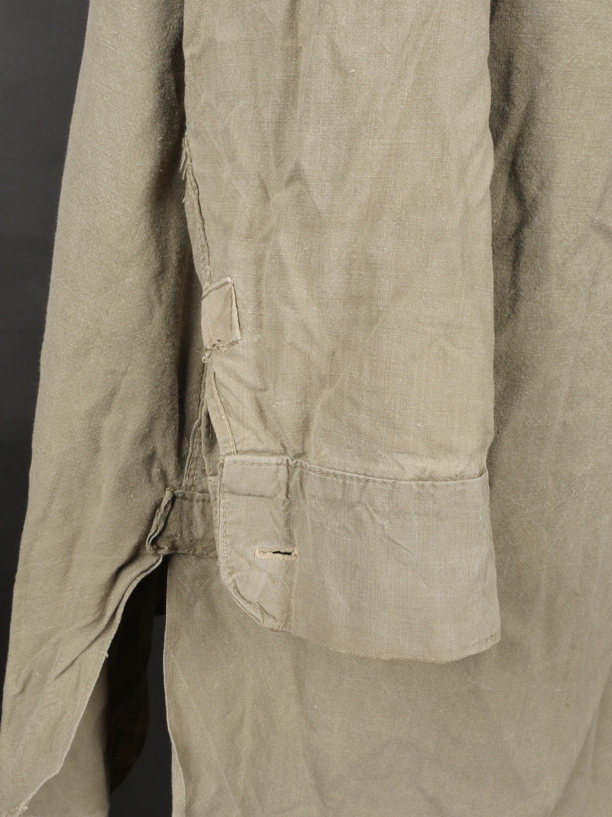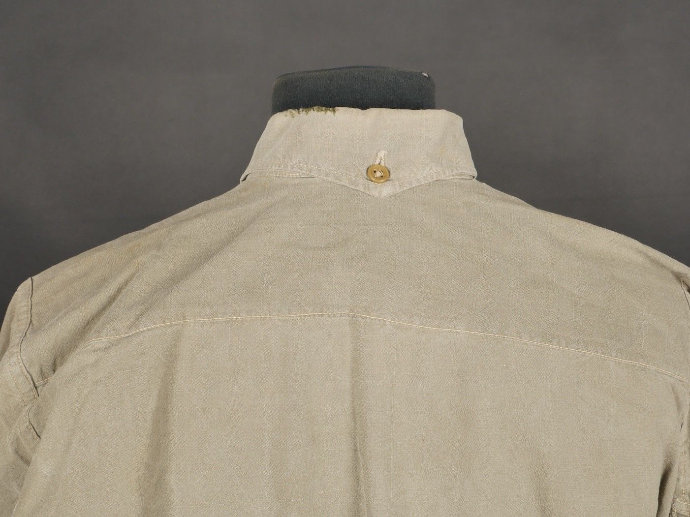 1935 shirt. Regulation model in khaki fabric fastened by three buttons, buttons on back of collar present. Square of cloth on the chest untucked, reception stamp illegible. Good mannequin size, small repair to back of collar. Shirt 1935 Regulation model in khaki fabric closing with three buttons rear collar buttons present chest cloth patch detached illegible reception stamp good mannequin size small repair at back of collar.