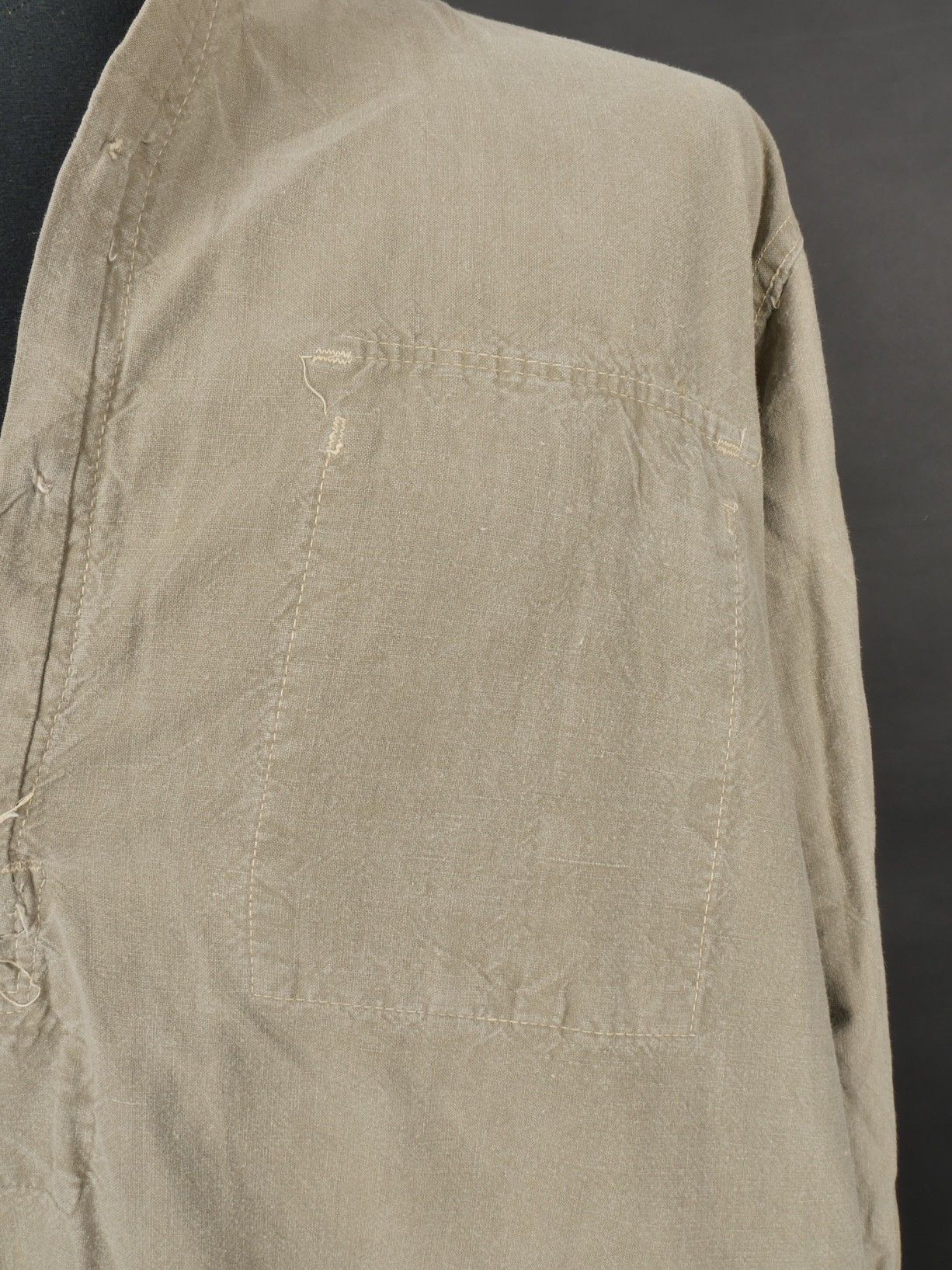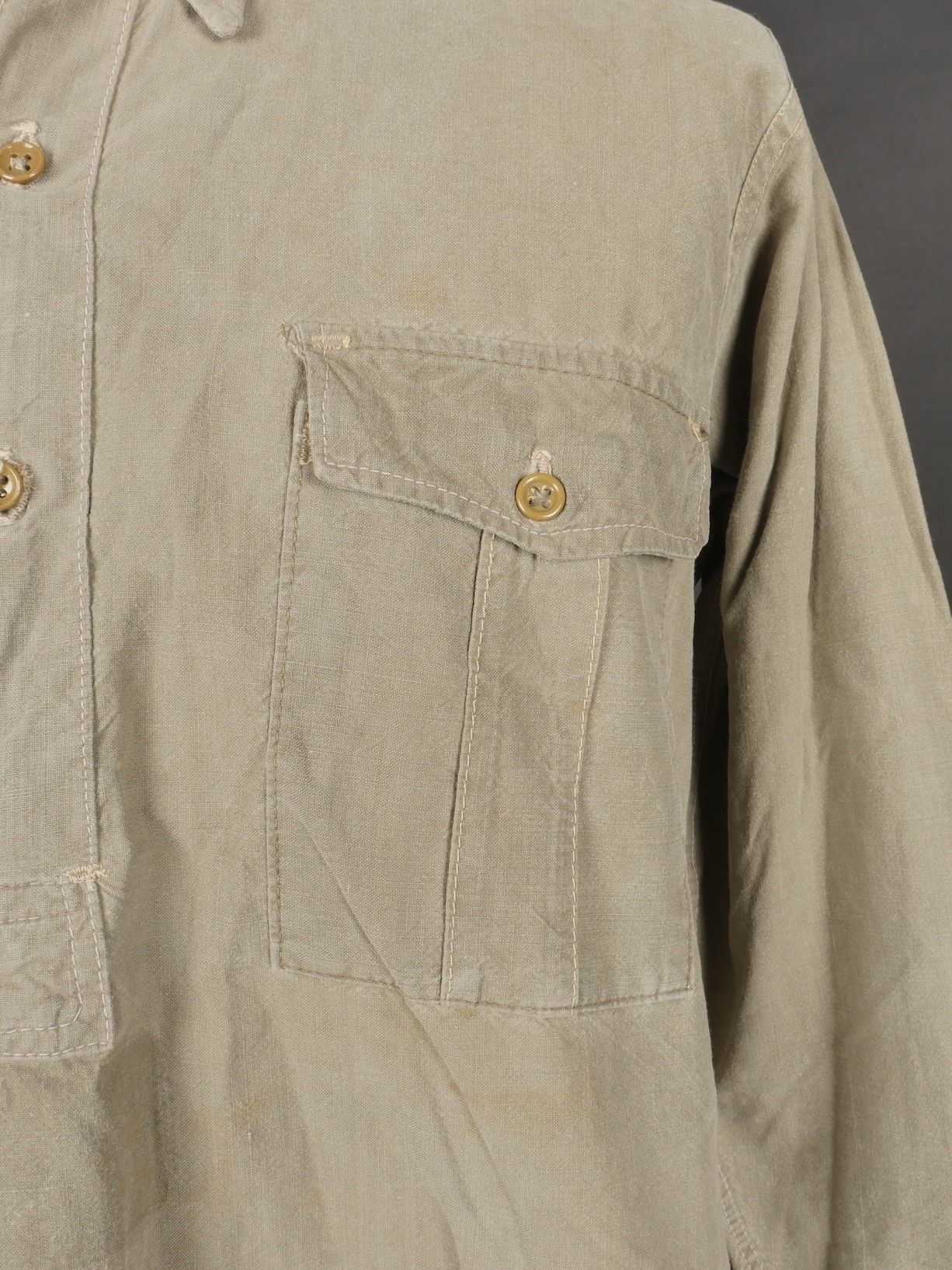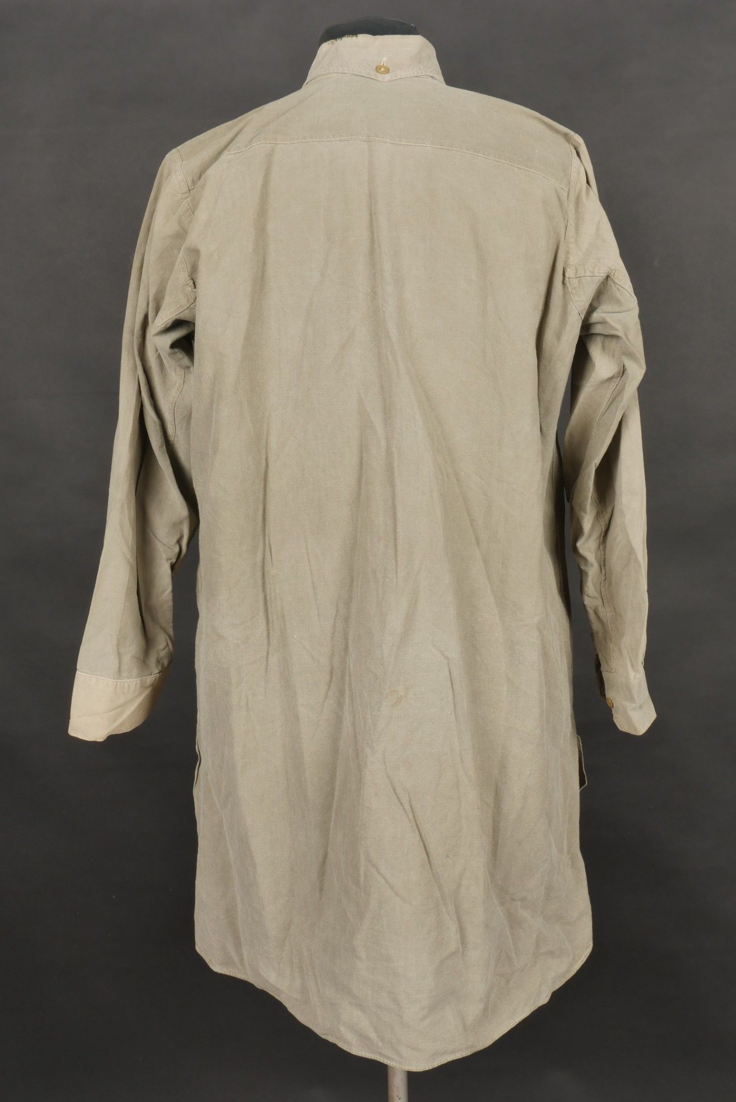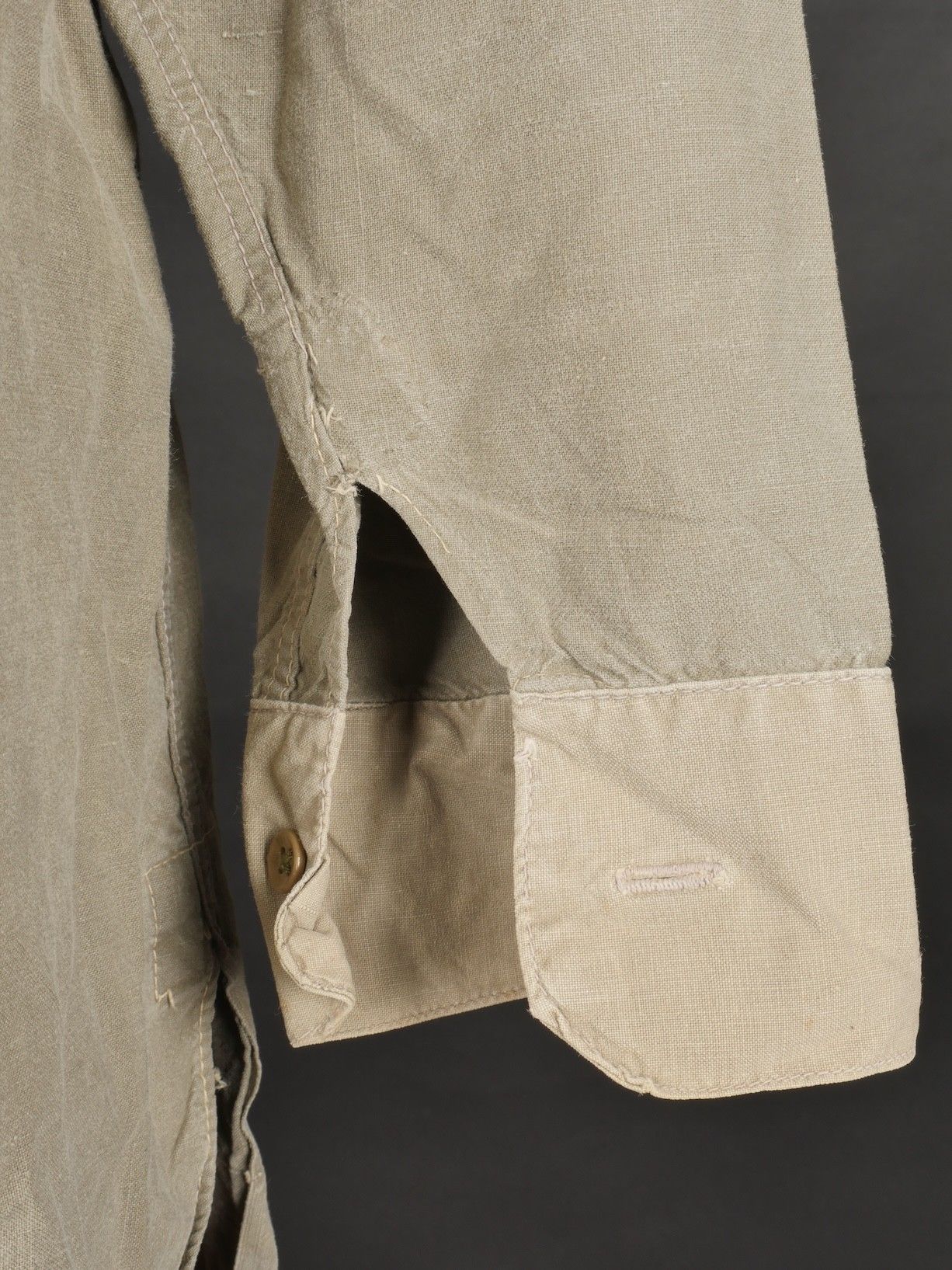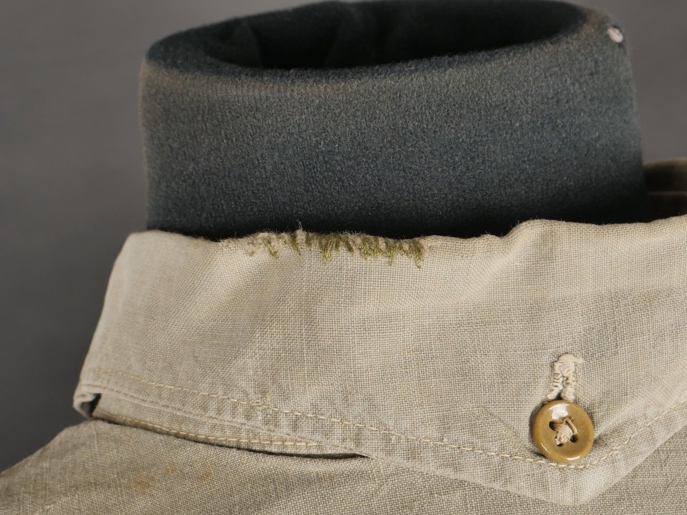 1935 shirt. Regulation model in khaki fabric fastened by three buttons, buttons on back of collar present. Square of cloth on the chest untucked, reception stamp illegible. Good mannequin size, small repair to back of collar. Shirt 1935 Regulation model in khaki fabric closing with three buttons rear collar buttons present chest cloth patch detached illegible reception stamp good mannequin size small repair at back of collar.