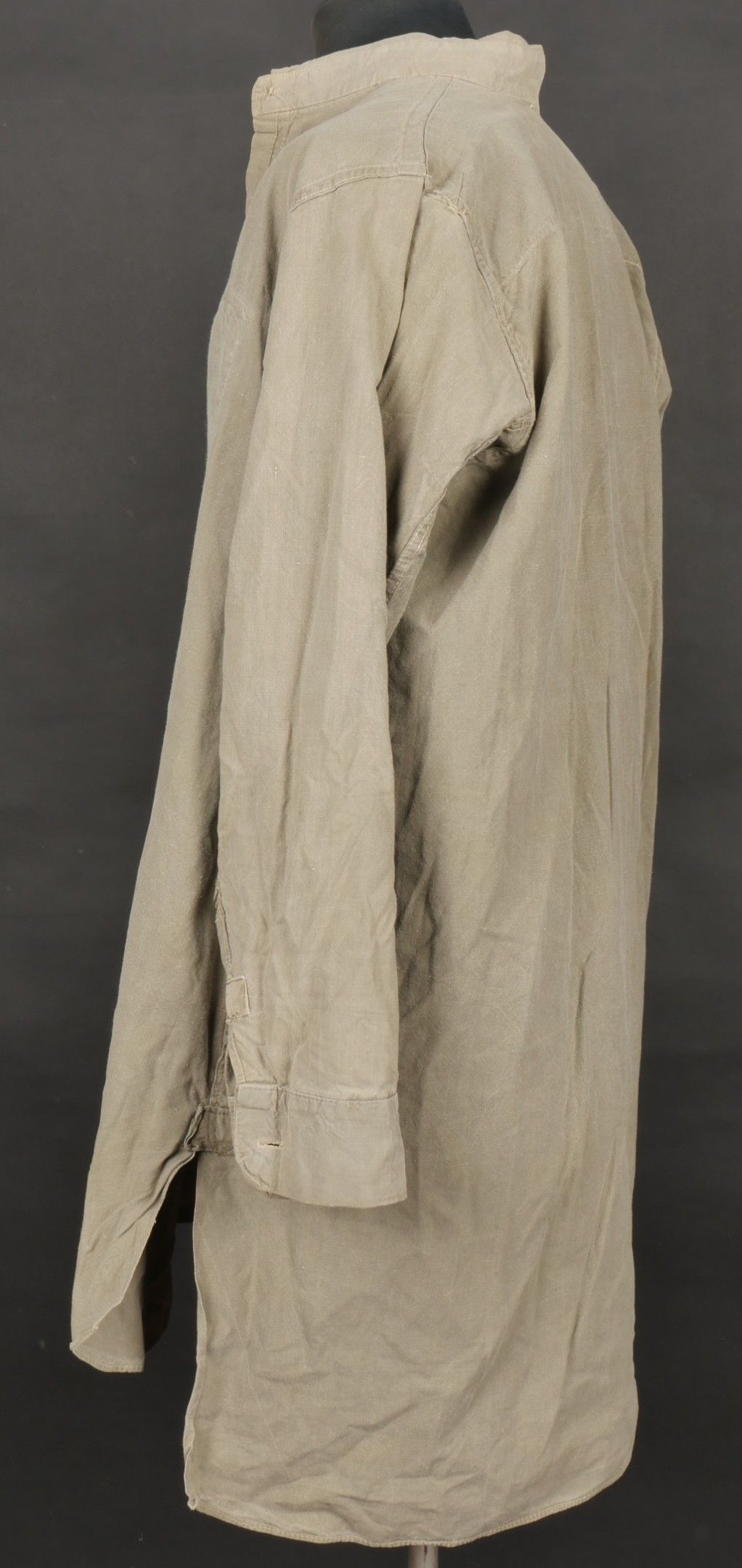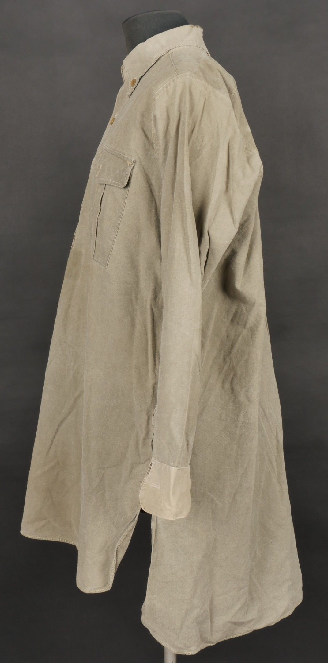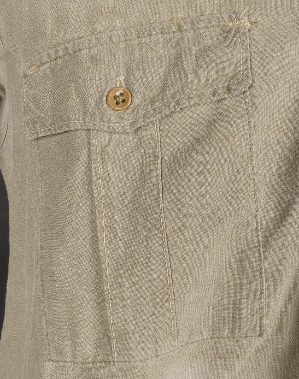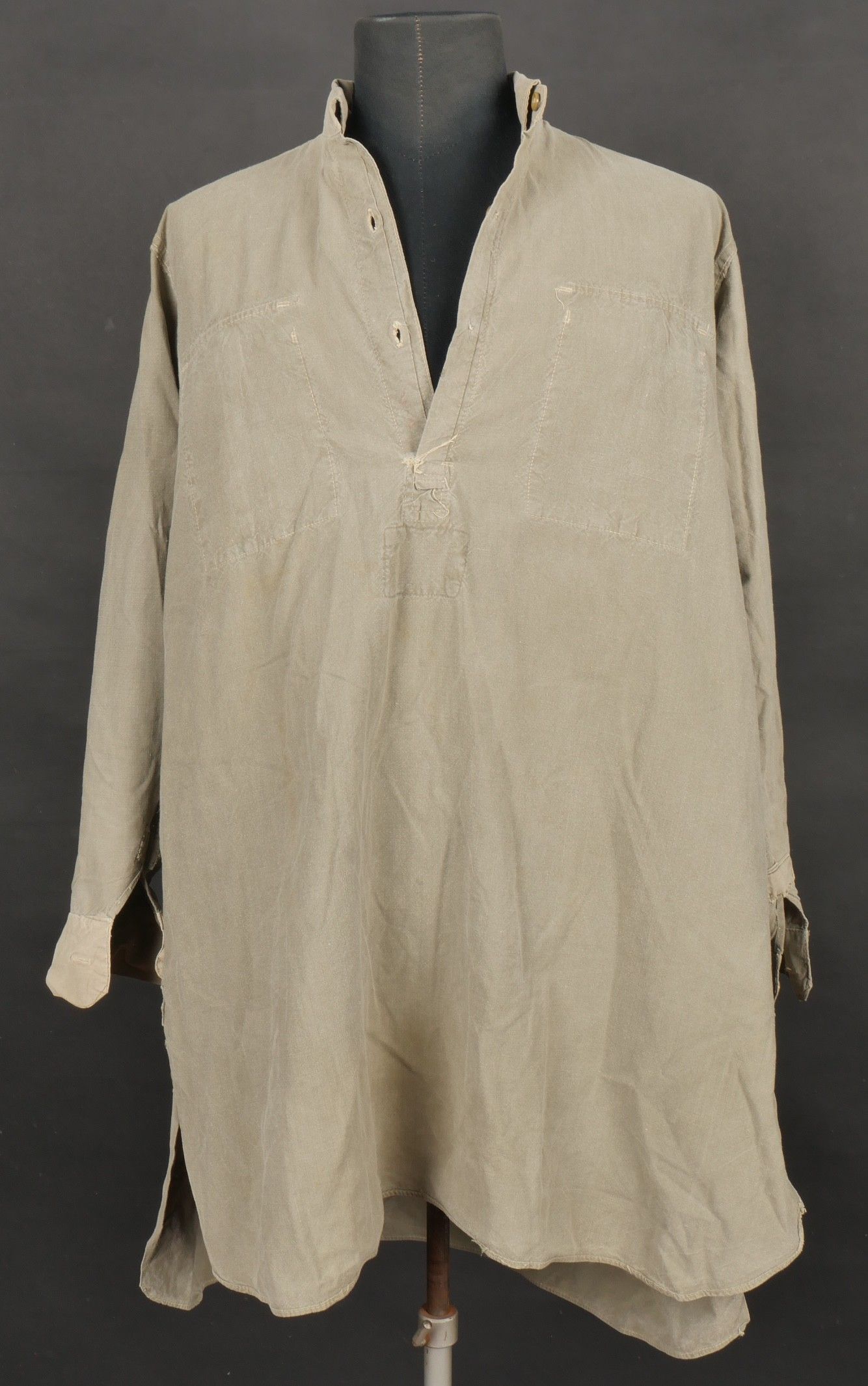 1935 shirt. Regulation model in khaki fabric fastened by three buttons, buttons on back of collar present. Square of cloth on the chest untucked, reception stamp illegible. Good mannequin size, small repair to back of collar. Shirt 1935 Regulation model in khaki fabric closing with three buttons rear collar buttons present chest cloth patch detached illegible reception stamp good mannequin size small repair at back of collar.