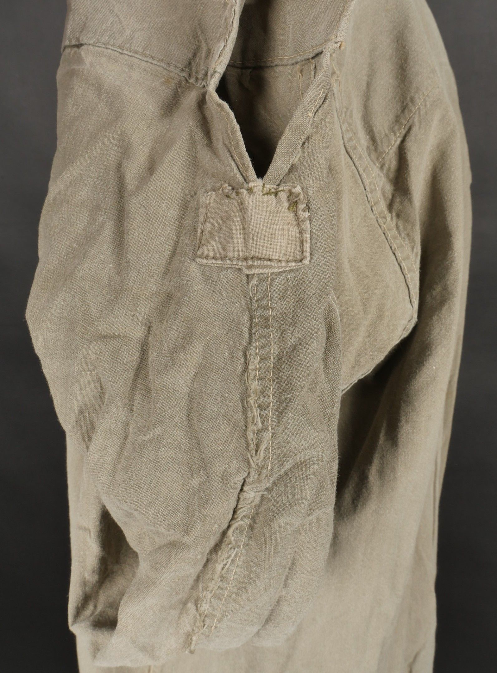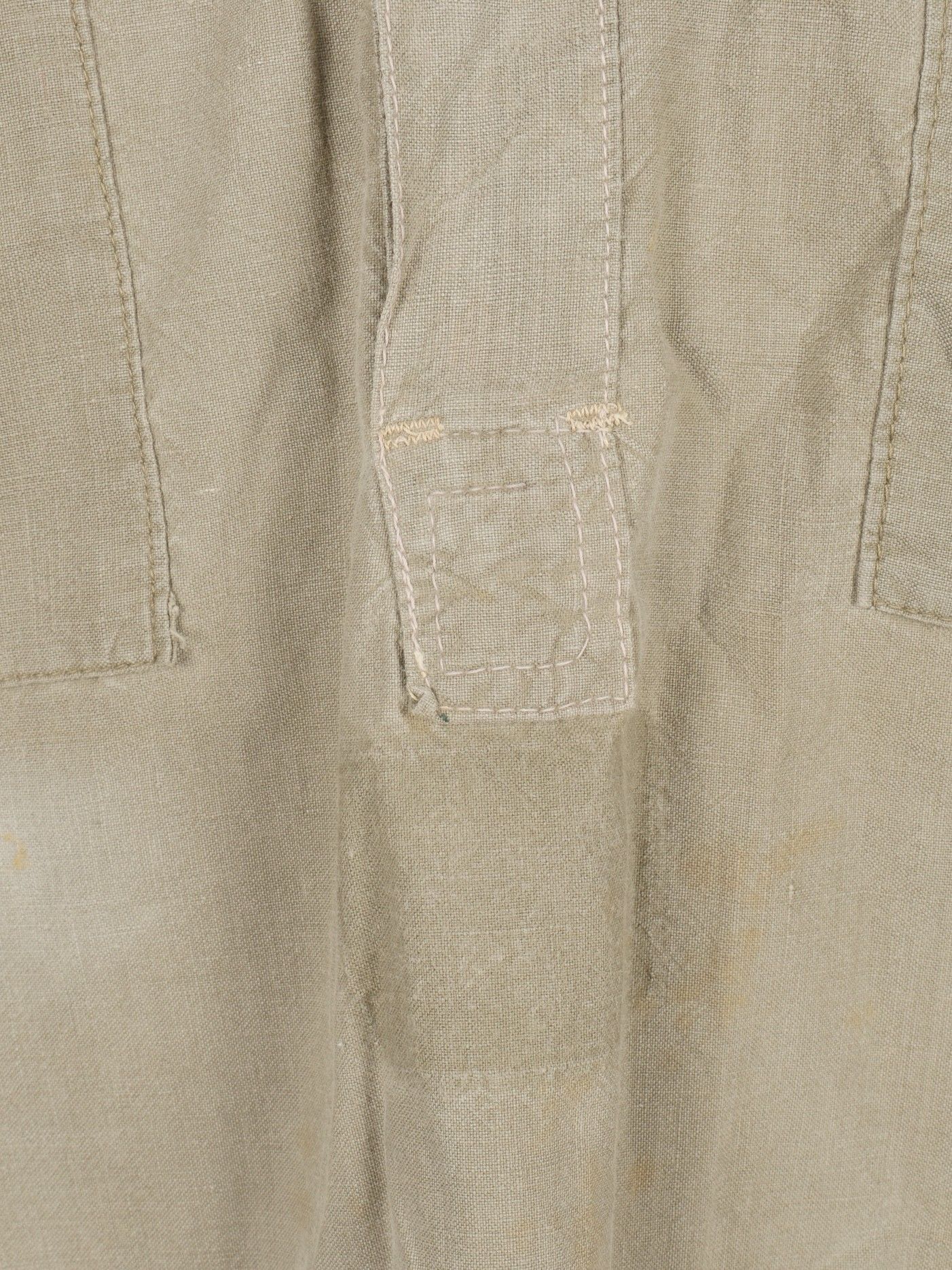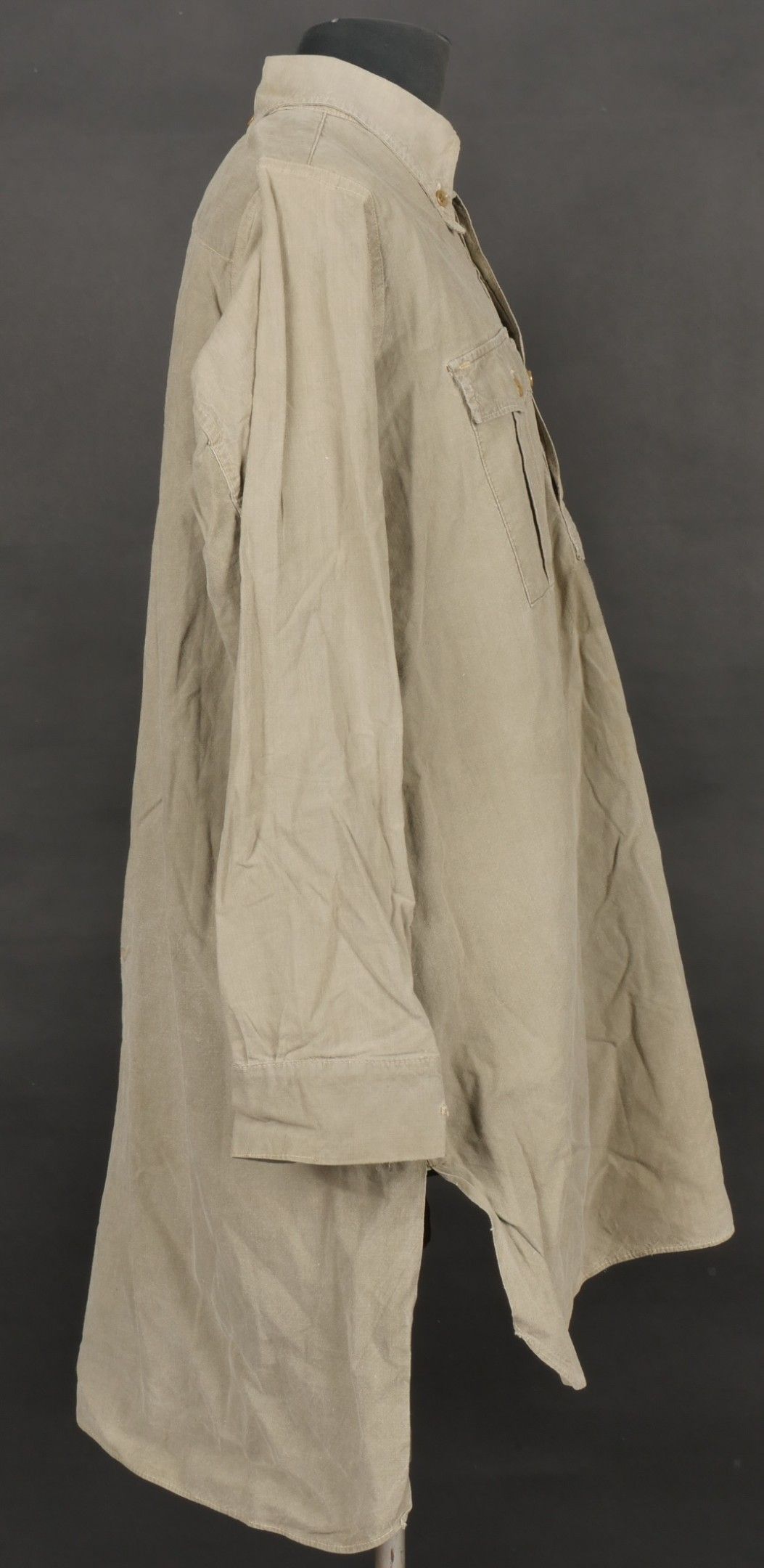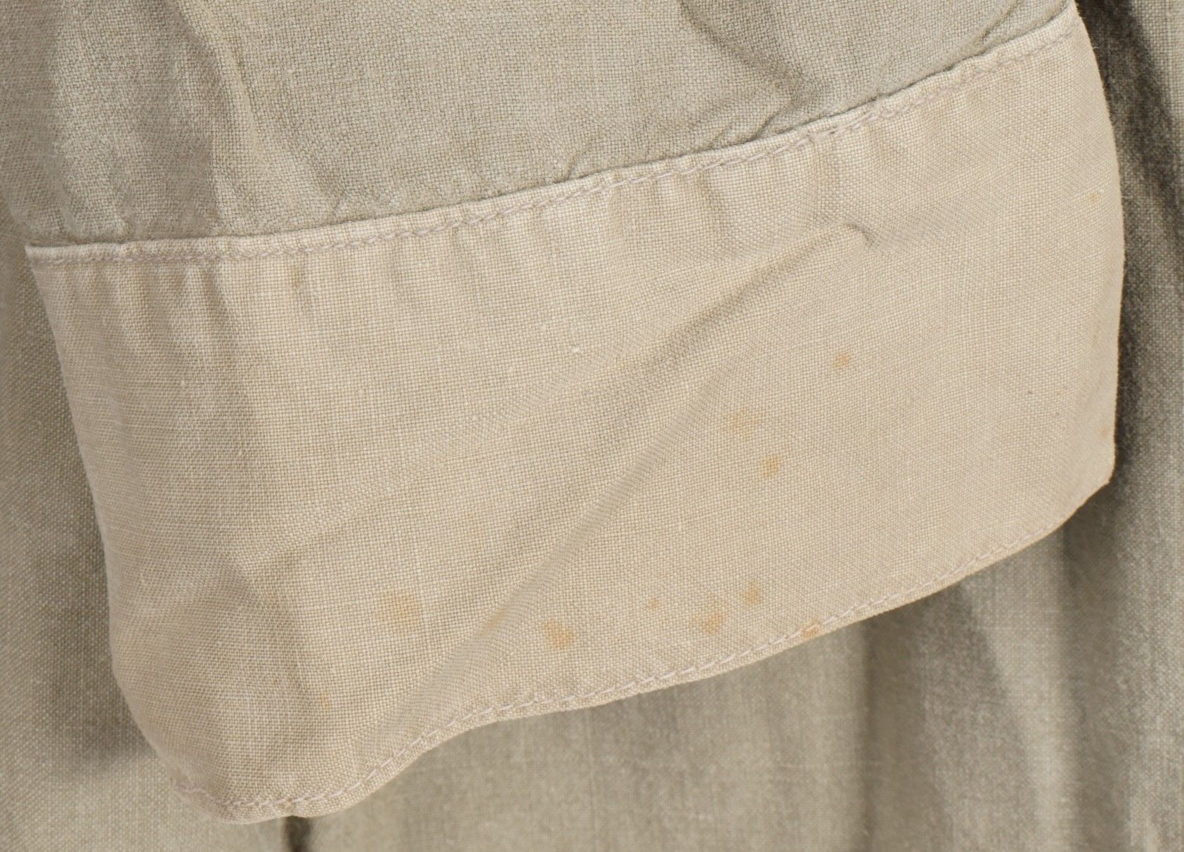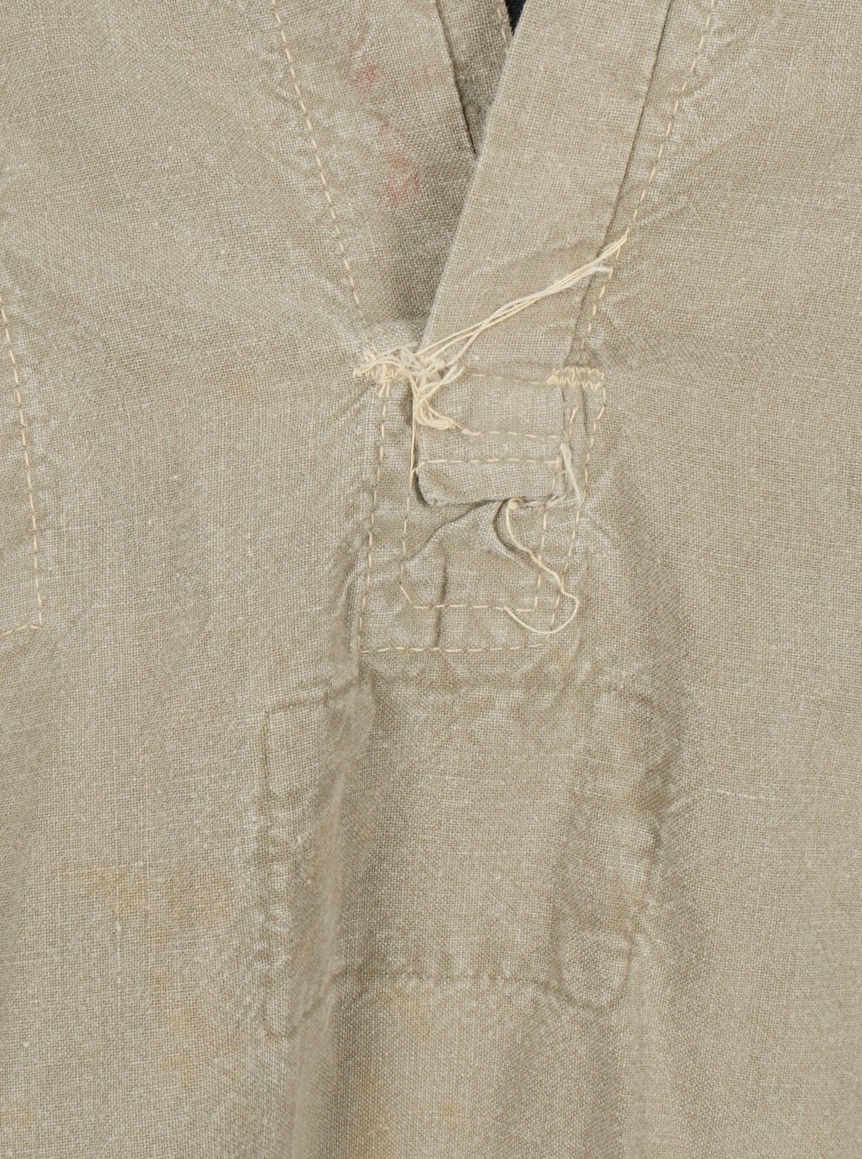 1935 shirt. Regulation model in khaki fabric fastened by three buttons, buttons on back of collar present. Square of cloth on the chest untucked, reception stamp illegible. Good mannequin size, small repair to back of collar. Shirt 1935 Regulation model in khaki fabric closing with three buttons rear collar buttons present chest cloth patch detached illegible reception stamp good mannequin size small repair at back of collar.