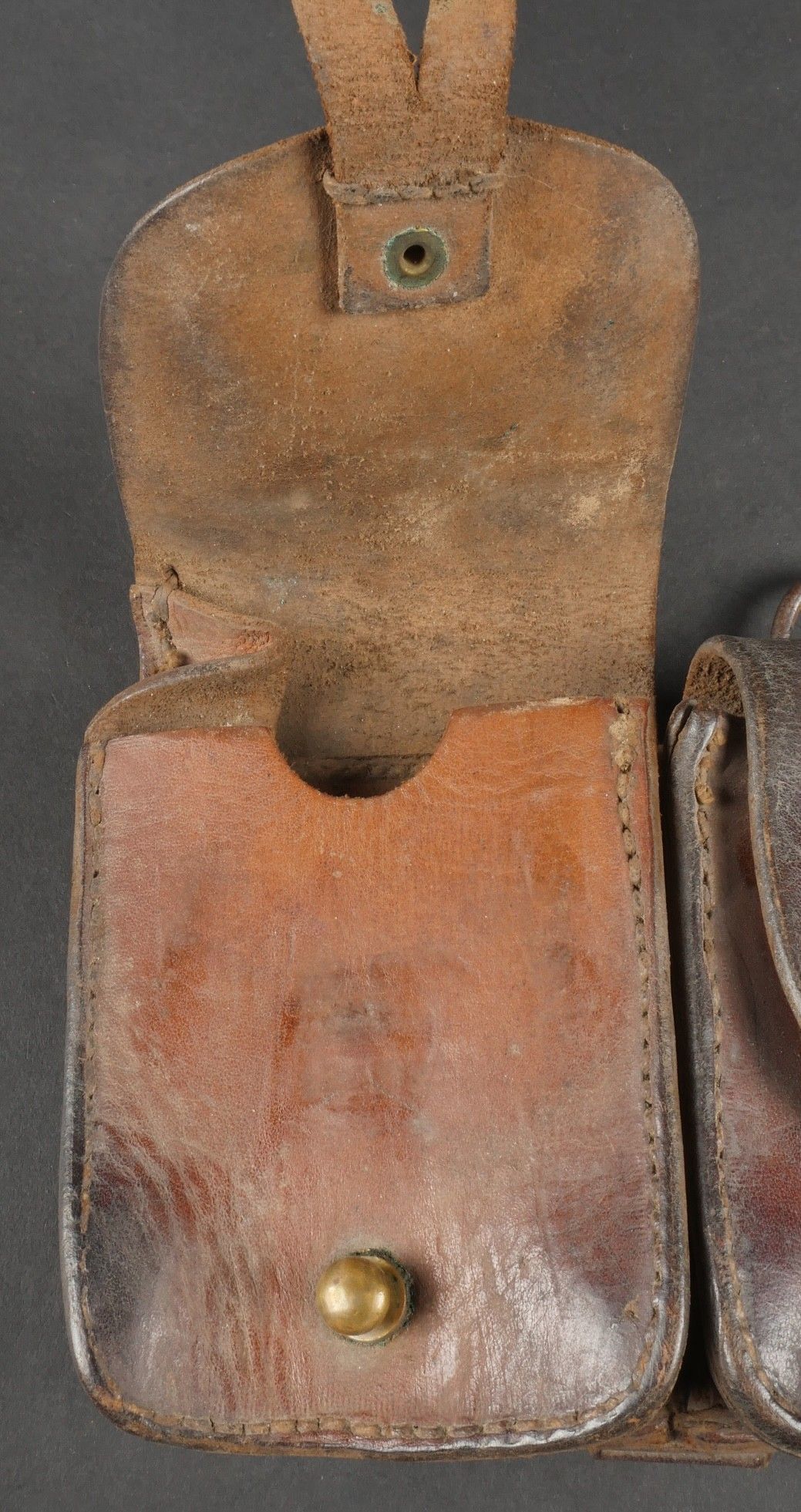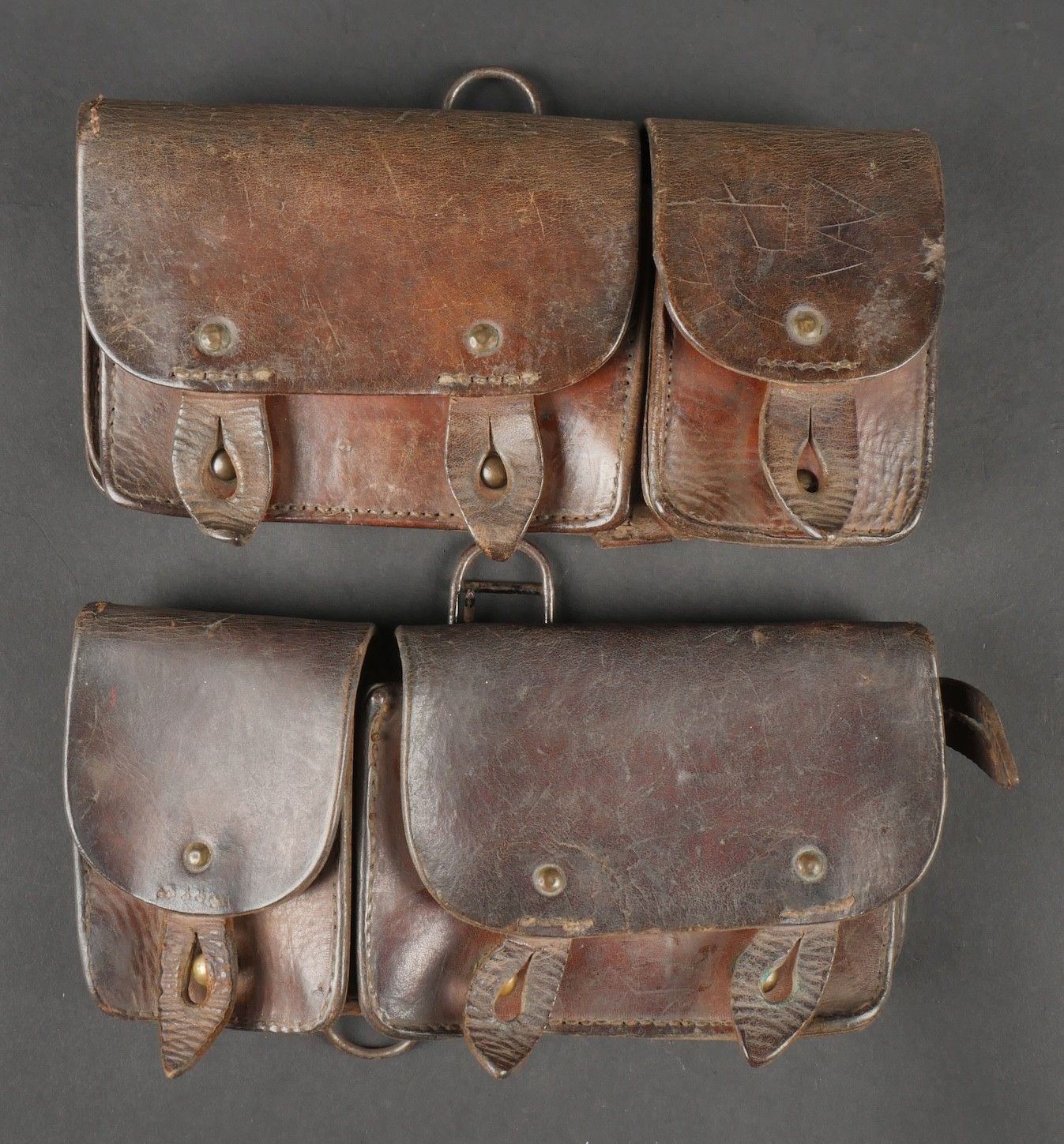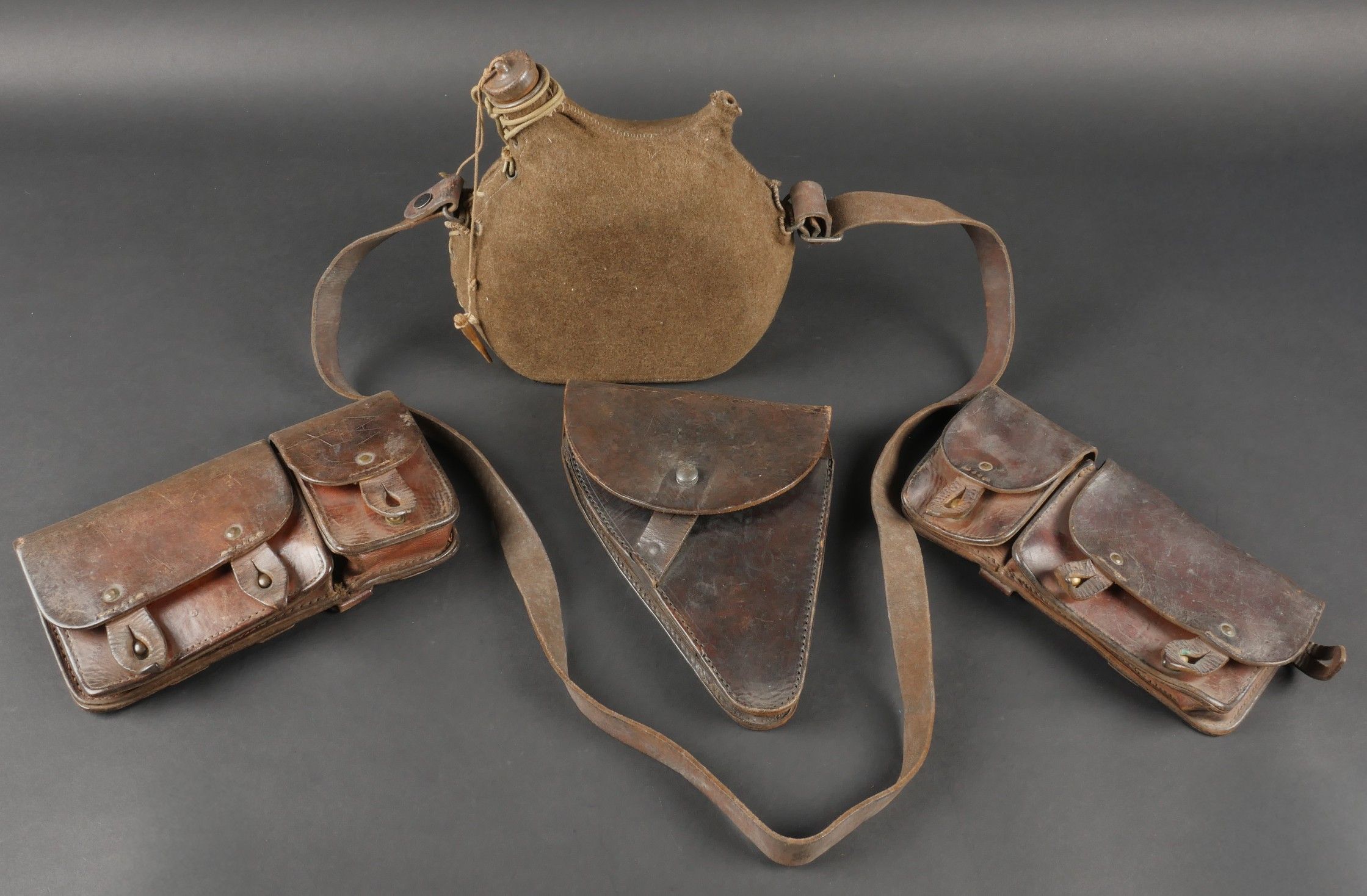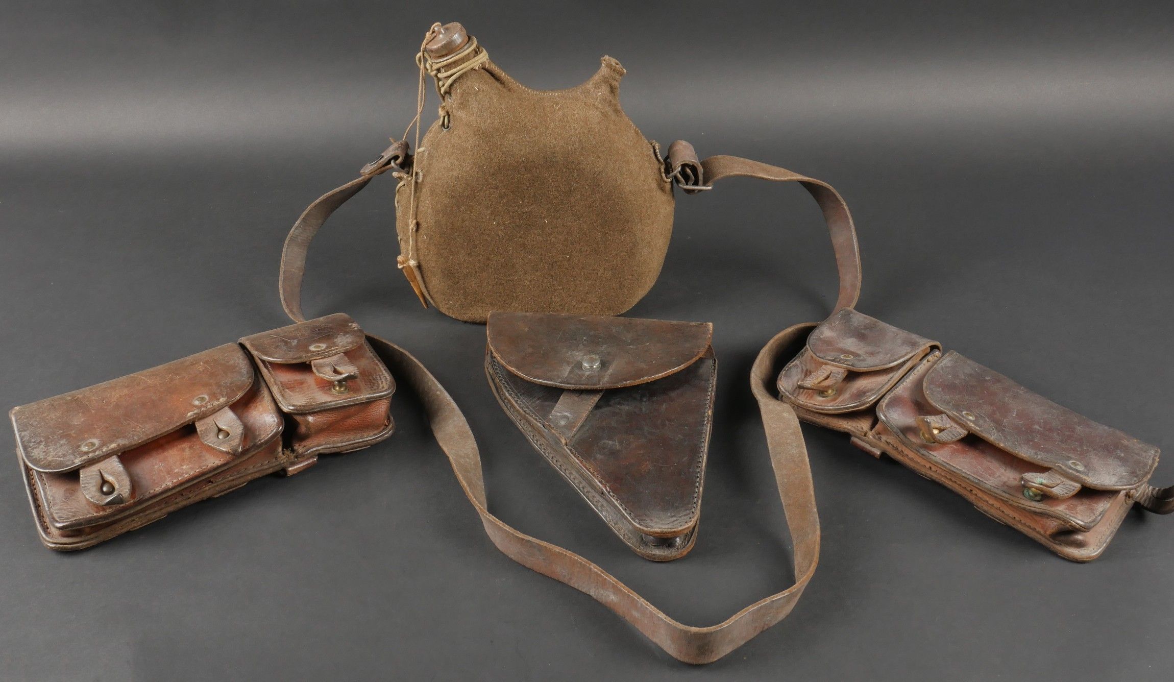 Lot of France 40's Equipment Comprising a pair of Model 193537 cartridge belts, right side dated 1939, small leather tab present, left side date illegible, ends stitched, nipple present. A Ruby model 1916 pistol holster, illegible stamp, 1930s manufacture. A Model 1877 flask with khaki cloth cover and leather strap. Lot of France 40 equipment Including a pair of cartridge pouches model 193537 right side dated 1939 small leather strap present left side date illegible ends restitched stud present a 1916 Ruby pistol holster illegible stamp manufactured in the 1930s a 1877 model canteen with khaki cloth cover and leather strap.