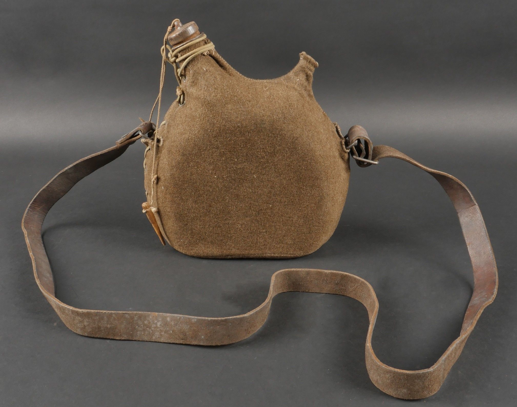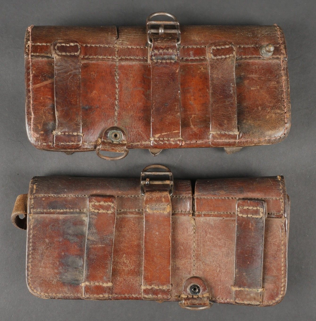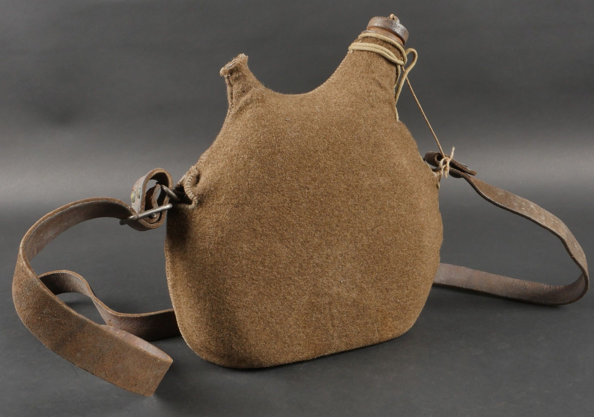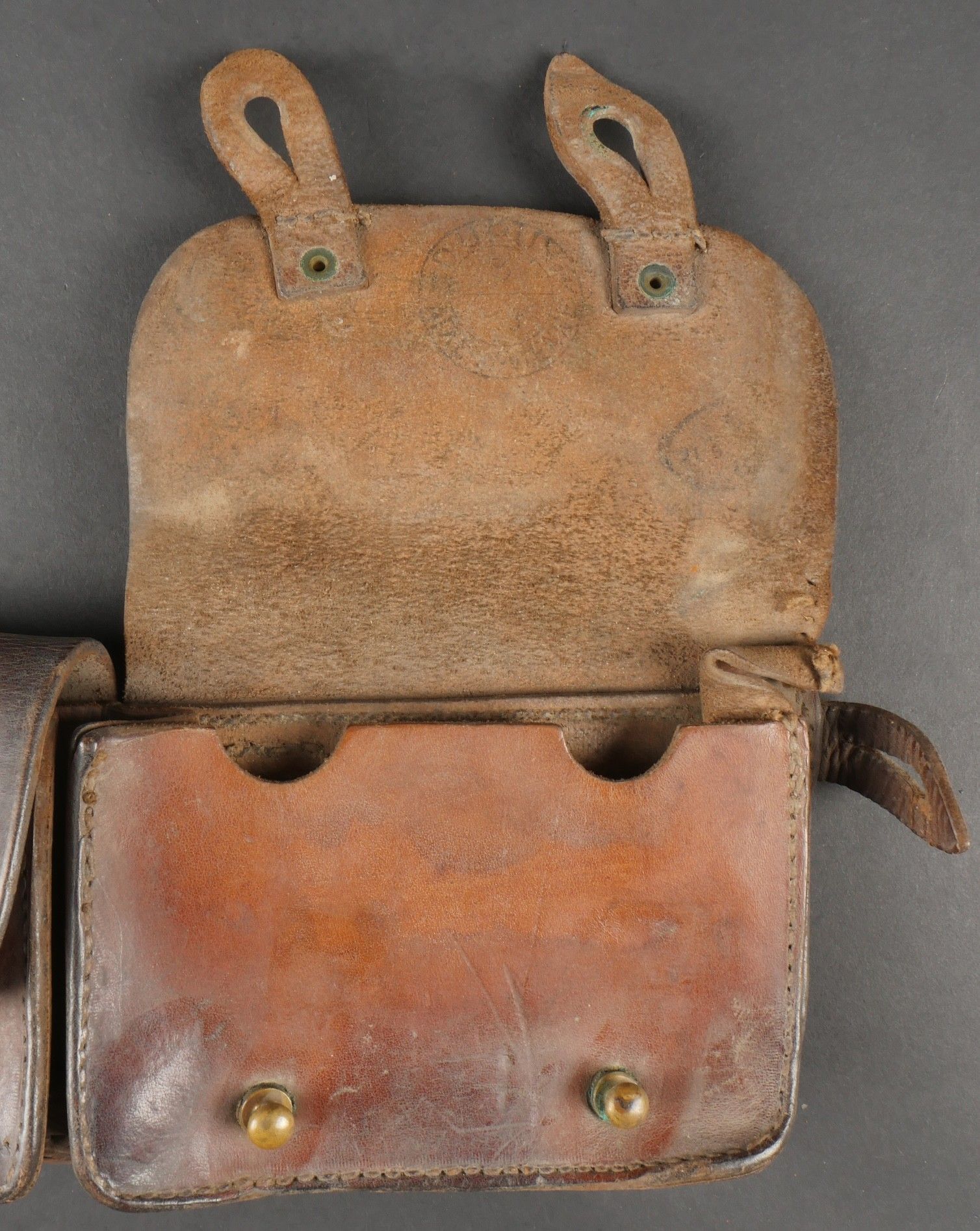 Lot of France 40's Equipment Comprising a pair of Model 193537 cartridge belts, right side dated 1939, small leather tab present, left side date illegible, ends stitched, nipple present. A Ruby model 1916 pistol holster, illegible stamp, 1930s manufacture. A Model 1877 flask with khaki cloth cover and leather strap. Lot of France 40 equipment Including a pair of cartridge pouches model 193537 right side dated 1939 small leather strap present left side date illegible ends restitched stud present a 1916 Ruby pistol holster illegible stamp manufactured in the 1930s a 1877 model canteen with khaki cloth cover and leather strap.
