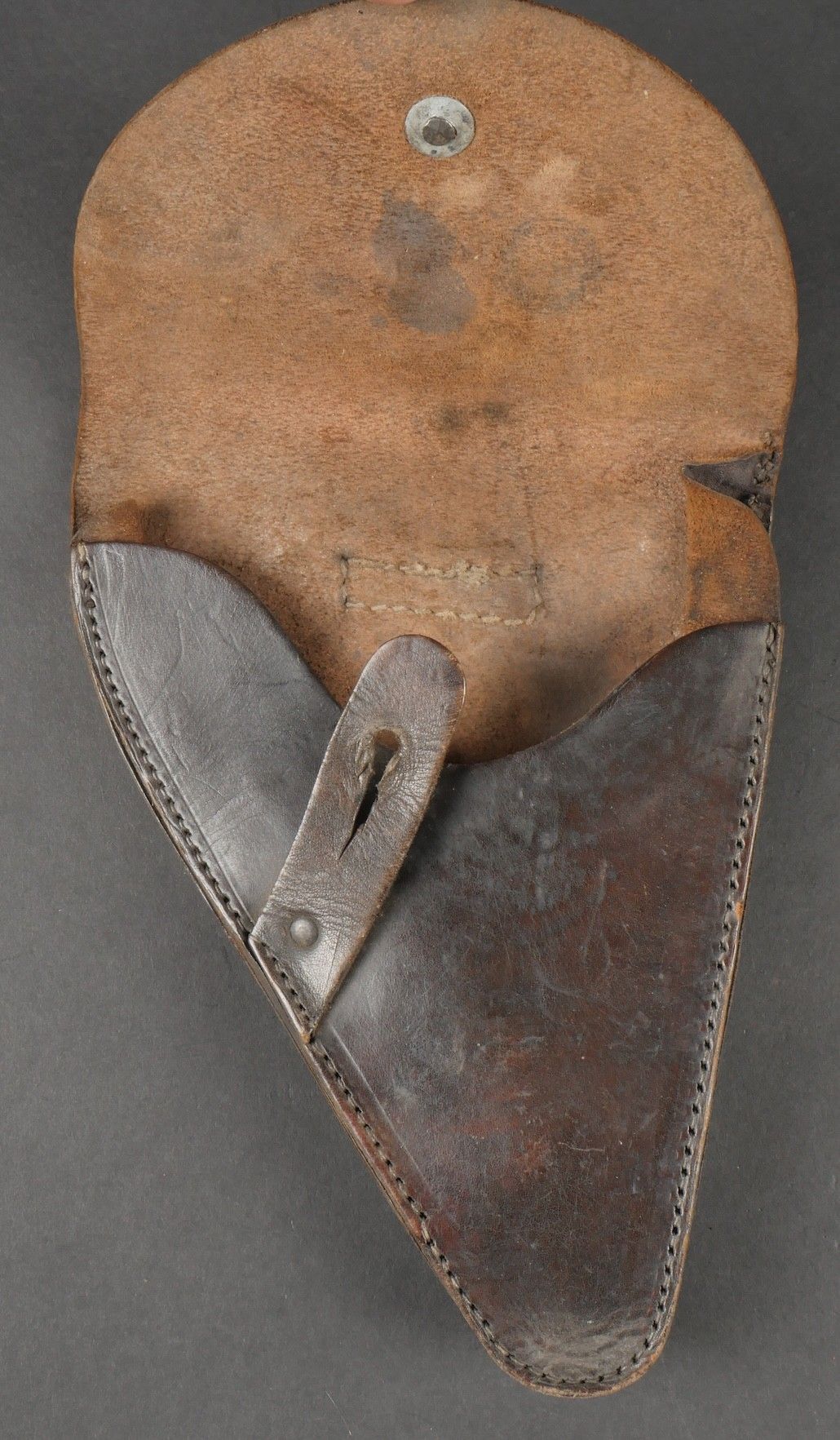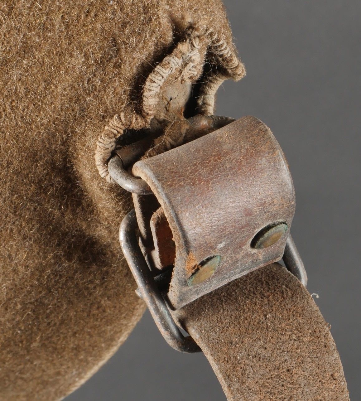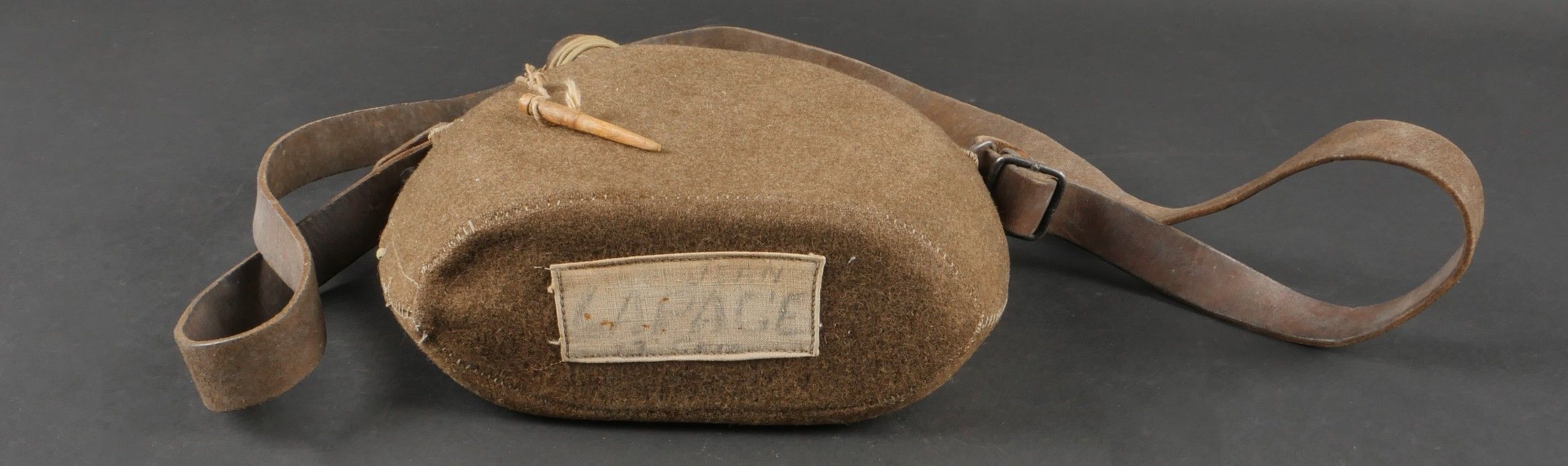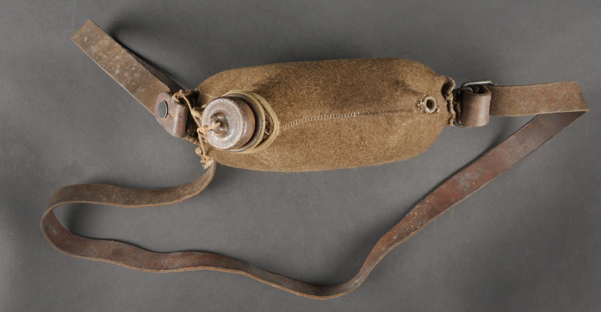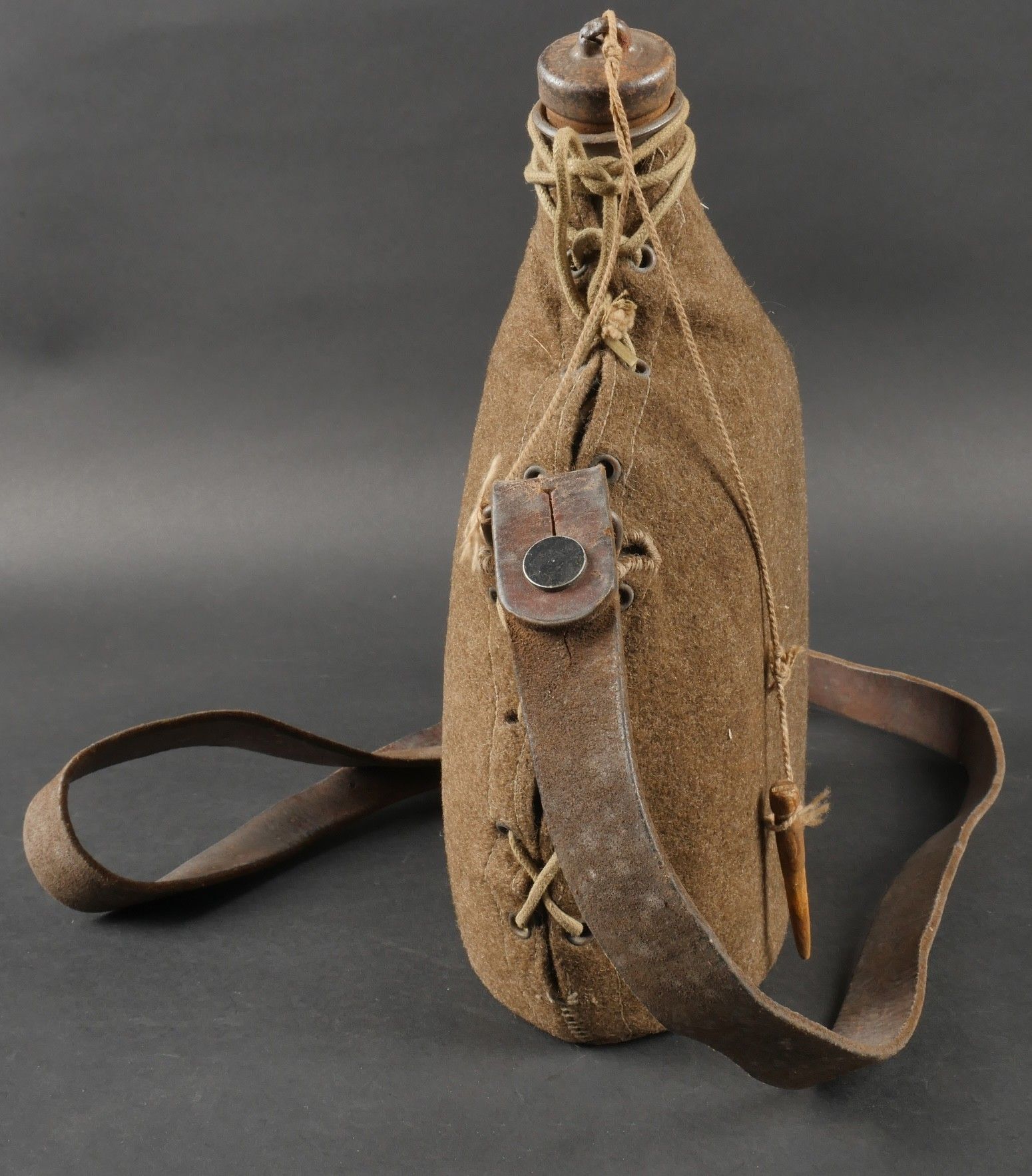 Lot of France 40's Equipment Comprising a pair of Model 193537 cartridge belts, right side dated 1939, small leather tab present, left side date illegible, ends stitched, nipple present. A Ruby model 1916 pistol holster, illegible stamp, 1930s manufacture. A Model 1877 flask with khaki cloth cover and leather strap. Lot of France 40 equipment Including a pair of cartridge pouches model 193537 right side dated 1939 small leather strap present left side date illegible ends restitched stud present a 1916 Ruby pistol holster illegible stamp manufactured in the 1930s a 1877 model canteen with khaki cloth cover and leather strap.