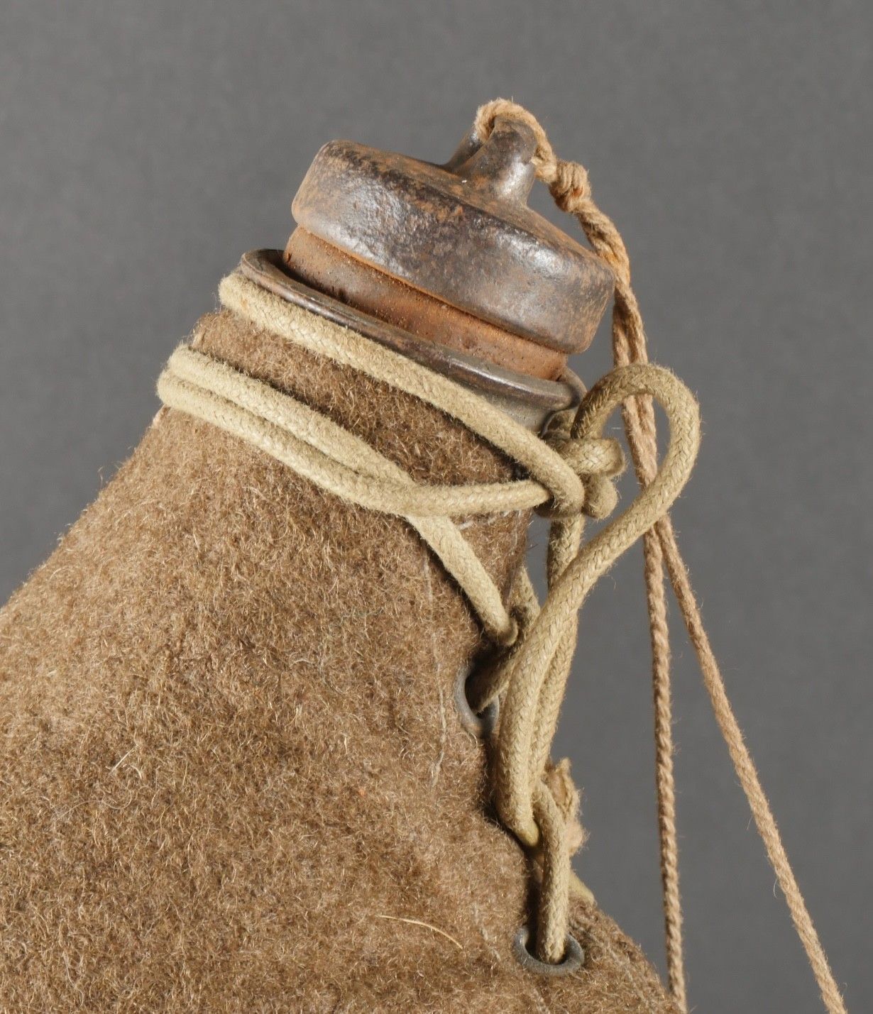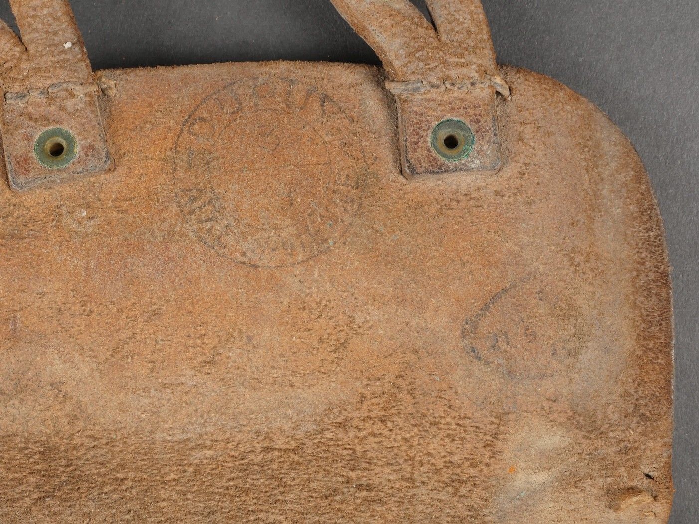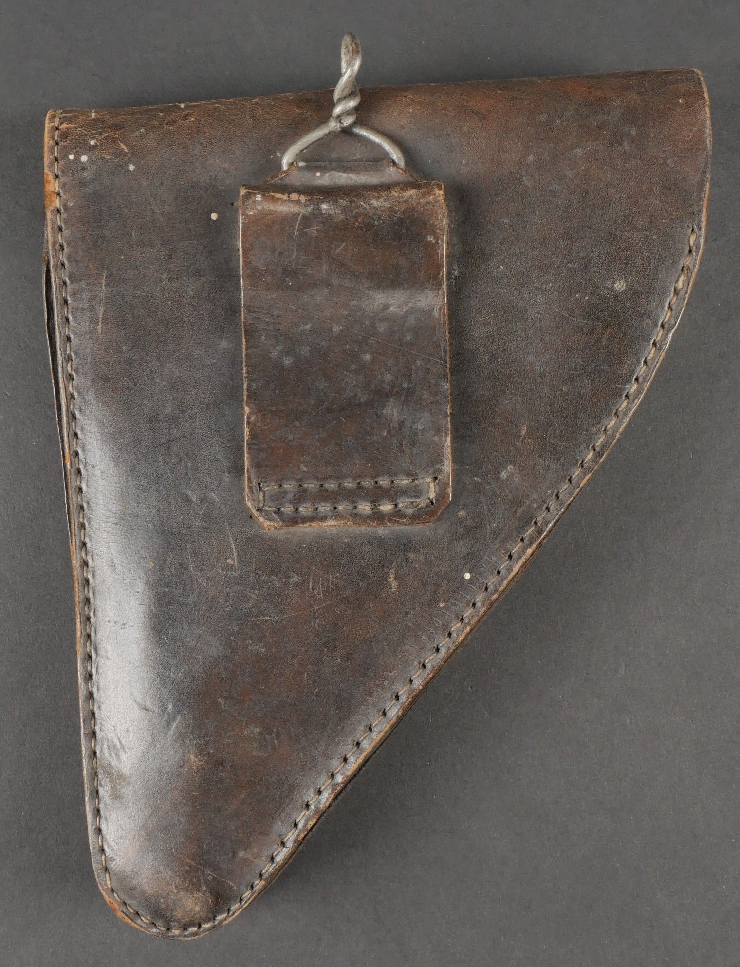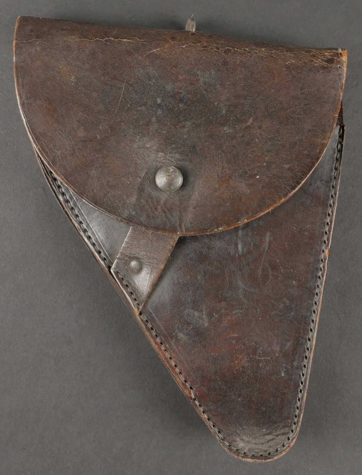 Lot of France 40's Equipment Comprising a pair of Model 193537 cartridge belts, right side dated 1939, small leather tab present, left side date illegible, ends stitched, nipple present. A Ruby model 1916 pistol holster, illegible stamp, 1930s manufacture. A Model 1877 flask with khaki cloth cover and leather strap. Lot of France 40 equipment Including a pair of cartridge pouches model 193537 right side dated 1939 small leather strap present left side date illegible ends restitched stud present a 1916 Ruby pistol holster illegible stamp manufactured in the 1930s a 1877 model canteen with khaki cloth cover and leather strap.
