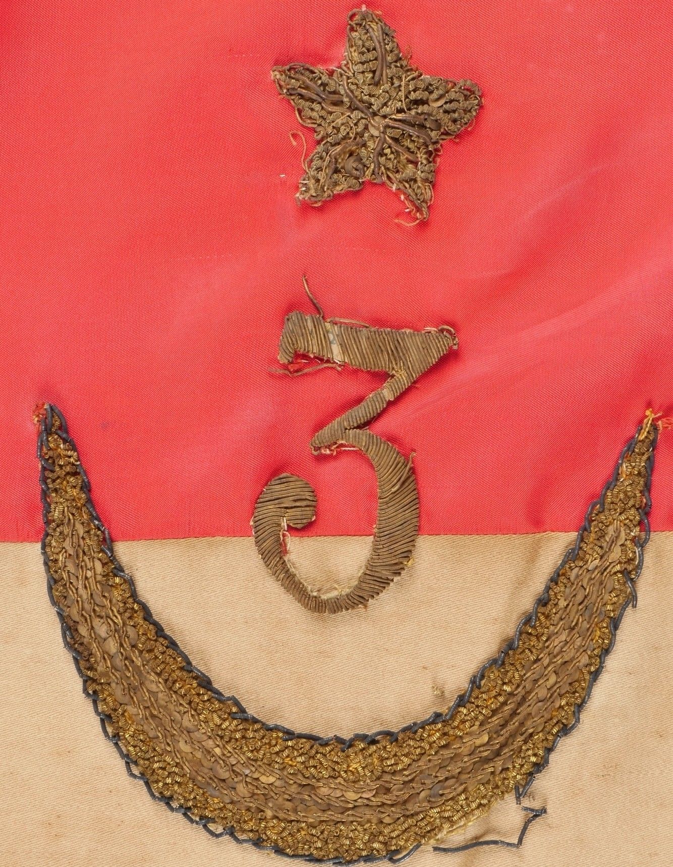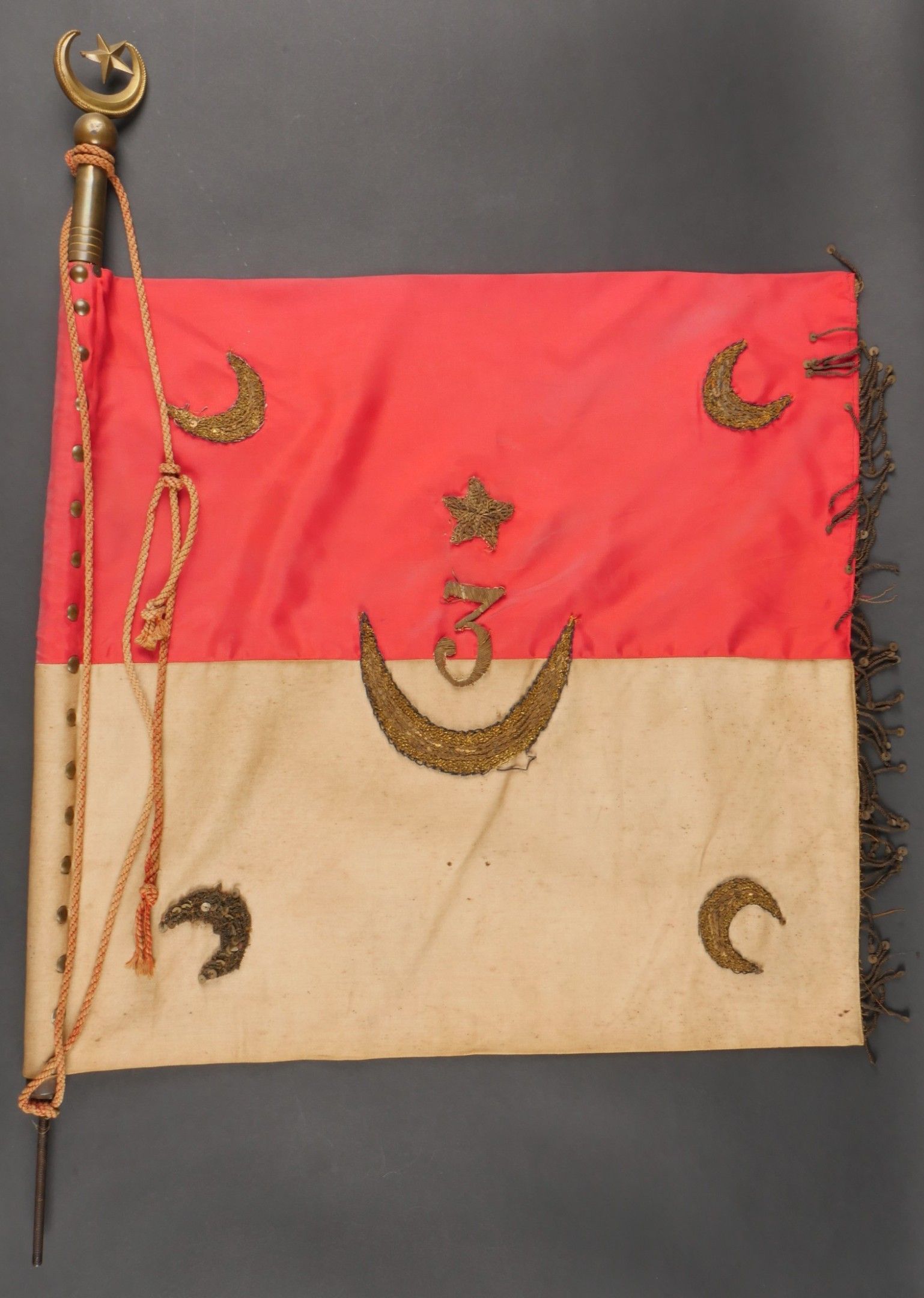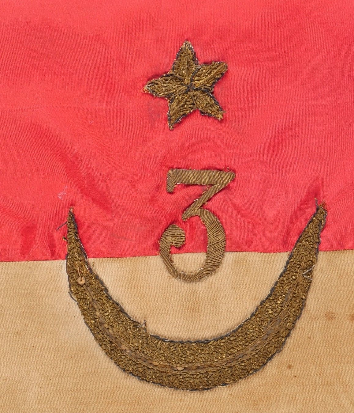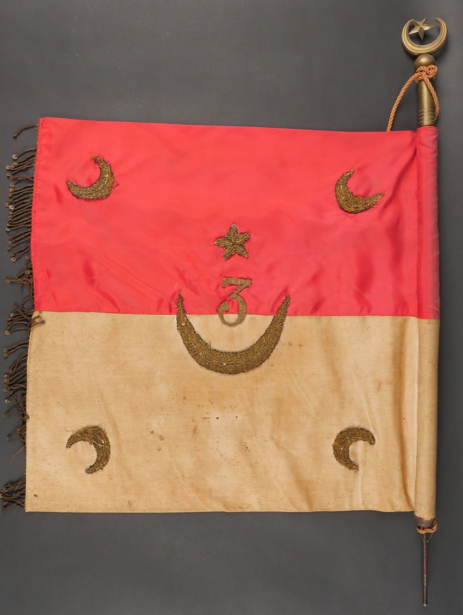 Pennant of the 3rd Regiment of Algerian Spahis. Two-sided pennant in red satinette and white cotton, bearing on each side a crescent moon embroidered in gold canetille in each corner and in the centre the number 3 surmounting a crescent moon, also embroidered in gold canetille. Fringed on one side in gold fluting. Pole can be unscrewed, with its end representing a 5-pointed star surrounded by a crescent moon. Small accident at one of the welding points. Dimensions 53cm X 50 cm. Pennant of the 3rd Algerian Spahi Regiment Doublesided pennant of red satinette and white cotton each side bearing a goldembroidered crescent in each corner and in the centre the number 3 surmounting a crescent both embroidered in gold wire fringe on one side only detachable pole tip shaped as a fivepointed star surrounded by a crescent with a minor solder repair pennant dimensions 53x50 cm.