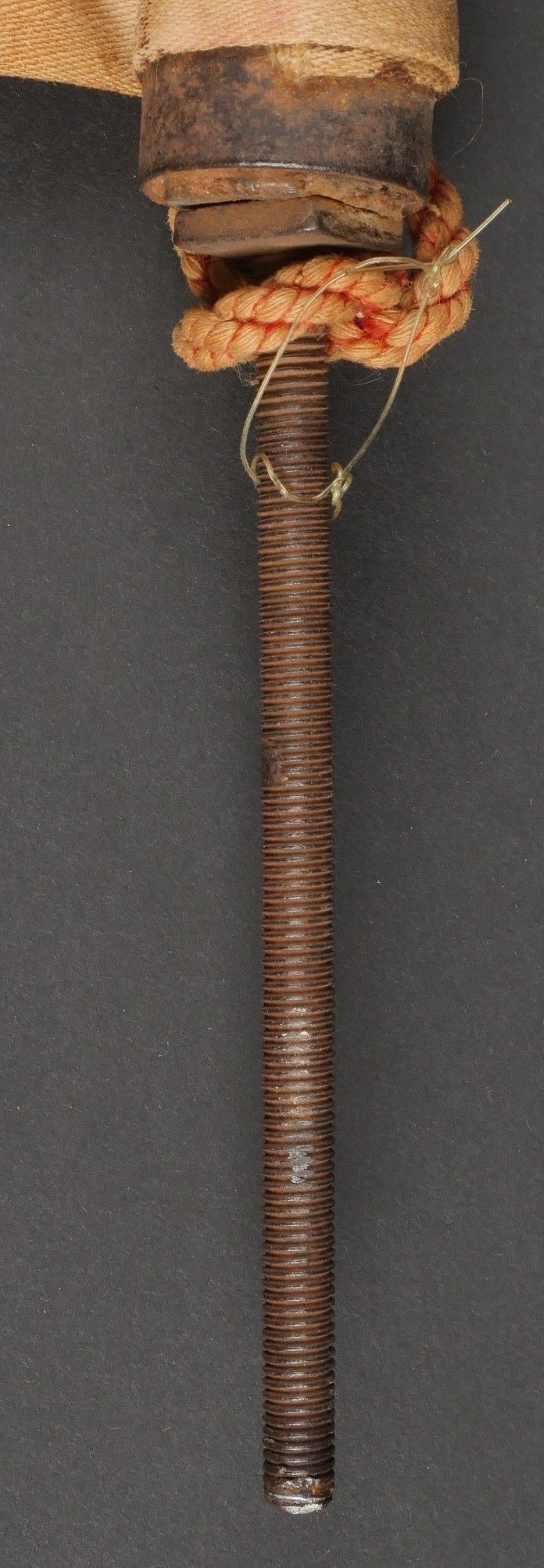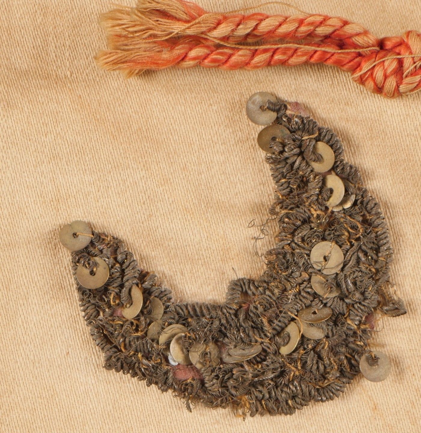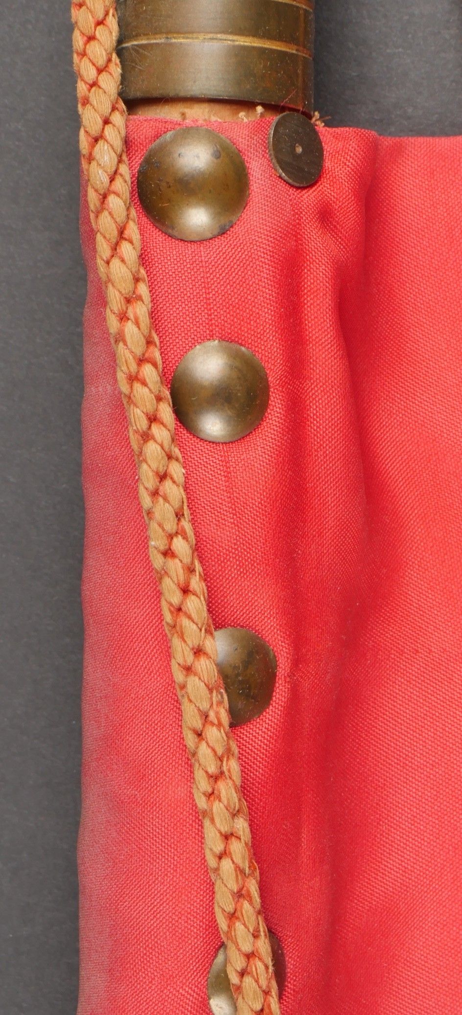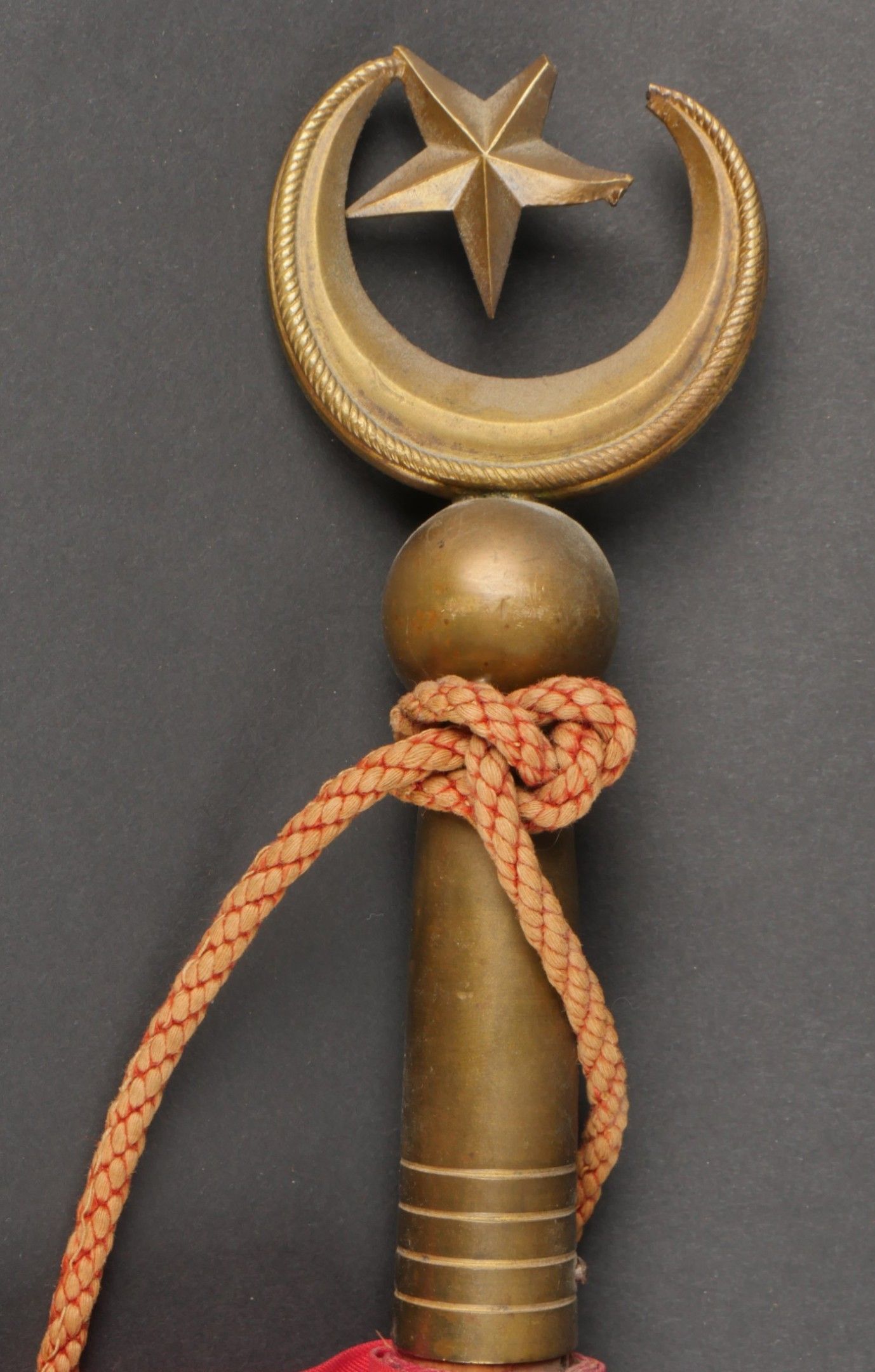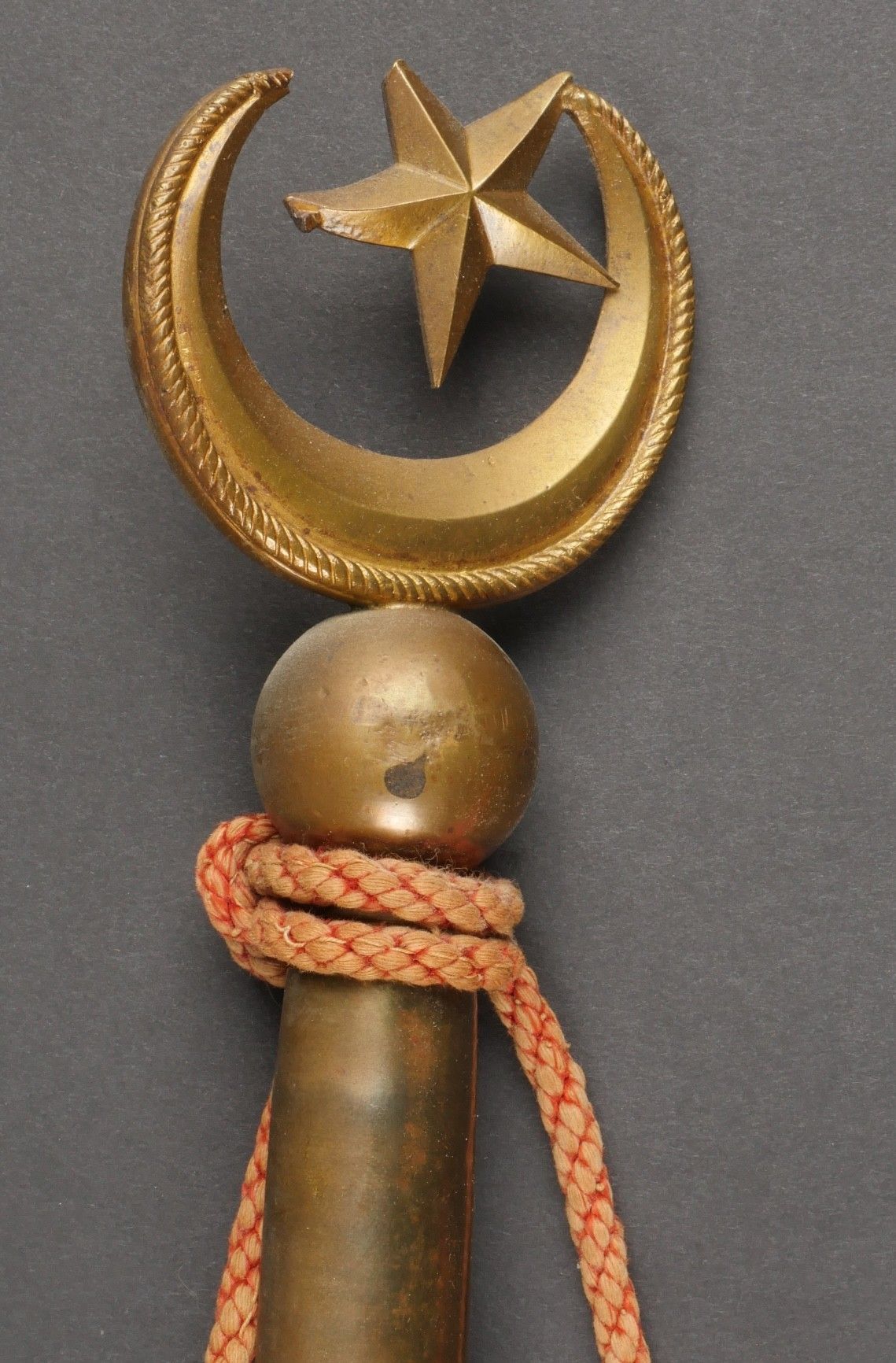 Pennant of the 3rd Regiment of Algerian Spahis. Two-sided pennant in red satinette and white cotton, bearing on each side a crescent moon embroidered in gold canetille in each corner and in the centre the number 3 surmounting a crescent moon, also embroidered in gold canetille. Fringed on one side in gold fluting. Pole can be unscrewed, with its end representing a 5-pointed star surrounded by a crescent moon. Small accident at one of the welding points. Dimensions 53cm X 50 cm. Pennant of the 3rd Algerian Spahi Regiment Doublesided pennant of red satinette and white cotton each side bearing a goldembroidered crescent in each corner and in the centre the number 3 surmounting a crescent both embroidered in gold wire fringe on one side only detachable pole tip shaped as a fivepointed star surrounded by a crescent with a minor solder repair pennant dimensions 53x50 cm.