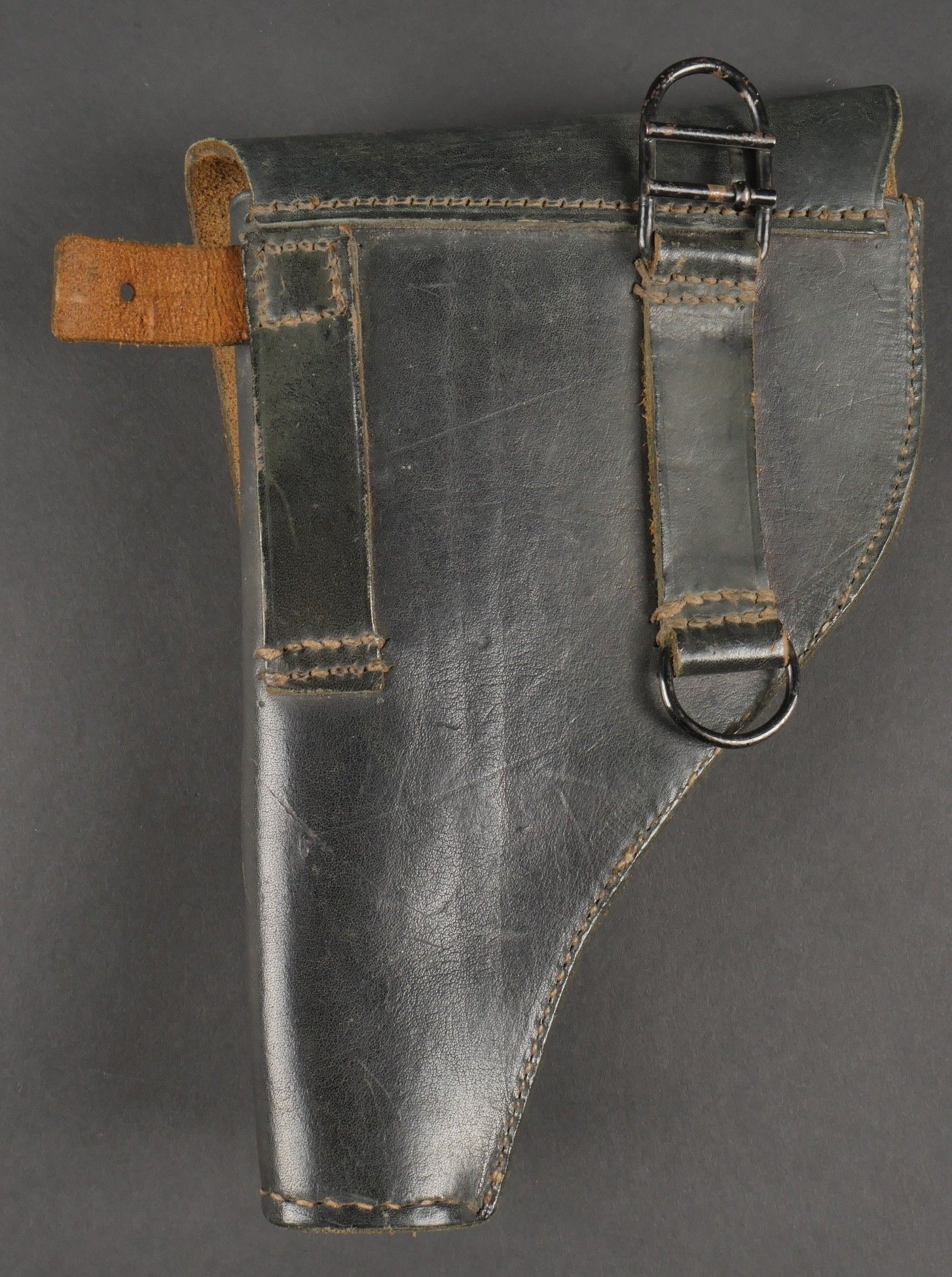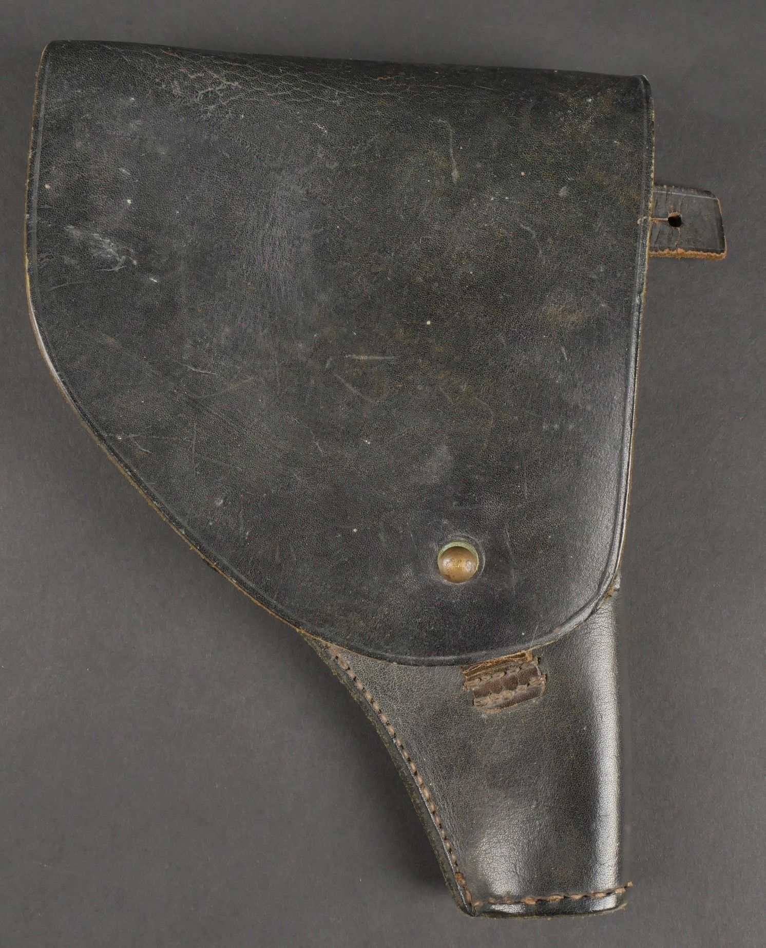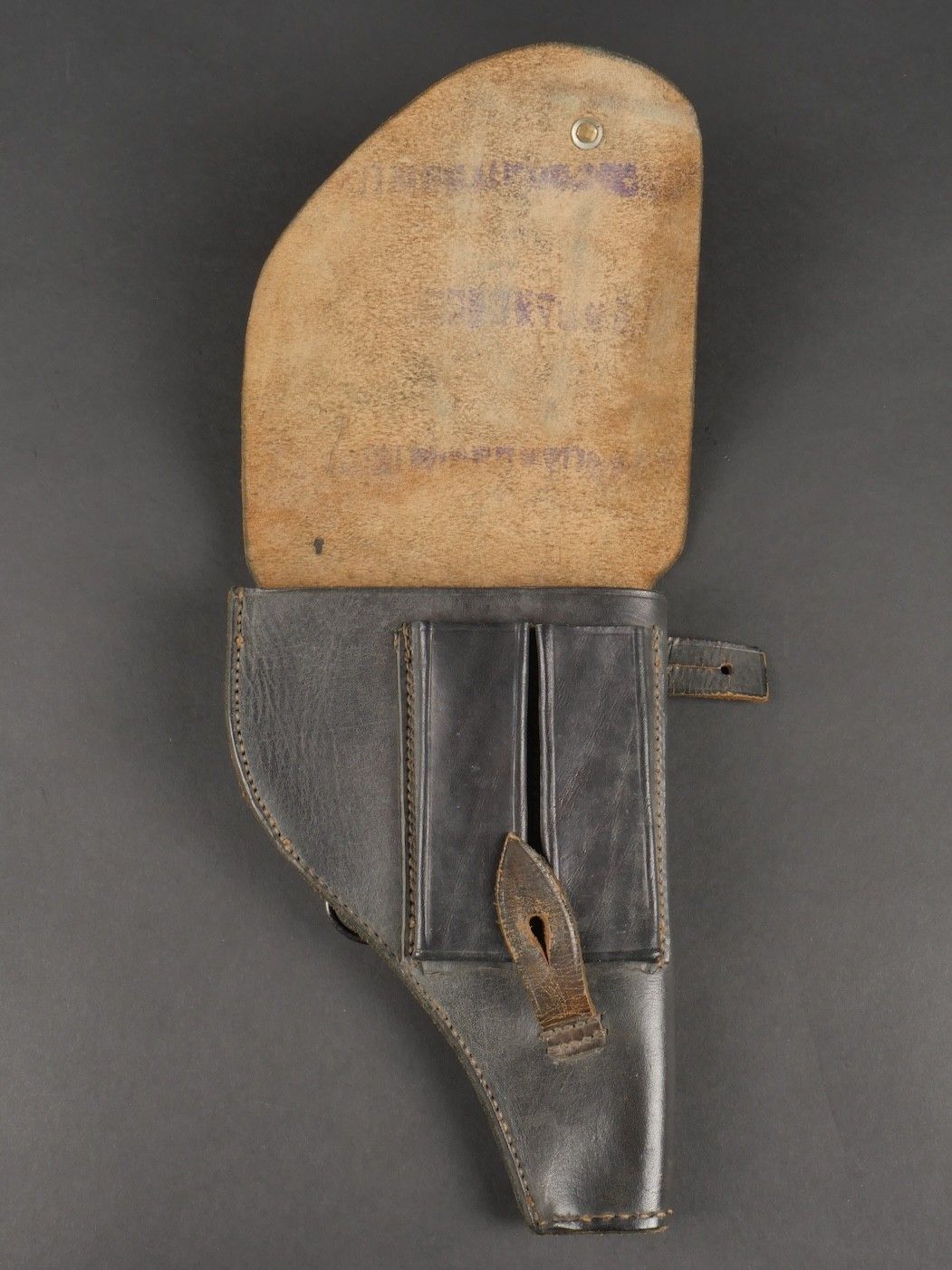 Nice case for a French PA 35 made in blackened leather, intended for Air Force units or the Gendarmerie. Under the flap are several commissariat stamps in ink. Model without internal strap, 2 compartments for magazines. Original sewn back loops. Small leather tab still present. Leather in good condition and supple. Fine PA 35 French holster Made of blackened leather intended for Air Force or Gendarmerie units under the flap are several inkstamped ordnance marks model without internal strap two compartments for magazines rear loops stitched in place small leather tab intact supple leather in good condition.