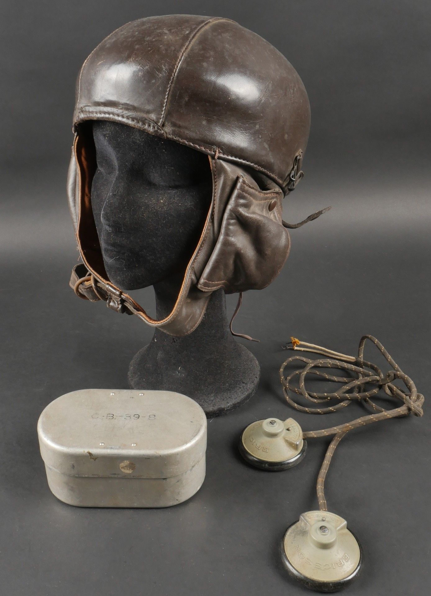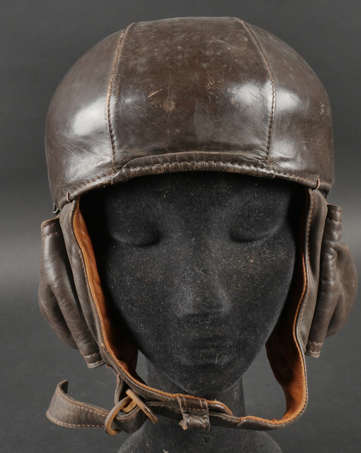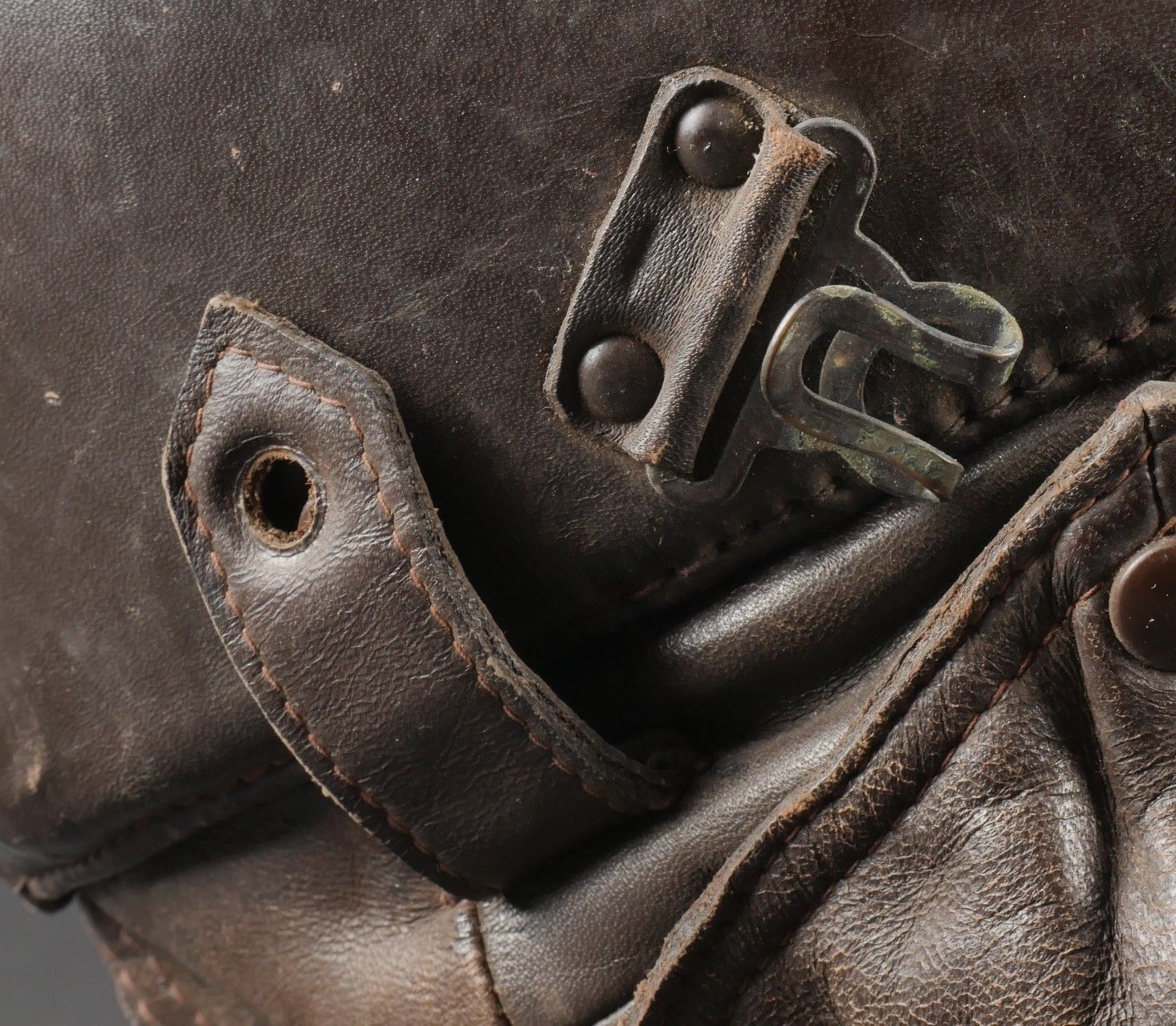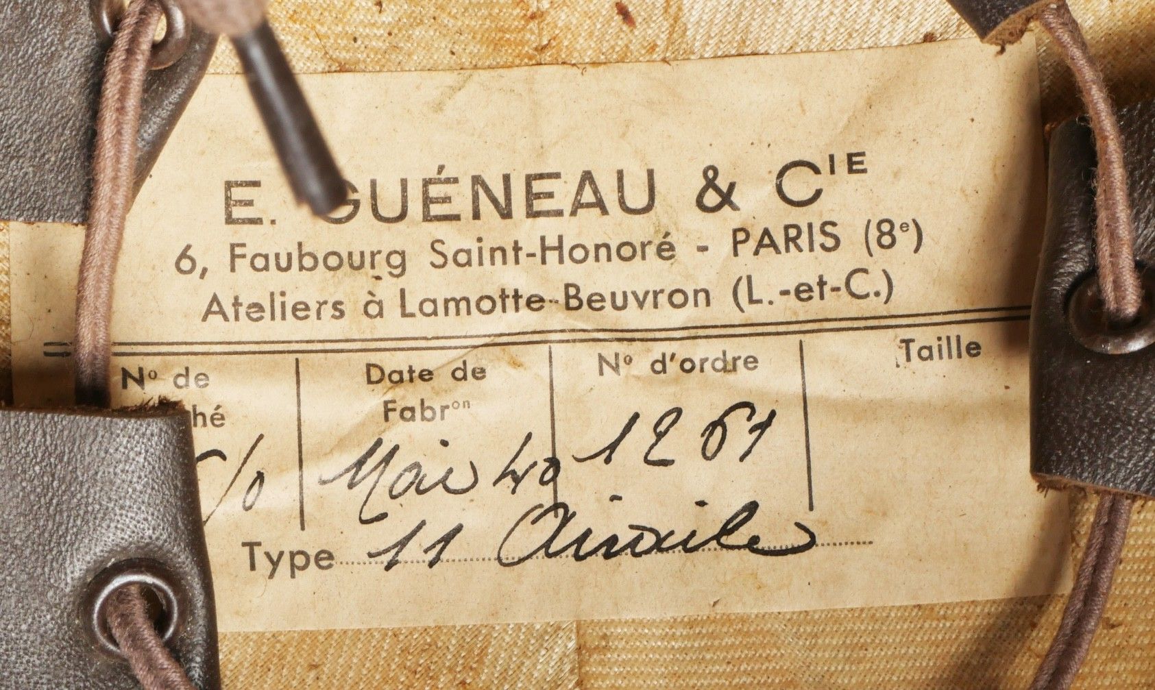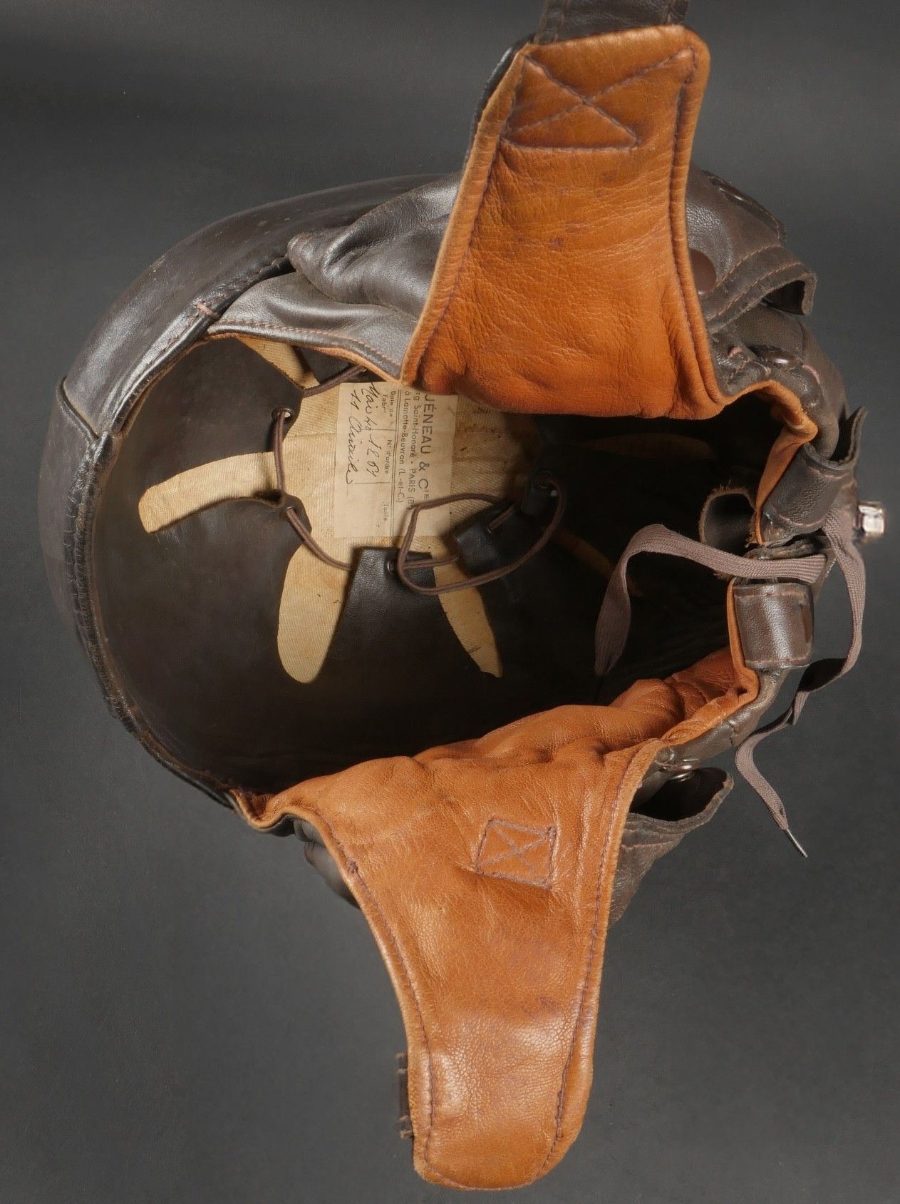 Guenau flight helmet with earphones. Brown leather flight helmet, functional press studs, drawstring present, SFA stamp accepted PG. Leather cap held in place by a lace, Guenau manufacturer's label on bottom of helmet indicating date of manufacture May 40, type 11 Airaile. With its rare Ericsson dove earphones, cord present but plug cut. Two hooks on the sides of the helmet to hold the oxygen mask. Attached is a CB 39 goggle box still with its interior felt and small elastic band. Brown leather flight helmet with functional press studs tightening lace and SFA accepted PG stamp. Leather liner secured by a lace manufacturer label inside marked Guenau dated May 1940 type 11 Airaile. Fitted with rare Ericsson colombe headphones cord present but plug missing. Two side hooks for oxygen mask retention. Includes a CB 39 goggle box with original felt lining and small elastic strap.