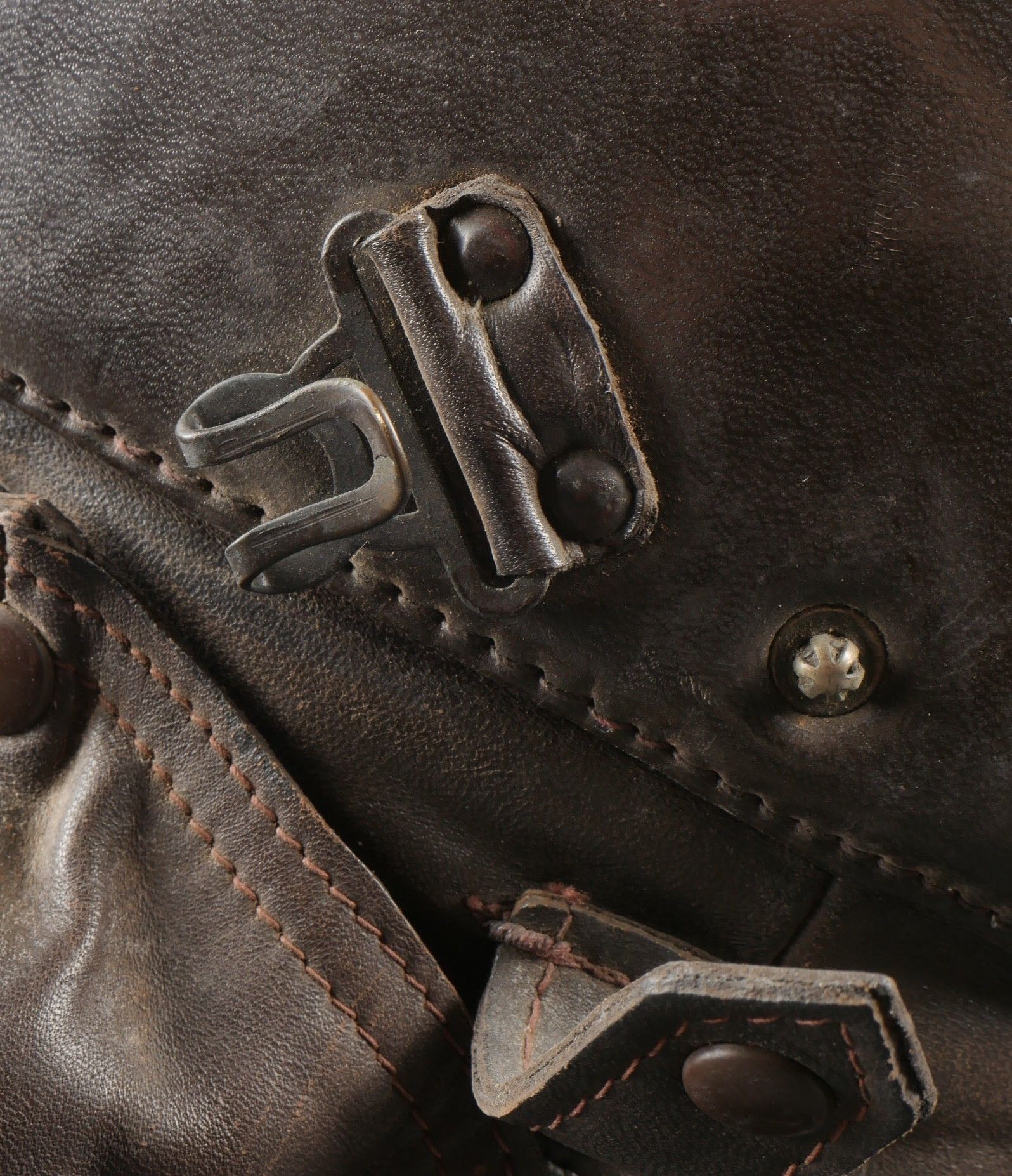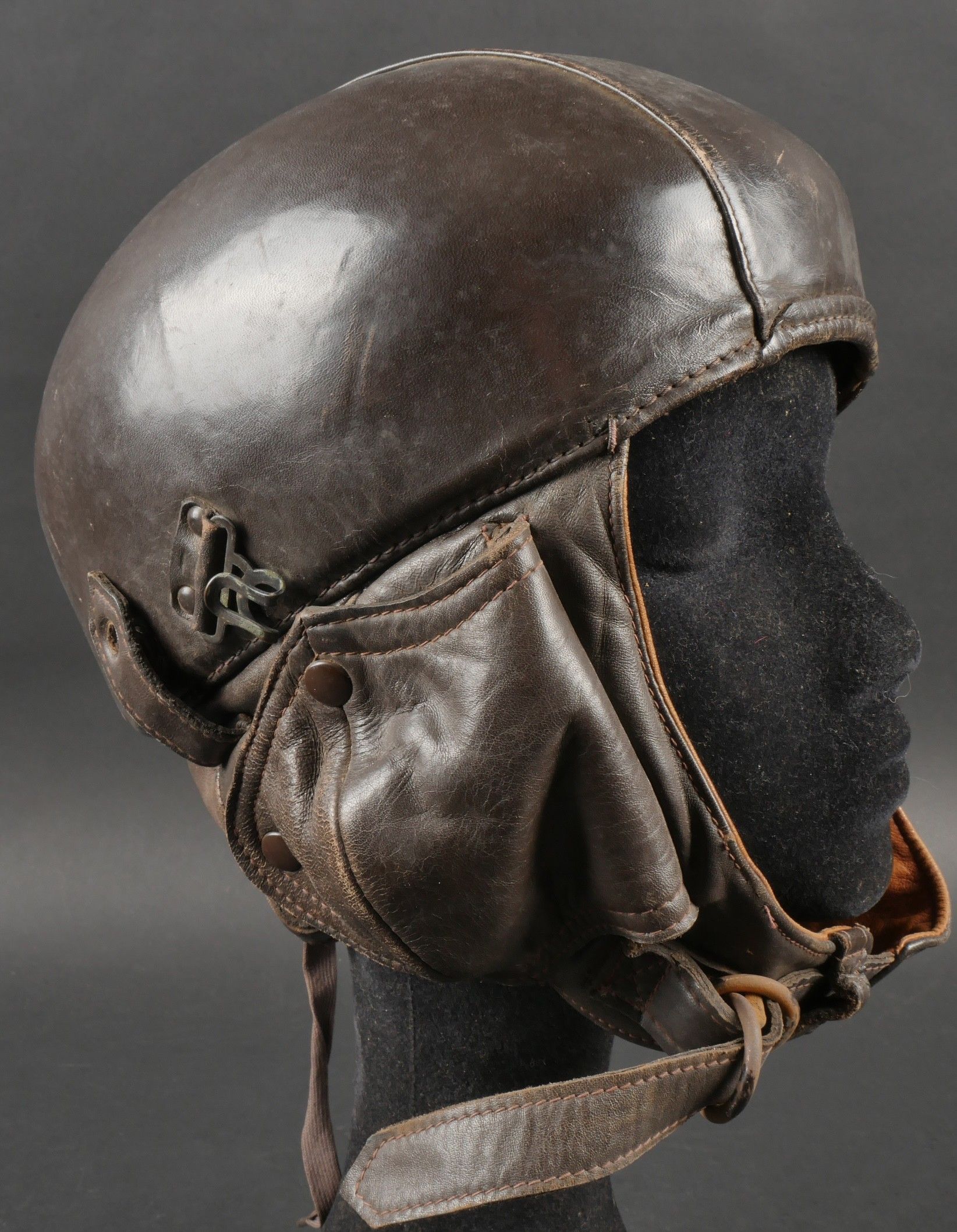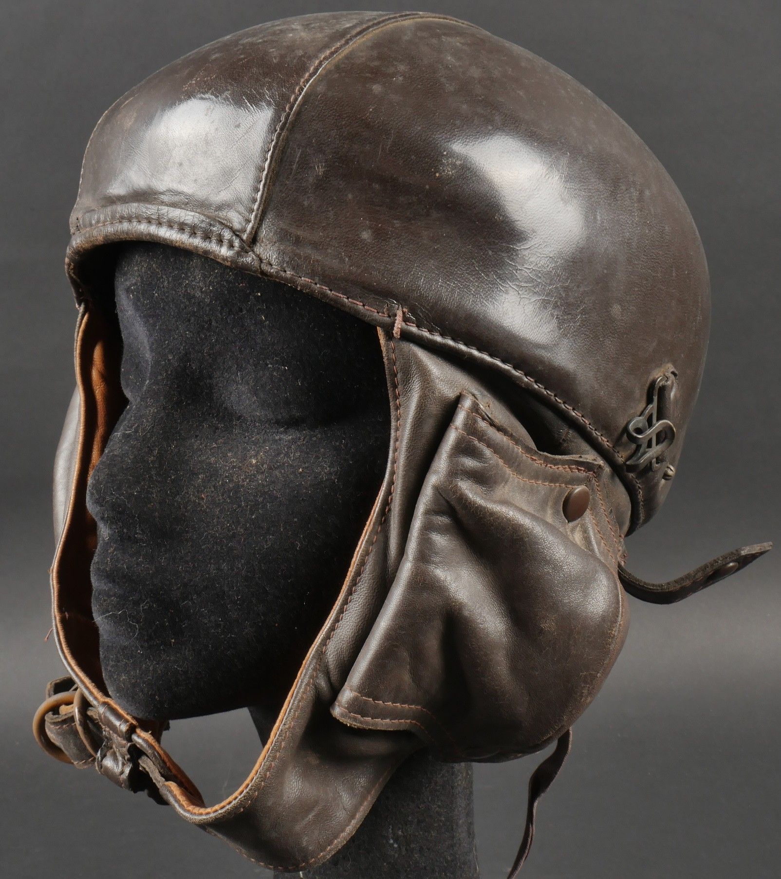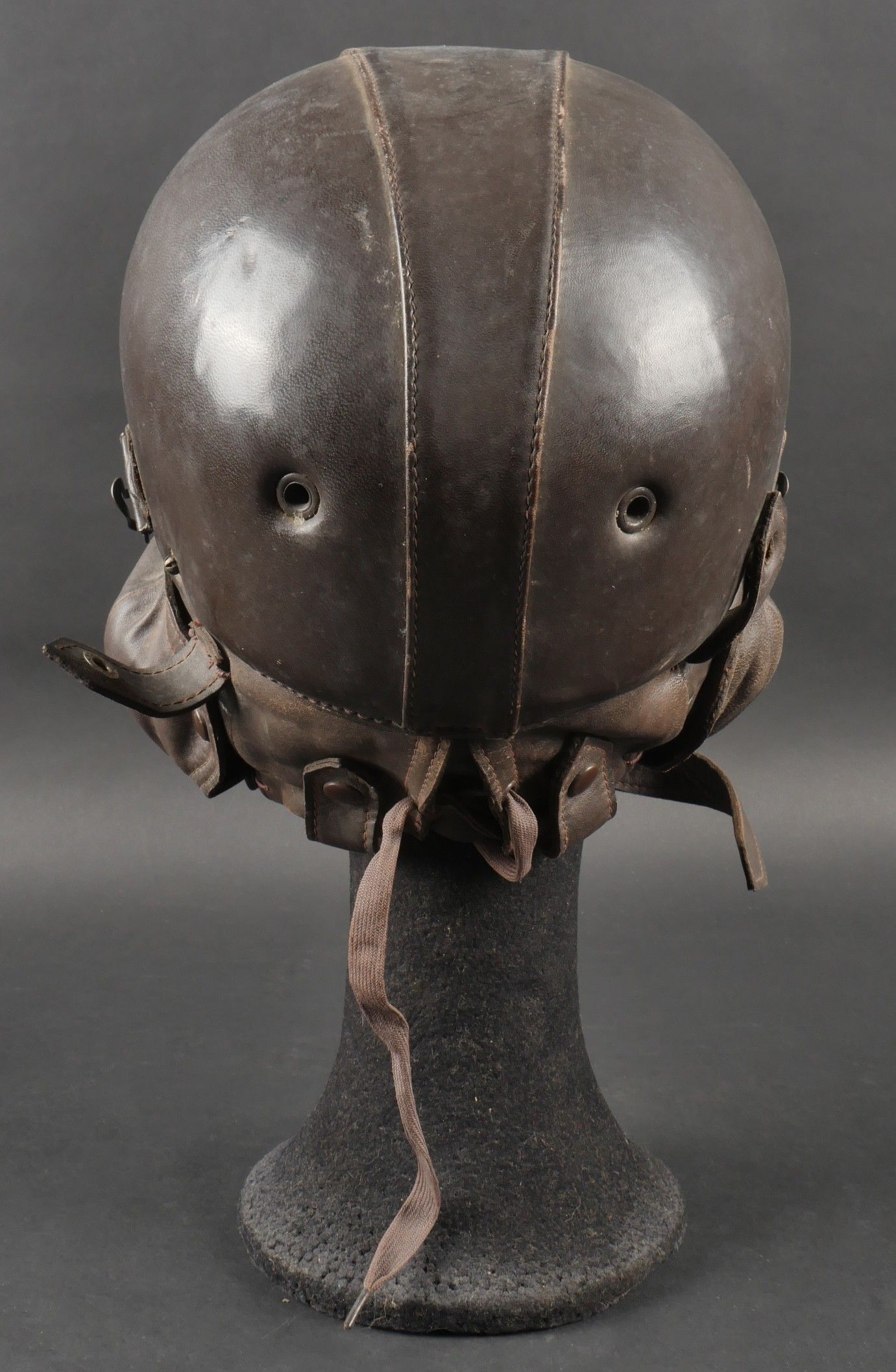 Guenau flight helmet with earphones. Brown leather flight helmet, functional press studs, drawstring present, SFA stamp accepted PG. Leather cap held in place by a lace, Guenau manufacturer's label on bottom of helmet indicating date of manufacture May 40, type 11 Airaile. With its rare Ericsson dove earphones, cord present but plug cut. Two hooks on the sides of the helmet to hold the oxygen mask. Attached is a CB 39 goggle box still with its interior felt and small elastic band. Brown leather flight helmet with functional press studs tightening lace and SFA accepted PG stamp. Leather liner secured by a lace manufacturer label inside marked Guenau dated May 1940 type 11 Airaile. Fitted with rare Ericsson colombe headphones cord present but plug missing. Two side hooks for oxygen mask retention. Includes a CB 39 goggle box with original felt lining and small elastic strap.