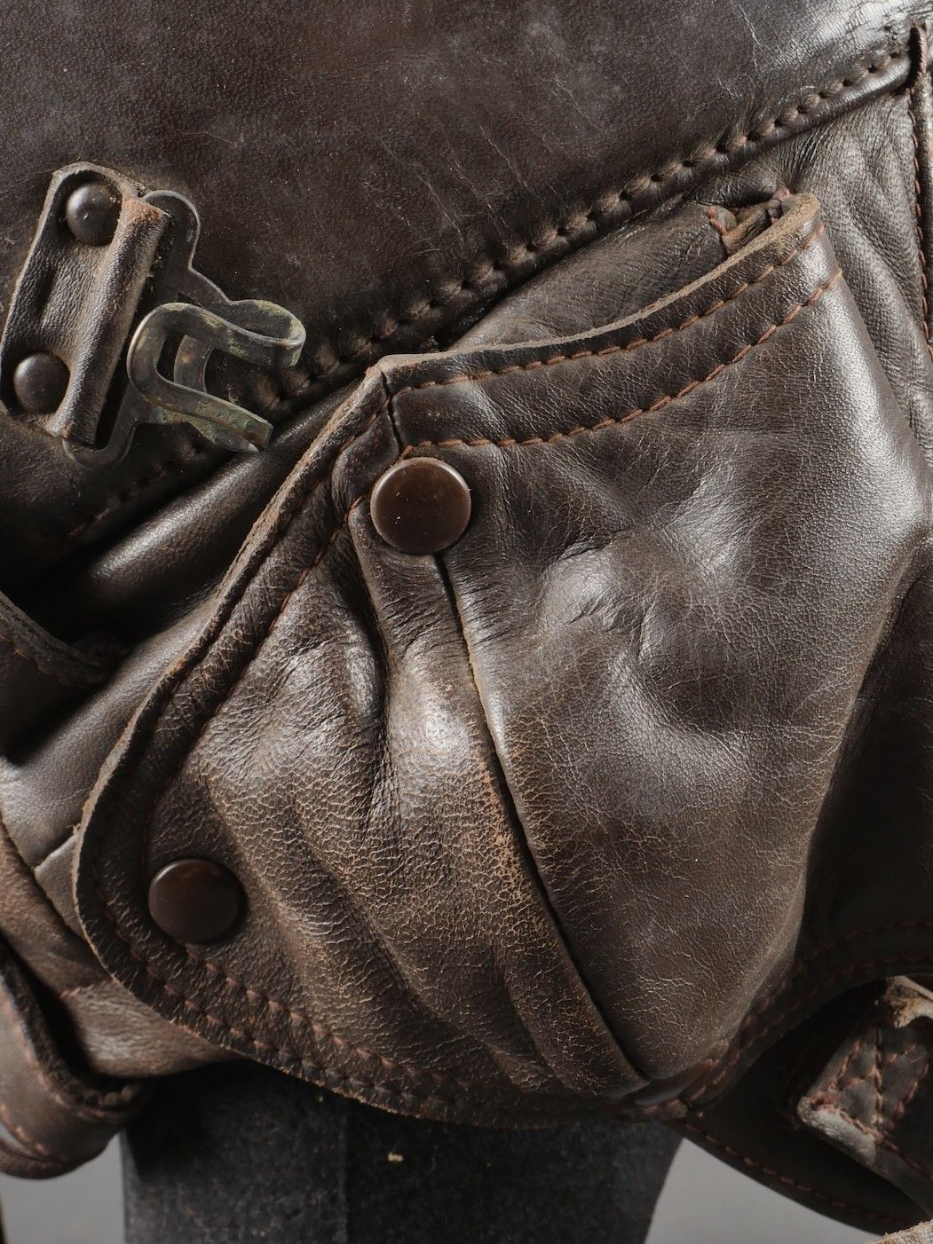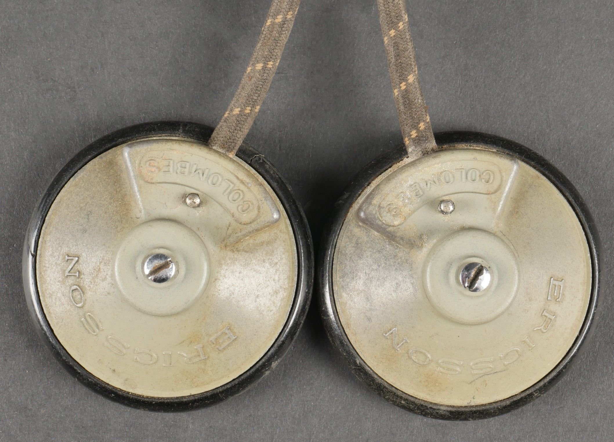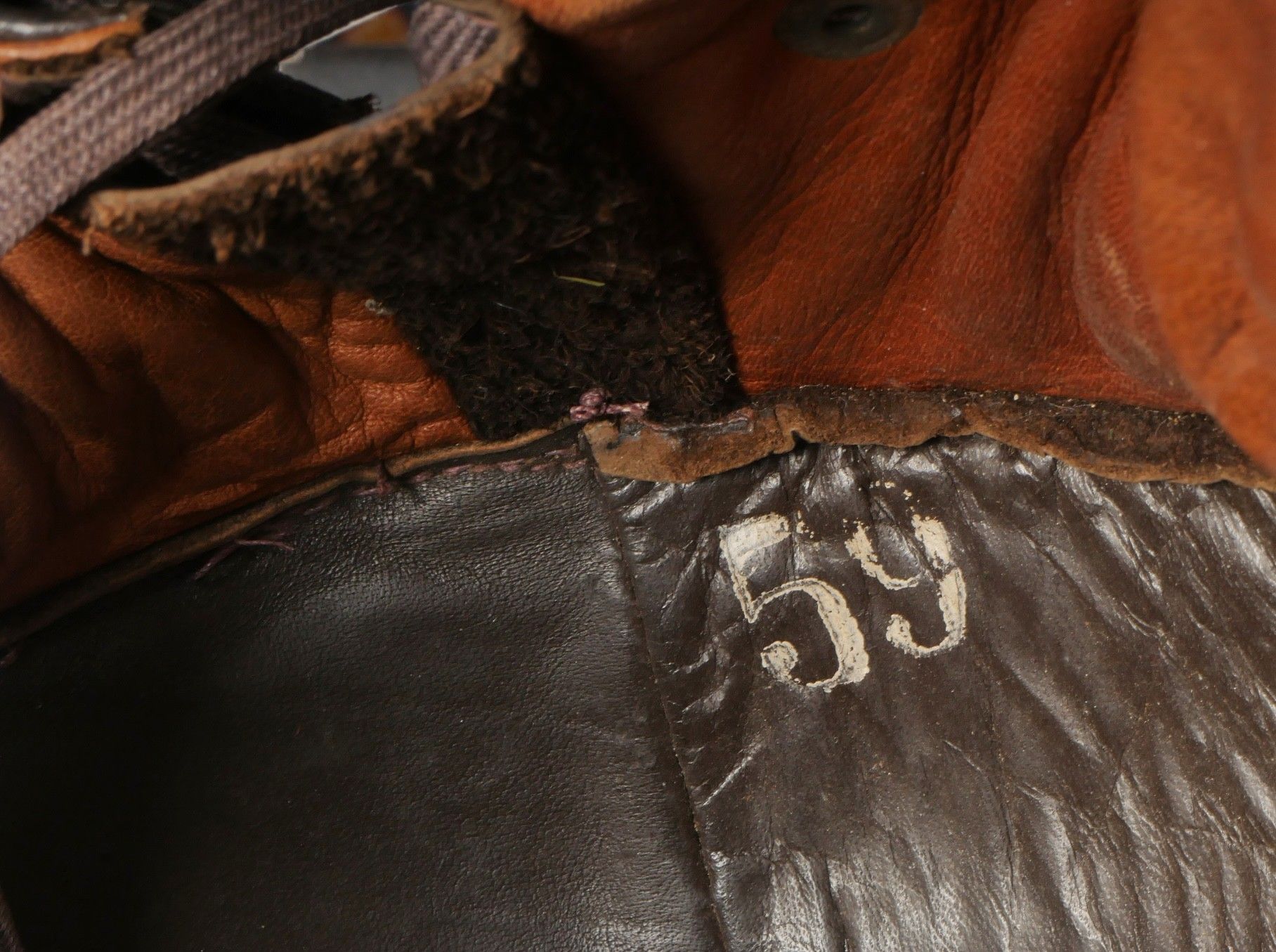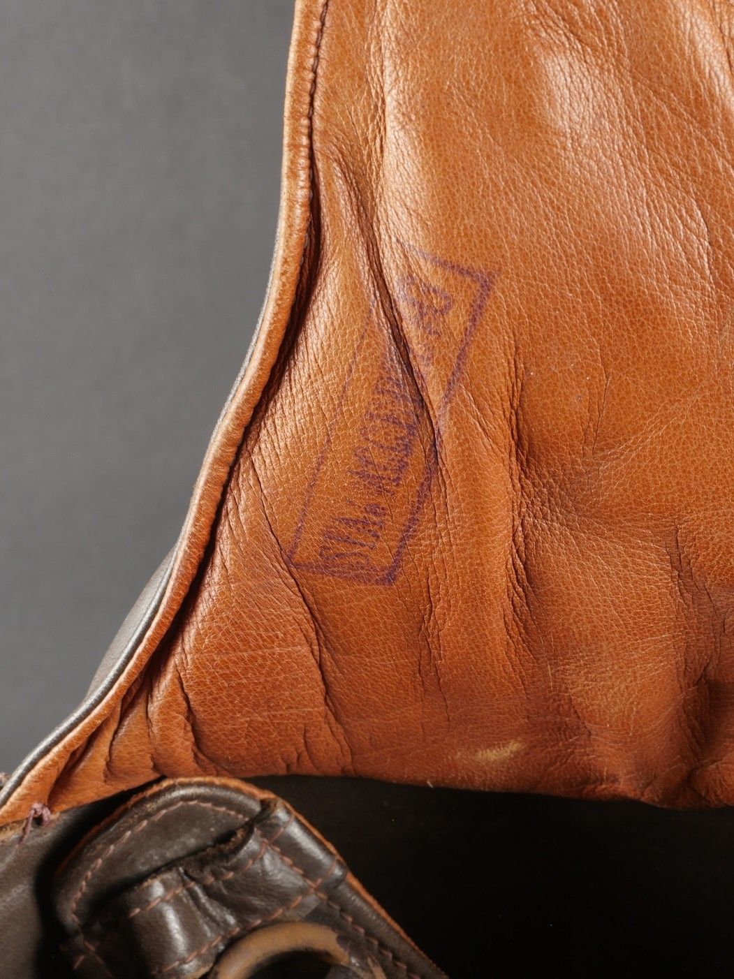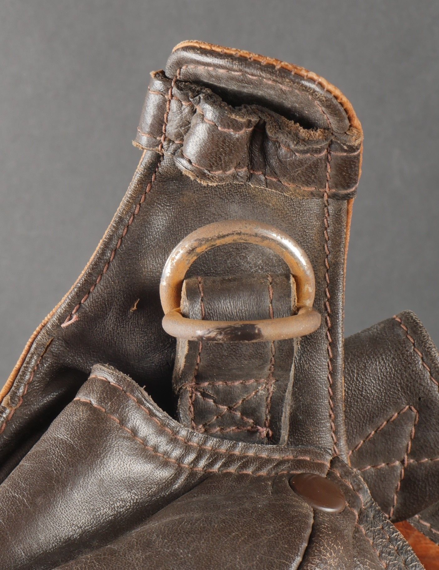 Guenau flight helmet with earphones. Brown leather flight helmet, functional press studs, drawstring present, SFA stamp accepted PG. Leather cap held in place by a lace, Guenau manufacturer's label on bottom of helmet indicating date of manufacture May 40, type 11 Airaile. With its rare Ericsson dove earphones, cord present but plug cut. Two hooks on the sides of the helmet to hold the oxygen mask. Attached is a CB 39 goggle box still with its interior felt and small elastic band. Brown leather flight helmet with functional press studs tightening lace and SFA accepted PG stamp. Leather liner secured by a lace manufacturer label inside marked Guenau dated May 1940 type 11 Airaile. Fitted with rare Ericsson colombe headphones cord present but plug missing. Two side hooks for oxygen mask retention. Includes a CB 39 goggle box with original felt lining and small elastic strap.