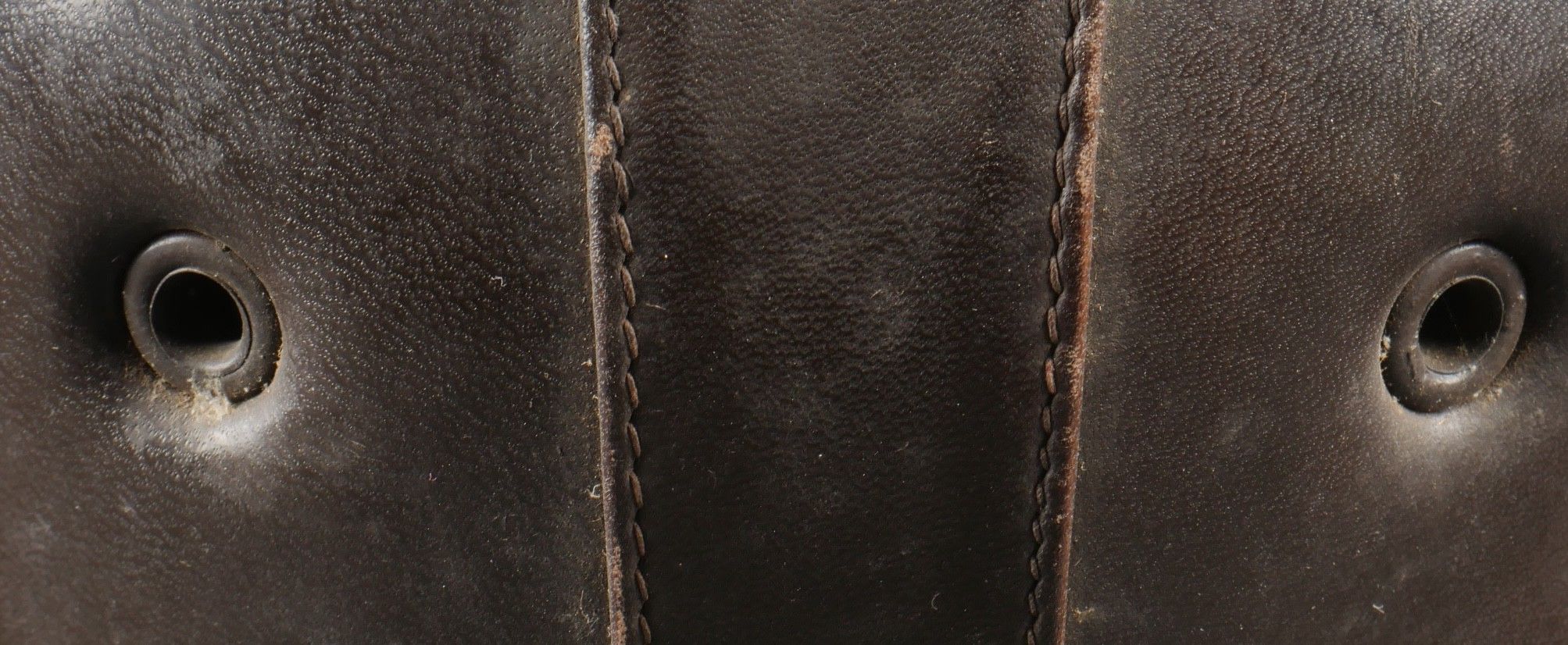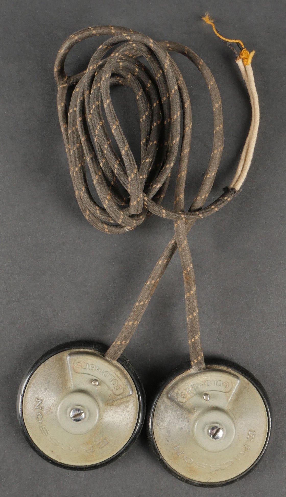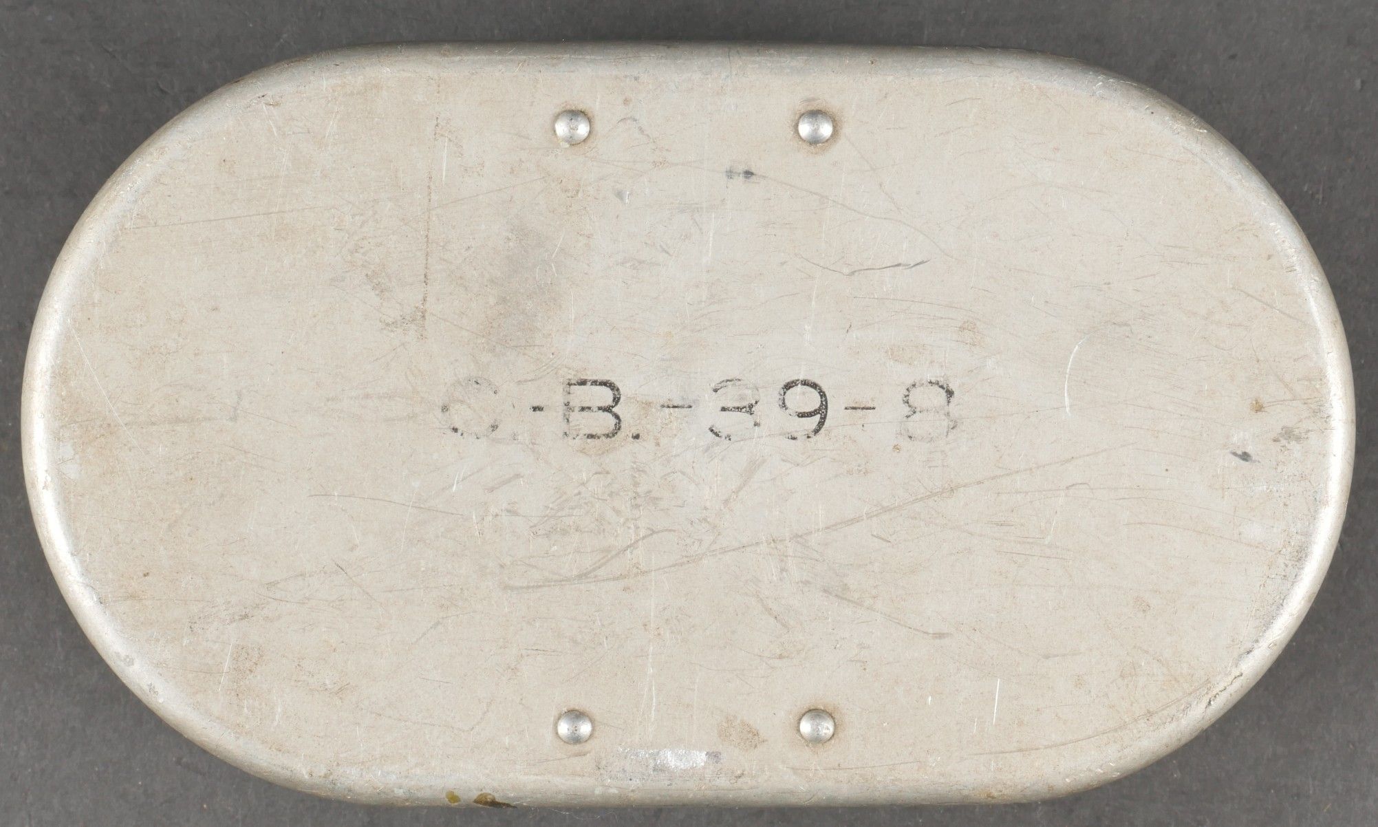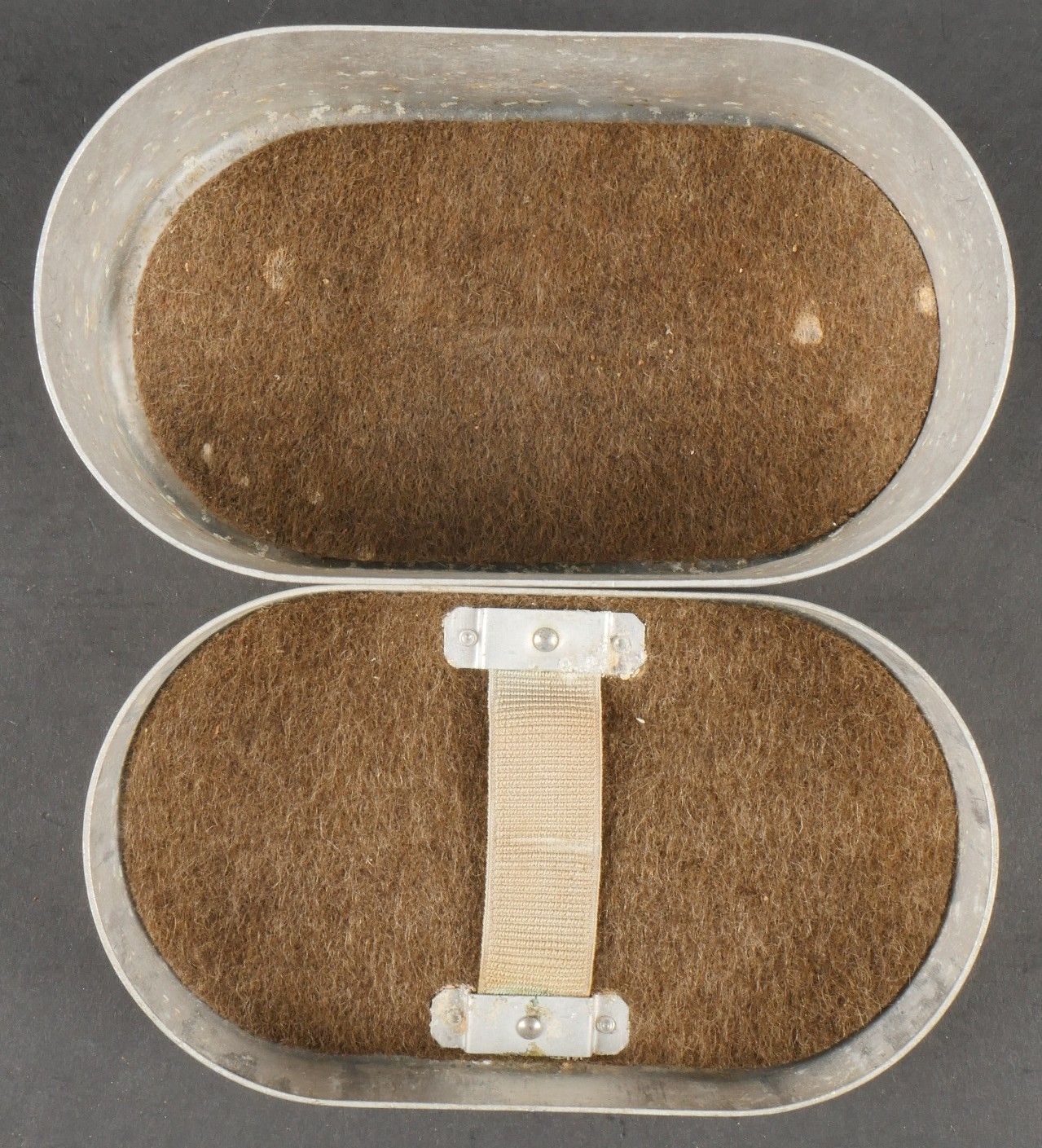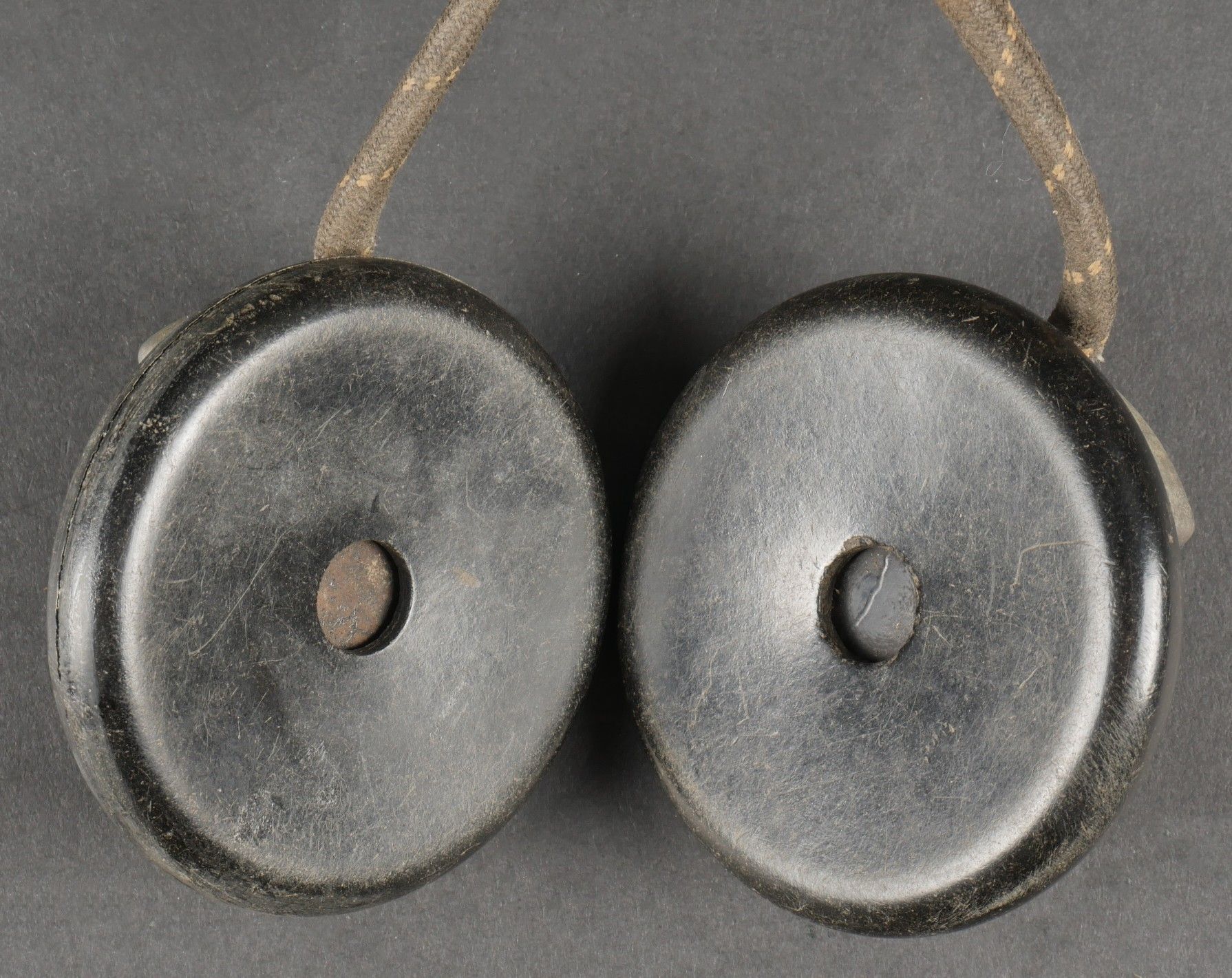 Guenau flight helmet with earphones. Brown leather flight helmet, functional press studs, drawstring present, SFA stamp accepted PG. Leather cap held in place by a lace, Guenau manufacturer's label on bottom of helmet indicating date of manufacture May 40, type 11 Airaile. With its rare Ericsson dove earphones, cord present but plug cut. Two hooks on the sides of the helmet to hold the oxygen mask. Attached is a CB 39 goggle box still with its interior felt and small elastic band. Brown leather flight helmet with functional press studs tightening lace and SFA accepted PG stamp. Leather liner secured by a lace manufacturer label inside marked Guenau dated May 1940 type 11 Airaile. Fitted with rare Ericsson colombe headphones cord present but plug missing. Two side hooks for oxygen mask retention. Includes a CB 39 goggle box with original felt lining and small elastic strap.