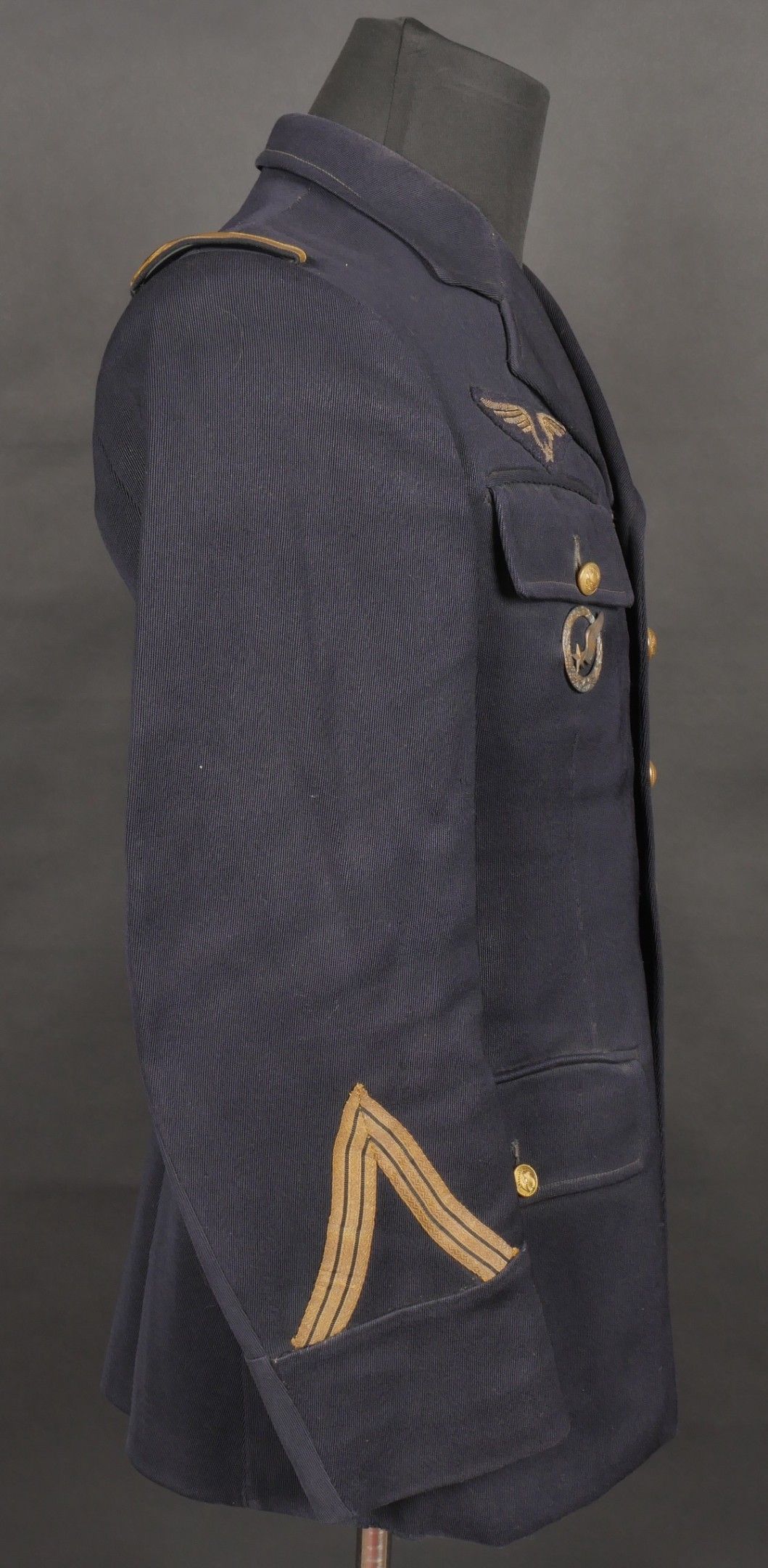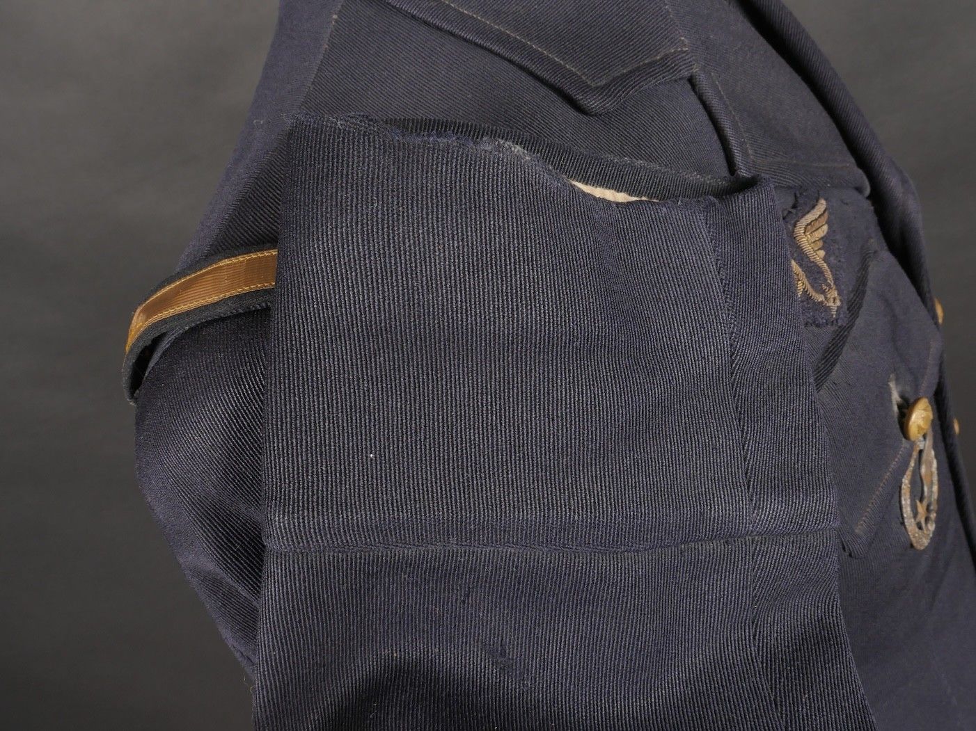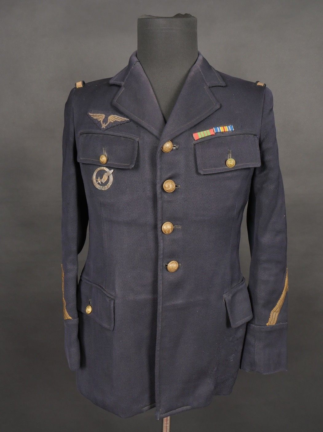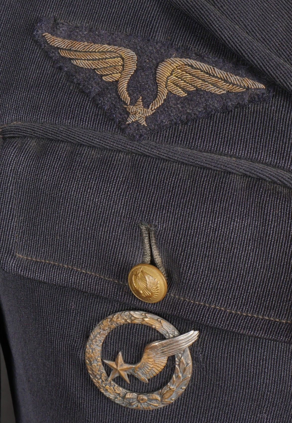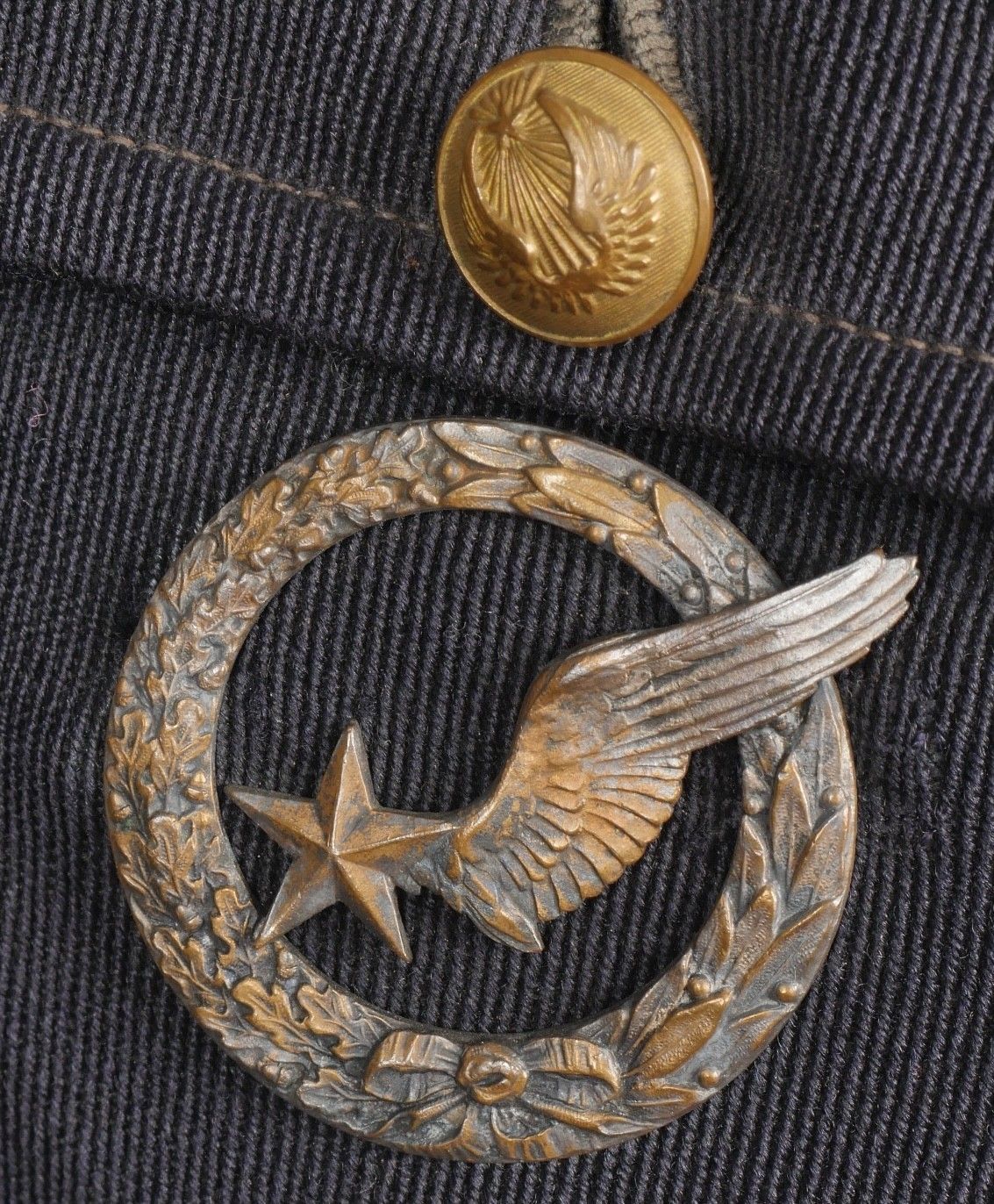Air Force jacket. In louise blue worsted cloth, fastened by four buttons with the aviation coat of arms, two decoration reminders above the left breast pocket. Cannetille embroidered badge above right pocket, student pilot's licence made in the 1930s with no markings. Black rayon lining with some repairs. Air Force tunic. Fine blue wool tunic closing with four aviationembossed buttons two ribbon bars above the left breast pocket and a gold wire embroidered badge above the right pocket 1930s pilot trainee brevet without maker's mark black rayon lining with minor repairs.