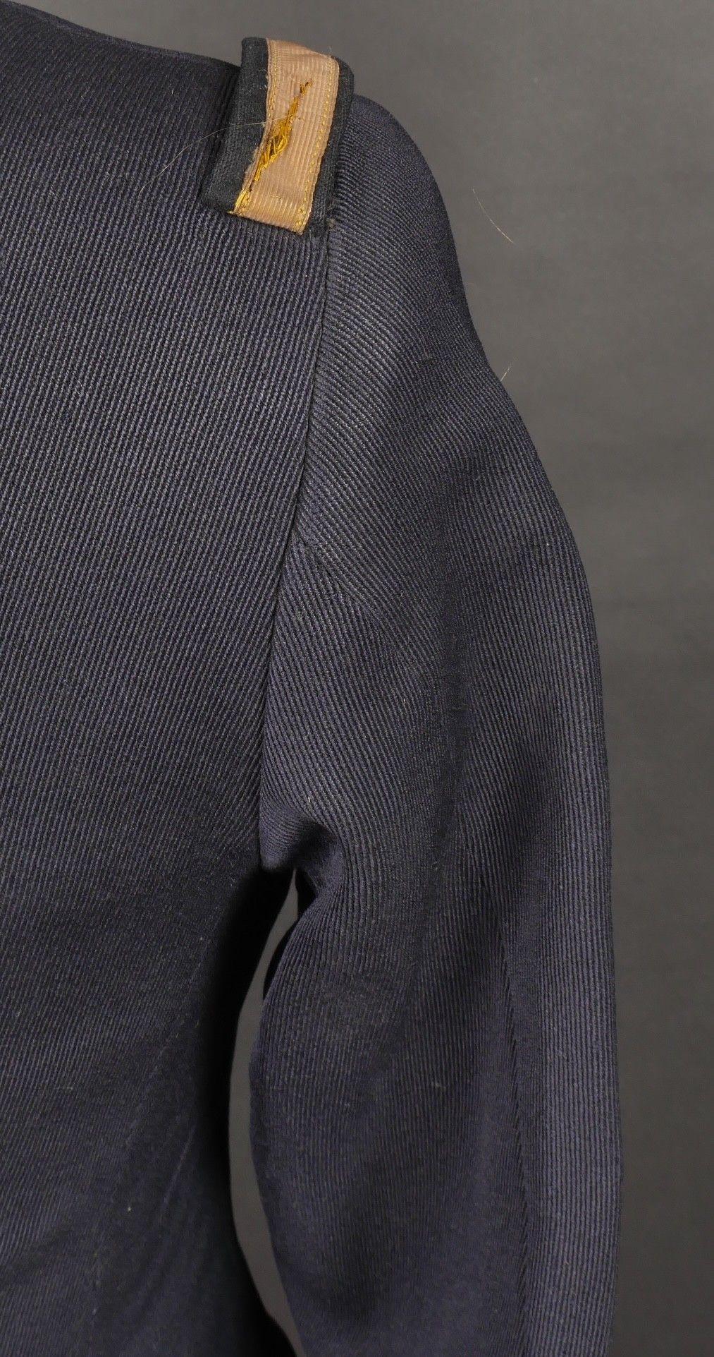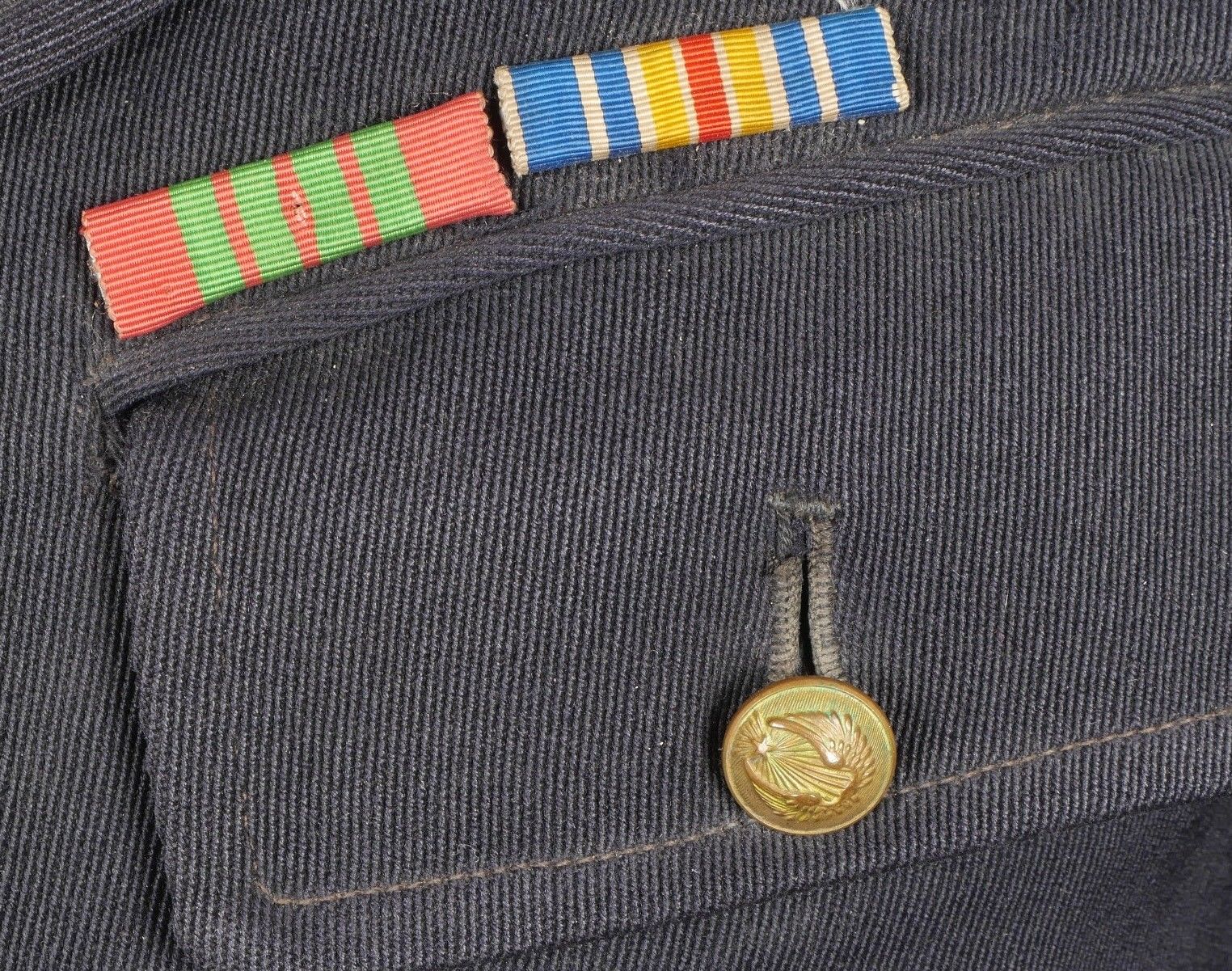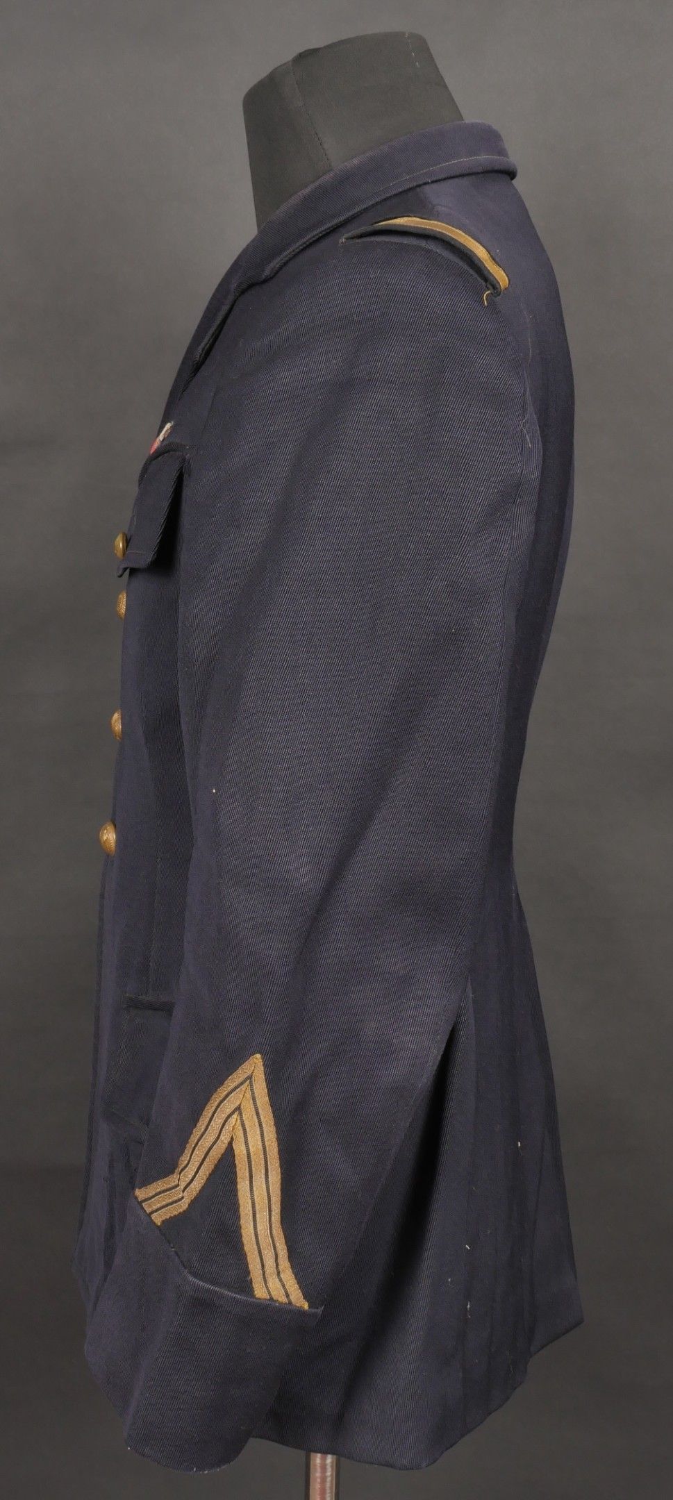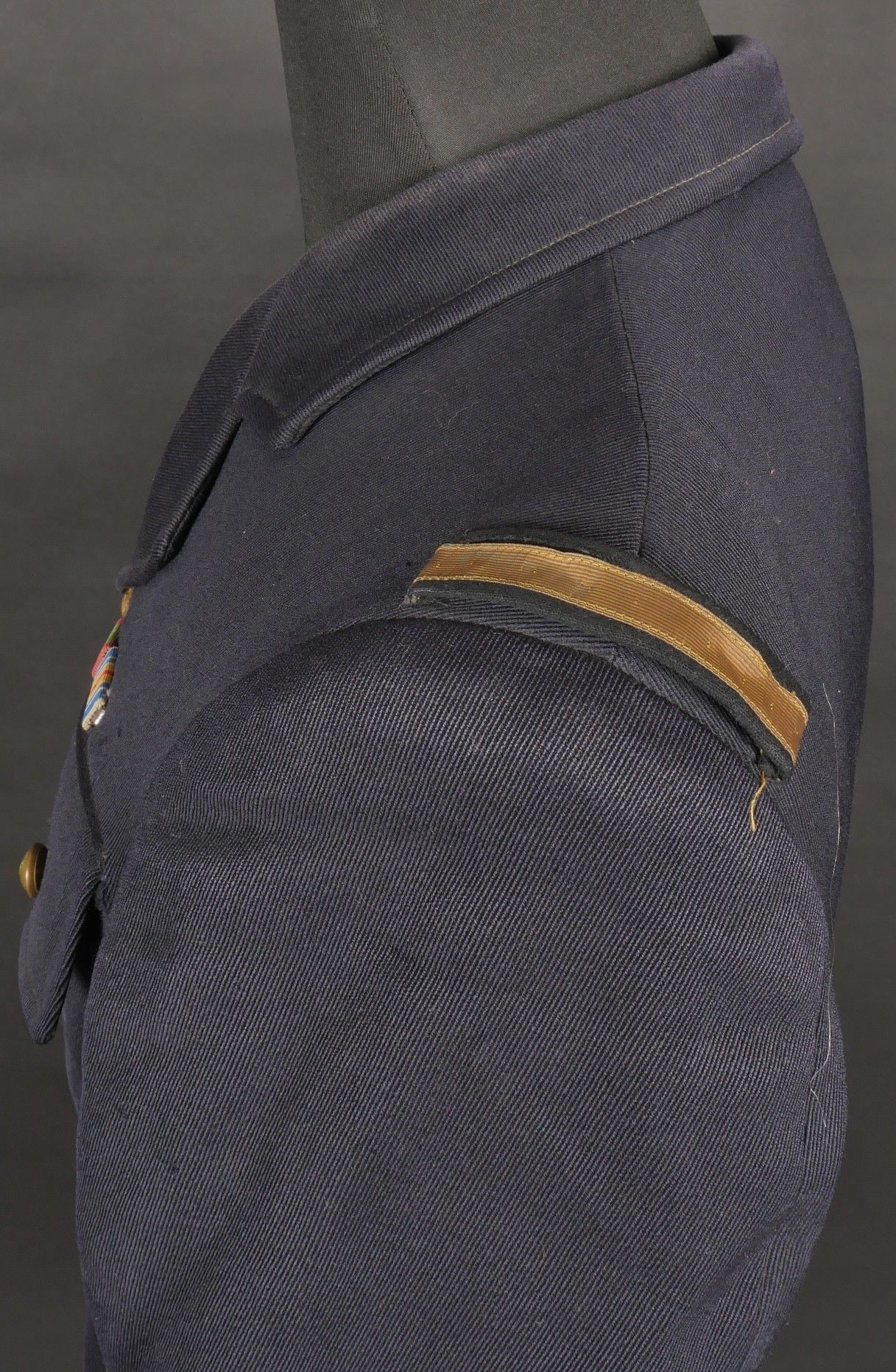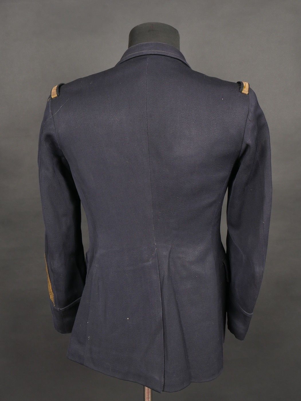 Air Force jacket. In louise blue worsted cloth, fastened by four buttons with the aviation coat of arms, two decoration reminders above the left breast pocket. Cannetille embroidered badge above right pocket, student pilot's licence made in the 1930s with no markings. Black rayon lining with some repairs. Air Force tunic. Fine blue wool tunic closing with four aviationembossed buttons two ribbon bars above the left breast pocket and a gold wire embroidered badge above the right pocket 1930s pilot trainee brevet without maker's mark black rayon lining with minor repairs.