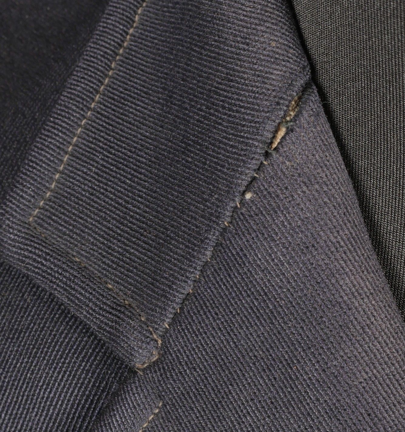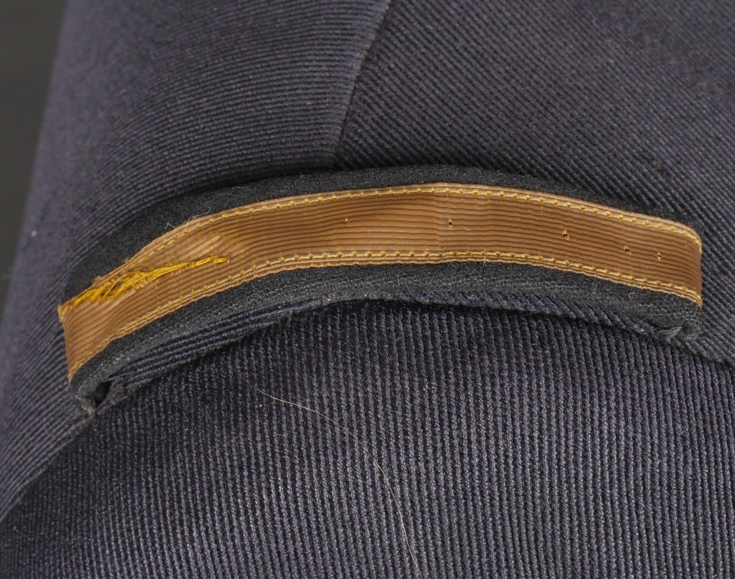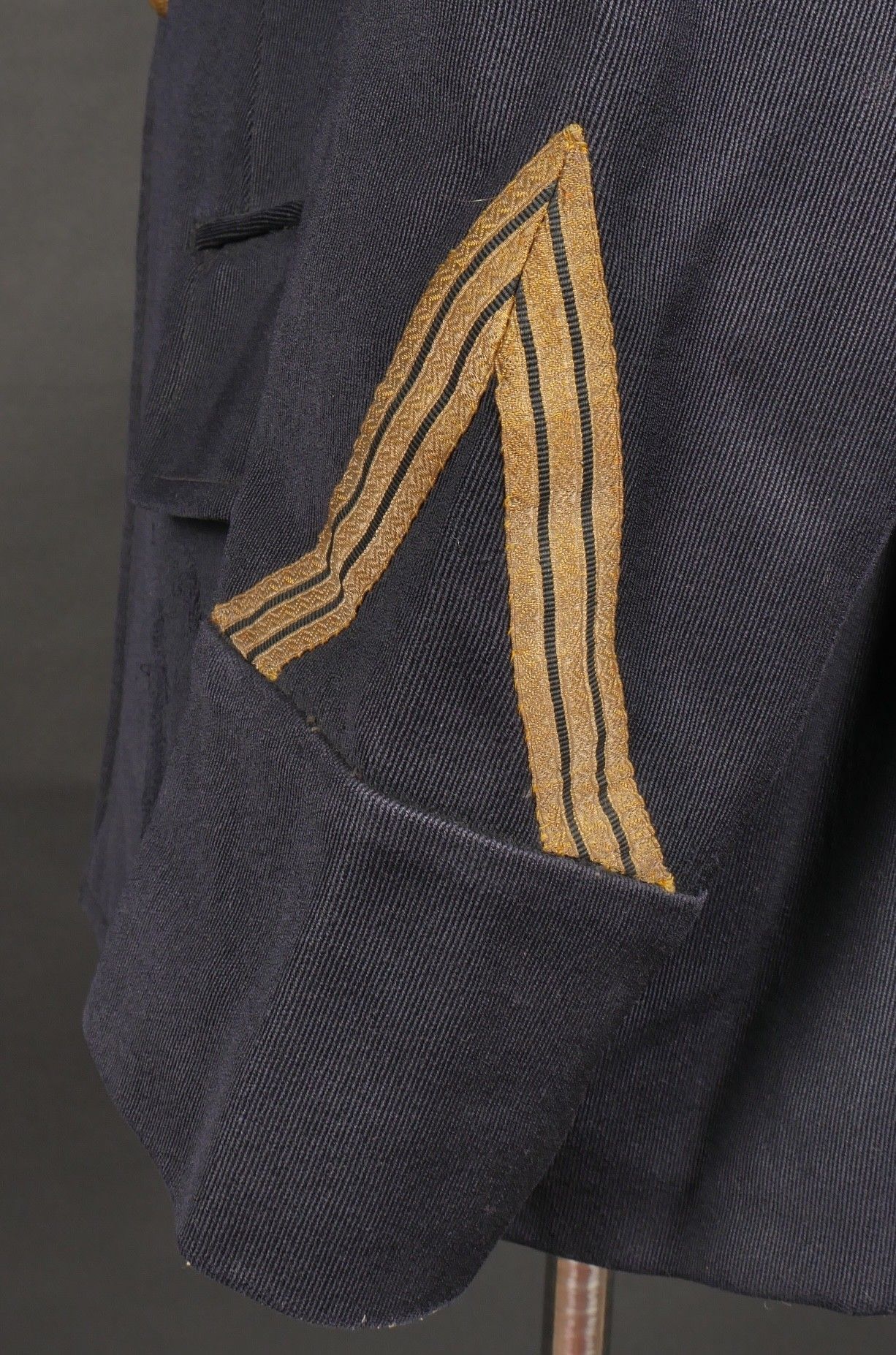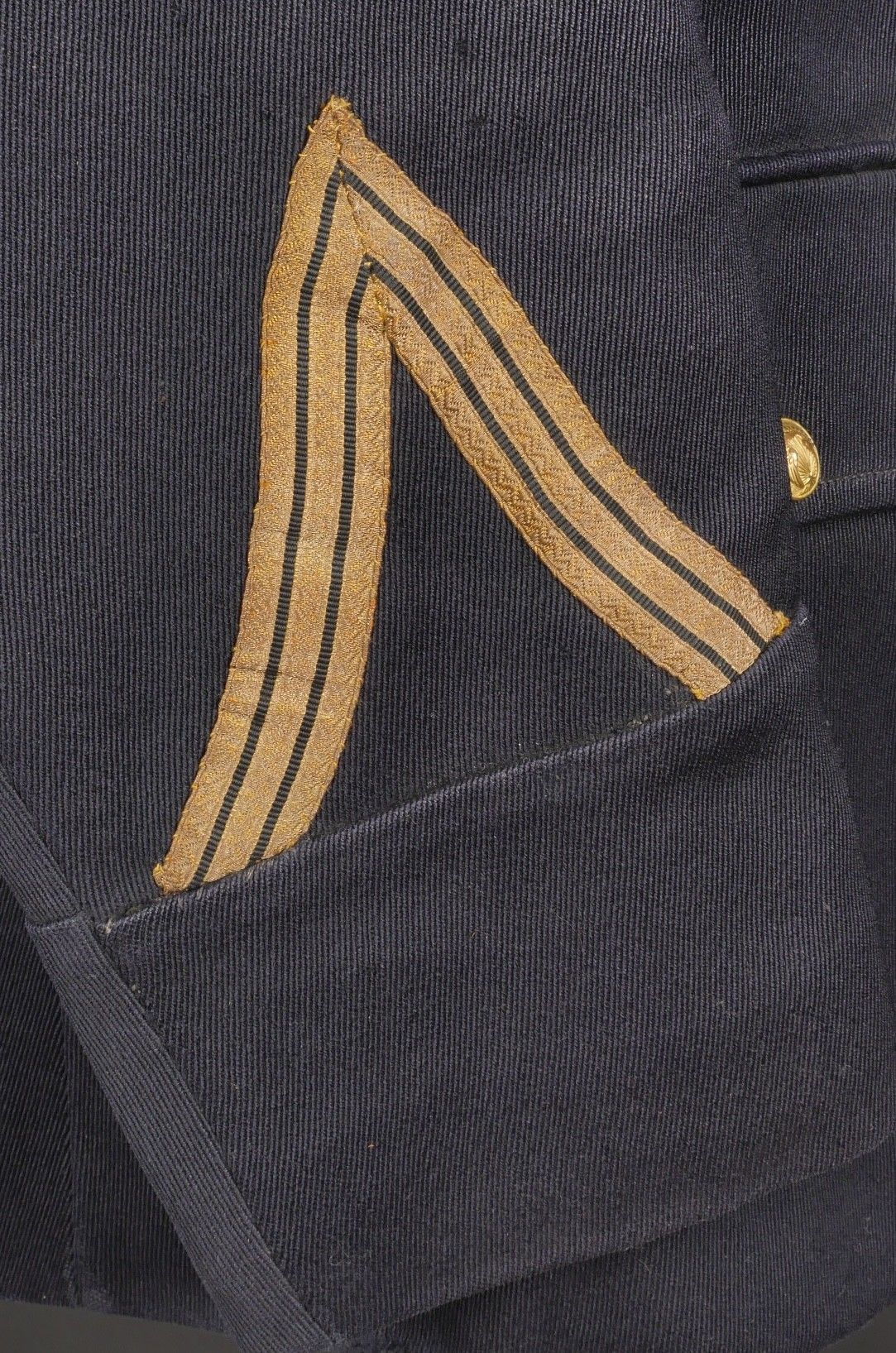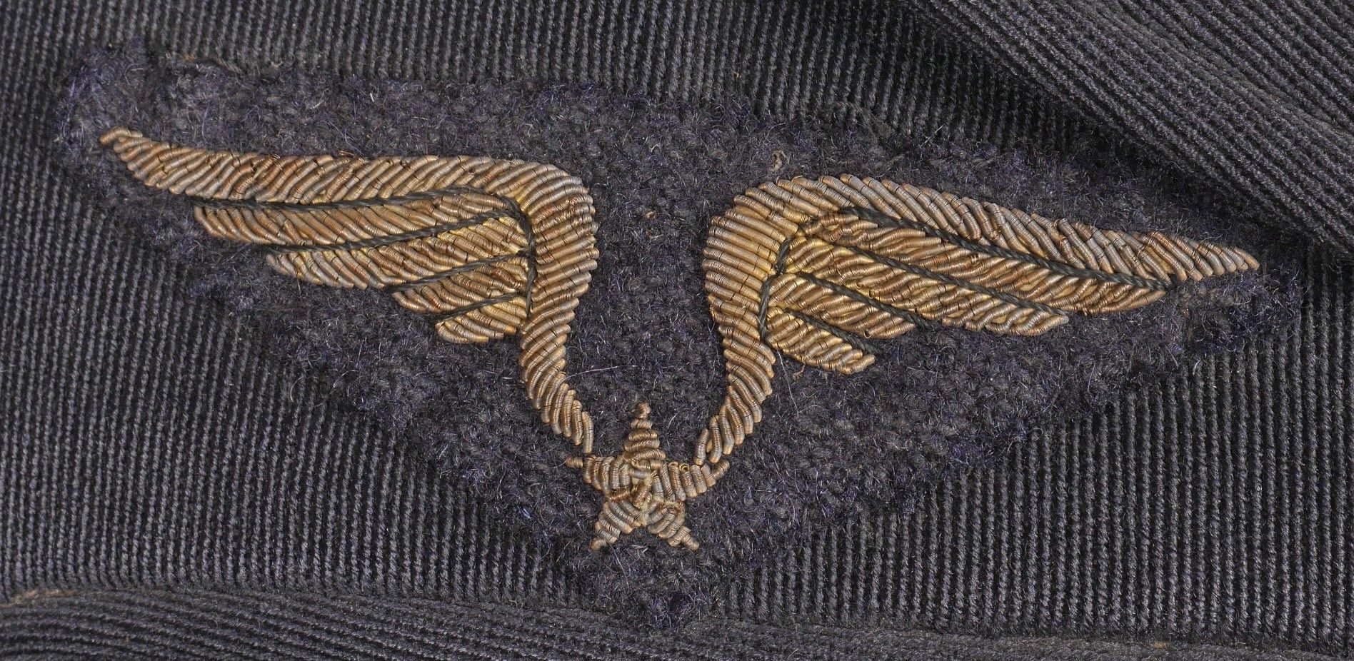Air Force jacket. In louise blue worsted cloth, fastened by four buttons with the aviation coat of arms, two decoration reminders above the left breast pocket. Cannetille embroidered badge above right pocket, student pilot's licence made in the 1930s with no markings. Black rayon lining with some repairs. Air Force tunic. Fine blue wool tunic closing with four aviationembossed buttons two ribbon bars above the left breast pocket and a gold wire embroidered badge above the right pocket 1930s pilot trainee brevet without maker's mark black rayon lining with minor repairs.