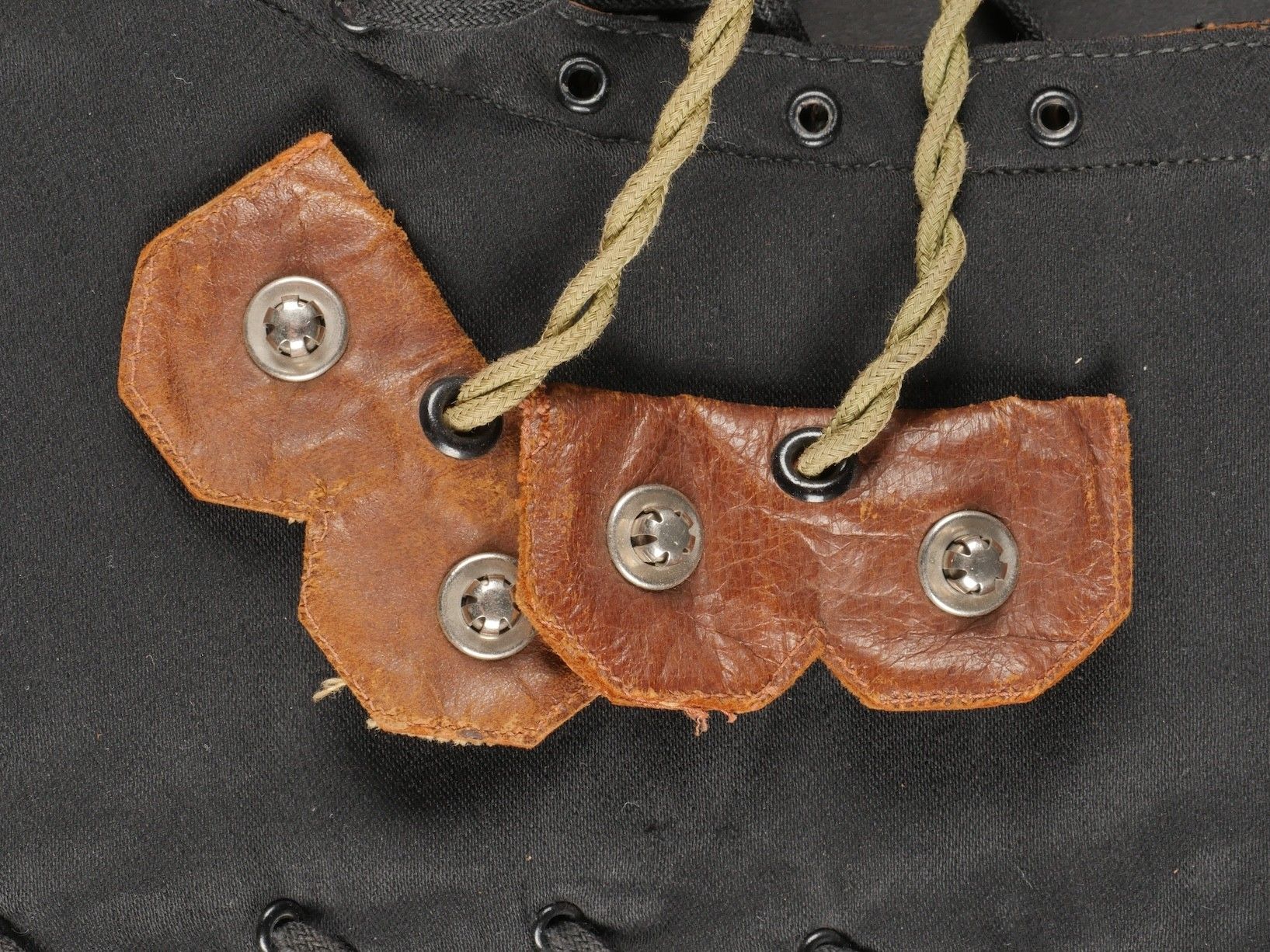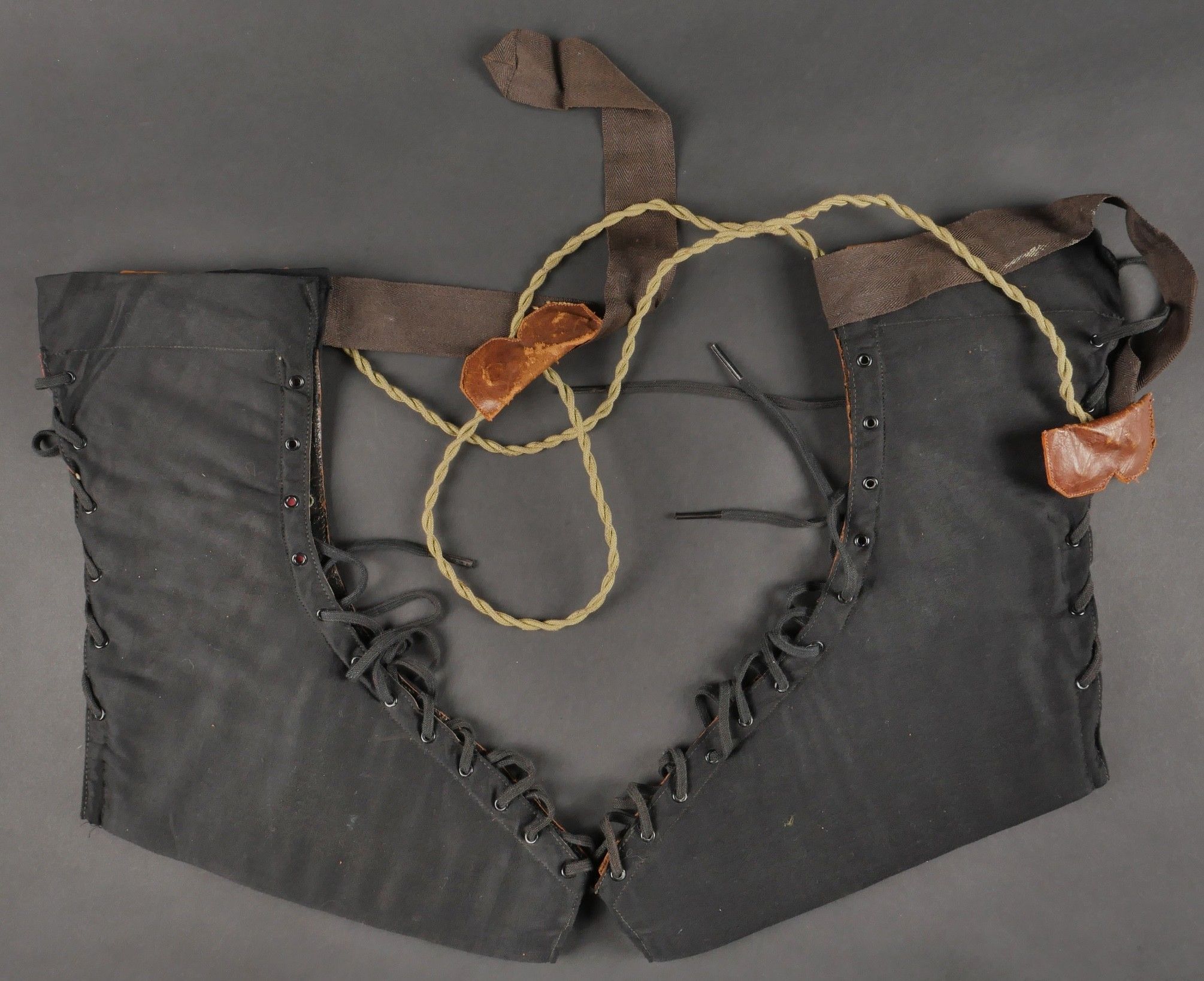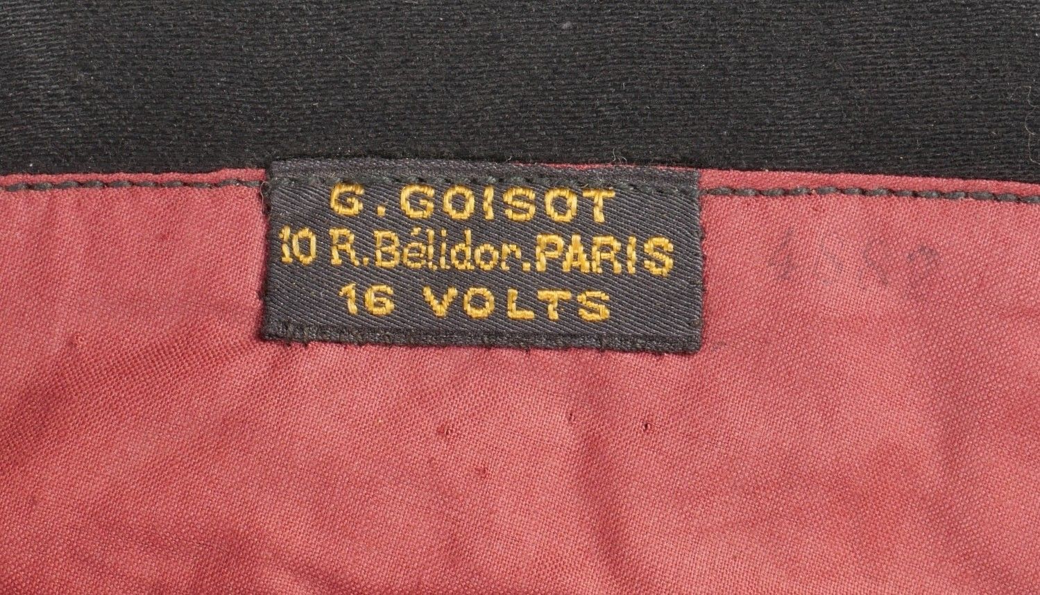 Heated underboots. In fine black fabric, fully equipped with electric heating elements, lacing system at the front and back. Both overboots have their own plug, small label from the manufacturer G.Goiso 16 rue Belidor in Paris, 16 volt. Heated overboots. Fine black fabric fully equipped with electrical heating elements front and rear lacing both with connectors small manufacturer label G Goiso 16 rue Bellidor Paris 16 volts.