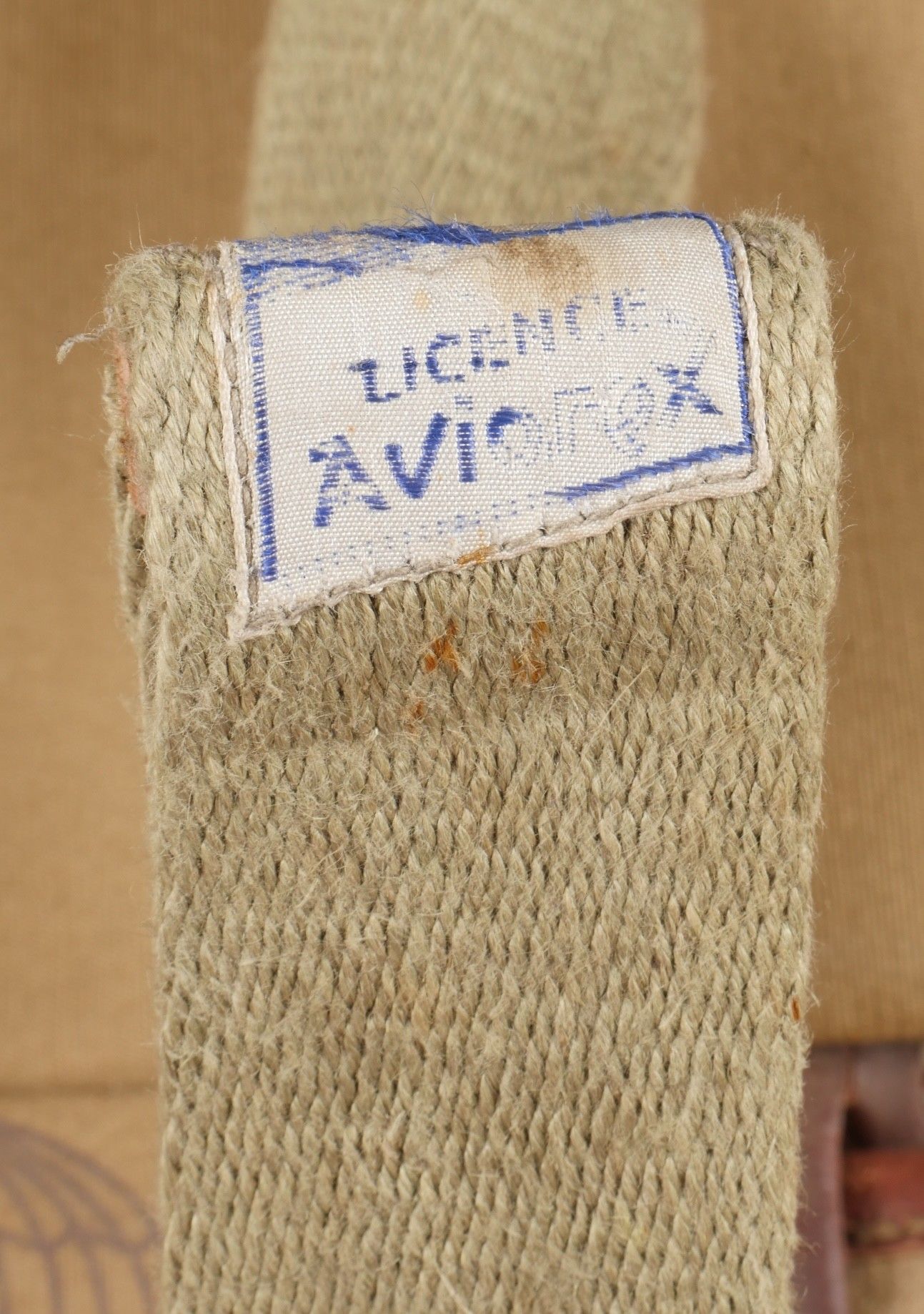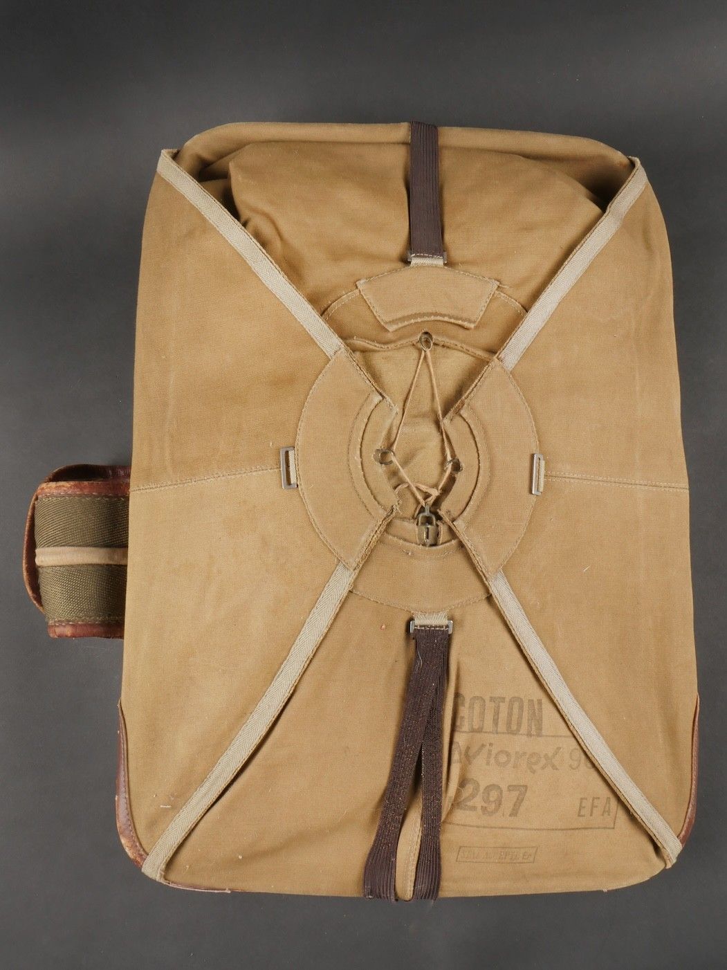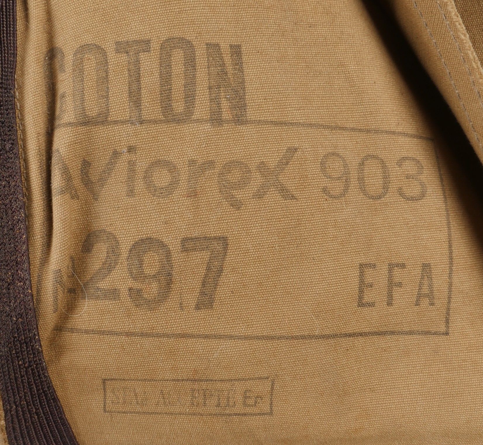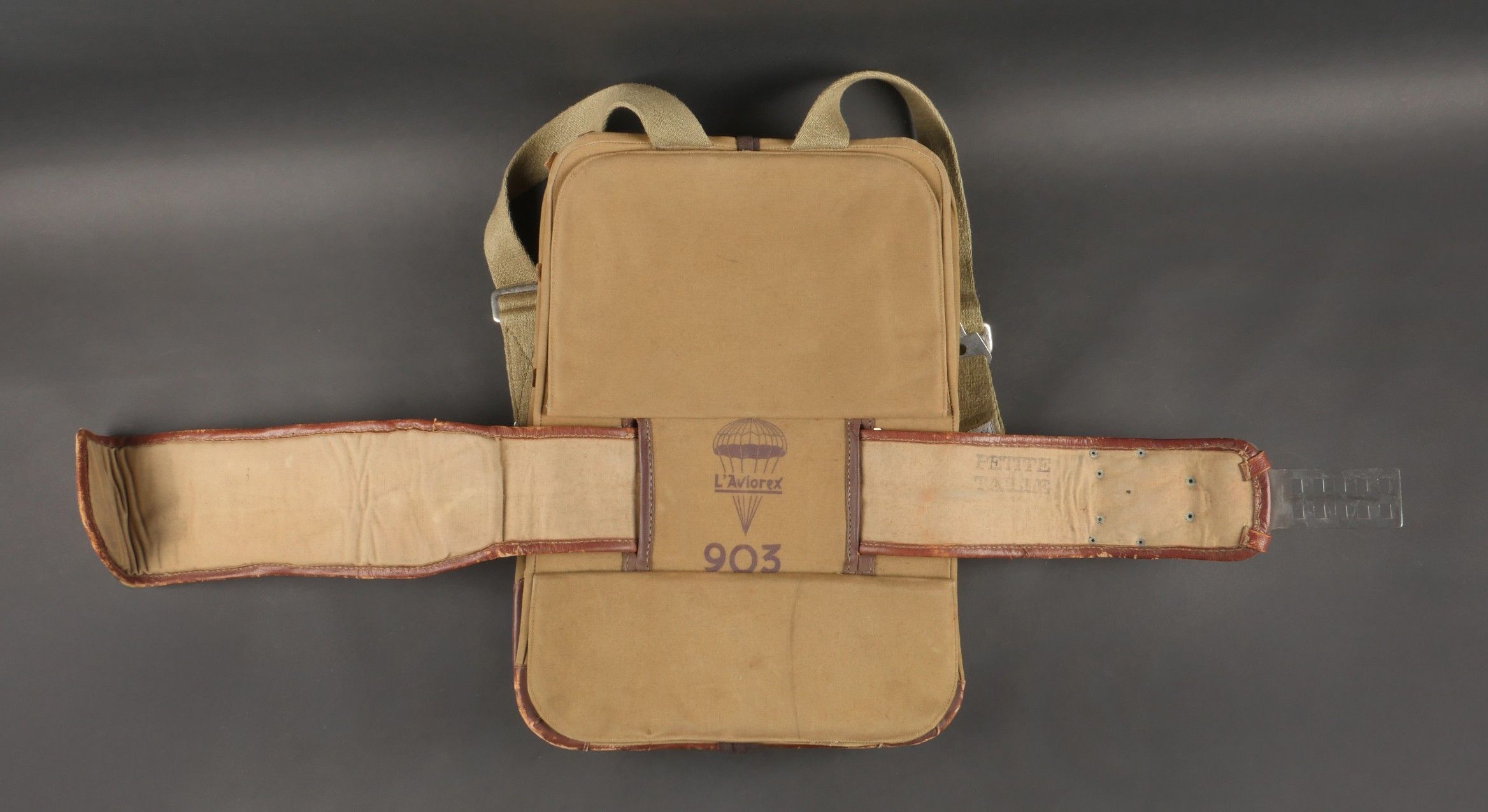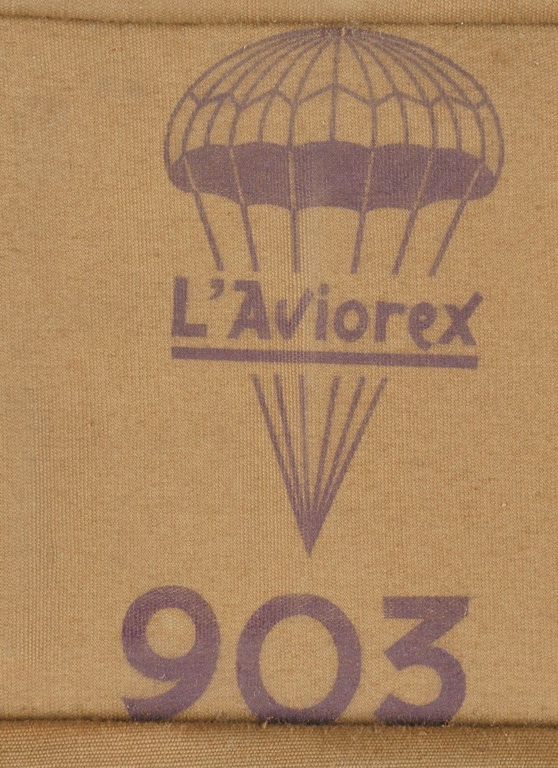 Aviorex 903 parachute. Light khaki canvas cover, for crew or pilot of slow moving aircraft. Belt present with small size stamp, marking Aviorex 903. On the back is the cotton marking Aviorex 903 followed by 297 EFA. Later modification of a parachute used in the French campaign. Aviorex 903 parachute. Light khaki canvas cover for slow aircraft crew or pilot waist belt present with small size stampings markings Aviorex 903 and cotton marking Aviorex 903 followed by 297 EFA later modified for use during the French campaign.