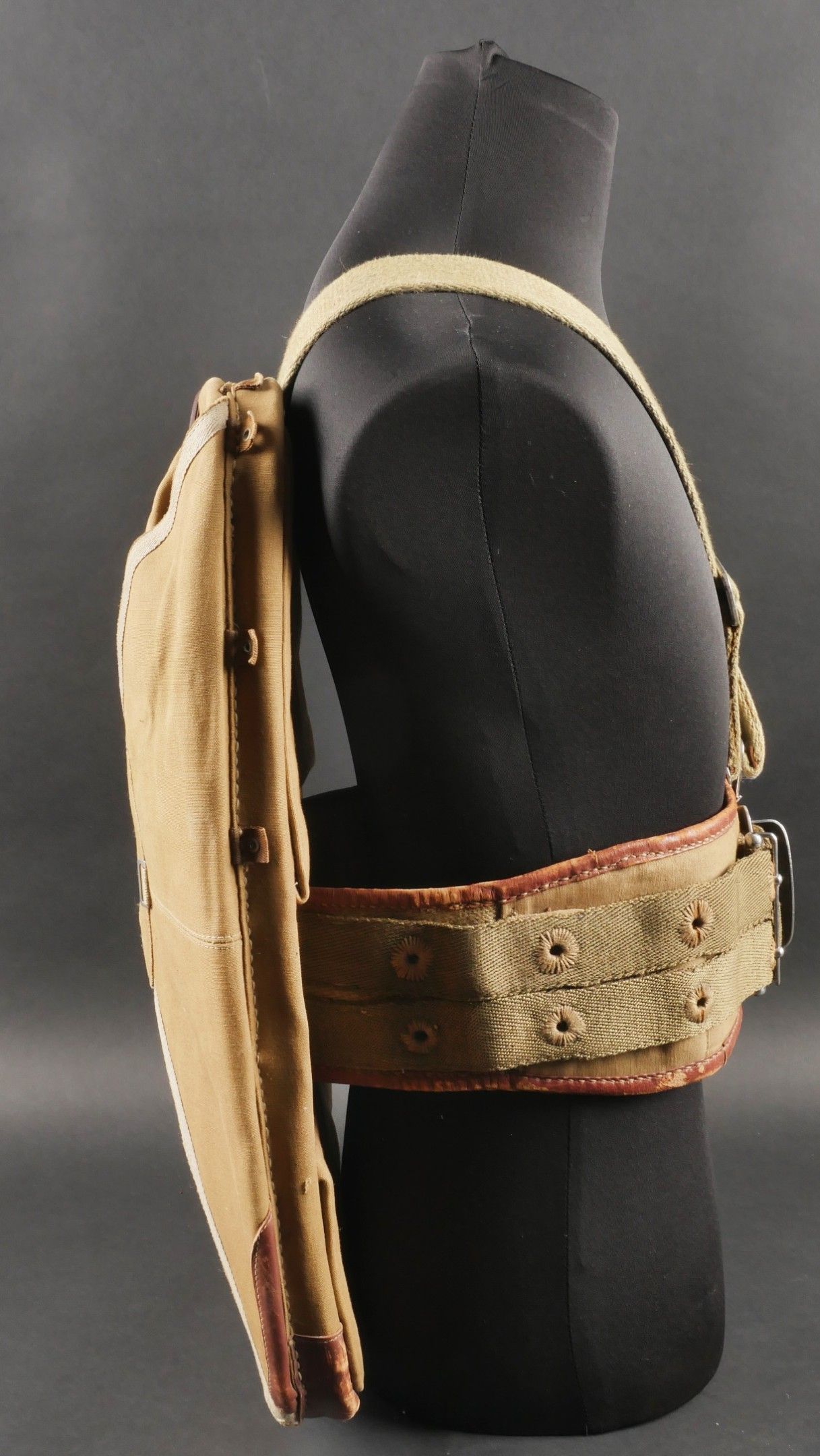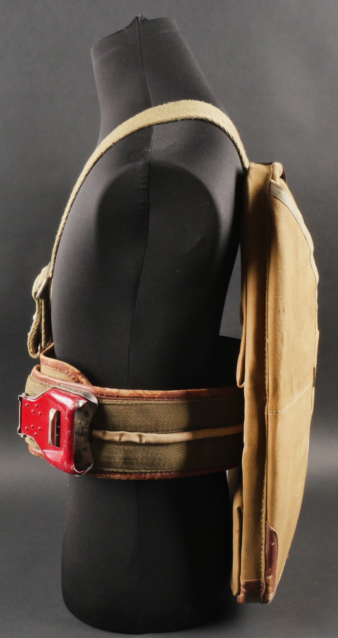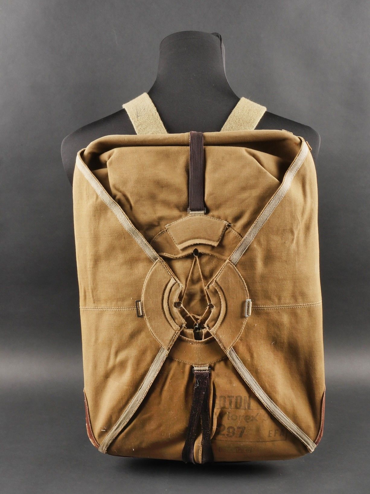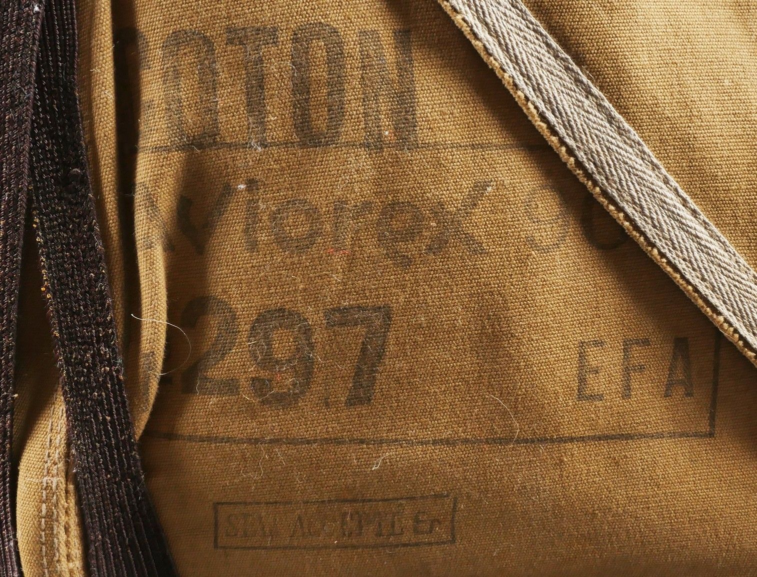 Aviorex 903 parachute. Light khaki canvas cover, for crew or pilot of slow moving aircraft. Belt present with small size stamp, marking Aviorex 903. On the back is the cotton marking Aviorex 903 followed by 297 EFA. Later modification of a parachute used in the French campaign. Aviorex 903 parachute. Light khaki canvas cover for slow aircraft crew or pilot waist belt present with small size stampings markings Aviorex 903 and cotton marking Aviorex 903 followed by 297 EFA later modified for use during the French campaign.