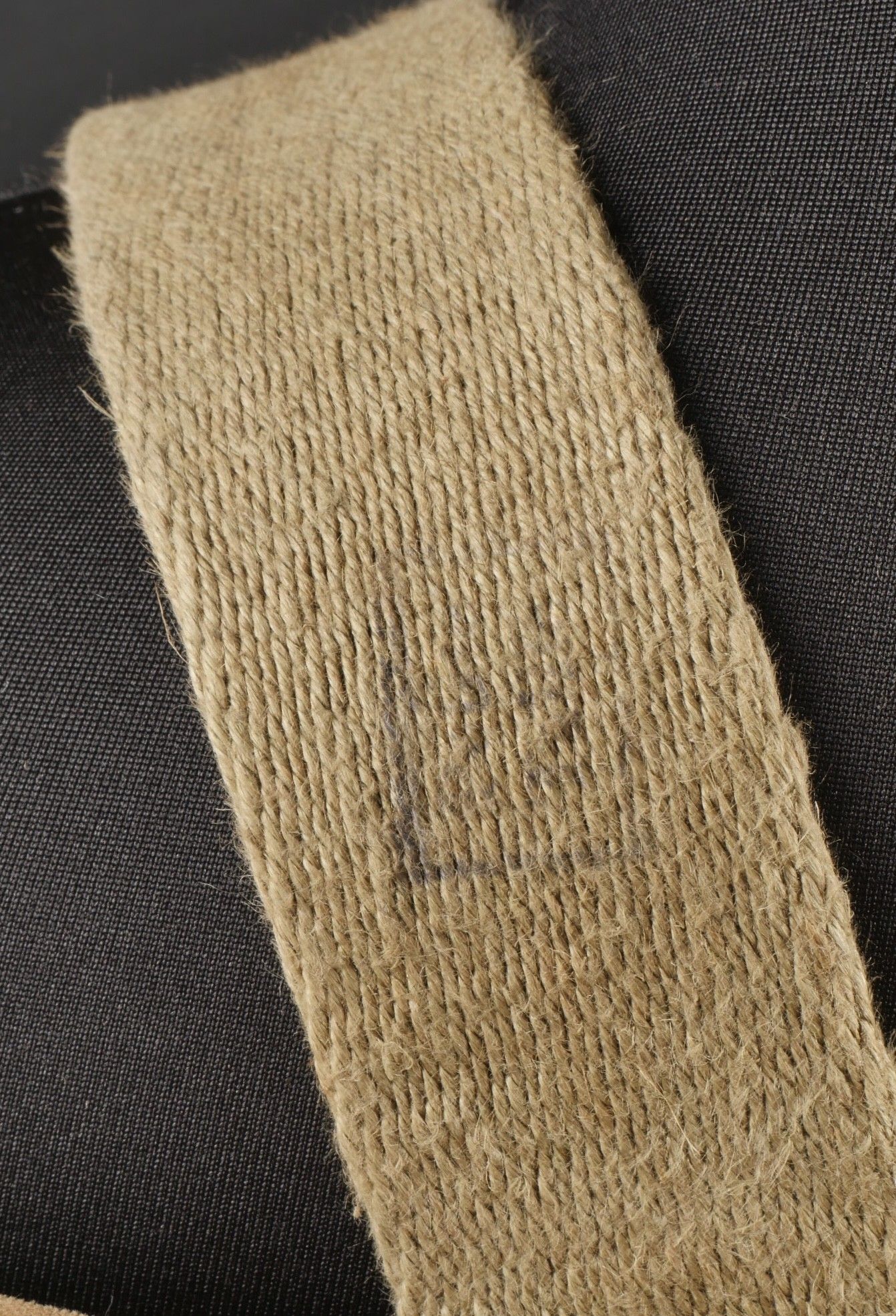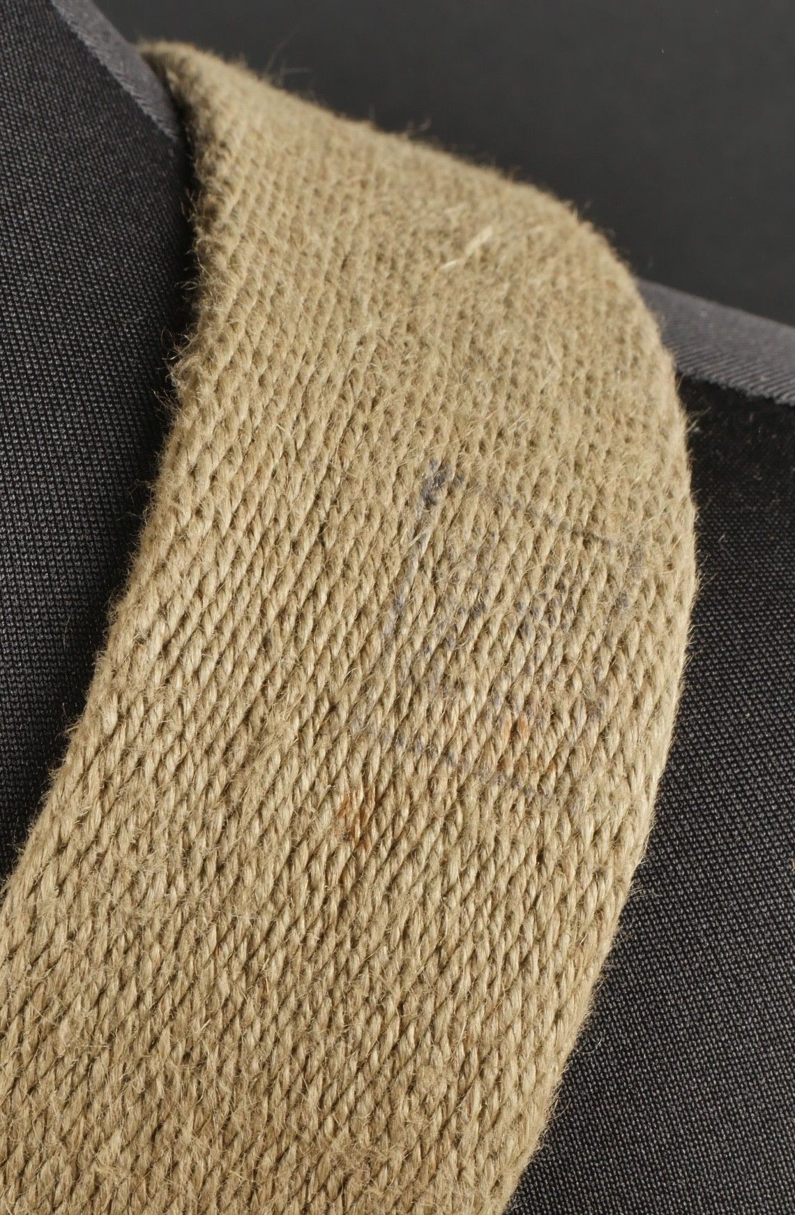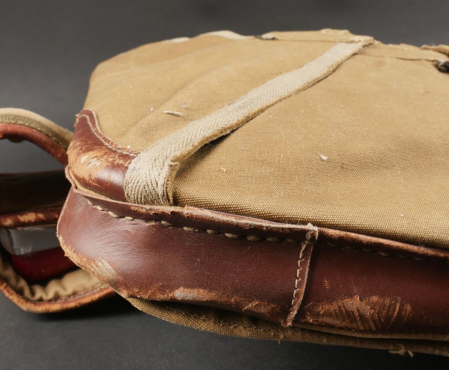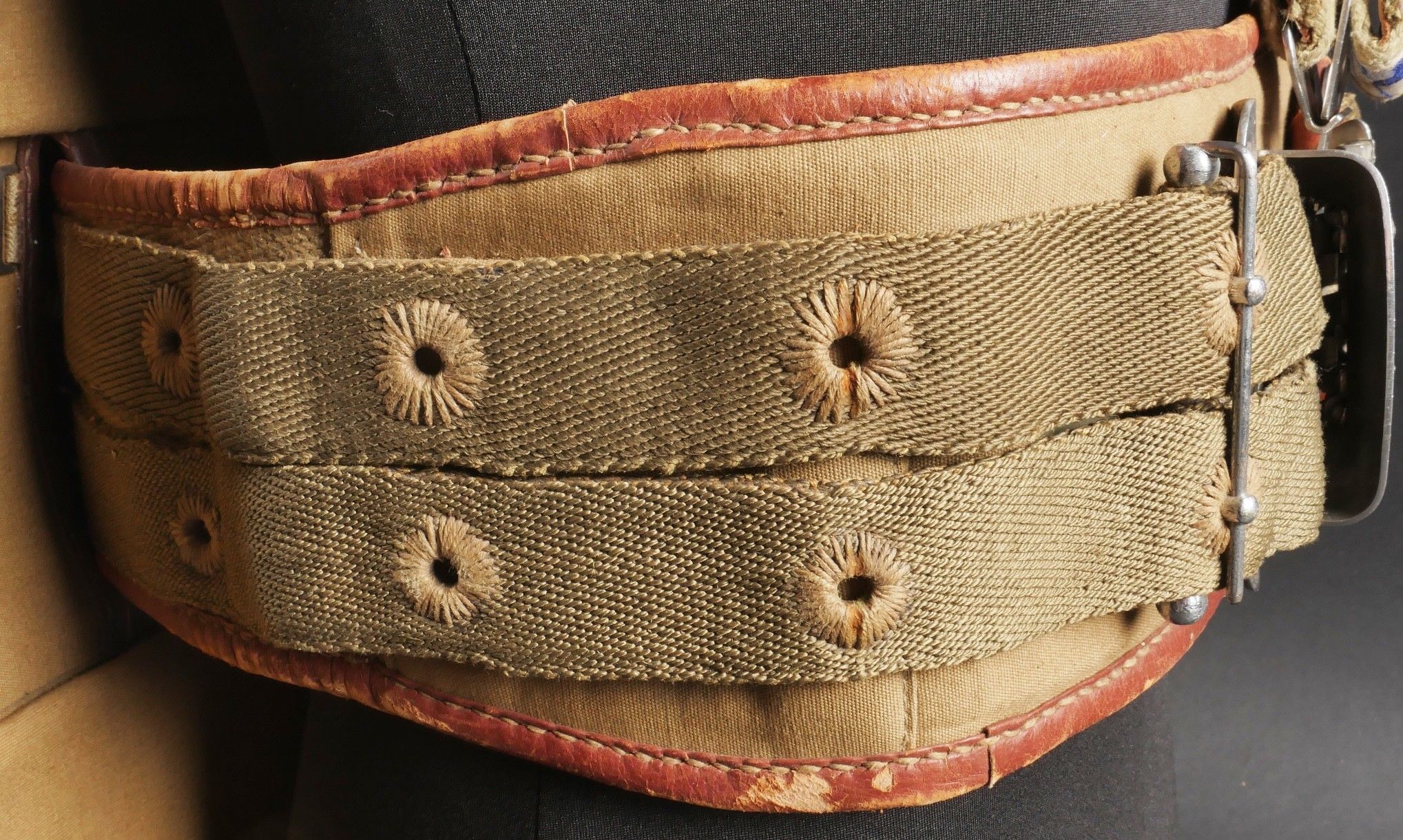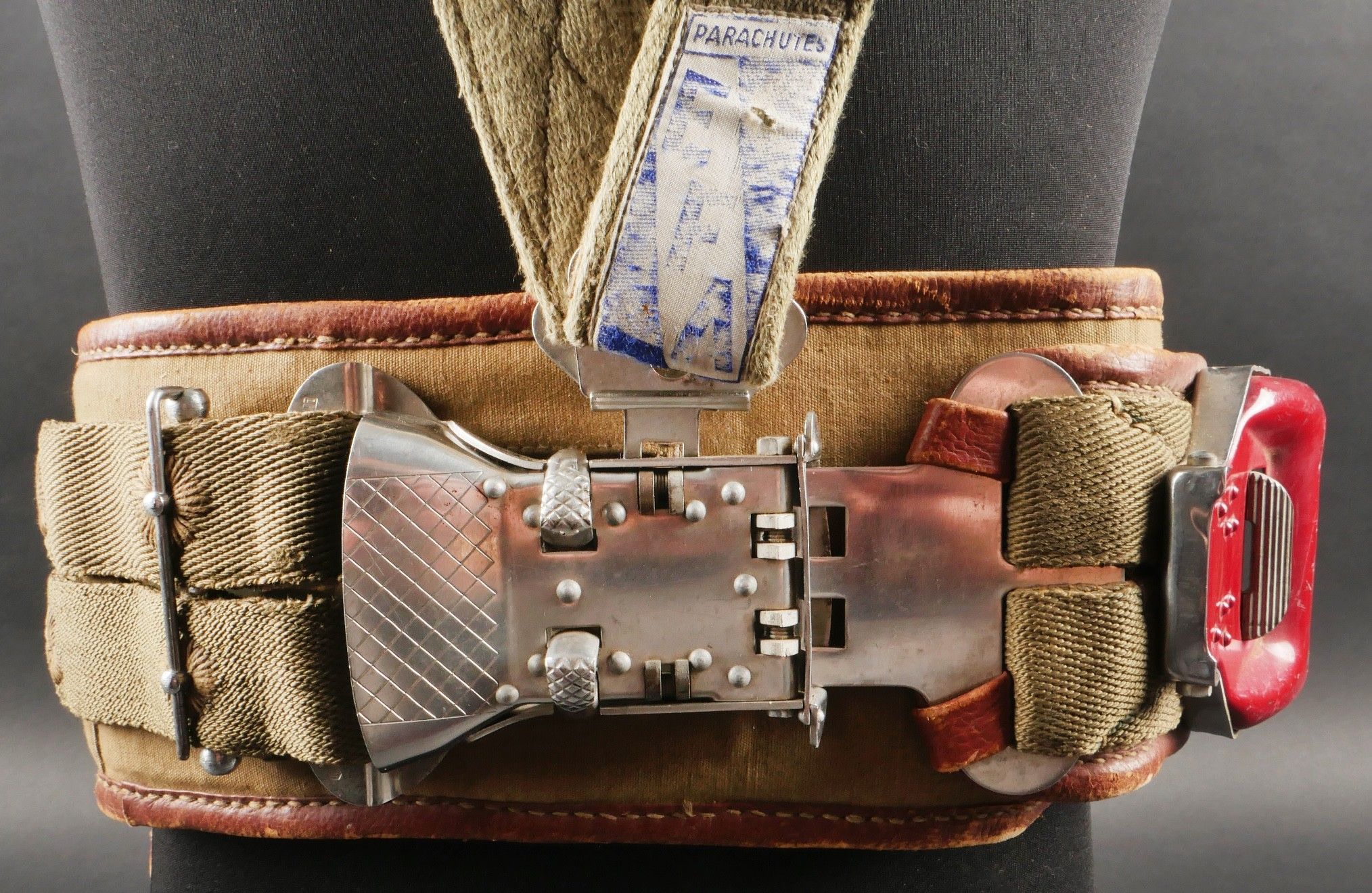 Aviorex 903 parachute. Light khaki canvas cover, for crew or pilot of slow moving aircraft. Belt present with small size stamp, marking Aviorex 903. On the back is the cotton marking Aviorex 903 followed by 297 EFA. Later modification of a parachute used in the French campaign. Aviorex 903 parachute. Light khaki canvas cover for slow aircraft crew or pilot waist belt present with small size stampings markings Aviorex 903 and cotton marking Aviorex 903 followed by 297 EFA later modified for use during the French campaign.