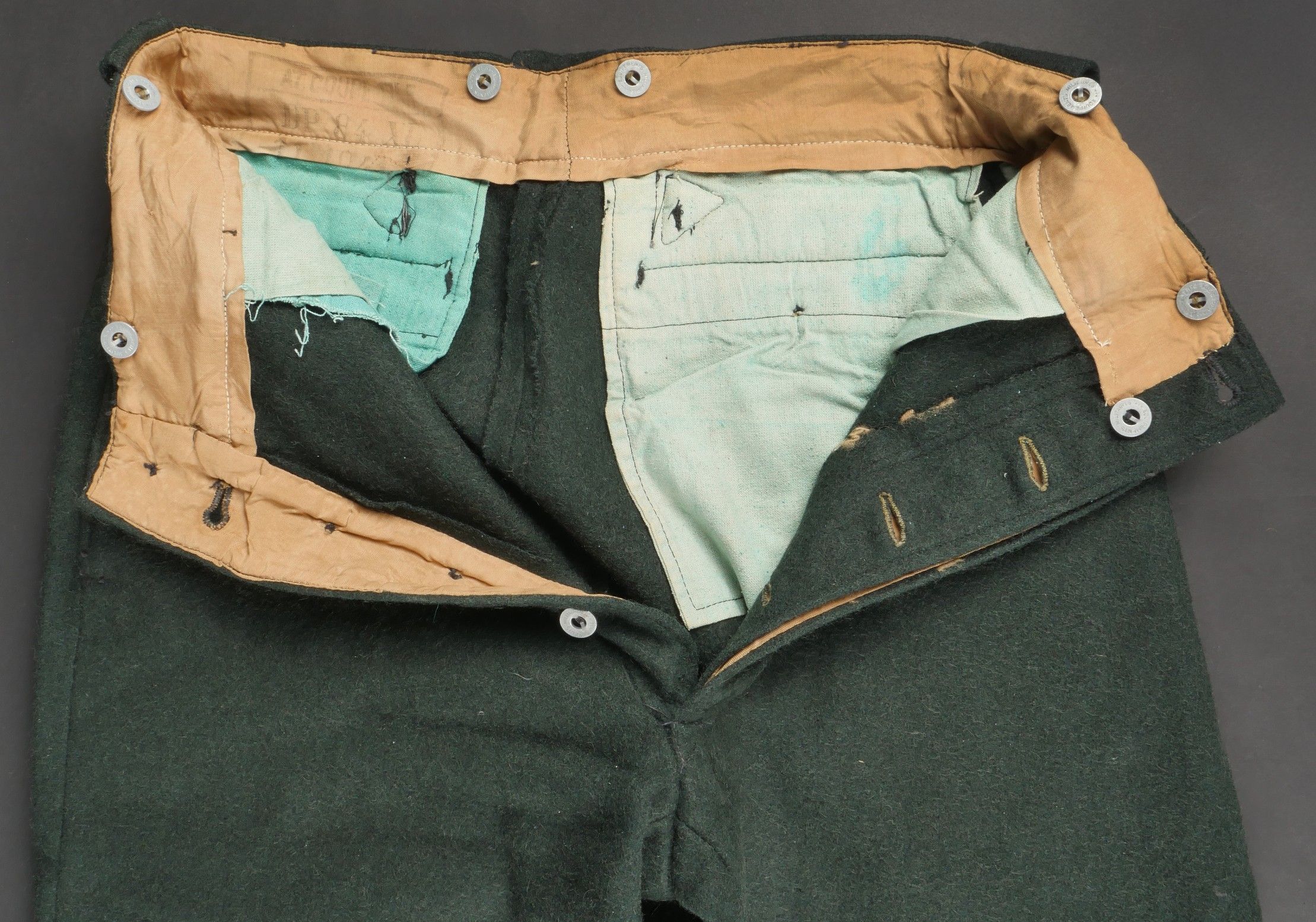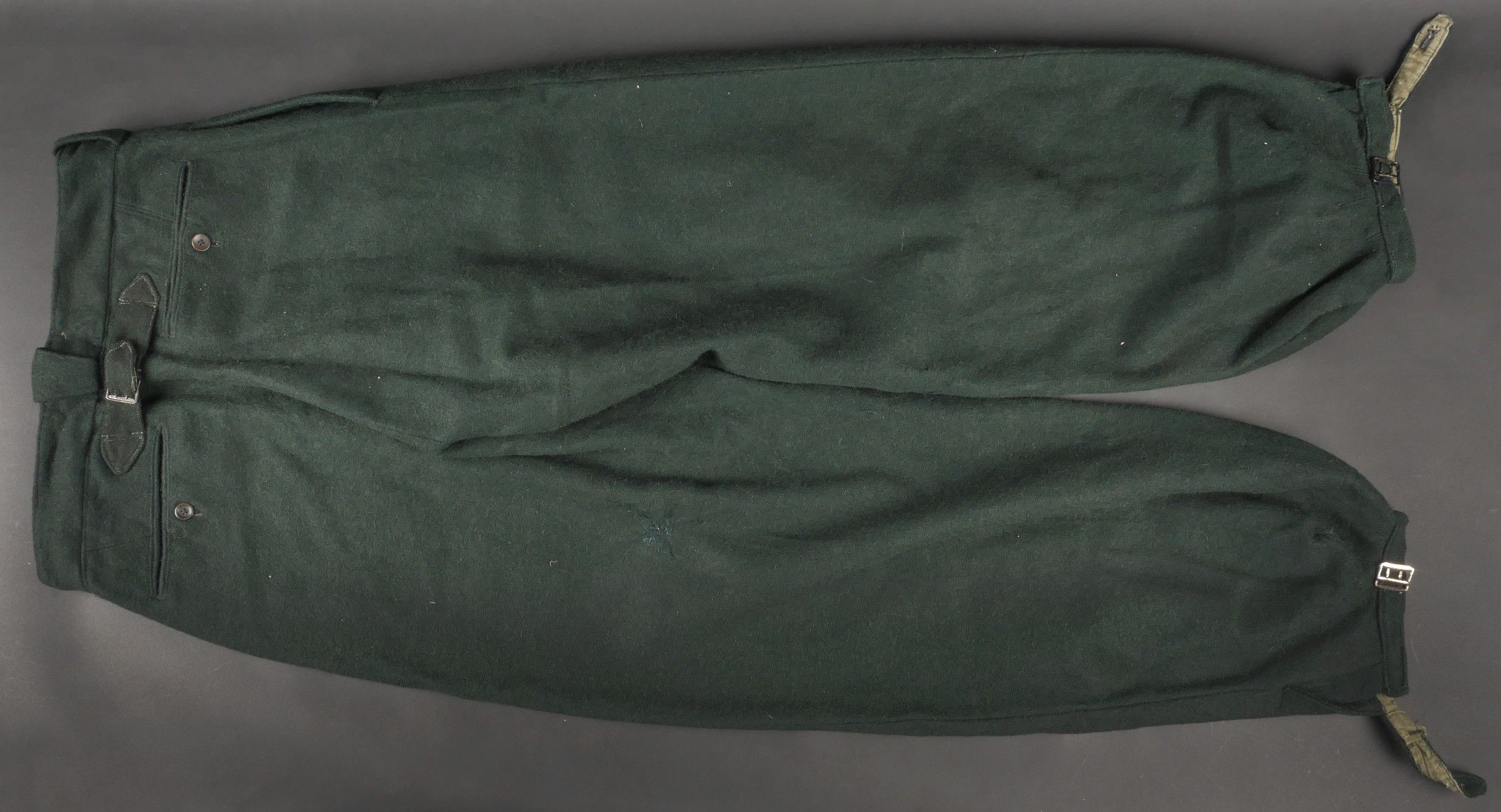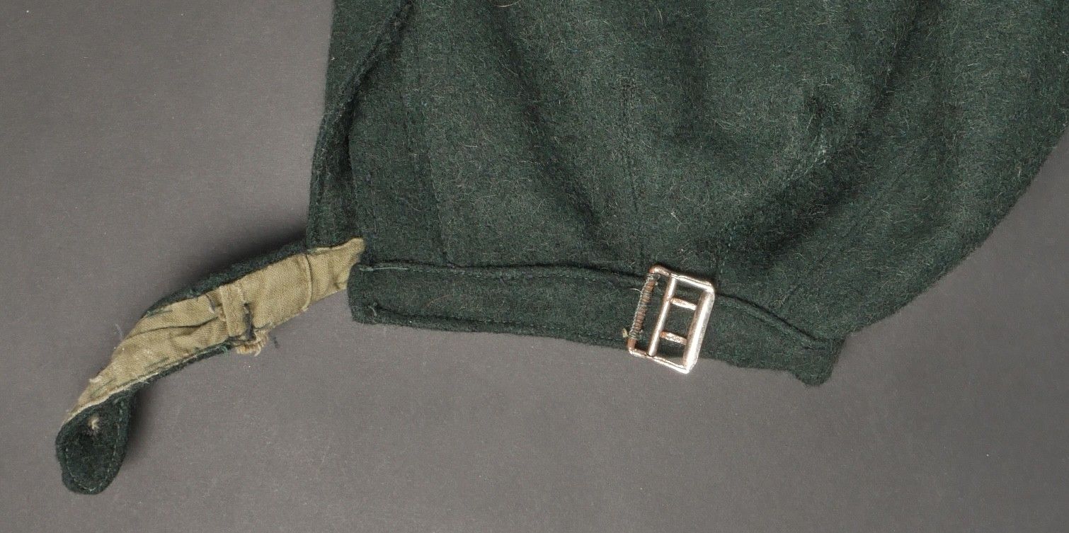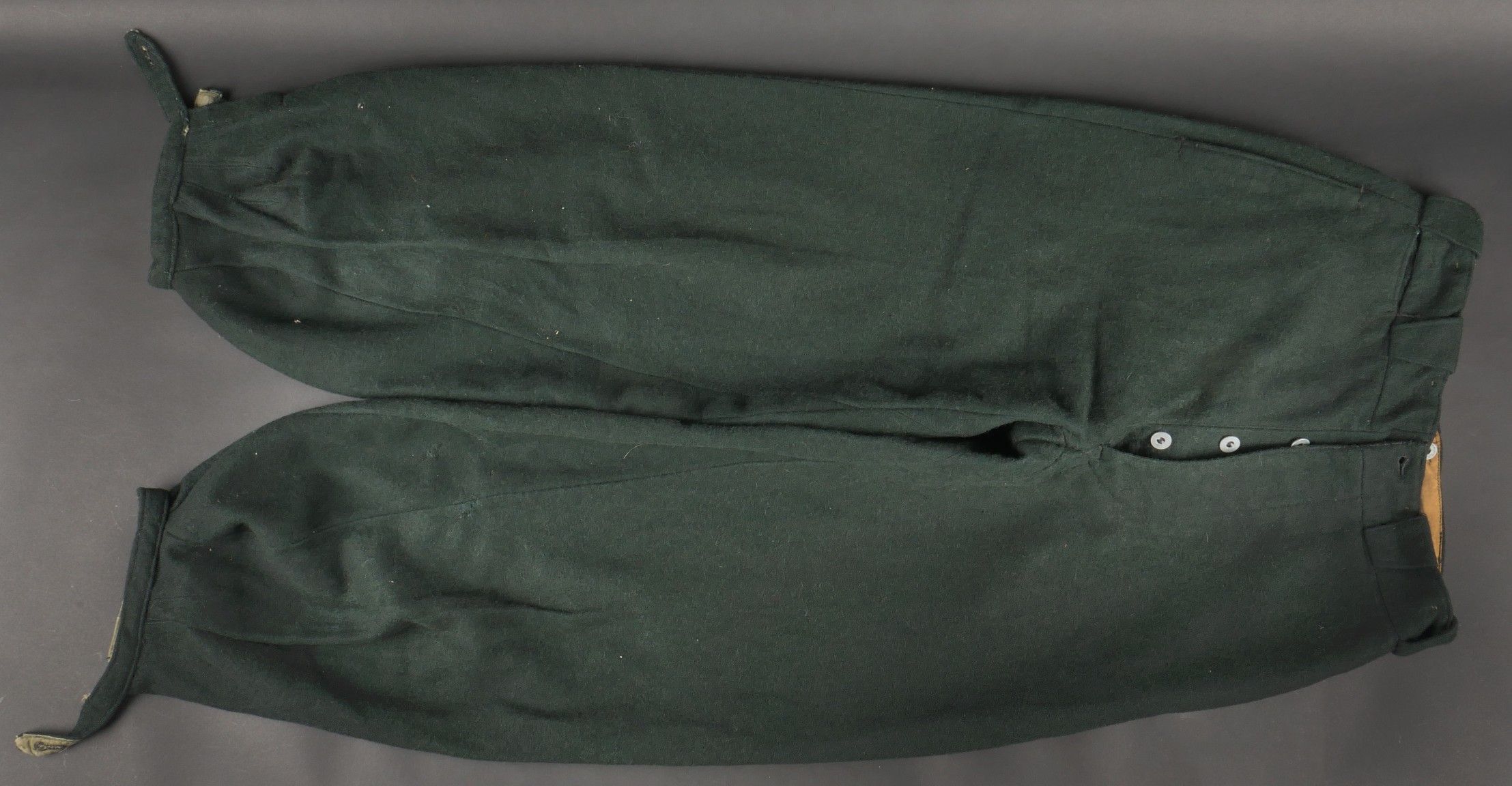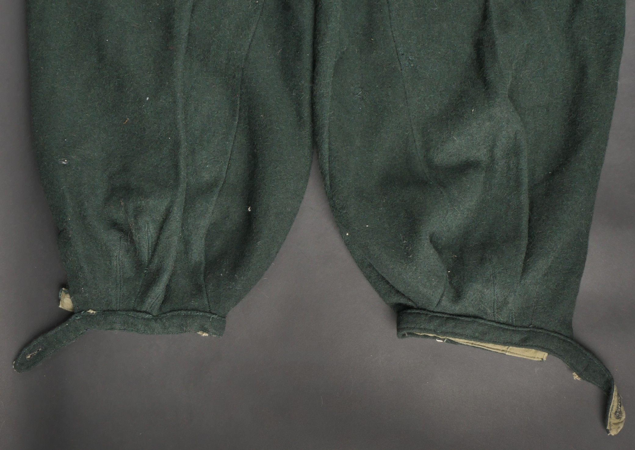 Chantiers de Jeunesse trousers. Youth trousers in forest green cloth, drawstring at the bottom of each leg, trapeze loops. Armistice rayon and cotton lining, martingale present, small repair to back of left leg, date illegible on lining. Young member's trousers in forestgreen wool tightening tabs at each leg trapezoid belt loops armisticetype rayon and cotton lining martingale present small repair to the back of the left leg illegible date on lining.