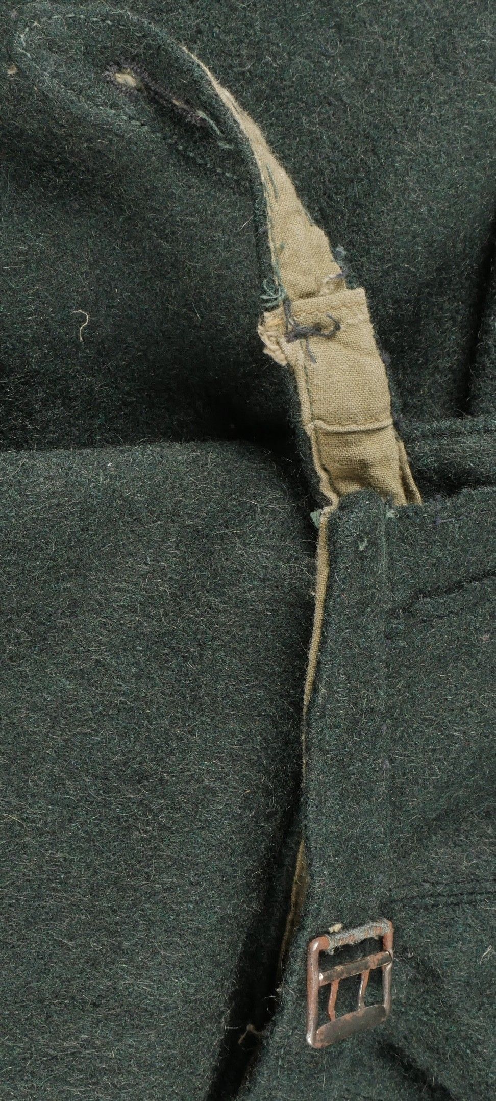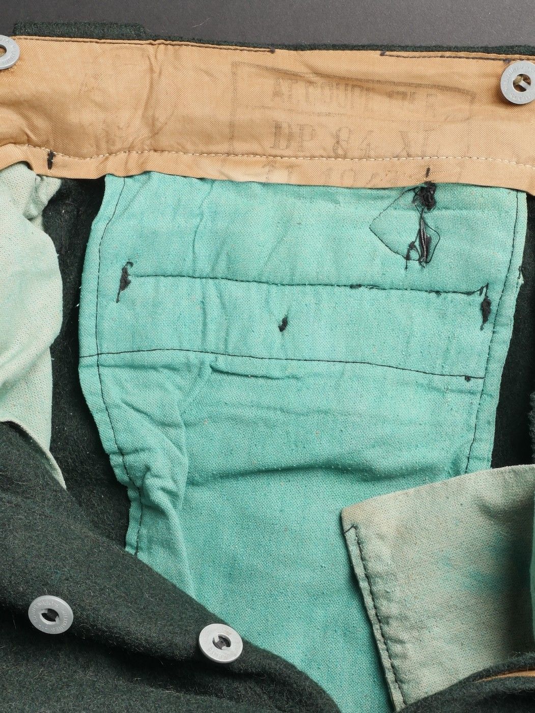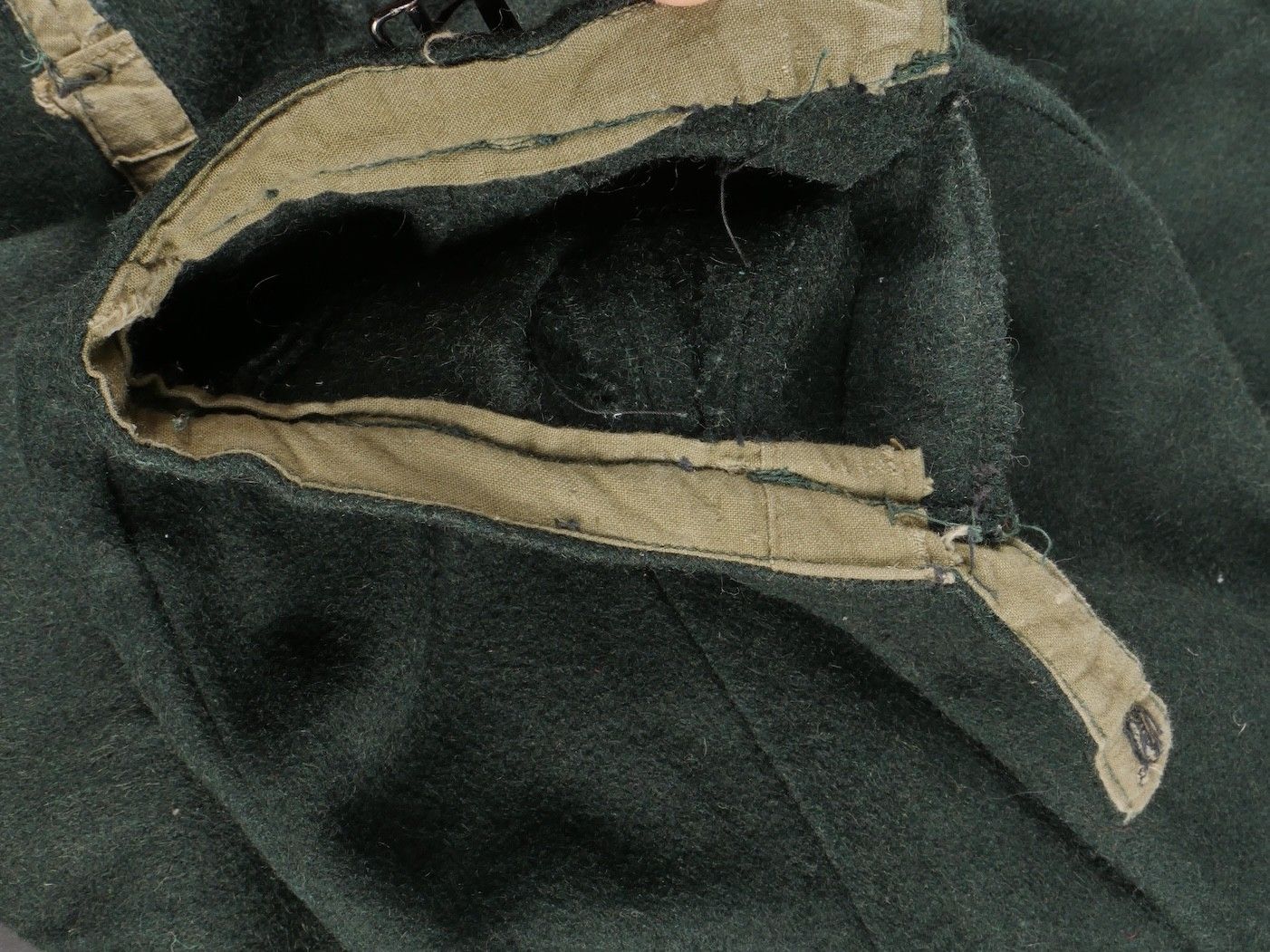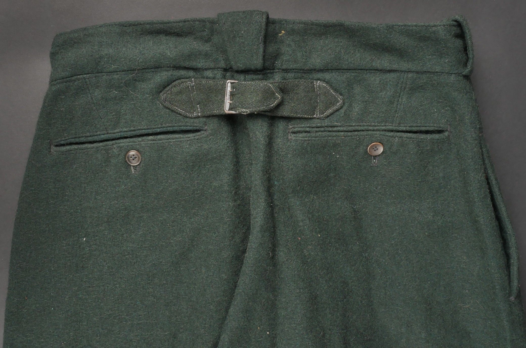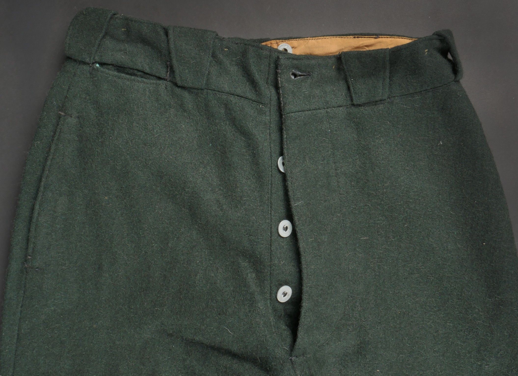 Chantiers de Jeunesse trousers. Youth trousers in forest green cloth, drawstring at the bottom of each leg, trapeze loops. Armistice rayon and cotton lining, martingale present, small repair to back of left leg, date illegible on lining. Young member's trousers in forestgreen wool tightening tabs at each leg trapezoid belt loops armisticetype rayon and cotton lining martingale present small repair to the back of the left leg illegible date on lining.