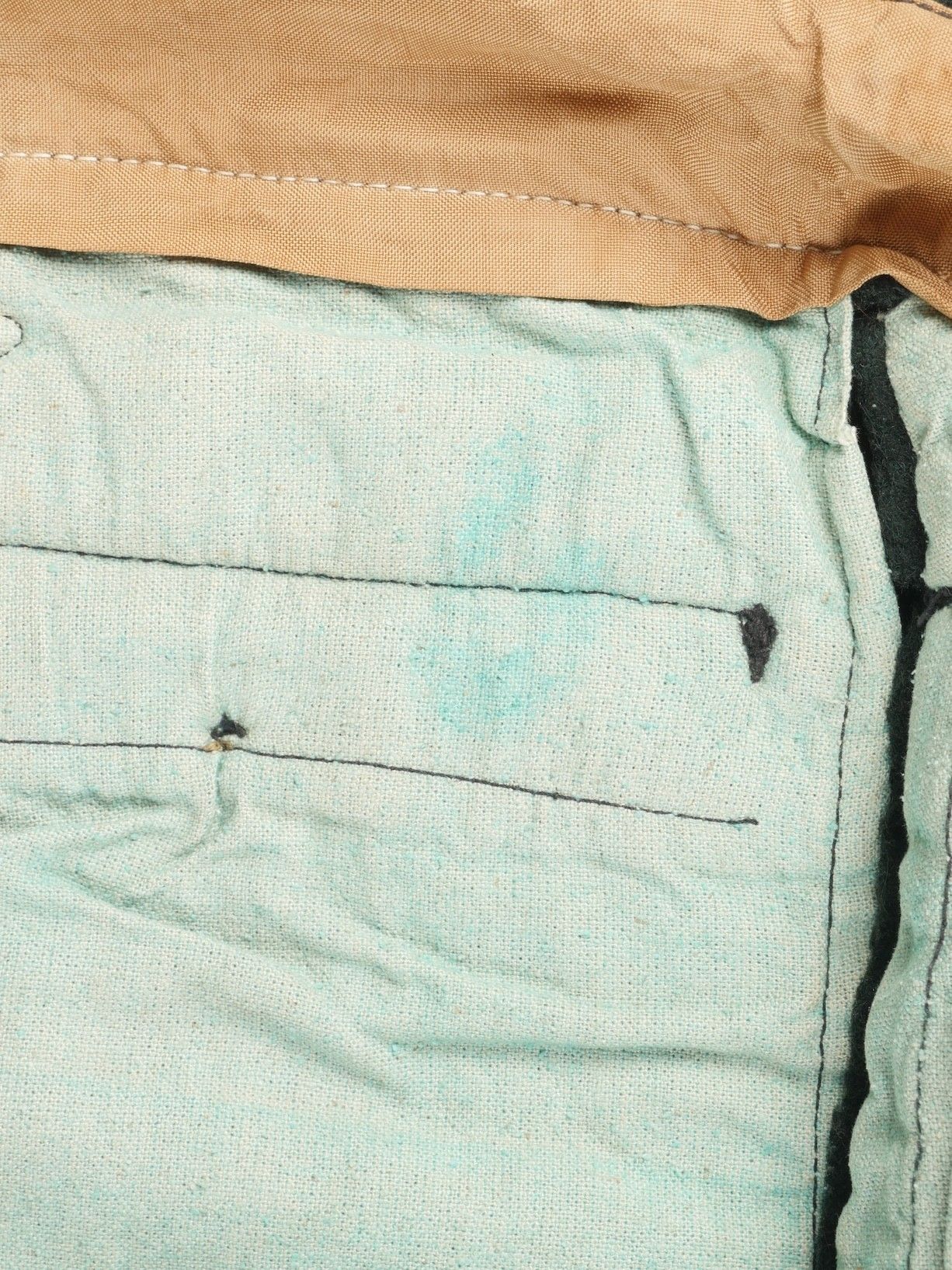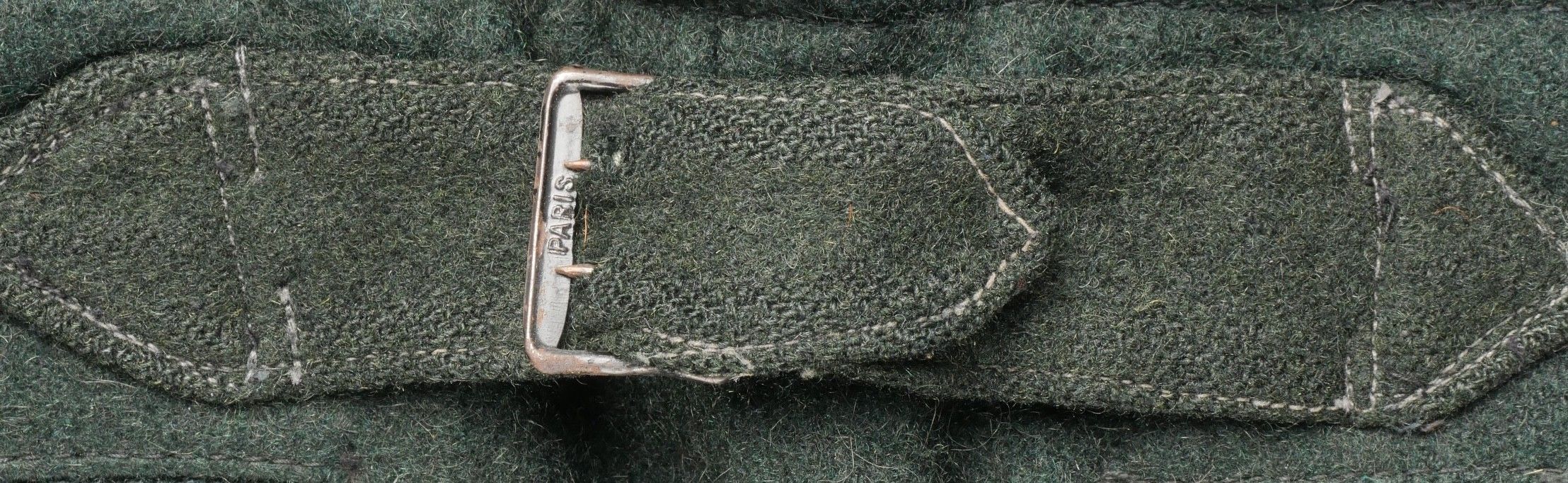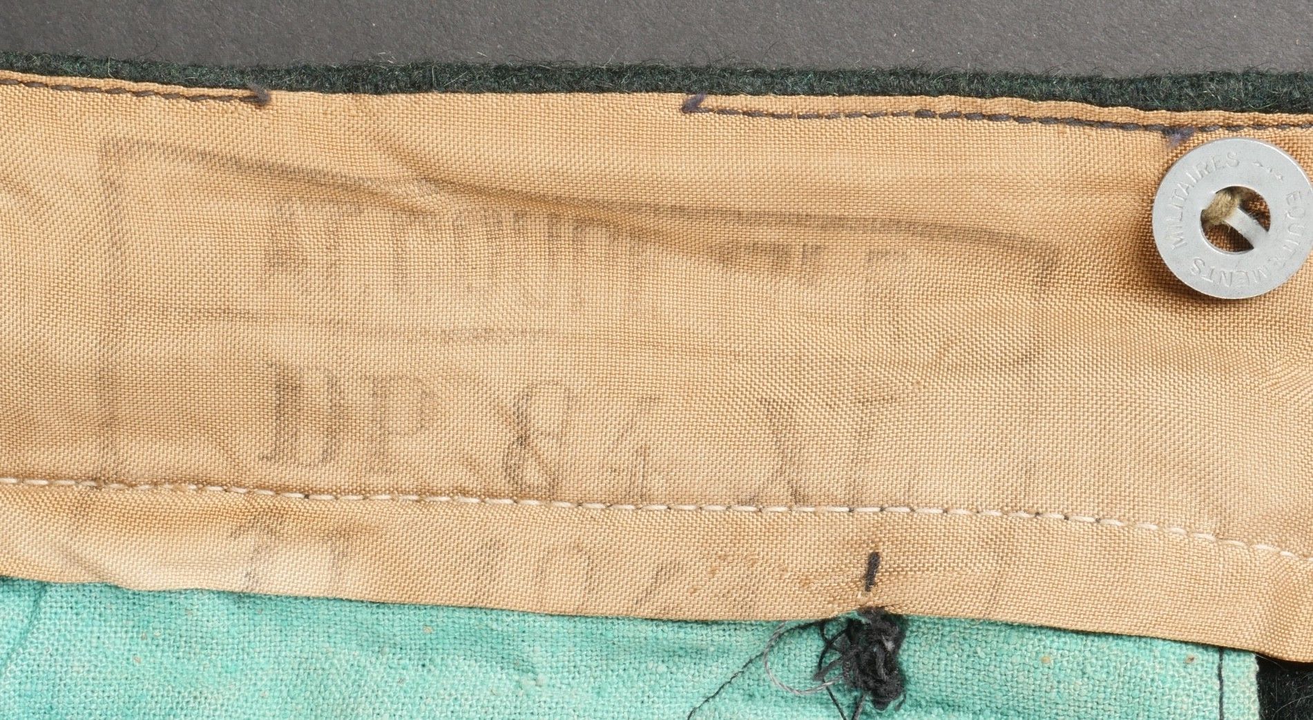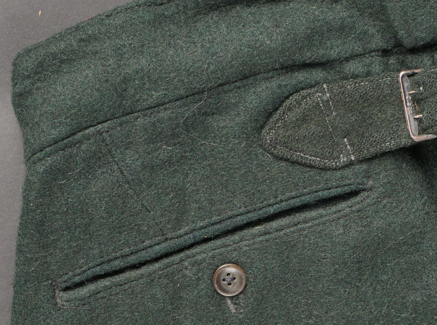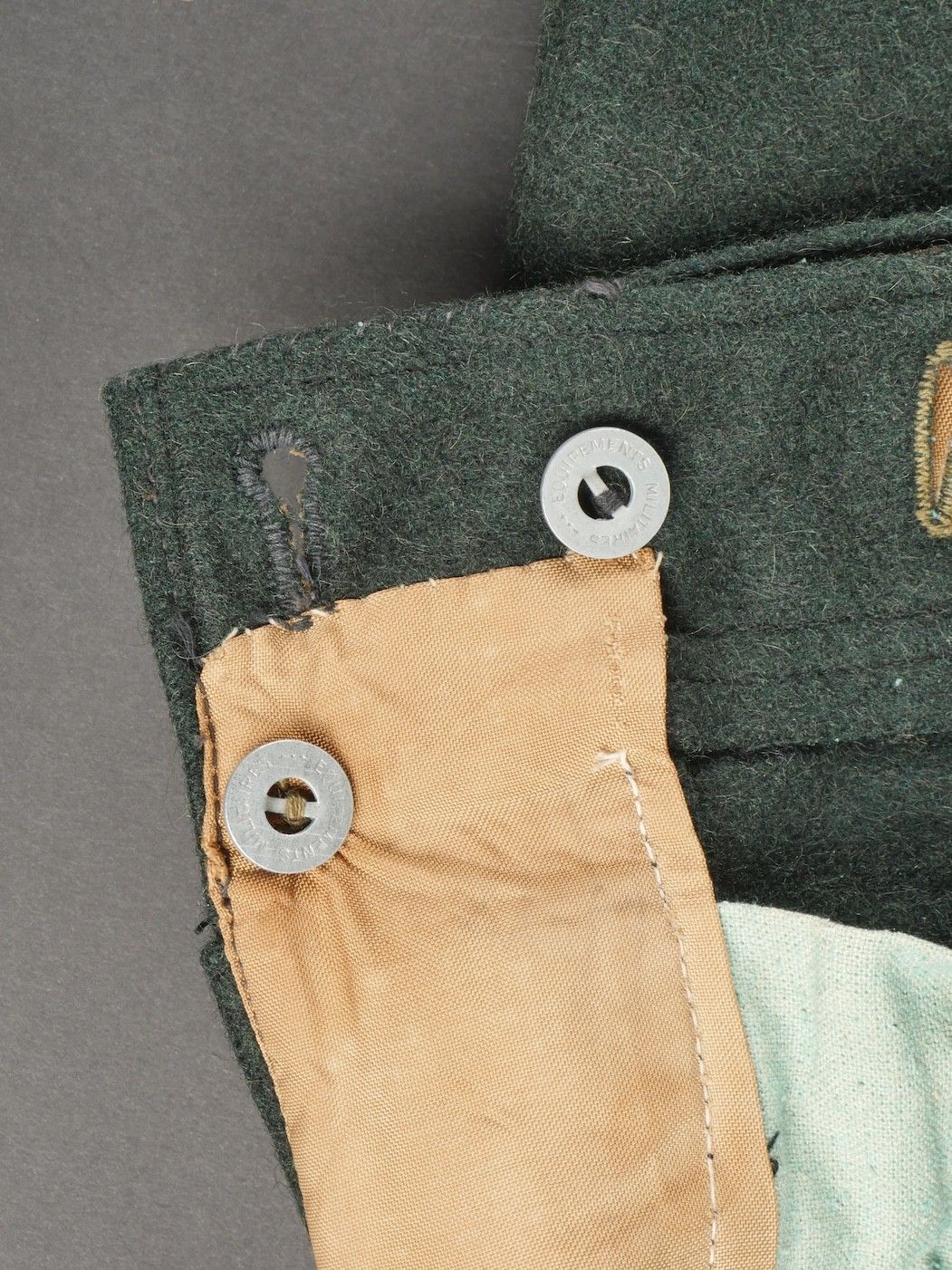 Chantiers de Jeunesse trousers. Youth trousers in forest green cloth, drawstring at the bottom of each leg, trapeze loops. Armistice rayon and cotton lining, martingale present, small repair to back of left leg, date illegible on lining. Young member's trousers in forestgreen wool tightening tabs at each leg trapezoid belt loops armisticetype rayon and cotton lining martingale present small repair to the back of the left leg illegible date on lining.