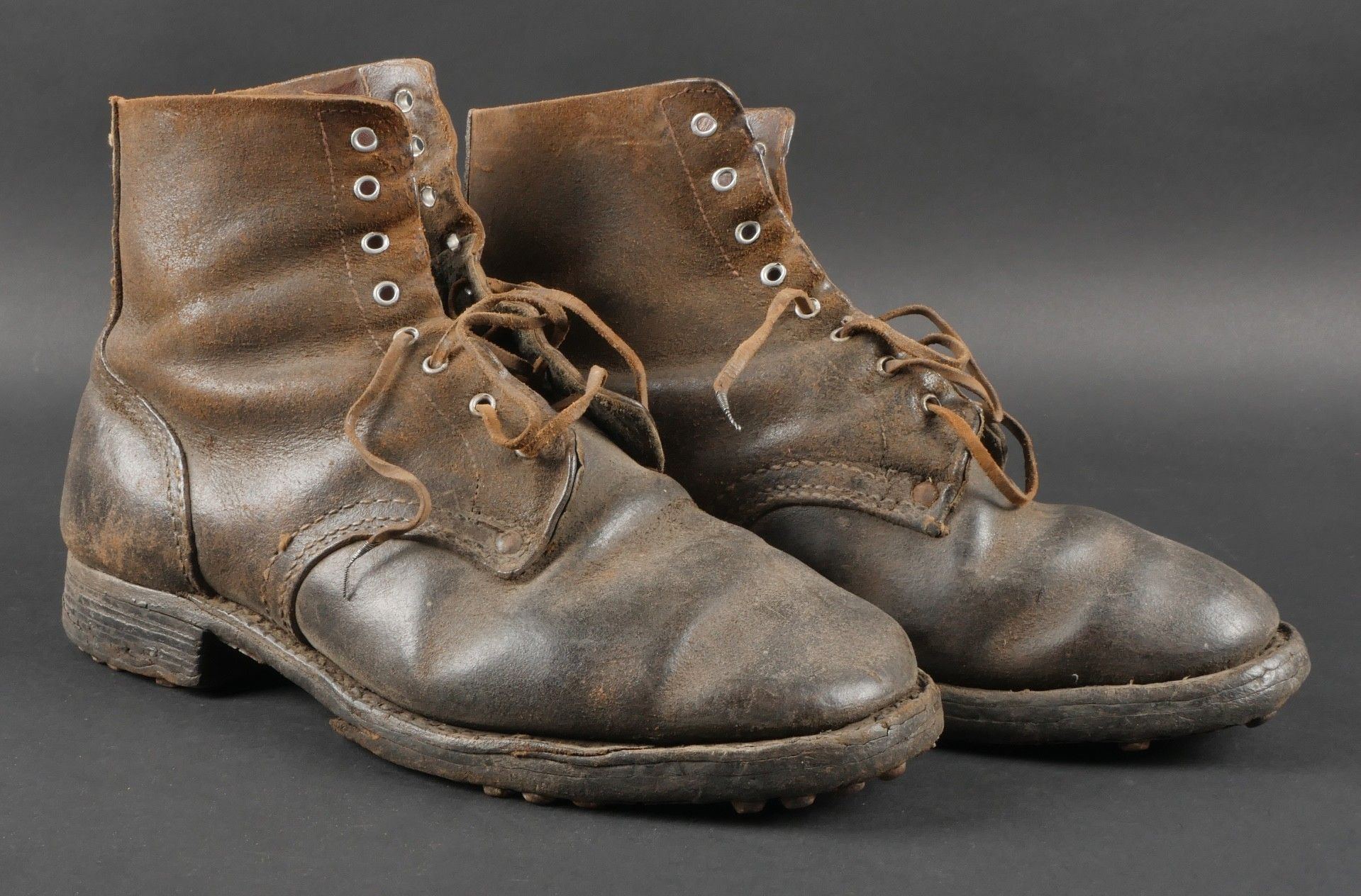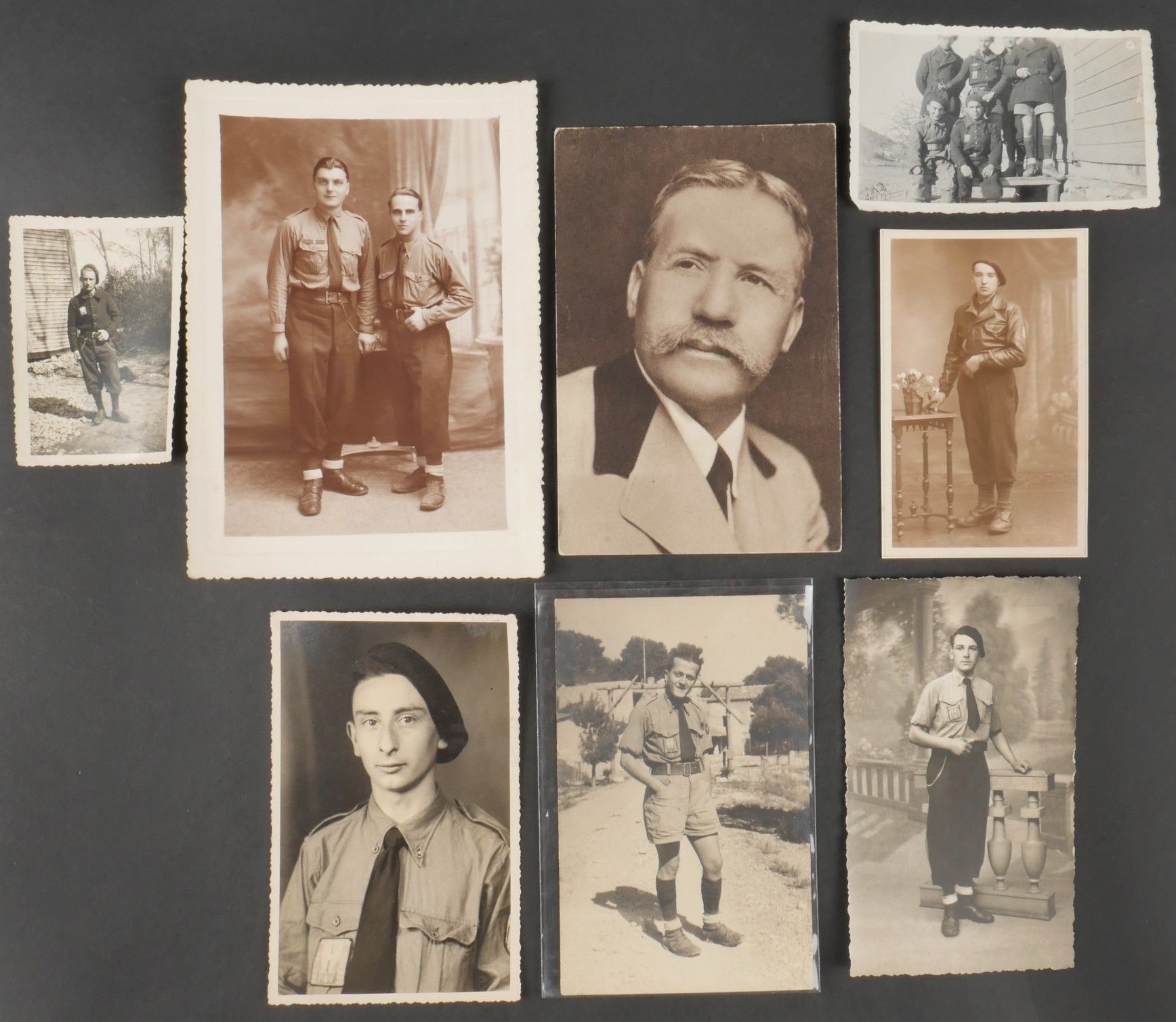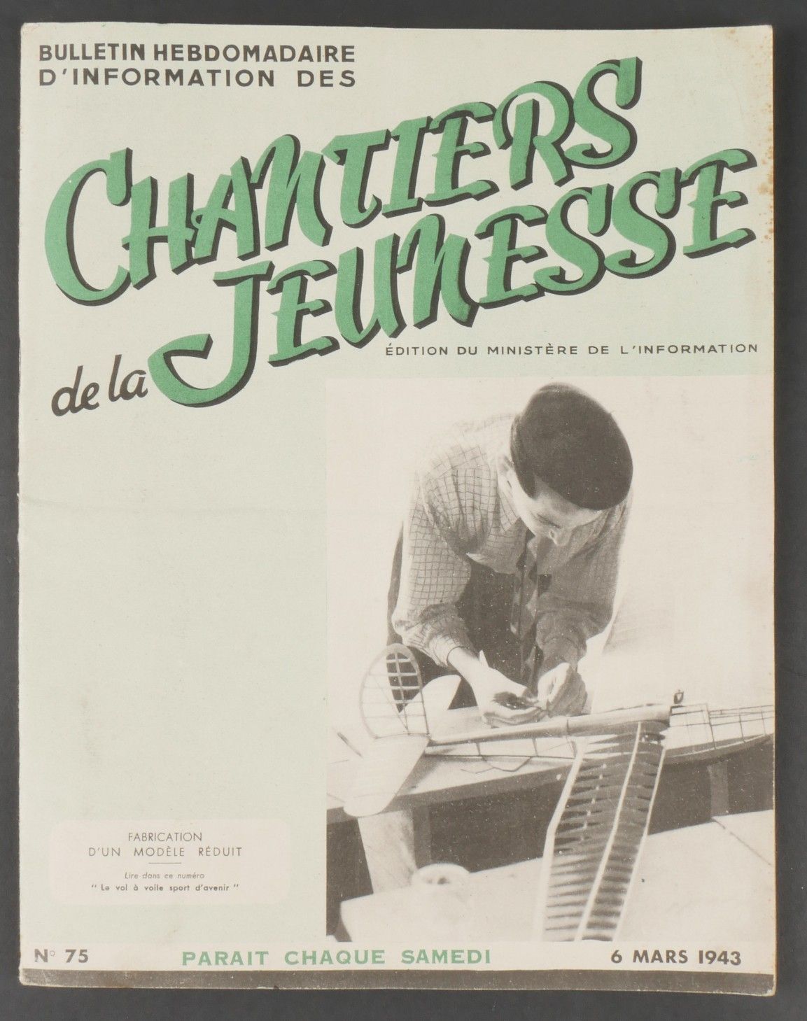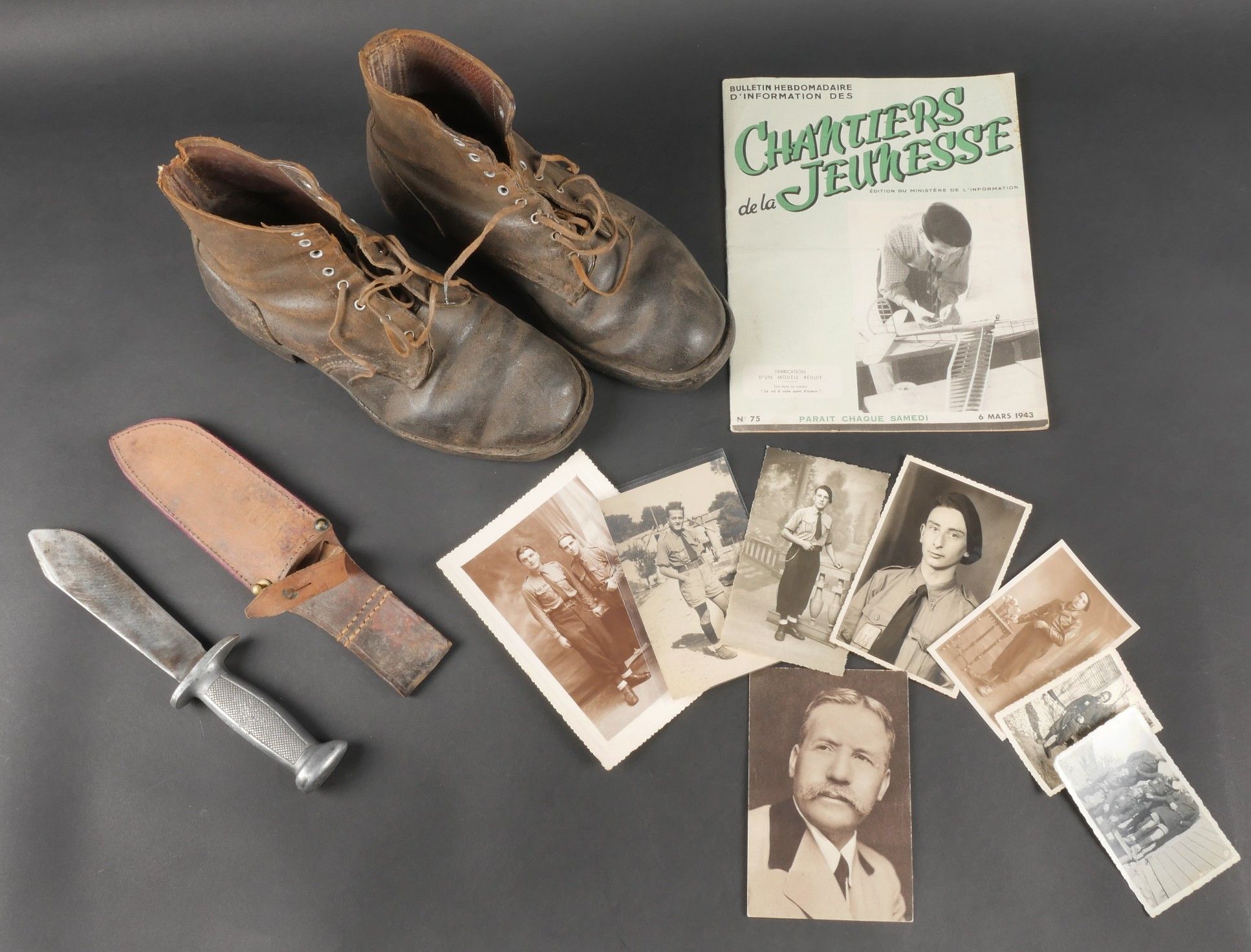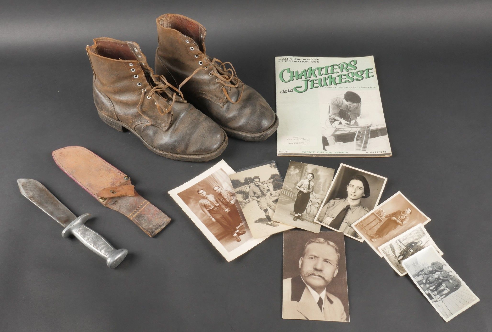 Chantiers de Jeunesse equipment. Comprising a pair of brown leather brodequins model 1941, size 41, aluminium eyelets, some damaged, some nails missing. Attached is a Sabatier Jeune youth knife, blade sharpened, regulation tan leather scabbard with clamp, dated 1942. A set of photos and postcards. A weekly bulletin des chantiers number 75. Youth Work equipment. Including a pair of 1941 model brown leather boots size 41 with aluminium eyelets some damaged and a few missing nails a Sabatier Jeune youth knife sharpened with its regulation fawn leather scabbard and strap dated 1942 a set of photos and postcards and a weekly Youth Work bulletin number 75.