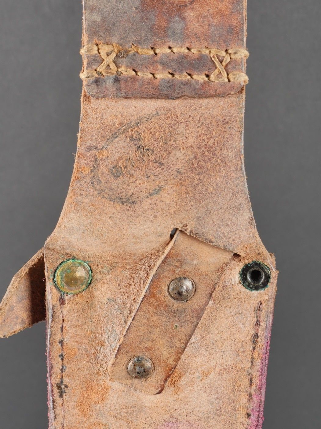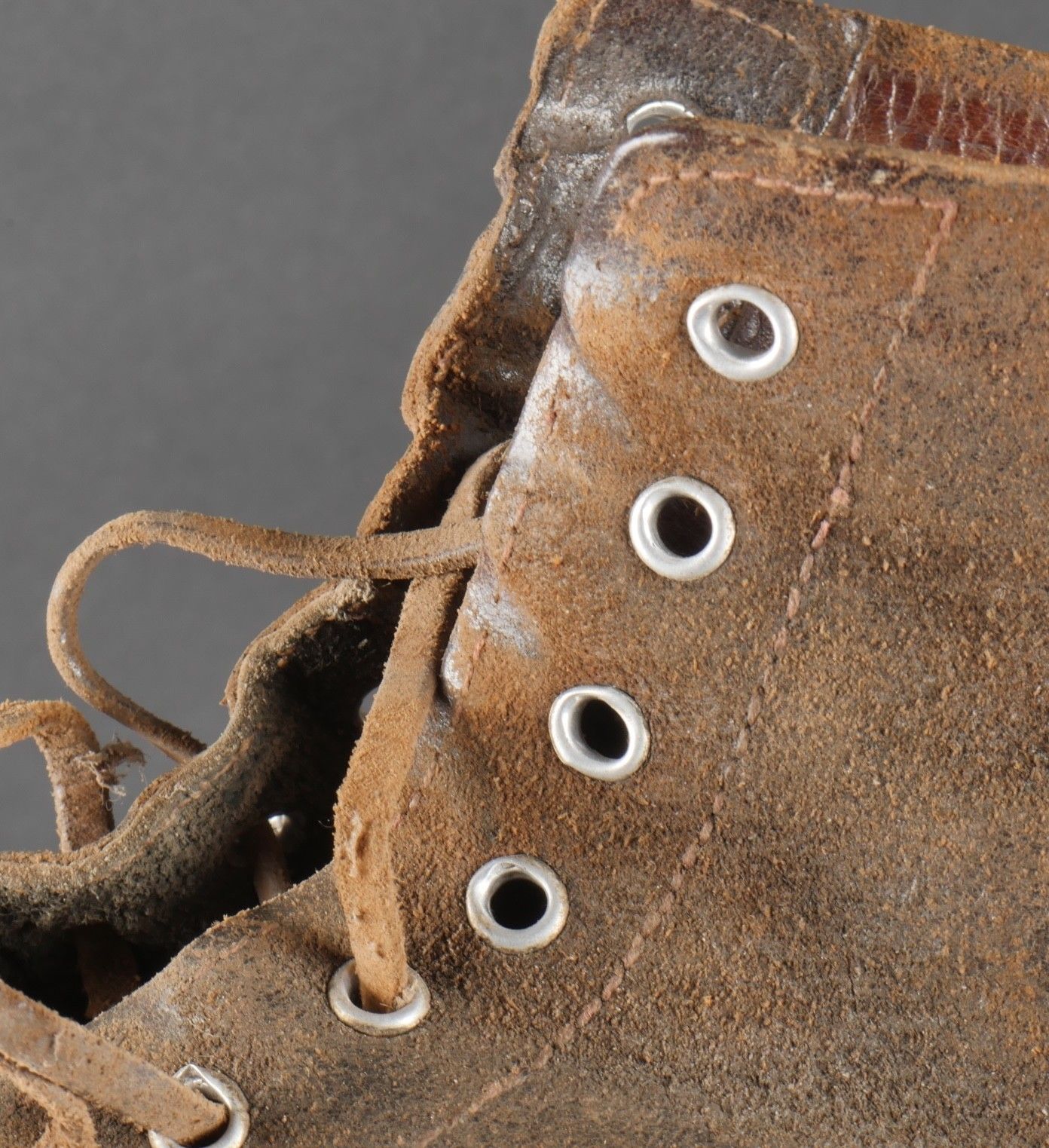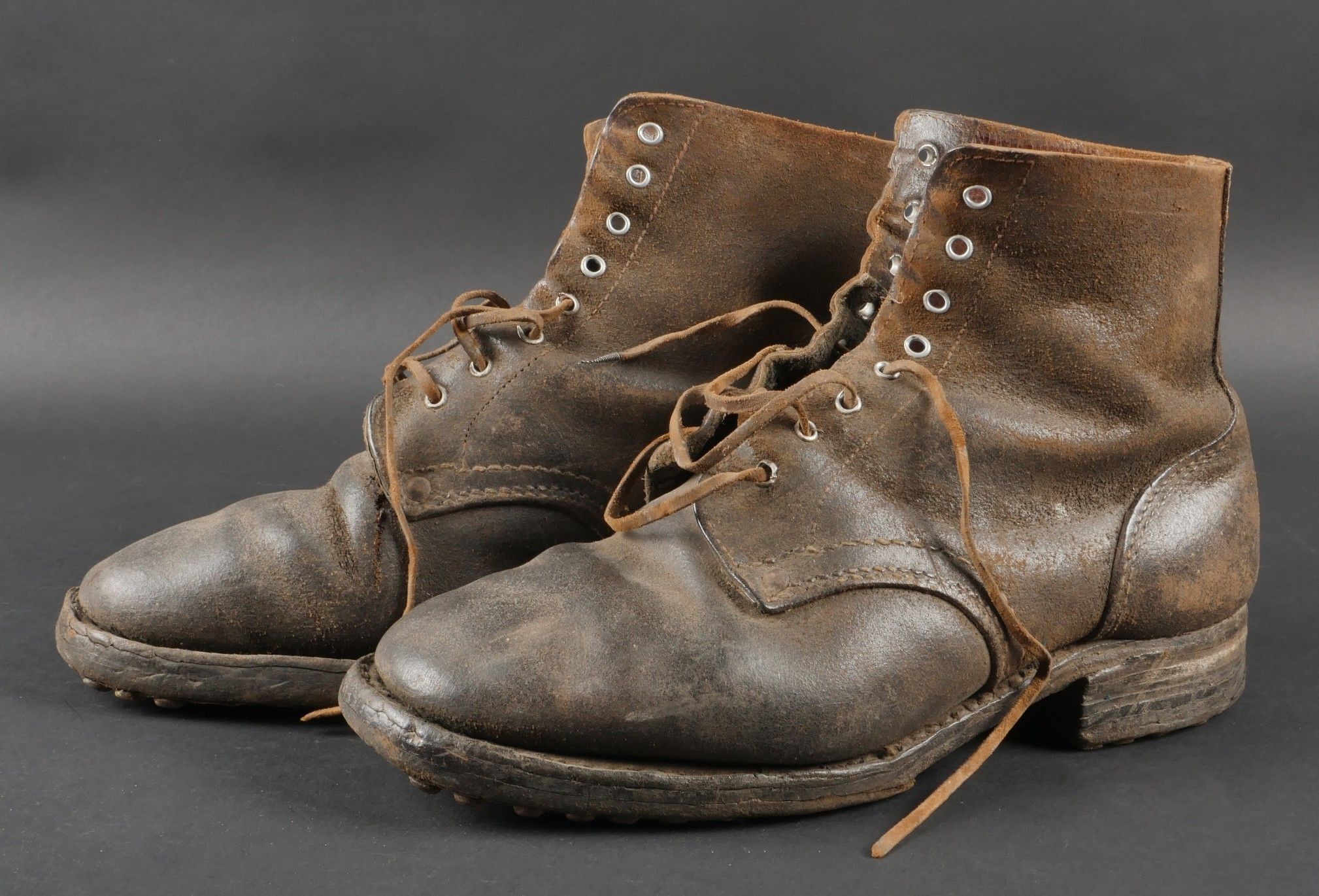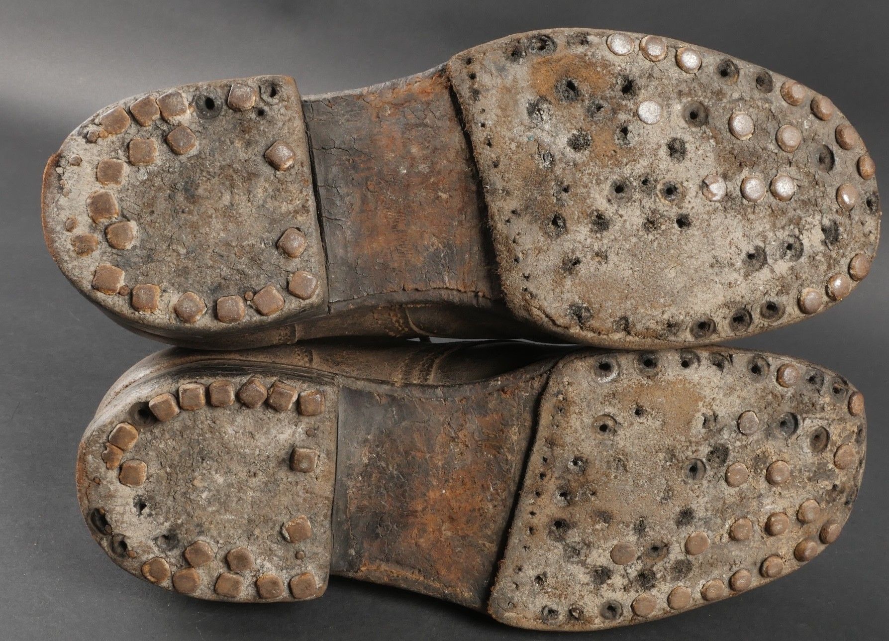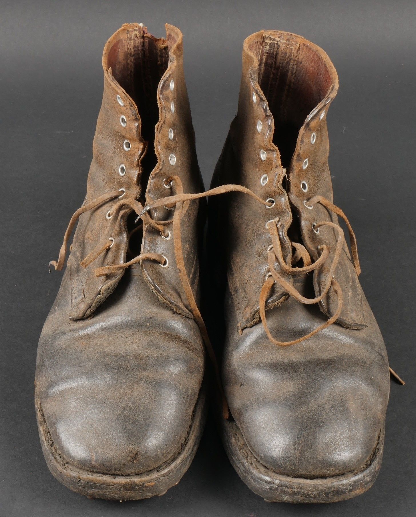 Chantiers de Jeunesse equipment. Comprising a pair of brown leather brodequins model 1941, size 41, aluminium eyelets, some damaged, some nails missing. Attached is a Sabatier Jeune youth knife, blade sharpened, regulation tan leather scabbard with clamp, dated 1942. A set of photos and postcards. A weekly bulletin des chantiers number 75. Youth Work equipment. Including a pair of 1941 model brown leather boots size 41 with aluminium eyelets some damaged and a few missing nails a Sabatier Jeune youth knife sharpened with its regulation fawn leather scabbard and strap dated 1942 a set of photos and postcards and a weekly Youth Work bulletin number 75.