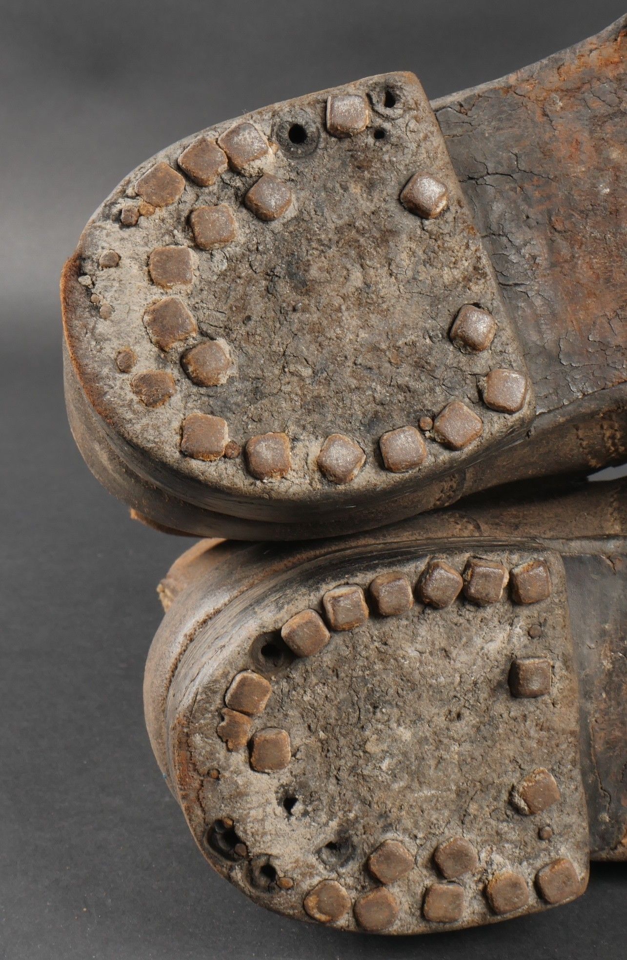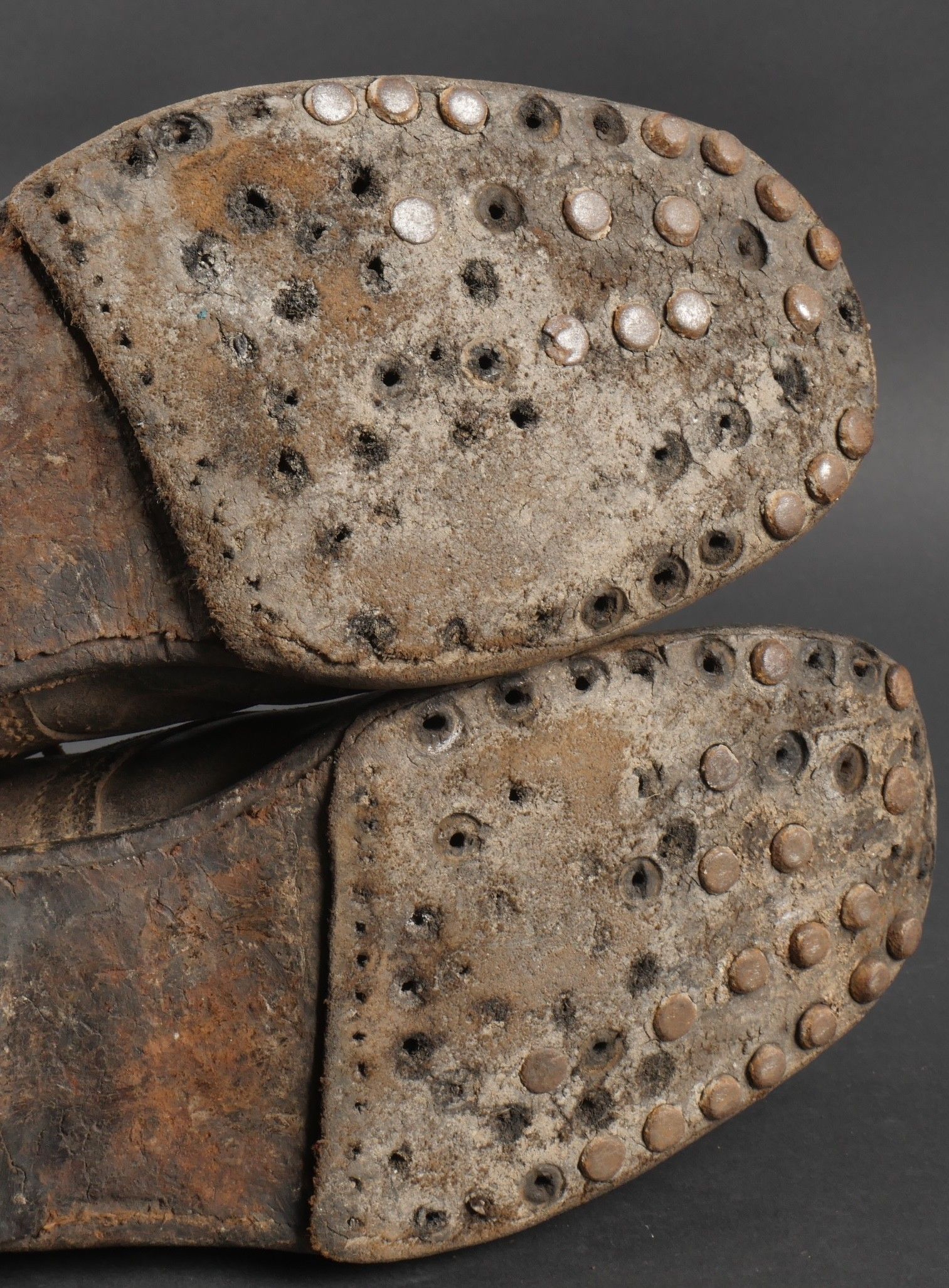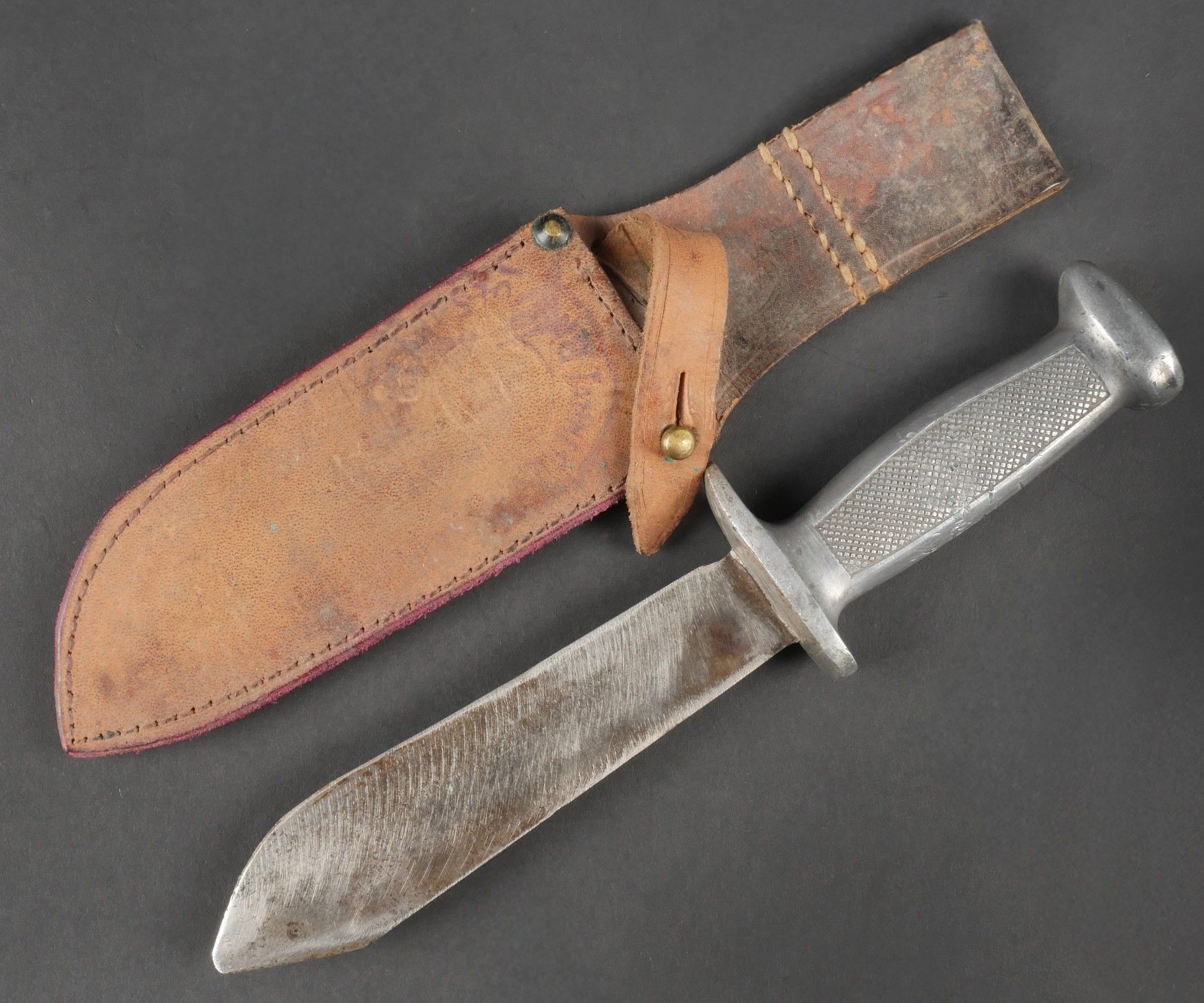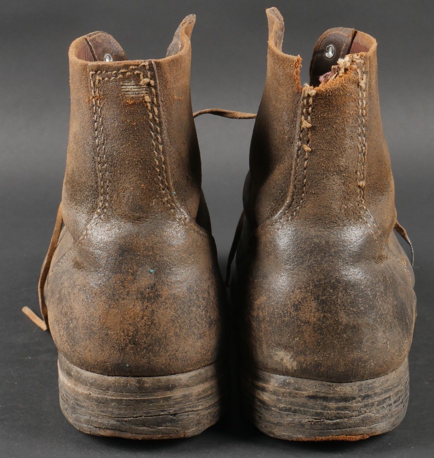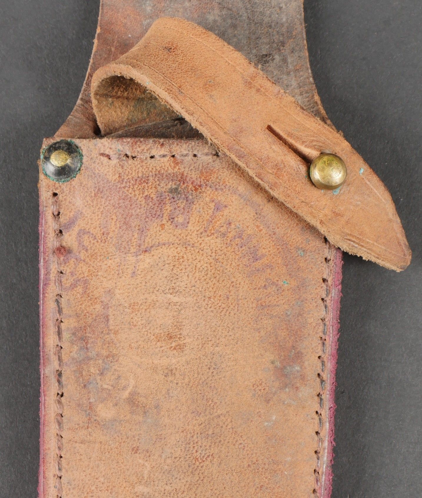 Chantiers de Jeunesse equipment. Comprising a pair of brown leather brodequins model 1941, size 41, aluminium eyelets, some damaged, some nails missing. Attached is a Sabatier Jeune youth knife, blade sharpened, regulation tan leather scabbard with clamp, dated 1942. A set of photos and postcards. A weekly bulletin des chantiers number 75. Youth Work equipment. Including a pair of 1941 model brown leather boots size 41 with aluminium eyelets some damaged and a few missing nails a Sabatier Jeune youth knife sharpened with its regulation fawn leather scabbard and strap dated 1942 a set of photos and postcards and a weekly Youth Work bulletin number 75.