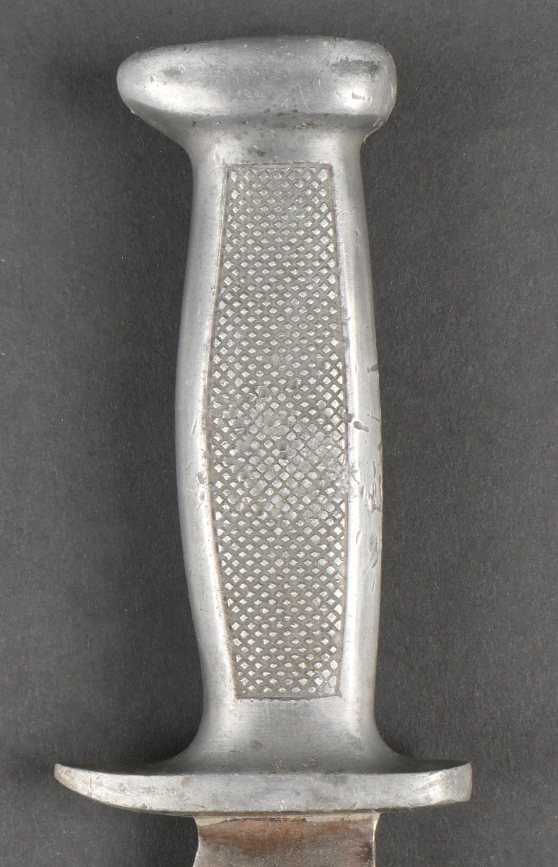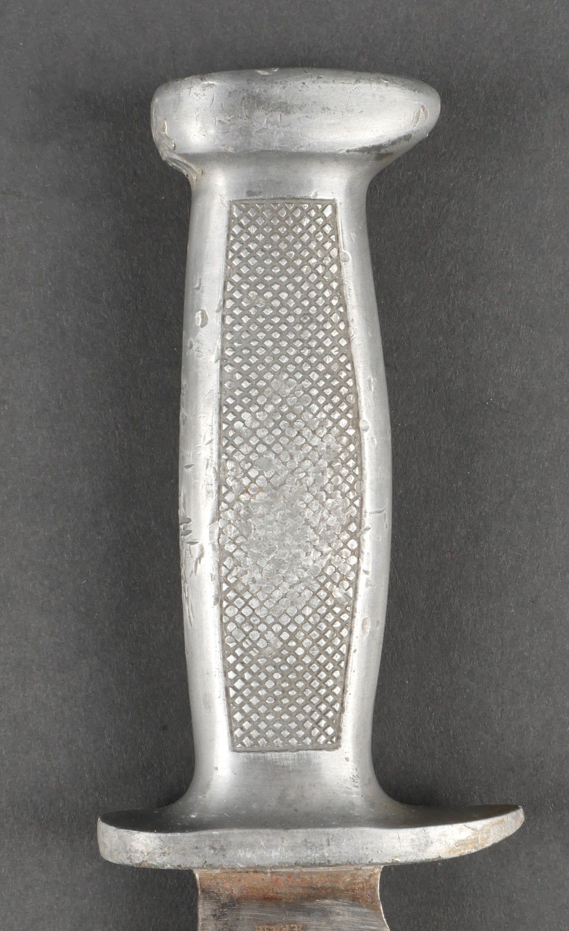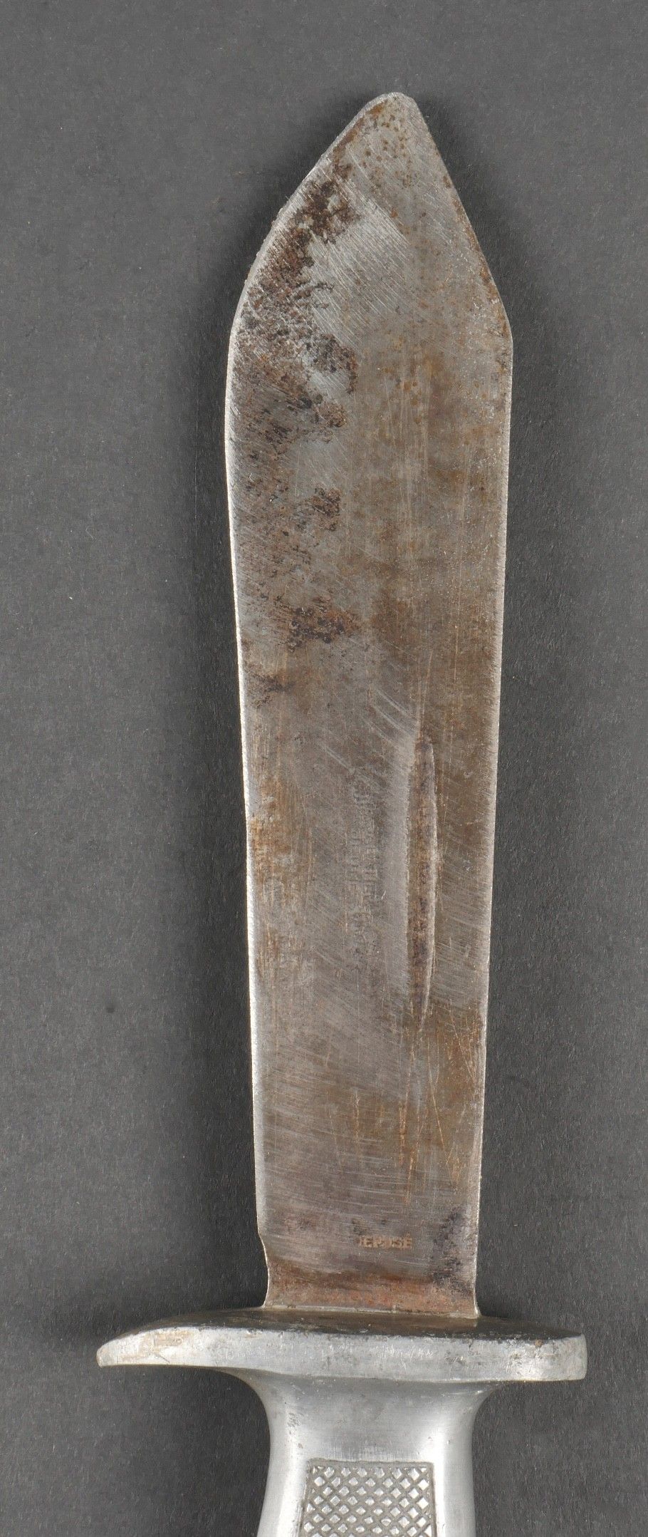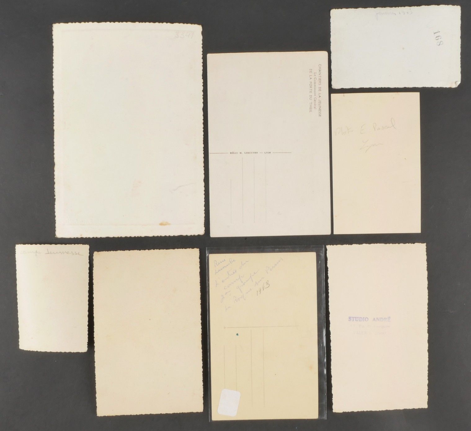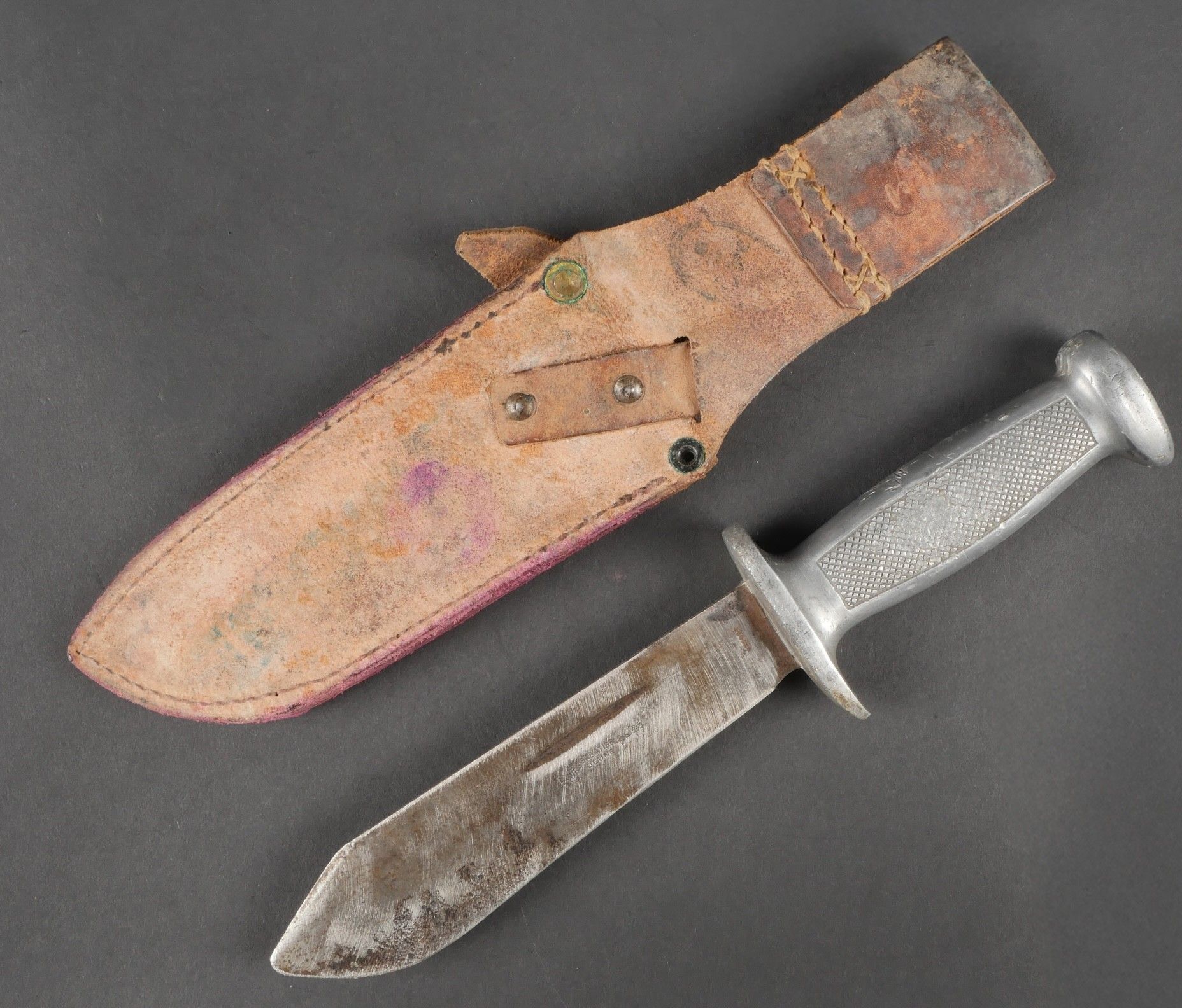 Chantiers de Jeunesse equipment. Comprising a pair of brown leather brodequins model 1941, size 41, aluminium eyelets, some damaged, some nails missing. Attached is a Sabatier Jeune youth knife, blade sharpened, regulation tan leather scabbard with clamp, dated 1942. A set of photos and postcards. A weekly bulletin des chantiers number 75. Youth Work equipment. Including a pair of 1941 model brown leather boots size 41 with aluminium eyelets some damaged and a few missing nails a Sabatier Jeune youth knife sharpened with its regulation fawn leather scabbard and strap dated 1942 a set of photos and postcards and a weekly Youth Work bulletin number 75.
