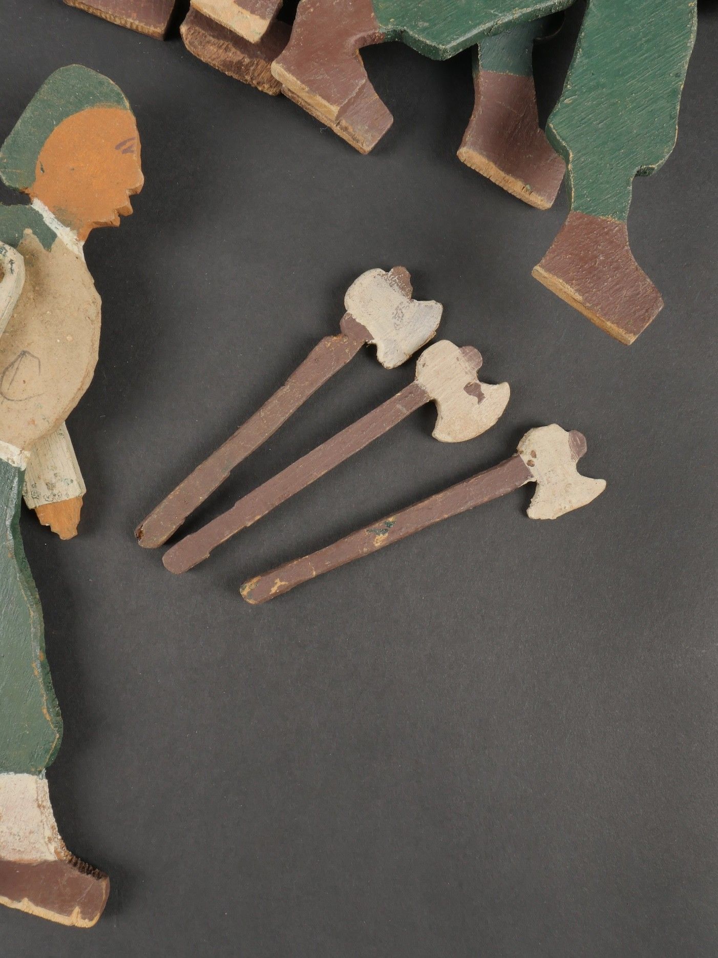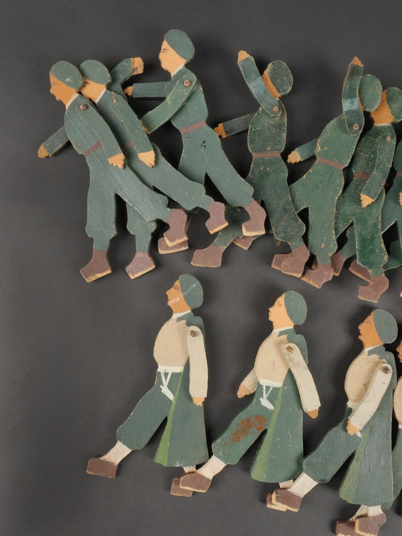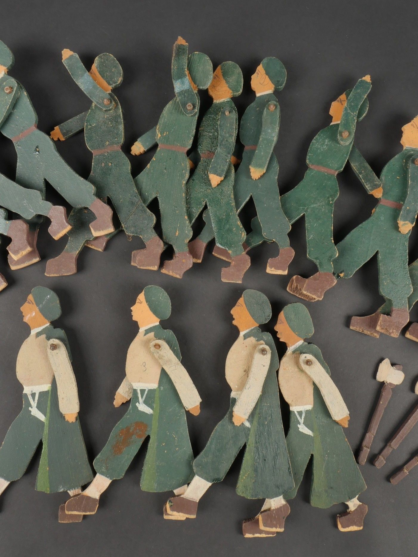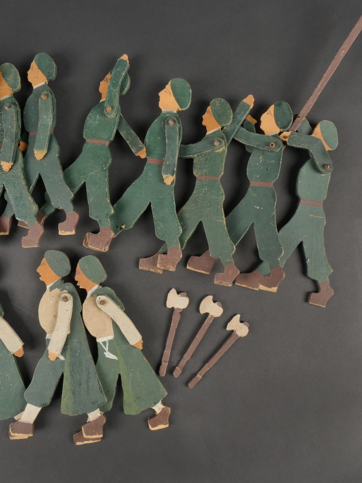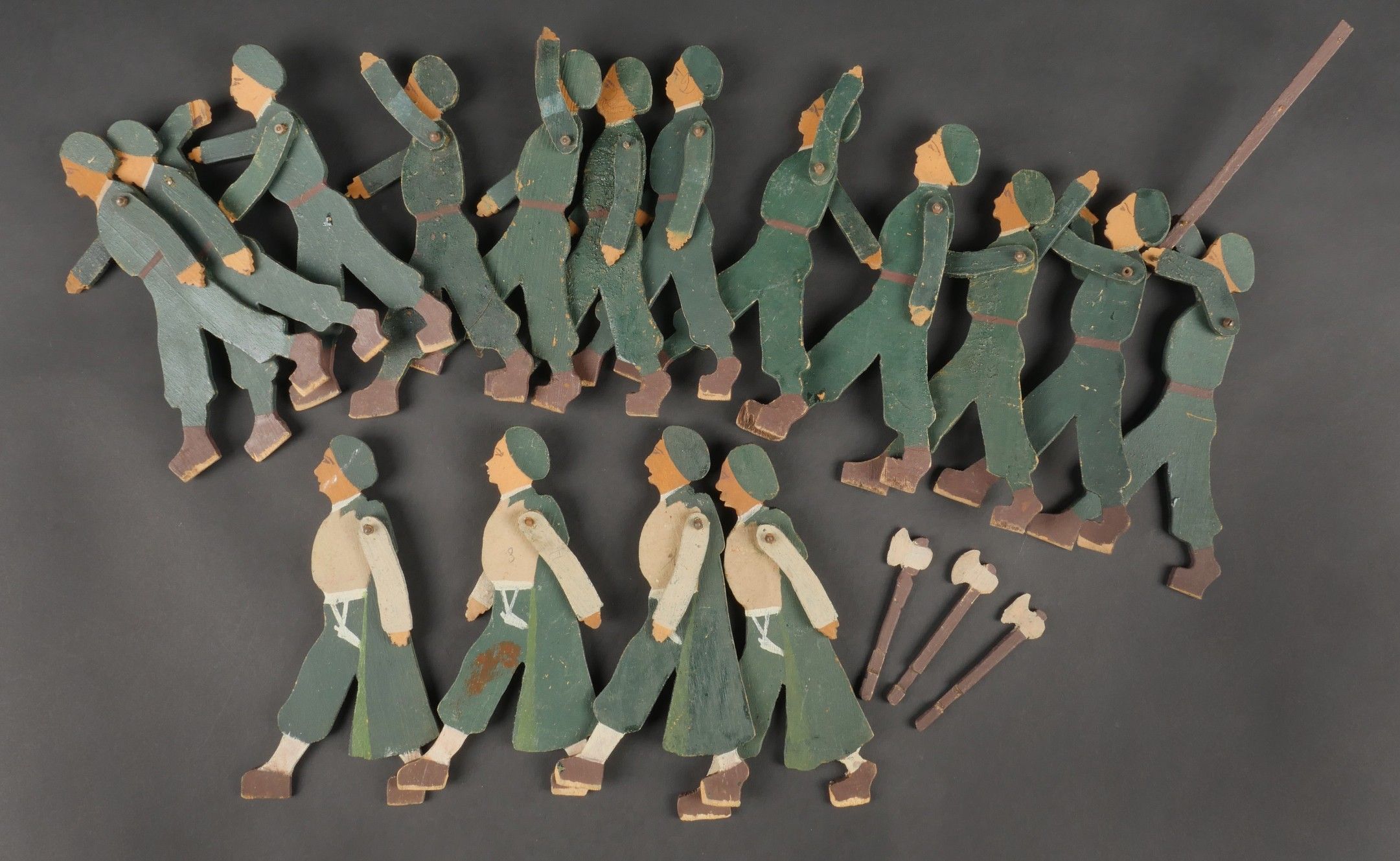 Chantiers de Jeunesse articulated figures. Twelve young people and four wooden frames with articulated arms. Three of the frames have a bar, one has a flagpole and the others have three small axes. Painted in the original colours of the group. Articulated Youth Work figures. Twelve youths and four leaders made of wood with articulated arms three leaders wearing armbands one youth carrying a flagpole and three with small axes original paint following the colour codes of the organization.
