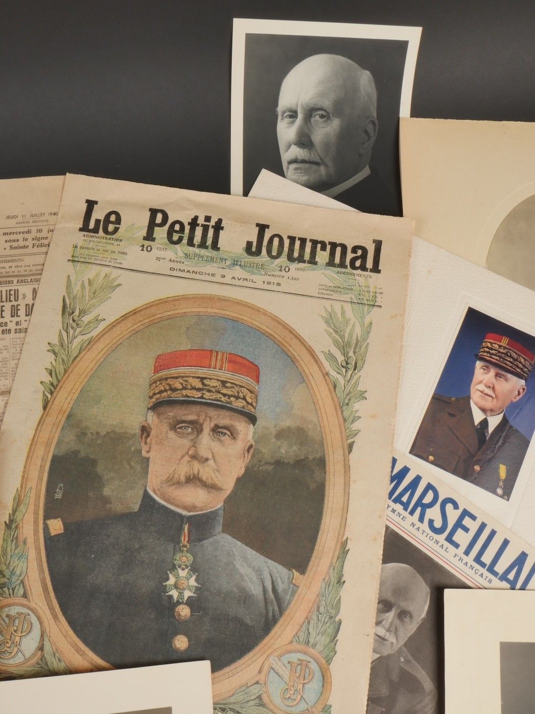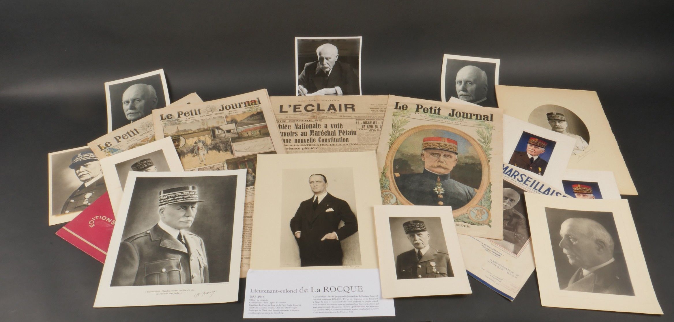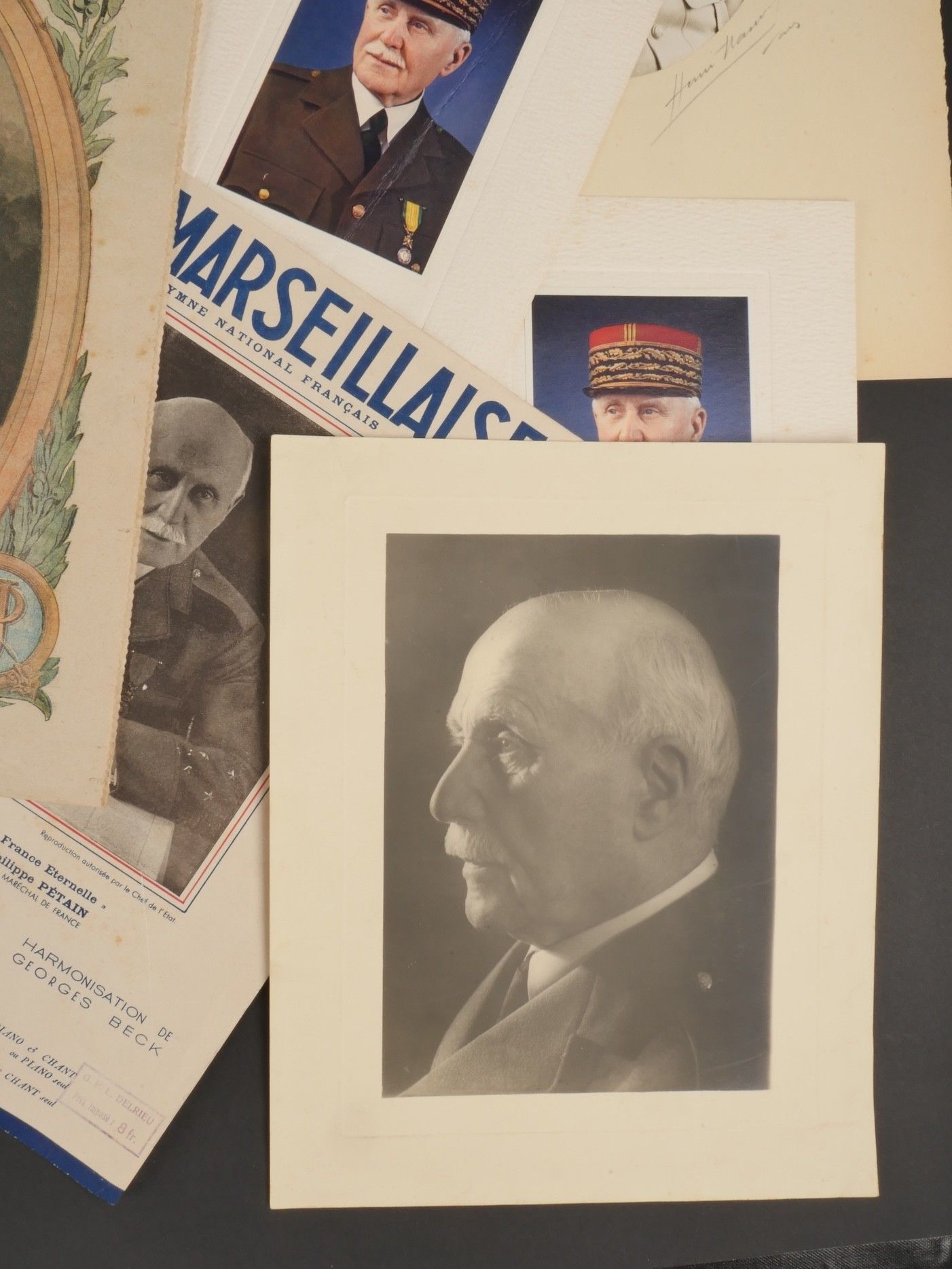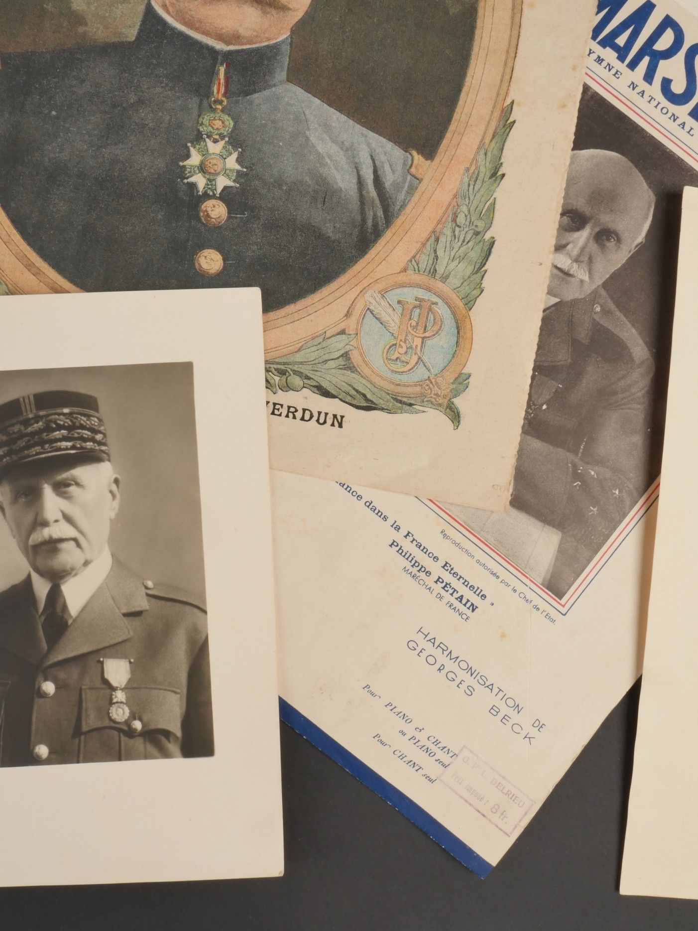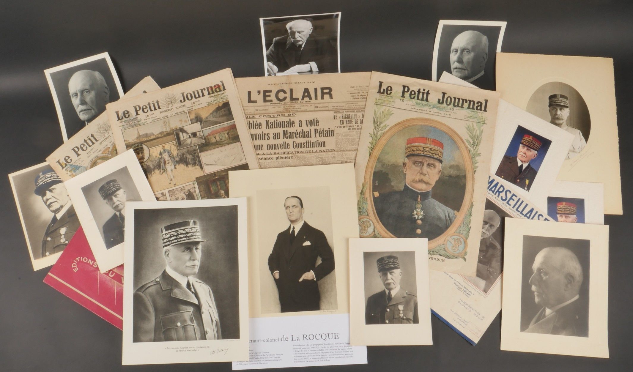 Lot of portraits of the Marshal. Comprising eleven paper portraits of Marshal Pétain of various sizes including one when he was a general, ten under Vichy including two in colour. Included are the national anthem la marseillaise under Pétain, a score of Maréchal nous voilà published by vers luisant, the petit journal of 9 April 1916 and a l'Eclair newspaper of 11 July 1940 concerning the Marshal's full powers. A photo of Colonel de La Rocque. Lot of portraits of the Marshal. Including eleven paper portraits of Marshal Pétain in various sizes, one from his time as general and ten from the Vichy period, two in colour. Also includes Hymne national - La Marseillaise sous Pétain, a Maréchal nous voilà score Vers Luisant editions, Le Petit Journal 9 April 1916, and L'Éclair 11 July 1940 reporting on Pétain's full powers. One photo of Colonel de La Rocque.