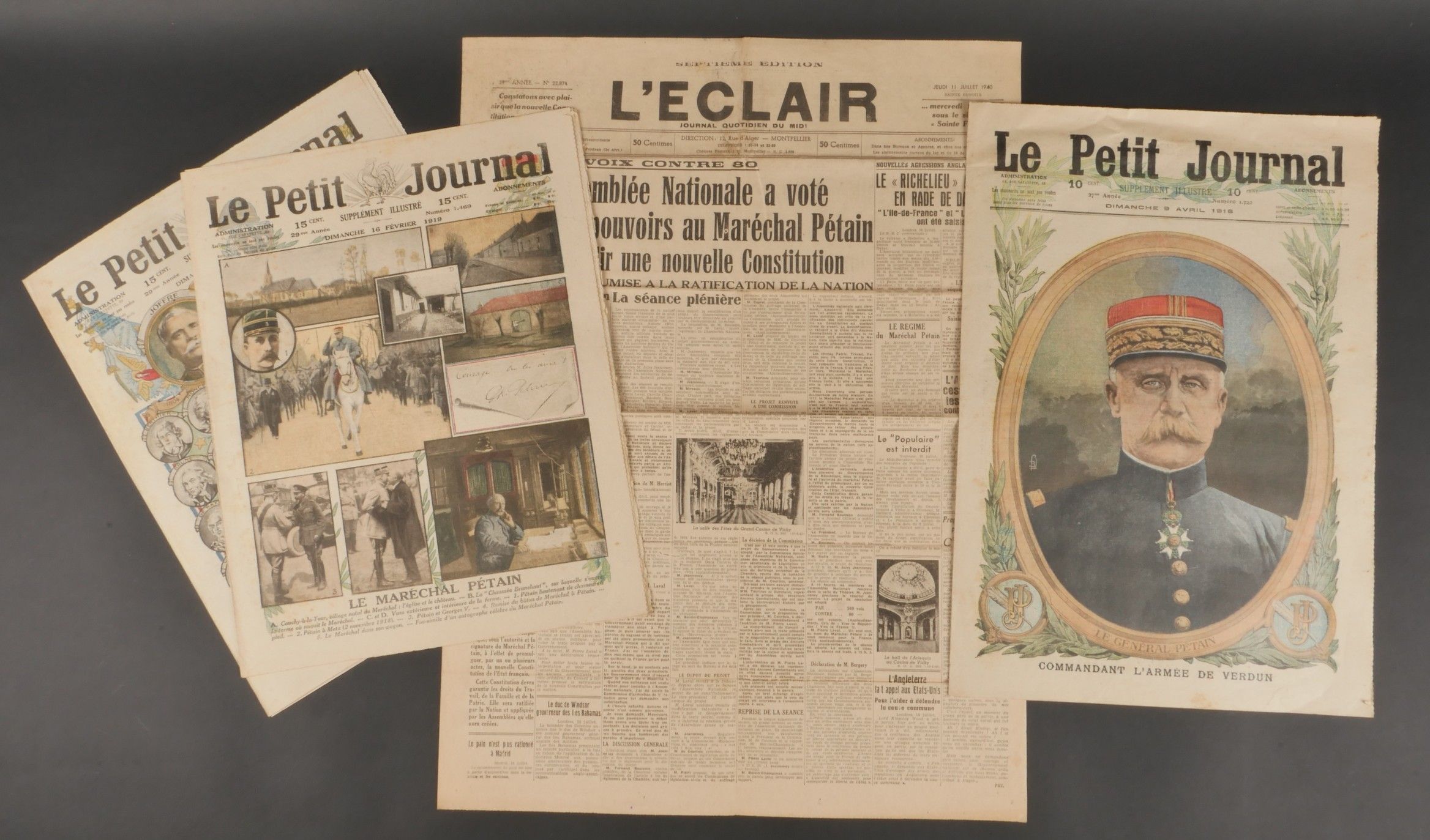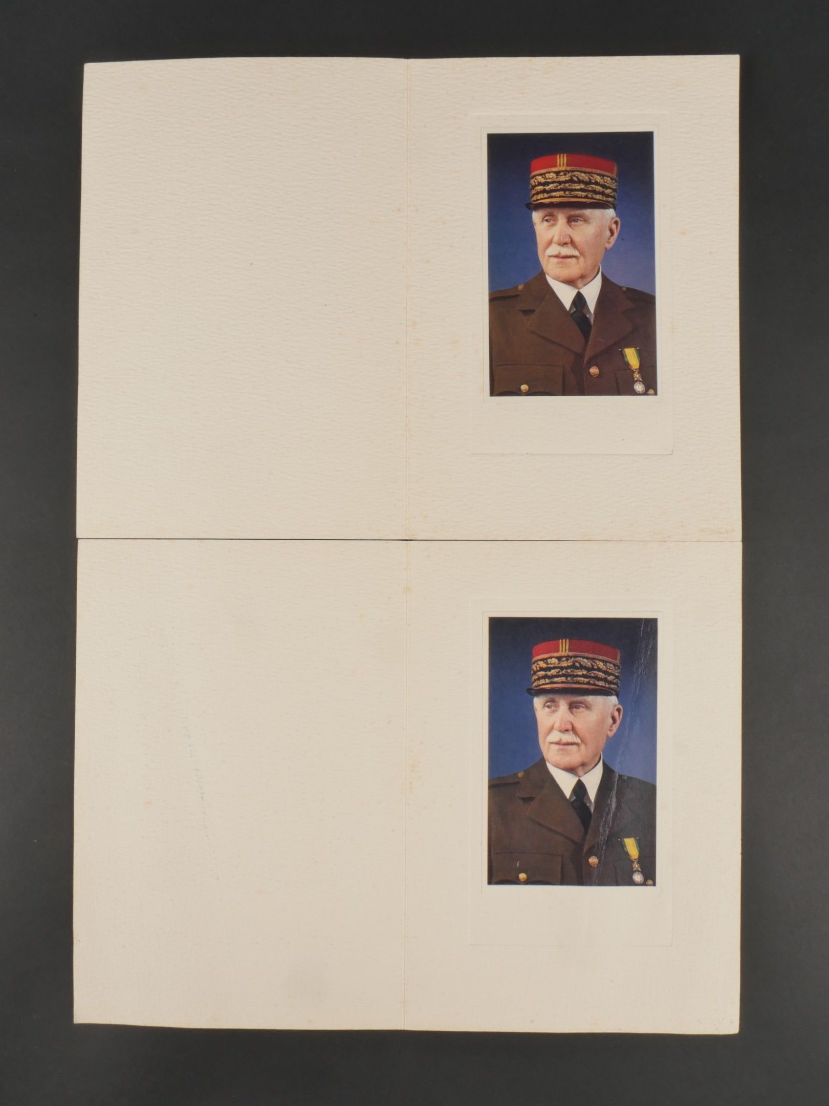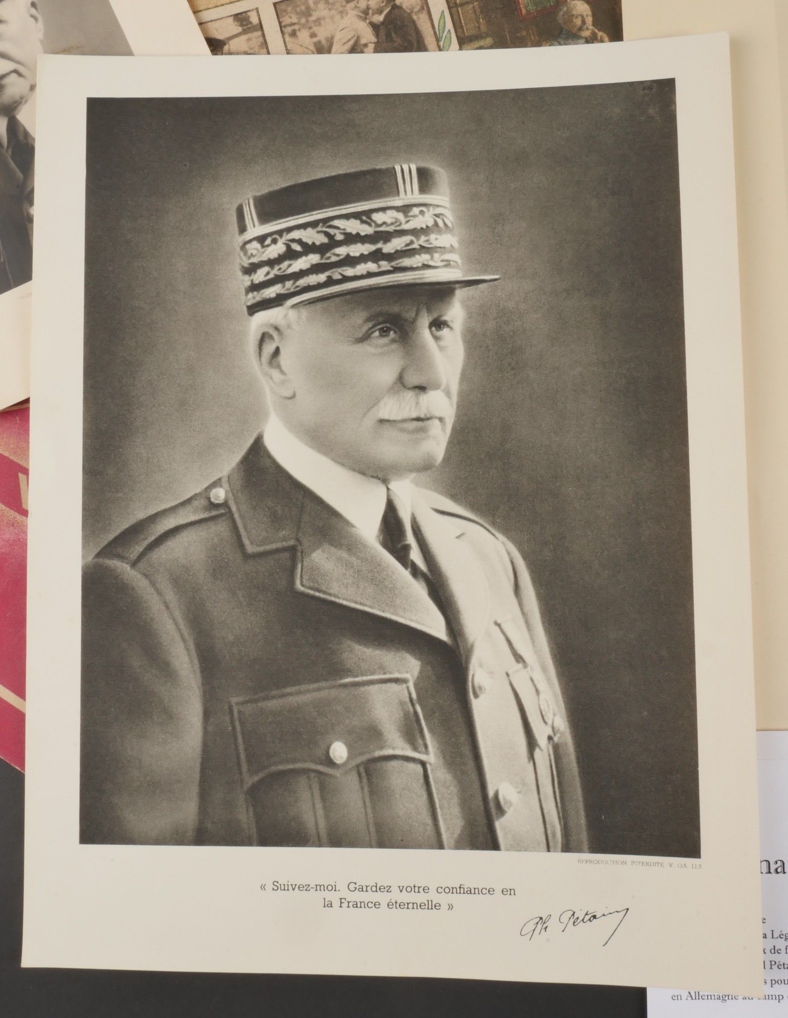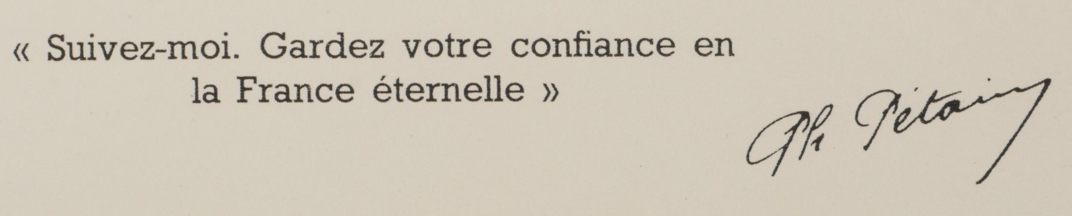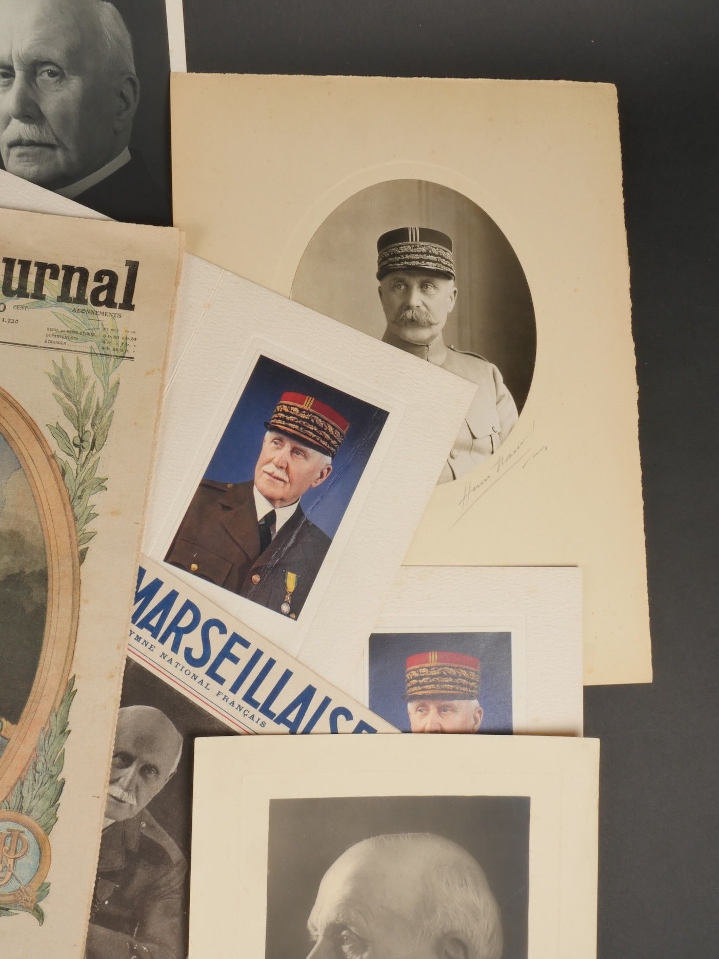 Lot of portraits of the Marshal. Comprising eleven paper portraits of Marshal Pétain of various sizes including one when he was a general, ten under Vichy including two in colour. Included are the national anthem la marseillaise under Pétain, a score of Maréchal nous voilà published by vers luisant, the petit journal of 9 April 1916 and a l'Eclair newspaper of 11 July 1940 concerning the Marshal's full powers. A photo of Colonel de La Rocque. Lot of portraits of the Marshal. Including eleven paper portraits of Marshal Pétain in various sizes, one from his time as general and ten from the Vichy period, two in colour. Also includes Hymne national - La Marseillaise sous Pétain, a Maréchal nous voilà score Vers Luisant editions, Le Petit Journal 9 April 1916, and L'Éclair 11 July 1940 reporting on Pétain's full powers. One photo of Colonel de La Rocque.