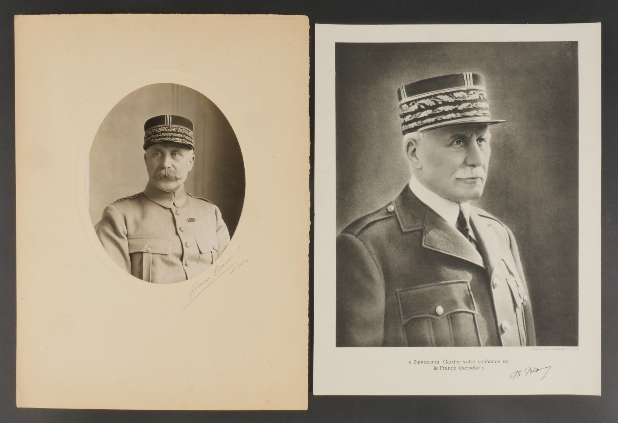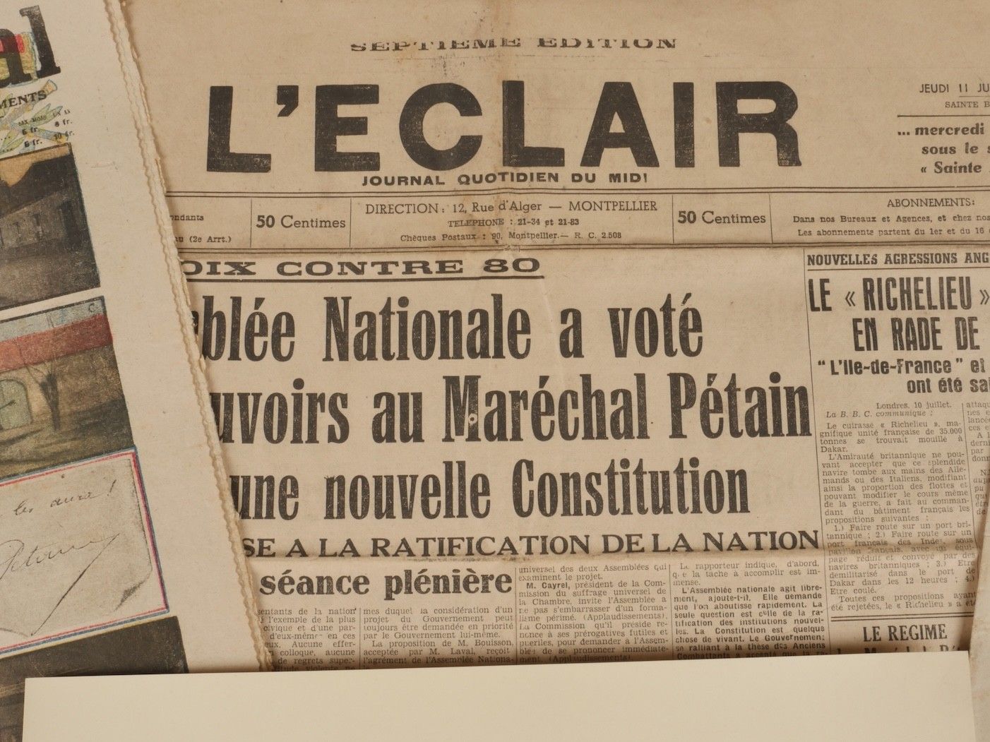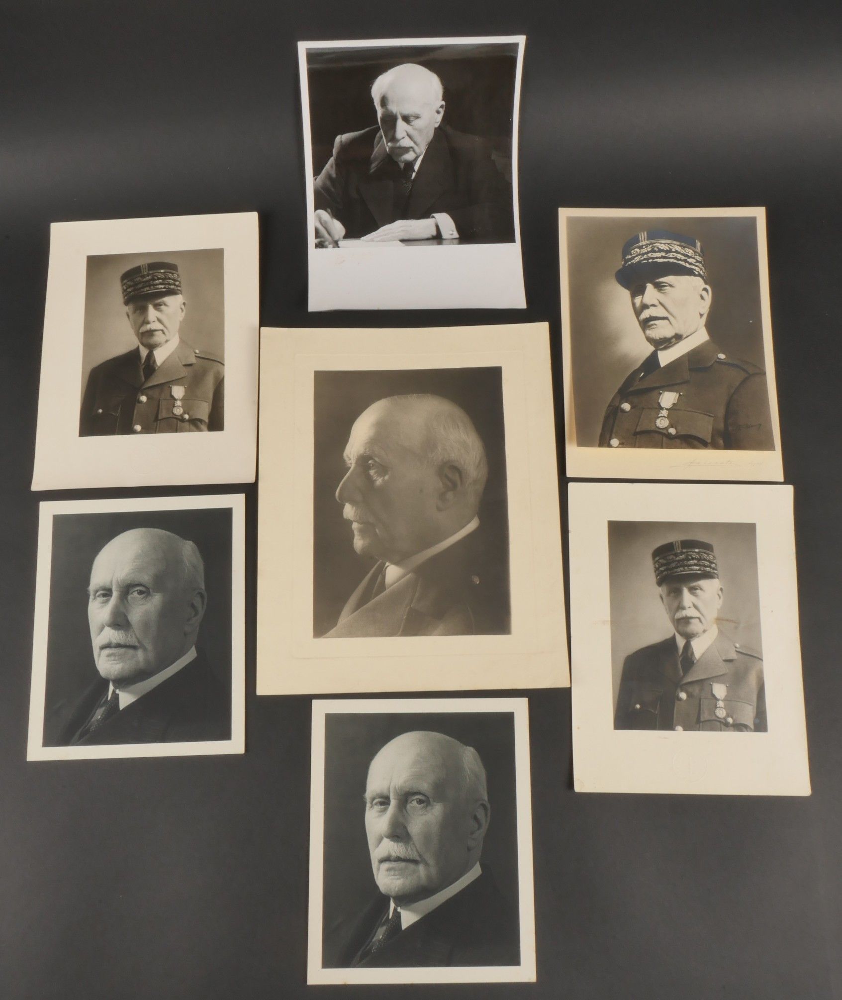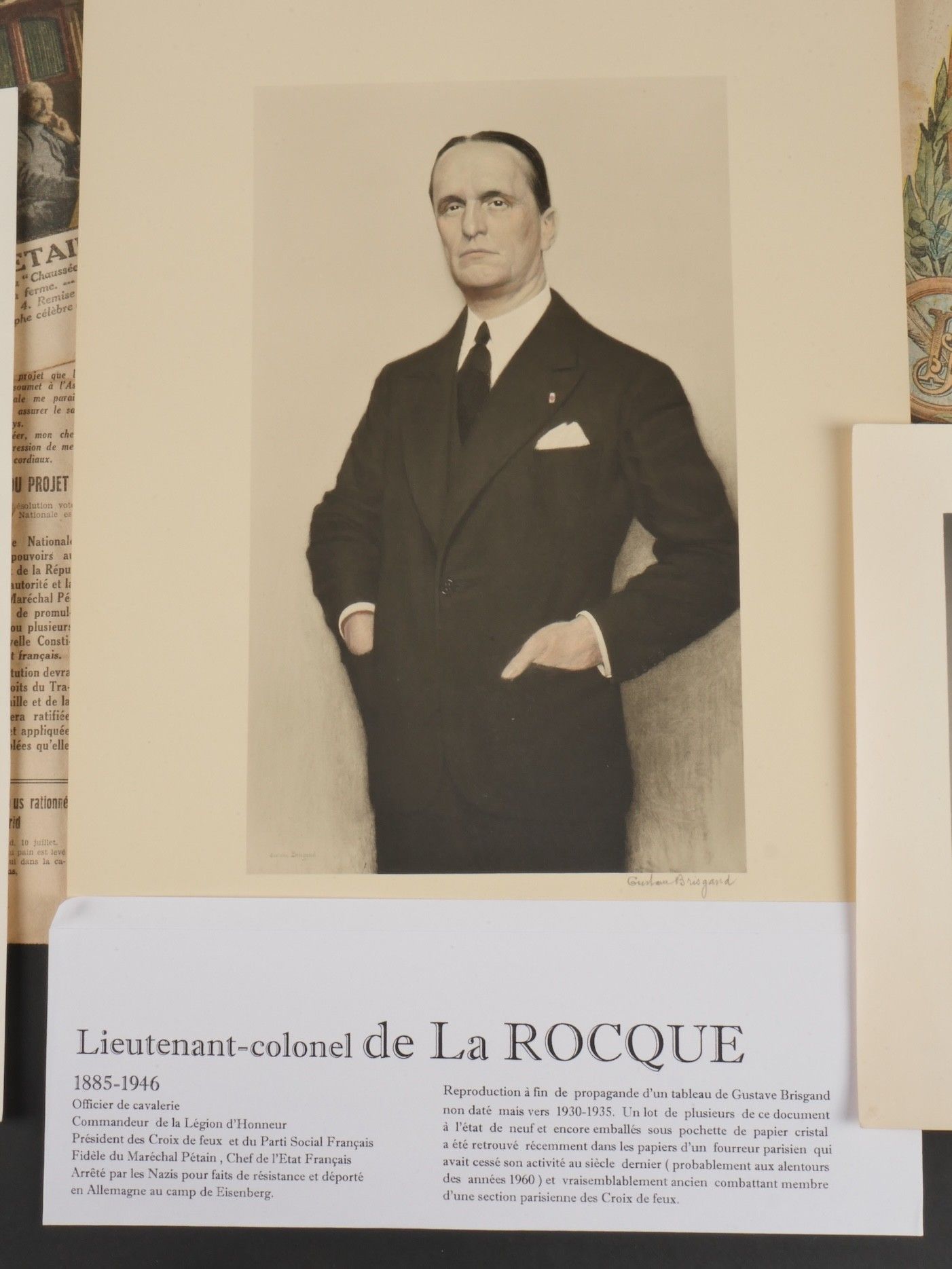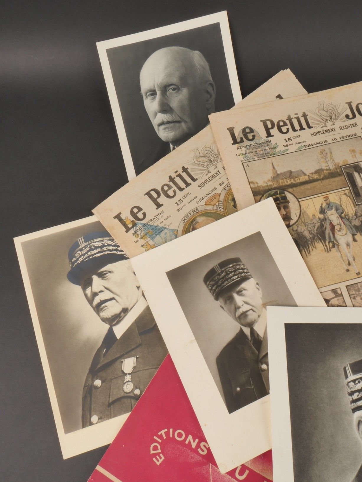 Lot of portraits of the Marshal. Comprising eleven paper portraits of Marshal Pétain of various sizes including one when he was a general, ten under Vichy including two in colour. Included are the national anthem la marseillaise under Pétain, a score of Maréchal nous voilà published by vers luisant, the petit journal of 9 April 1916 and a l'Eclair newspaper of 11 July 1940 concerning the Marshal's full powers. A photo of Colonel de La Rocque. Lot of portraits of the Marshal. Including eleven paper portraits of Marshal Pétain in various sizes, one from his time as general and ten from the Vichy period, two in colour. Also includes Hymne national - La Marseillaise sous Pétain, a Maréchal nous voilà score Vers Luisant editions, Le Petit Journal 9 April 1916, and L'Éclair 11 July 1940 reporting on Pétain's full powers. One photo of Colonel de La Rocque.