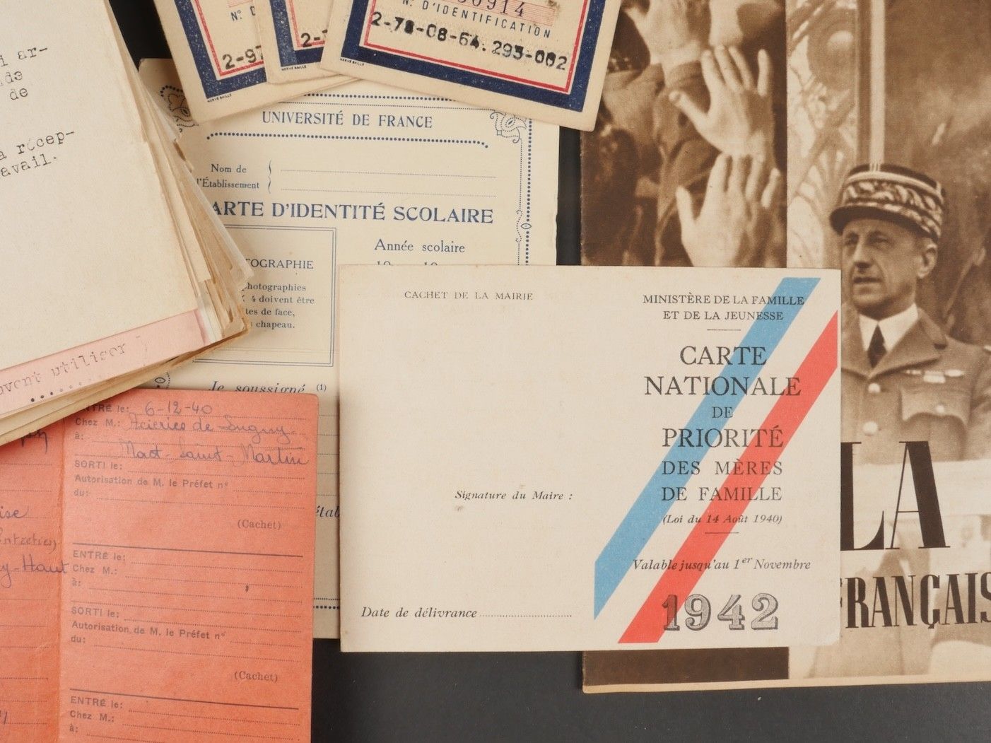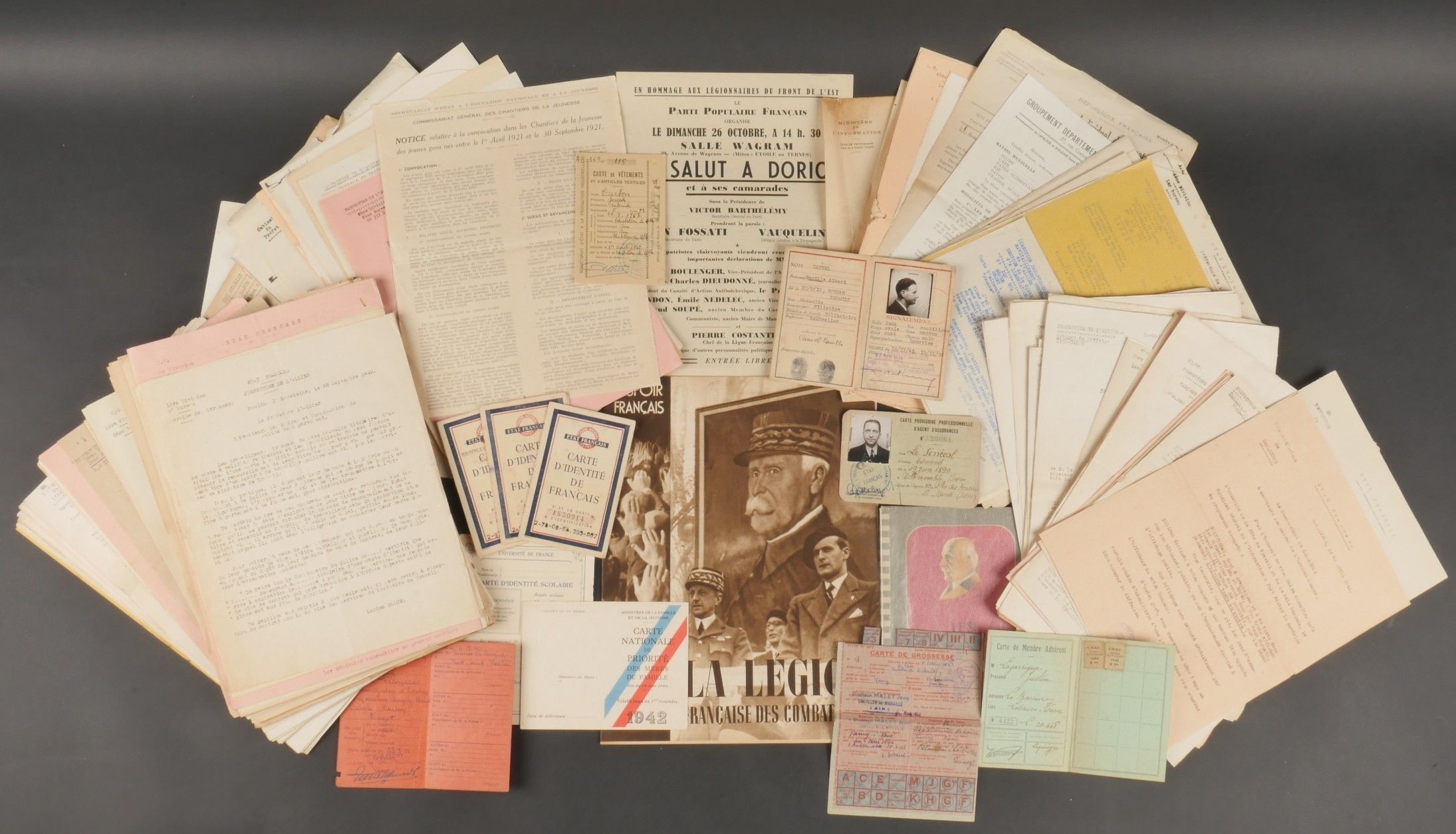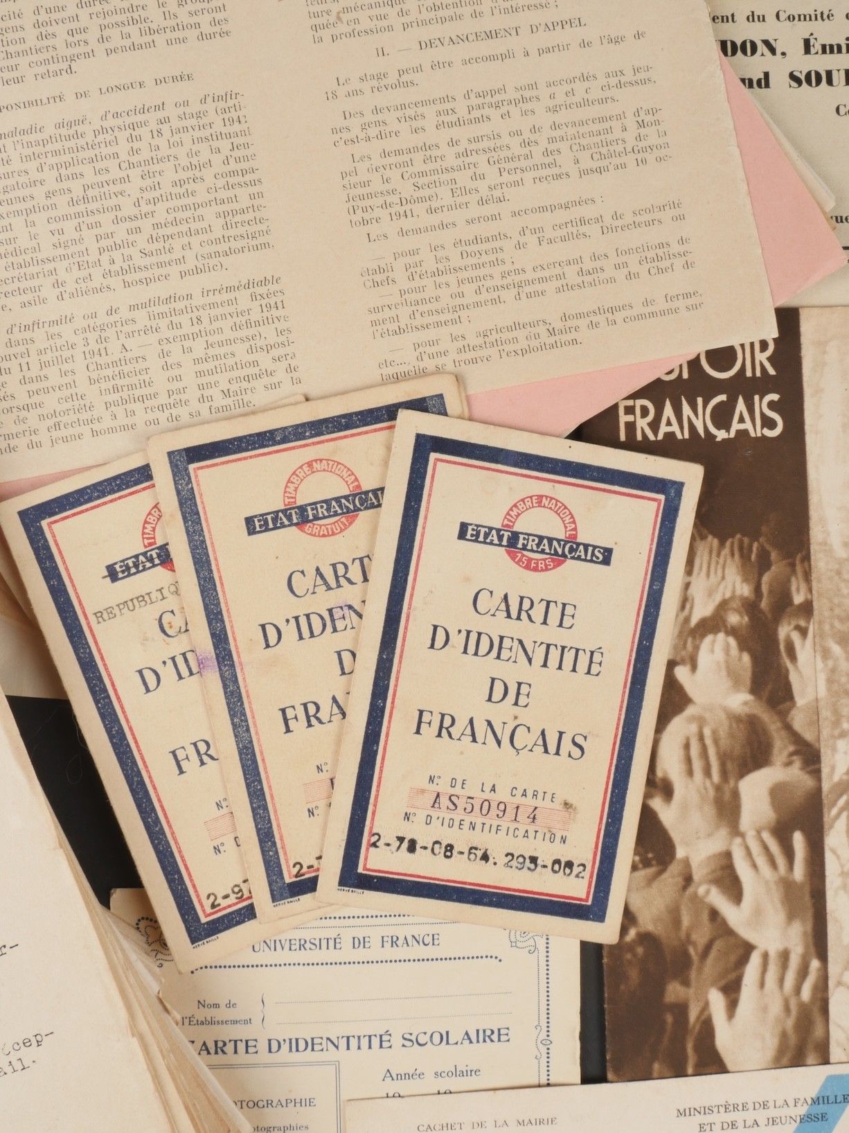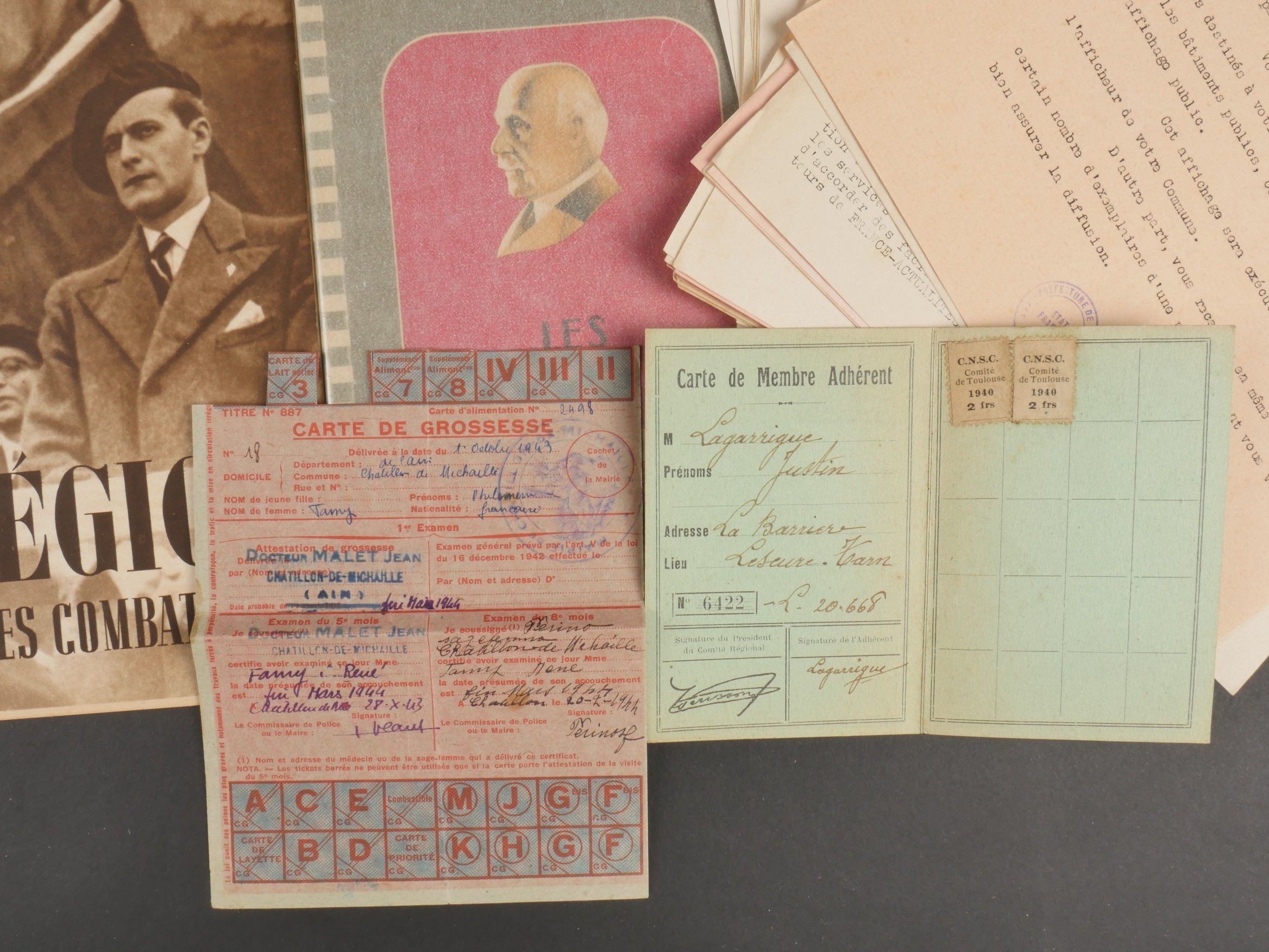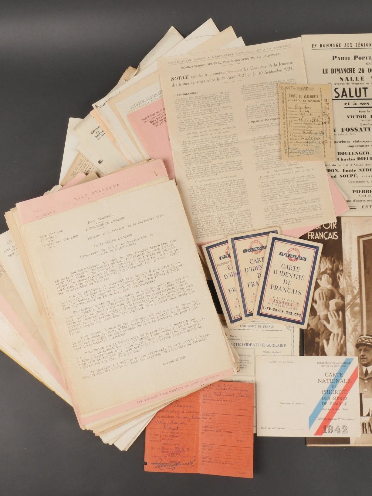 Batch of Armistice documents. Comprising various identity cards including three Etat Français cards, one scratched and marked République Française. A blank 1942 mother-of-family priority card. A compulsory work card and miscellaneous. A large batch of more than 150 documents relating to the département of Allier, including a notice of Chantiers de Jeunesse (youth work camps), vehicle ownership declarations, delivery commitments, repatriation certificates and various letters addressed to the mayor of Allier and the prefect. A special issue of the journal L'Espoir français, a poster Le salut à Doriot and a booklet Les jeudis du Maréchal are also included. Lot of Armistice documents. Including various identity cards, three marked "État Français" and one struck "République Française," a 1942 family priority card, a compulsory labor card, and more than 150 documents from the Allier department concerning Youth Work, vehicle ownership declarations, delivery commitments, repatriation certificates, and correspondence with local mayors and prefects. Also includes L'Espoir français magazine special issue, a leaflet Le Salut à Doriot, and Les Jeudis du Maréchal booklet.