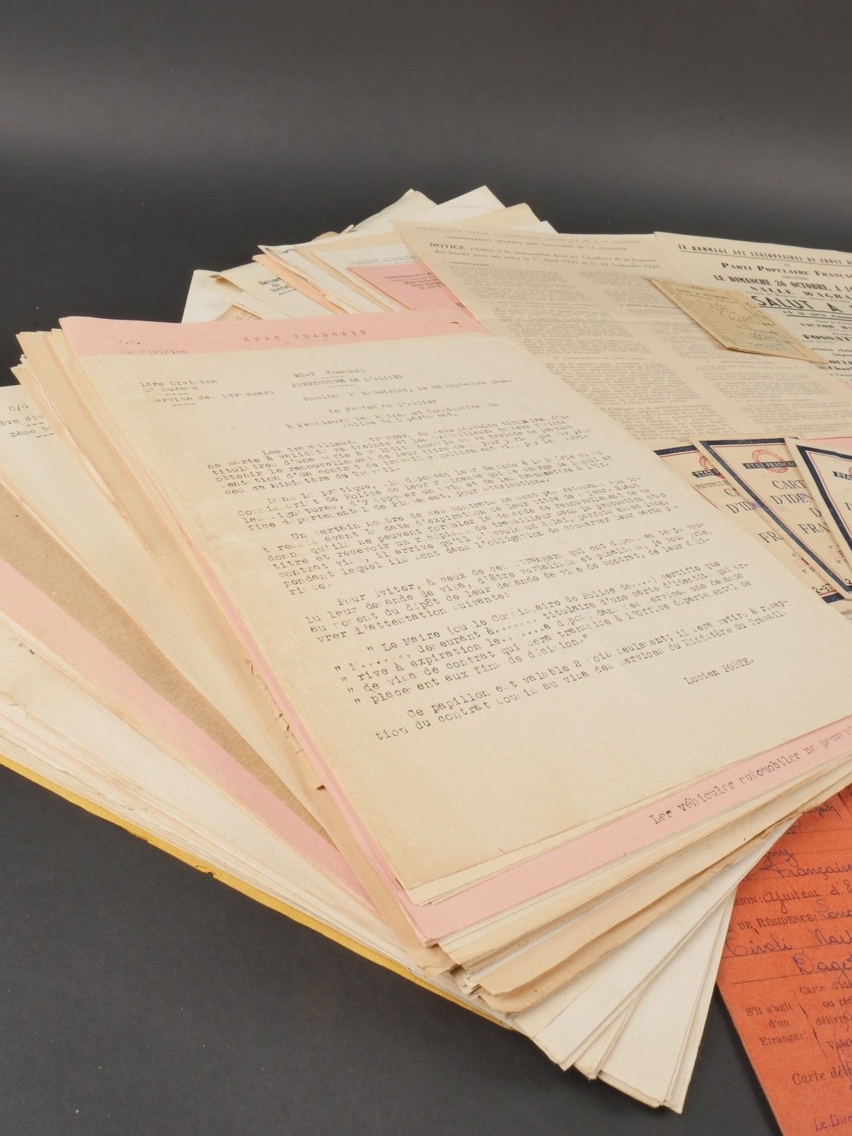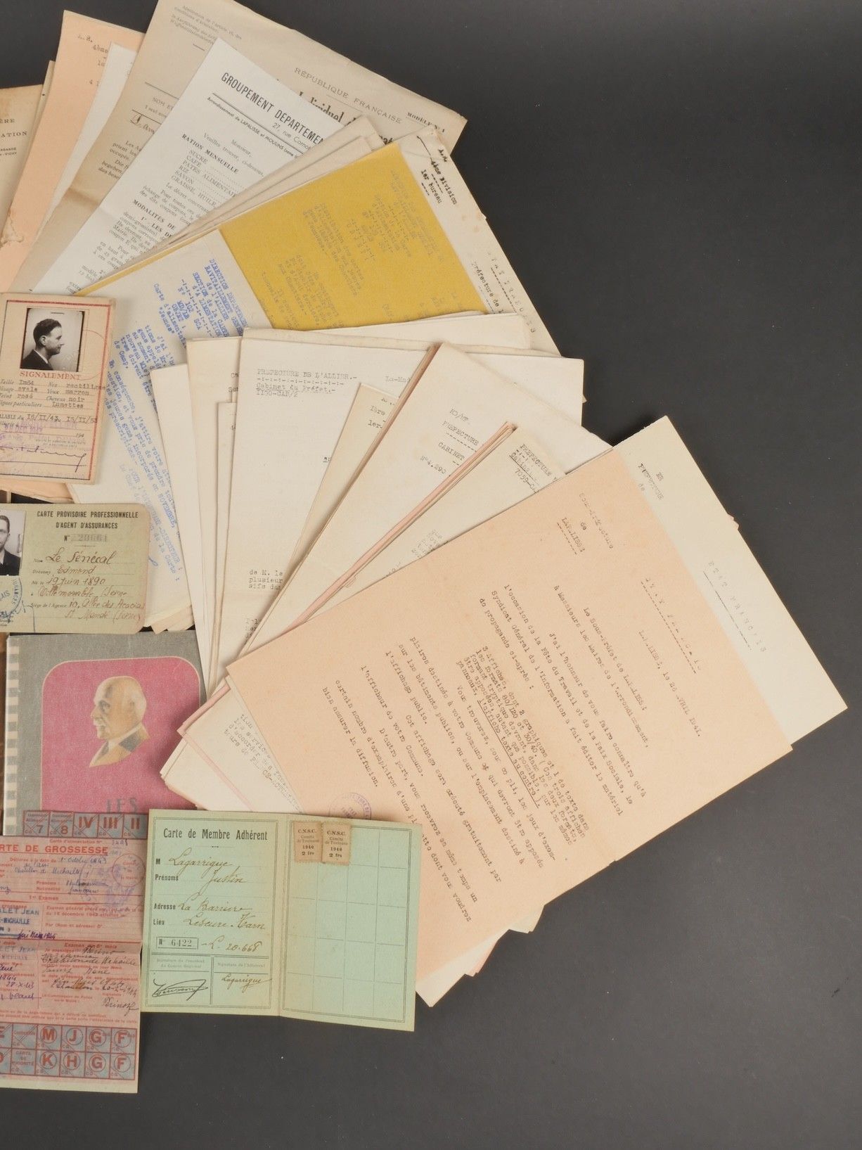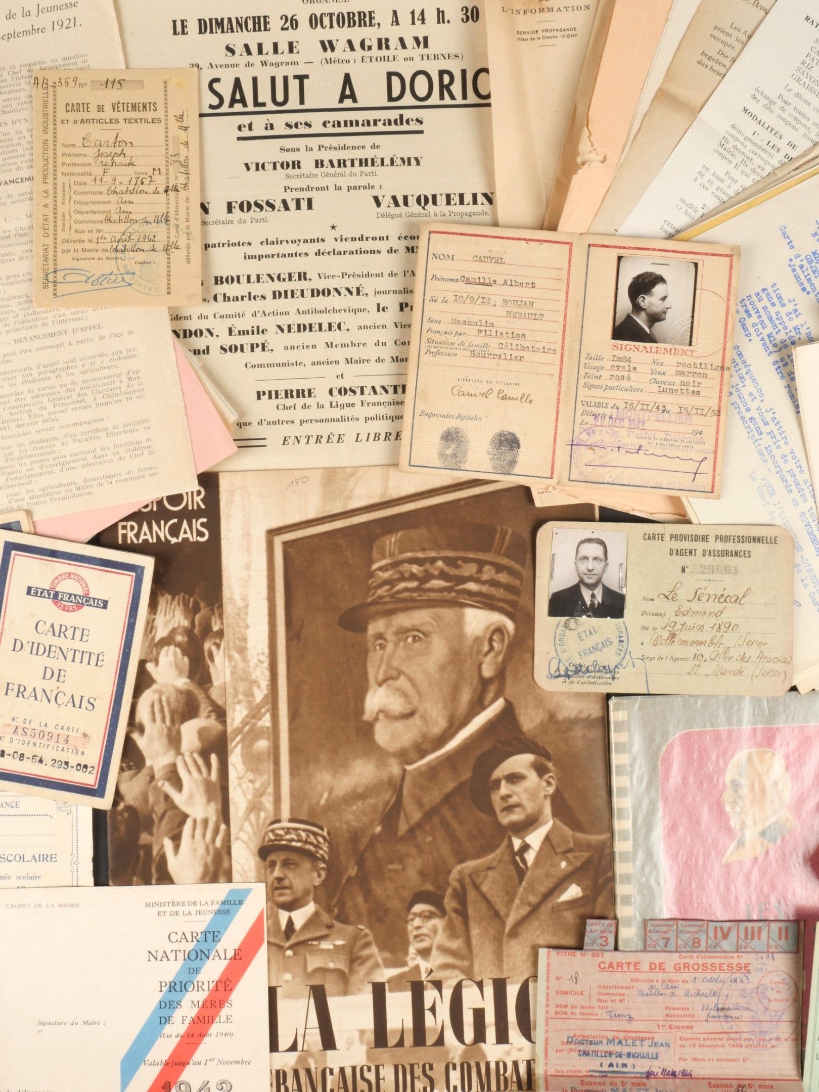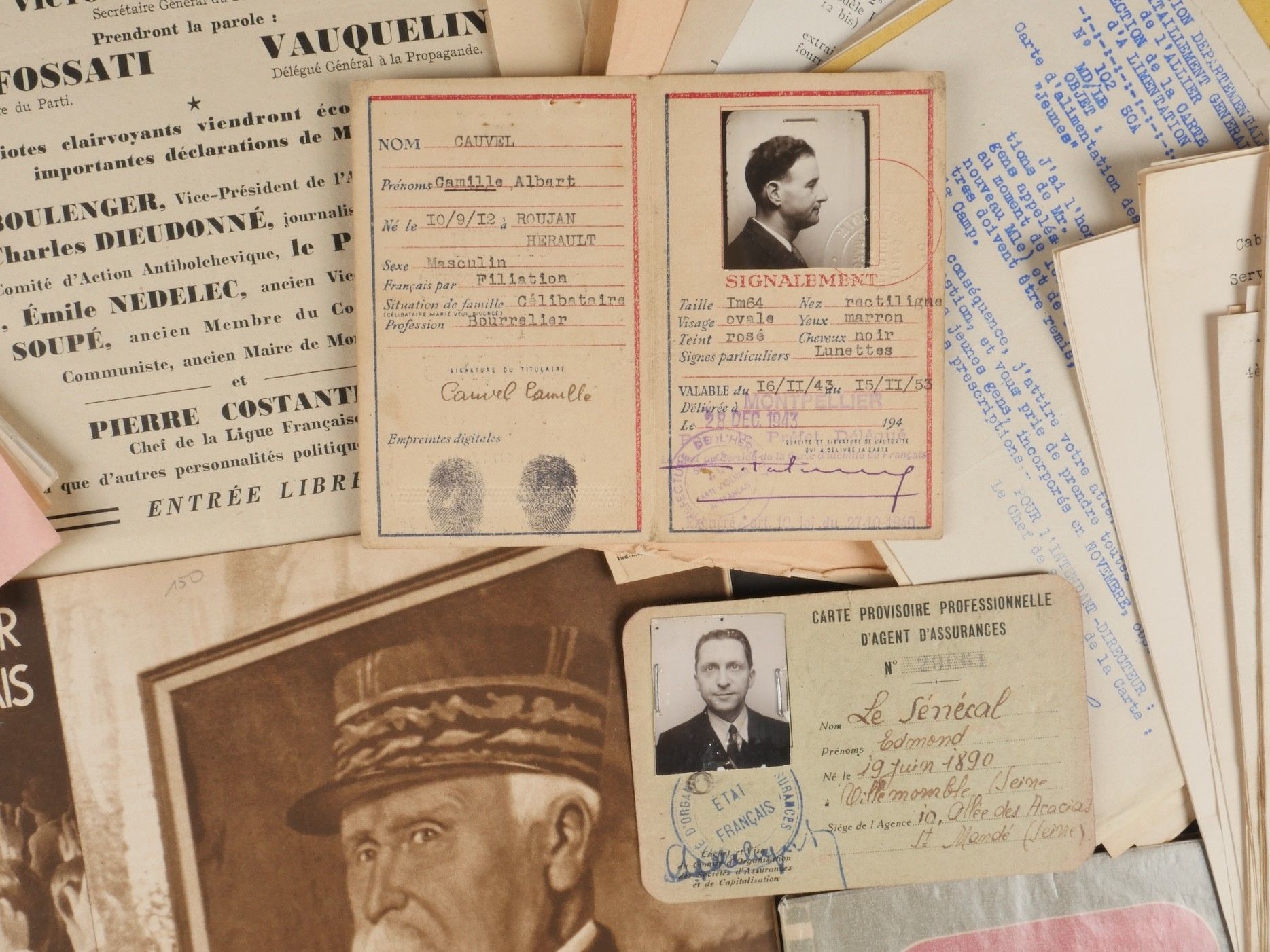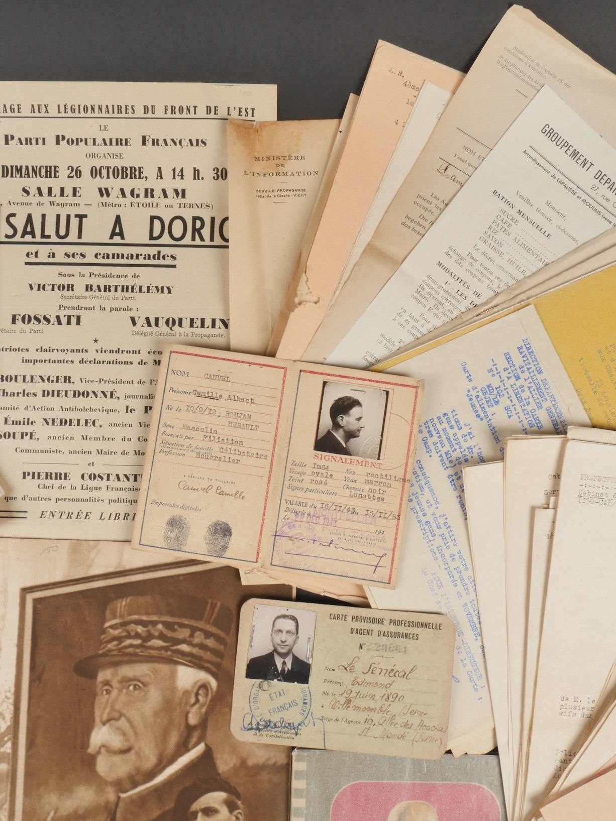Batch of Armistice documents. Comprising various identity cards including three Etat Français cards, one scratched and marked République Française. A blank 1942 mother-of-family priority card. A compulsory work card and miscellaneous. A large batch of more than 150 documents relating to the département of Allier, including a notice of Chantiers de Jeunesse (youth work camps), vehicle ownership declarations, delivery commitments, repatriation certificates and various letters addressed to the mayor of Allier and the prefect. A special issue of the journal L'Espoir français, a poster Le salut à Doriot and a booklet Les jeudis du Maréchal are also included. Lot of Armistice documents. Including various identity cards, three marked "État Français" and one struck "République Française," a 1942 family priority card, a compulsory labor card, and more than 150 documents from the Allier department concerning Youth Work, vehicle ownership declarations, delivery commitments, repatriation certificates, and correspondence with local mayors and prefects. Also includes L'Espoir français magazine special issue, a leaflet Le Salut à Doriot, and Les Jeudis du Maréchal booklet.